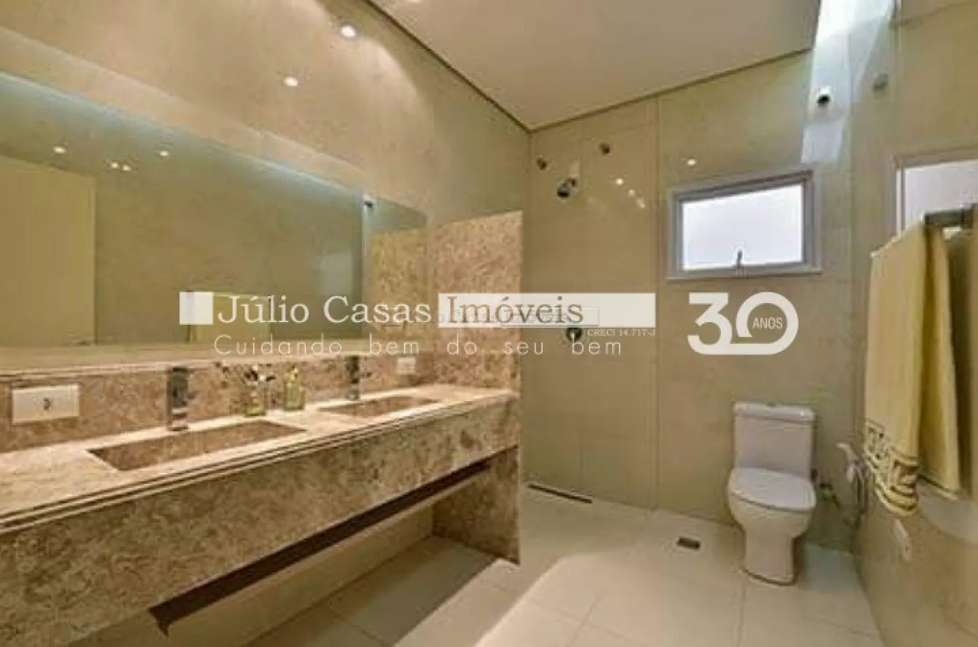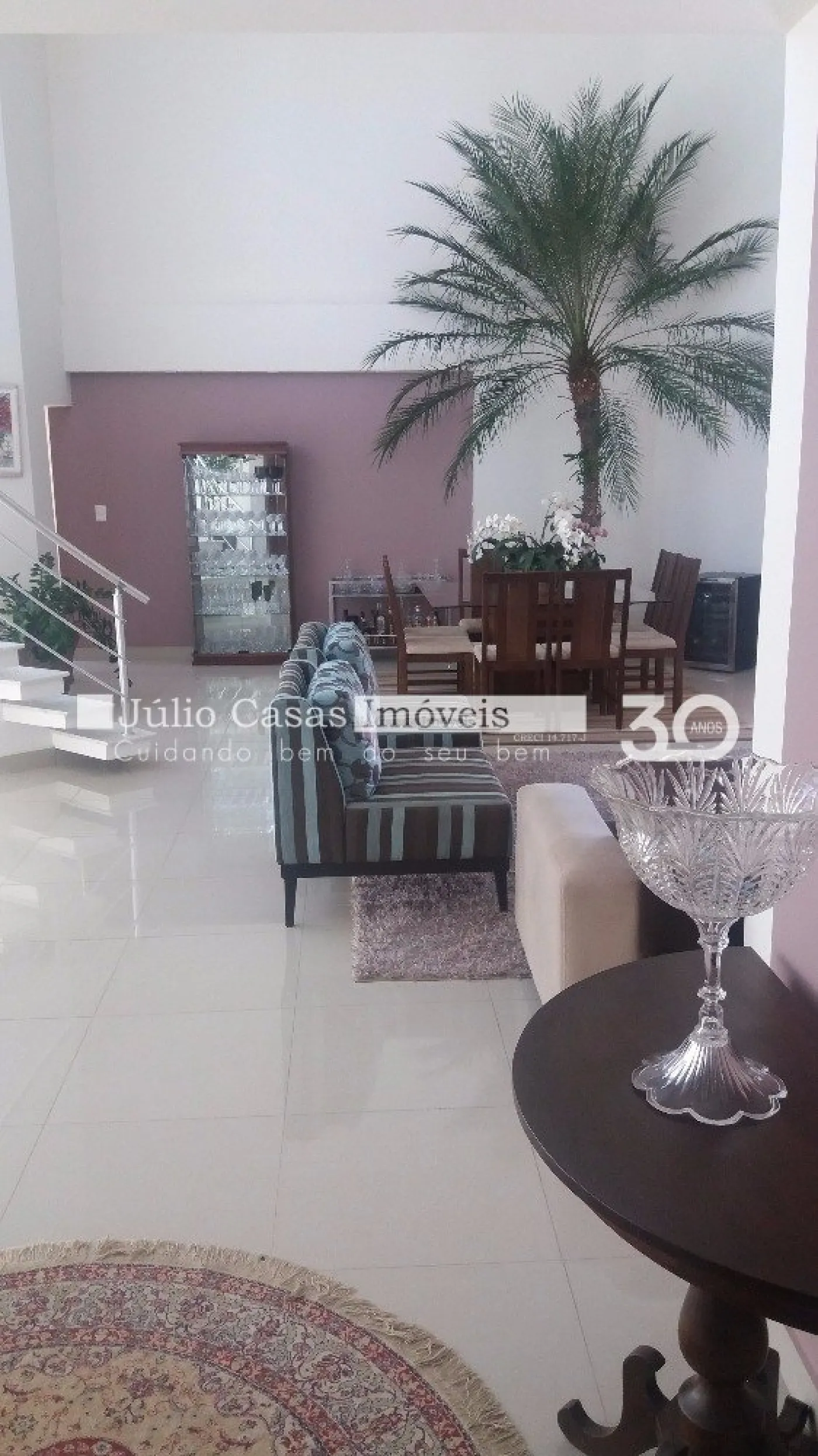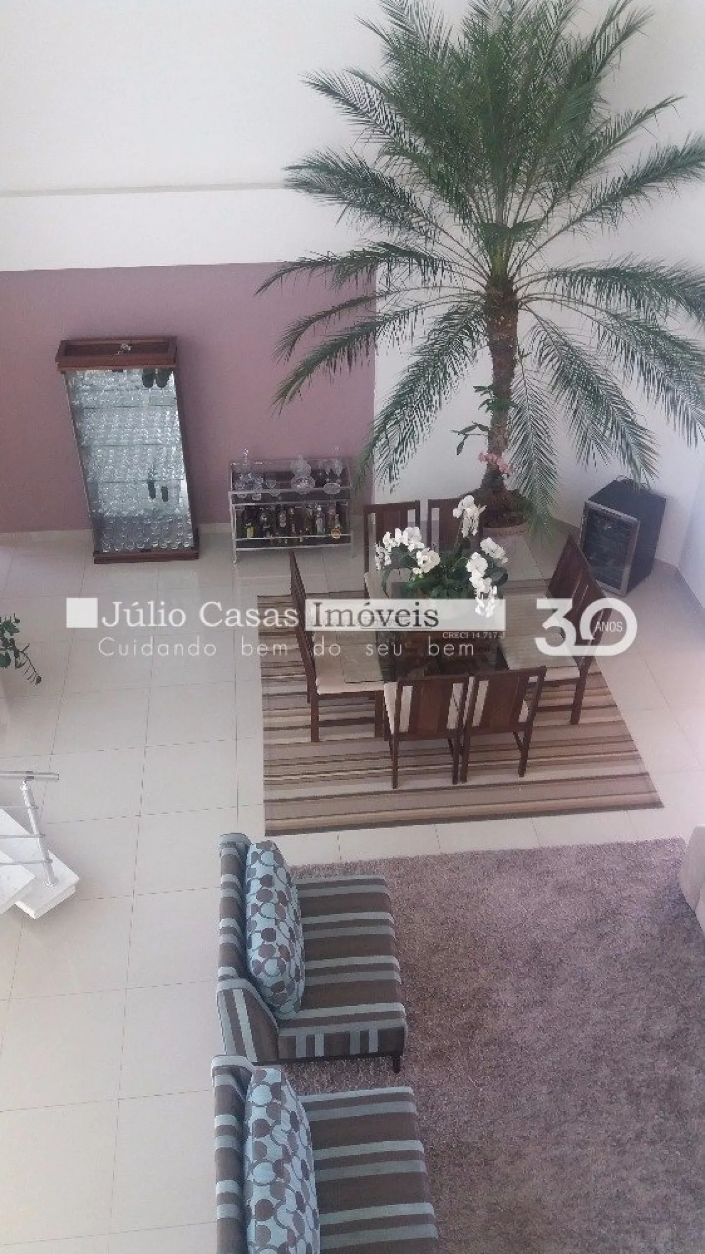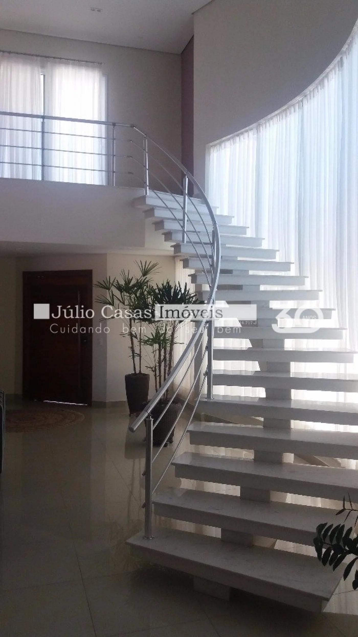 Sala 2 ambientes com pé direito duplo luminárias embutidas, piso em porcelanato, lavabo com pia em mármore travertino e cuba sobreposta, escritório com painel, teto com vitral, porta em madeira, sala integrada com a área gourmet, porta em vidro temperado, cozinha modulada com bancada em granito, pisos e revestimentos em porcelanatos, despensa com prateleiras em granito, área de serviço, suíte modulada no térreo, quarto com wc e piscina , churrasqueira e pia de apoio. Escada em mármore travertino, andar superior com sala de tv, 3 suítes moduladas todas com varanda sendo 1 máster com banheira e 2 cubas, todas com ar condicionados. Entrada de serviço pela lateral, 2 vagas de garagem cobertas e 2 descobertas.