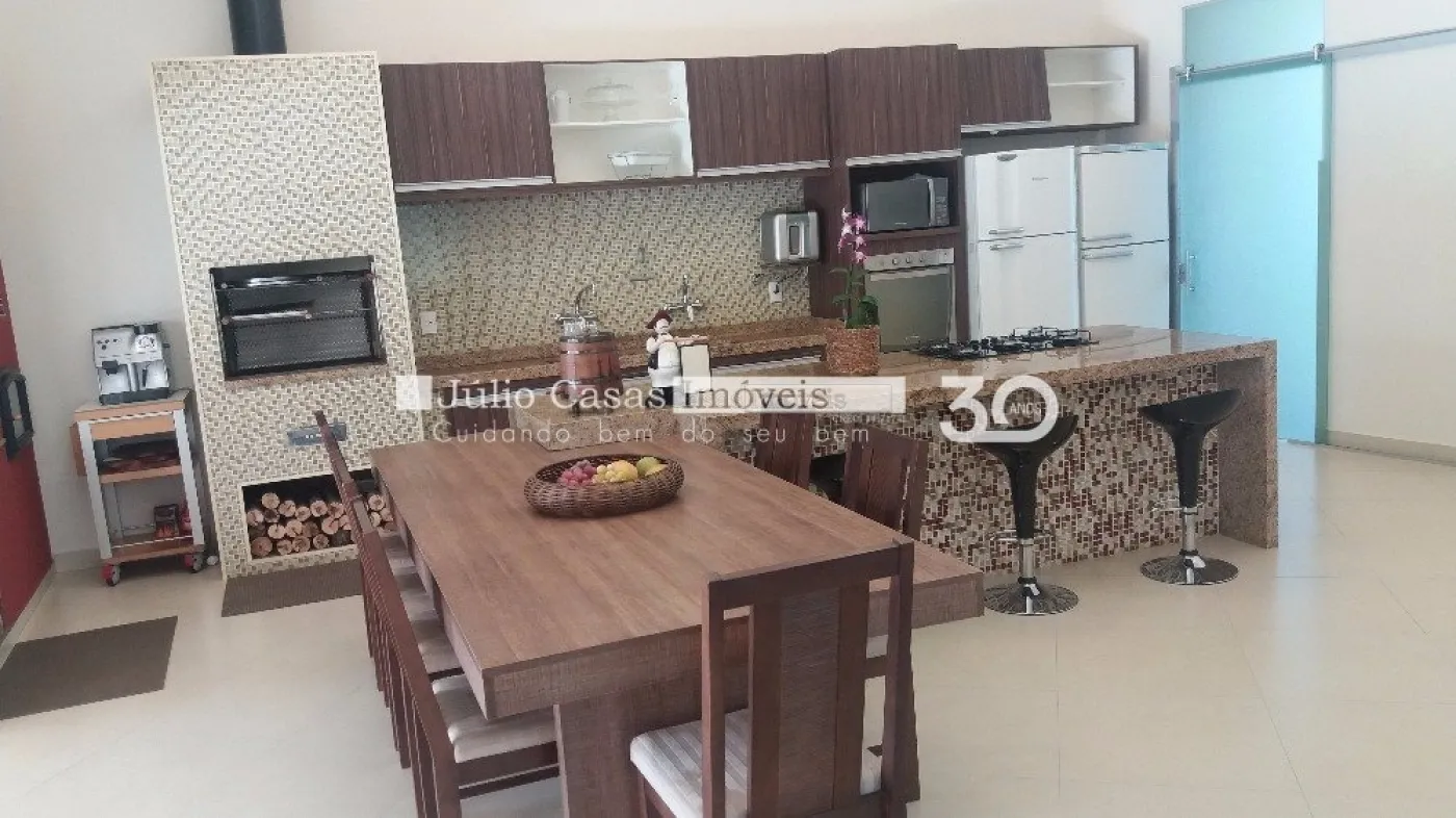 Casa à venda em condomínio fechado ? conforto, sofisticação e segurança! Linda residência com excelente padrão de acabamento, ideal para quem busca qualidade de vida em um ambiente seguro e bem localizado. O imóvel conta com salas de estar e jantar integradas, escritório, lavabo, cozinha com modulados e despensa. A área gourmet é um verdadeiro destaque, equipada com churrasqueira, modulados e uma jacuzzi para 5 pessoas ? perfeita para momentos de lazer e relaxamento. Possui ainda lavanderia funcional e quarto de despejo para apoio. No pavimento superior, são 3 suítes amplas, sendo uma delas com closet. Todos os ambientes foram planejados com móveis modulados de alta qualidade, presentes no closet, cozinha, despensa e área gourmet. Acabamentos de alto padrão, com pisos e revestimentos em porcelanato de primeira linha, conferem sofisticação a todos os espaços. A casa oferece 4 vagas de garagem, sendo 2 cobertas.