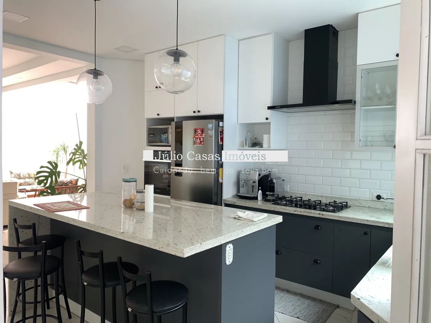 A cozinha, equipada com uma ilha central, oferece praticidade e funcionalidade. As bancadas em granito e os armários planejados garantem um ambiente organizado e elegante, perfeito para quem aprecia um bom design aliado à praticidade.