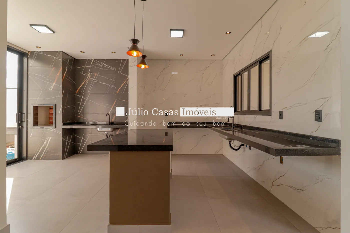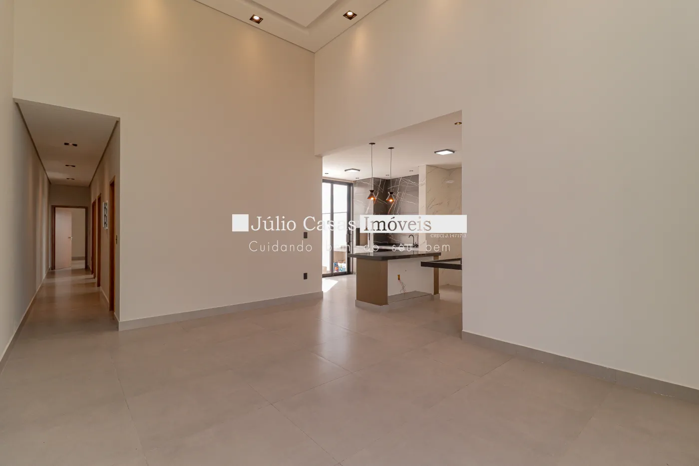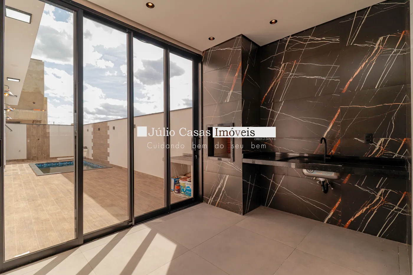 Linda Casa com 3 dormitórios, sendo uma suíte com closet e 1 banheiro social ambos com mármore travertino e cuba exposta, Ampla sala com pé direito alto toda a casa em porcelanato, cozinha com ilha e integrada, espaço gourmet amplo e piscina privativa com cascata, fino acabamento.