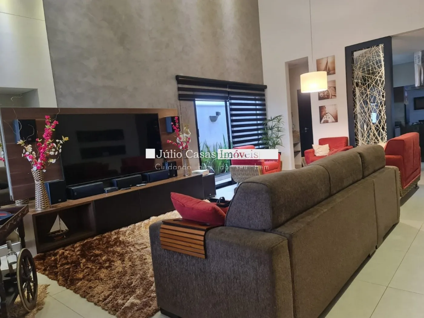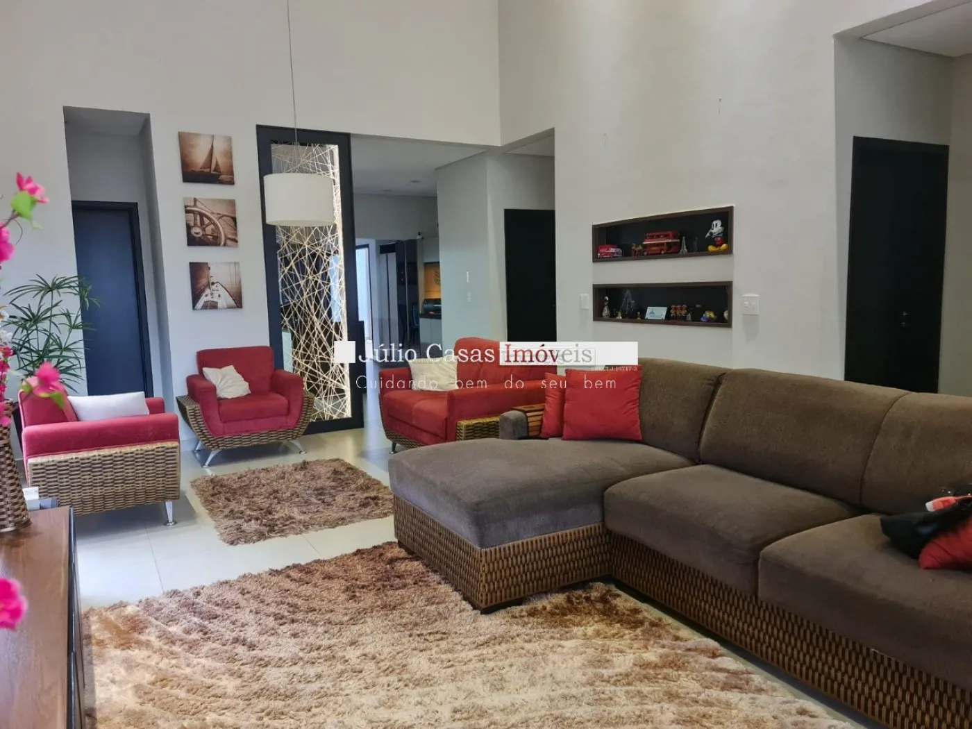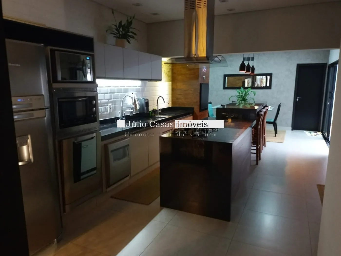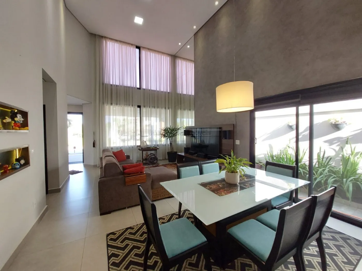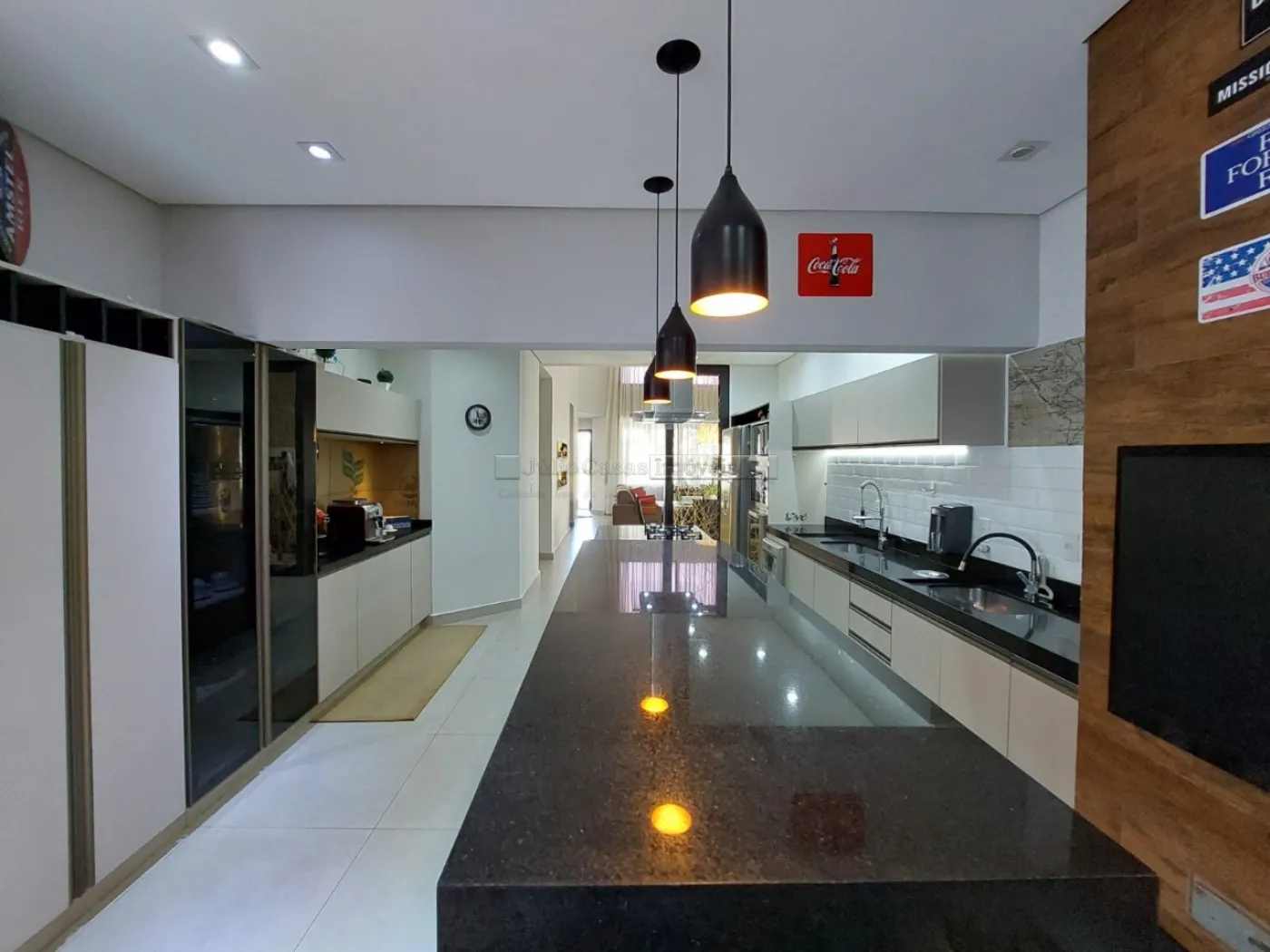 Casa térrea com excelente localização dentro do condomínio. A sala de estar e jantar integra dois ambientes com pé direito duplo, proporcionando uma sensação de amplitude e luminosidade. A cozinha é equipada com móveis planejados, uma ilha em granito e coifa de inox, além de um lavabo sofisticado com pedra de mármore e cuba esculpida. A área de serviço é funcional, com armários e acesso ao quintal, onde se encontra uma piscina aquecida e uma área gourmet completa, incluindo um banheiro.