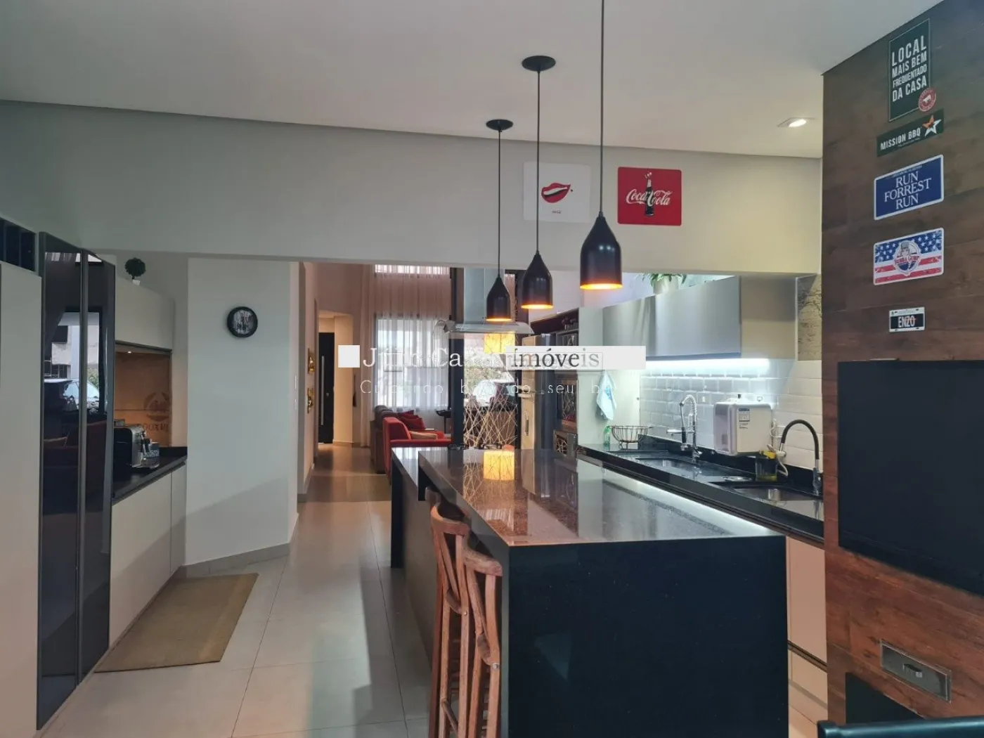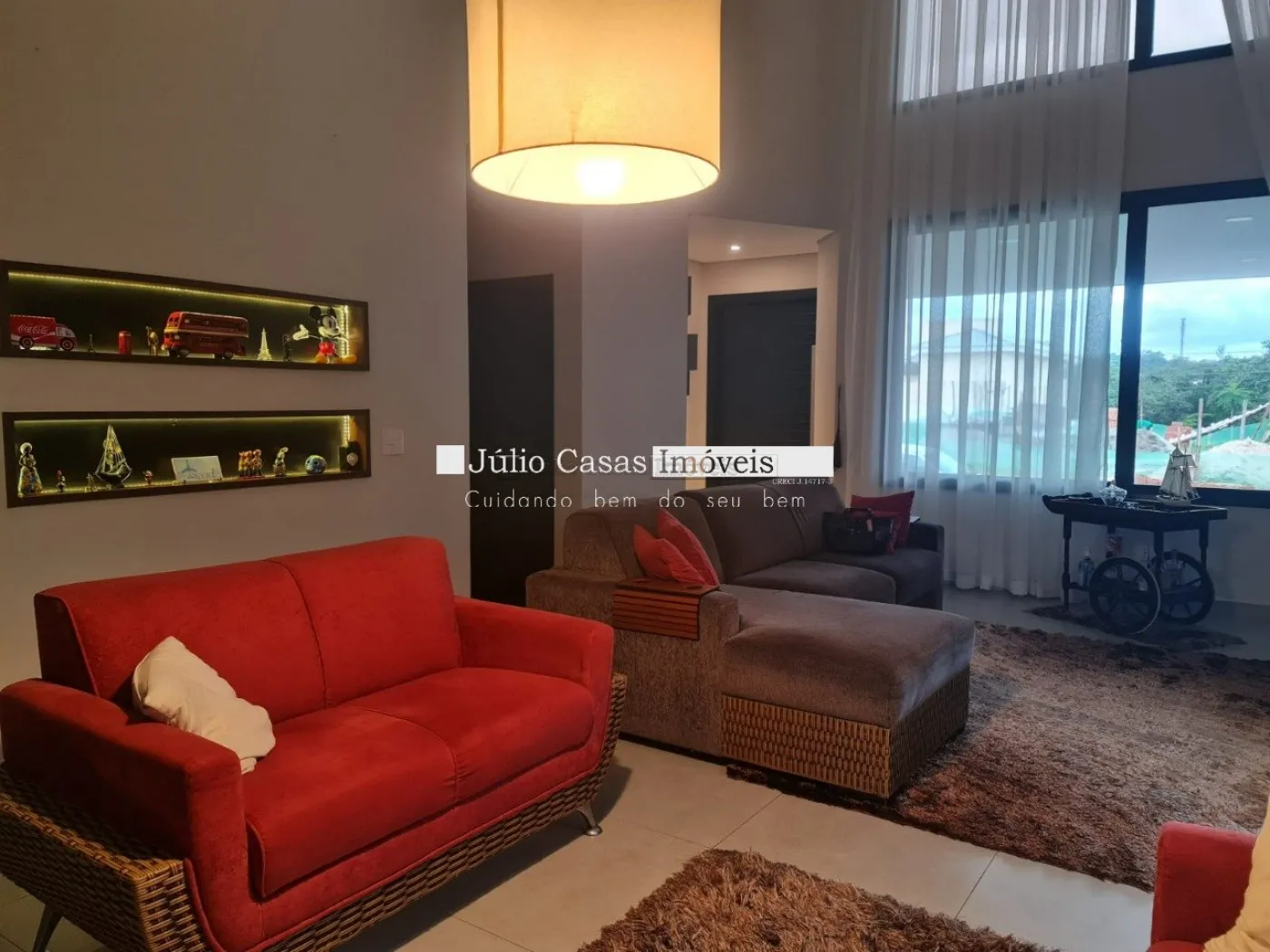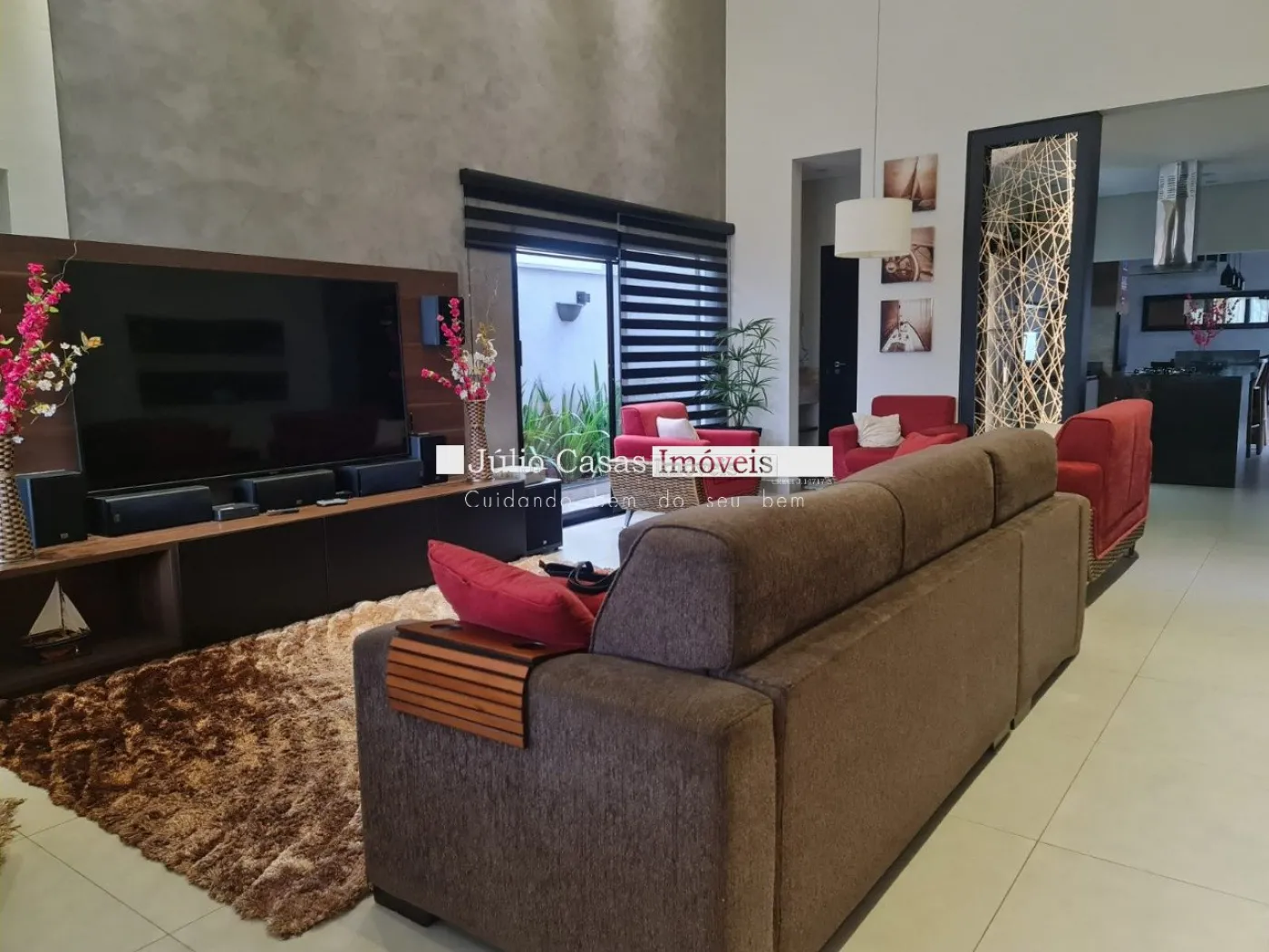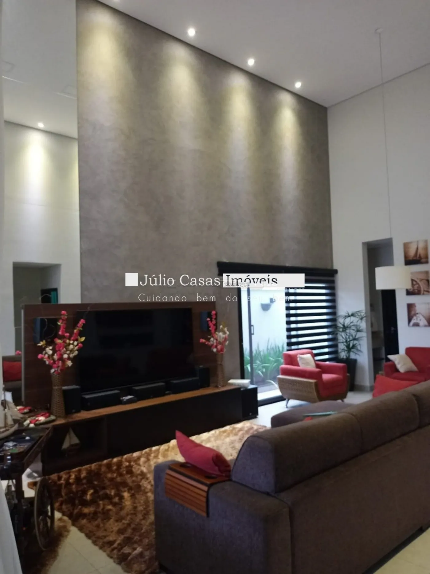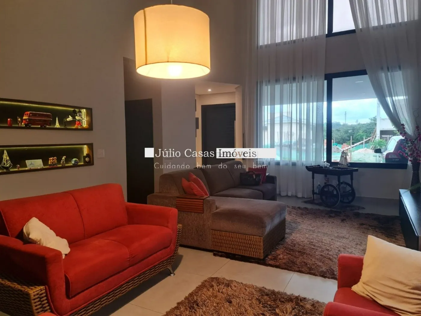 Casa térrea com excelente localização dentro do condomínio. A sala de estar e jantar integra dois ambientes com pé direito duplo, proporcionando uma sensação de amplitude e luminosidade. A cozinha é equipada com móveis planejados, uma ilha em granito e coifa de inox, além de um lavabo sofisticado com pedra de mármore e cuba esculpida. A área de serviço é funcional, com armários e acesso ao quintal, onde se encontra uma piscina aquecida e uma área gourmet completa, incluindo um banheiro.