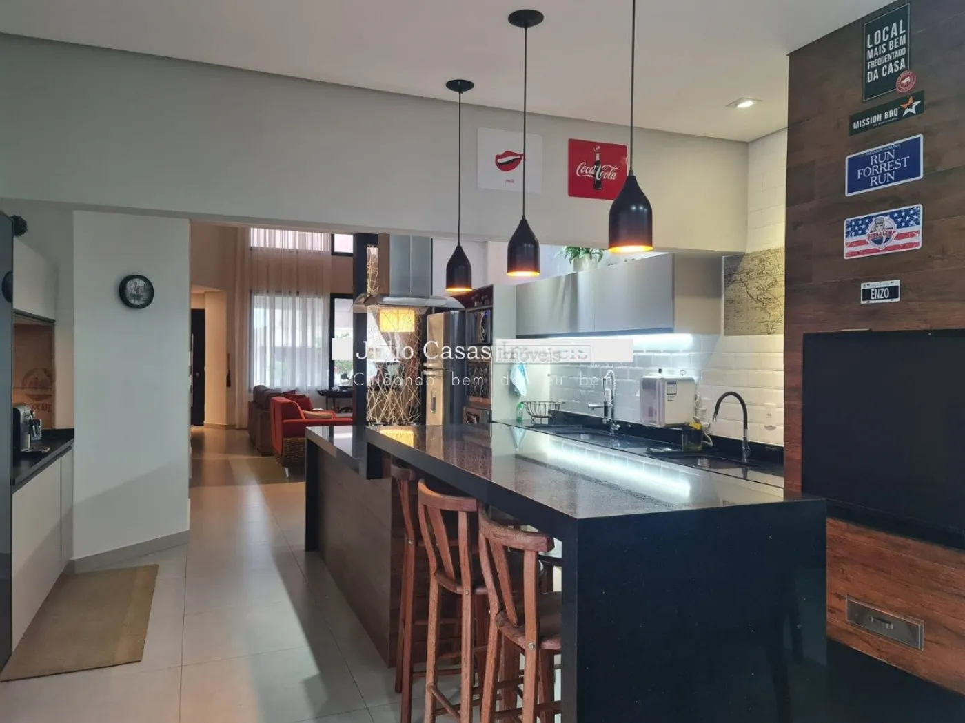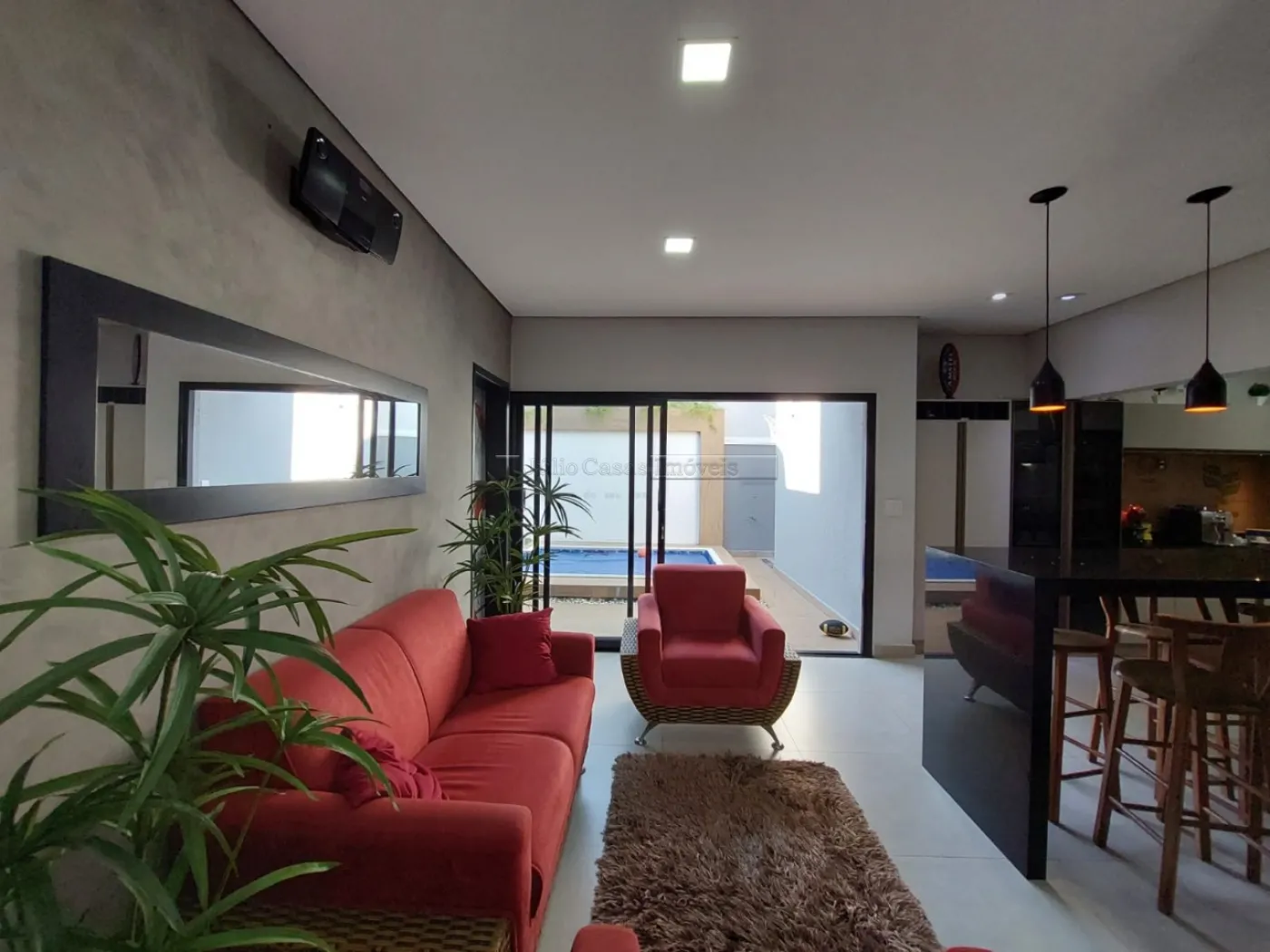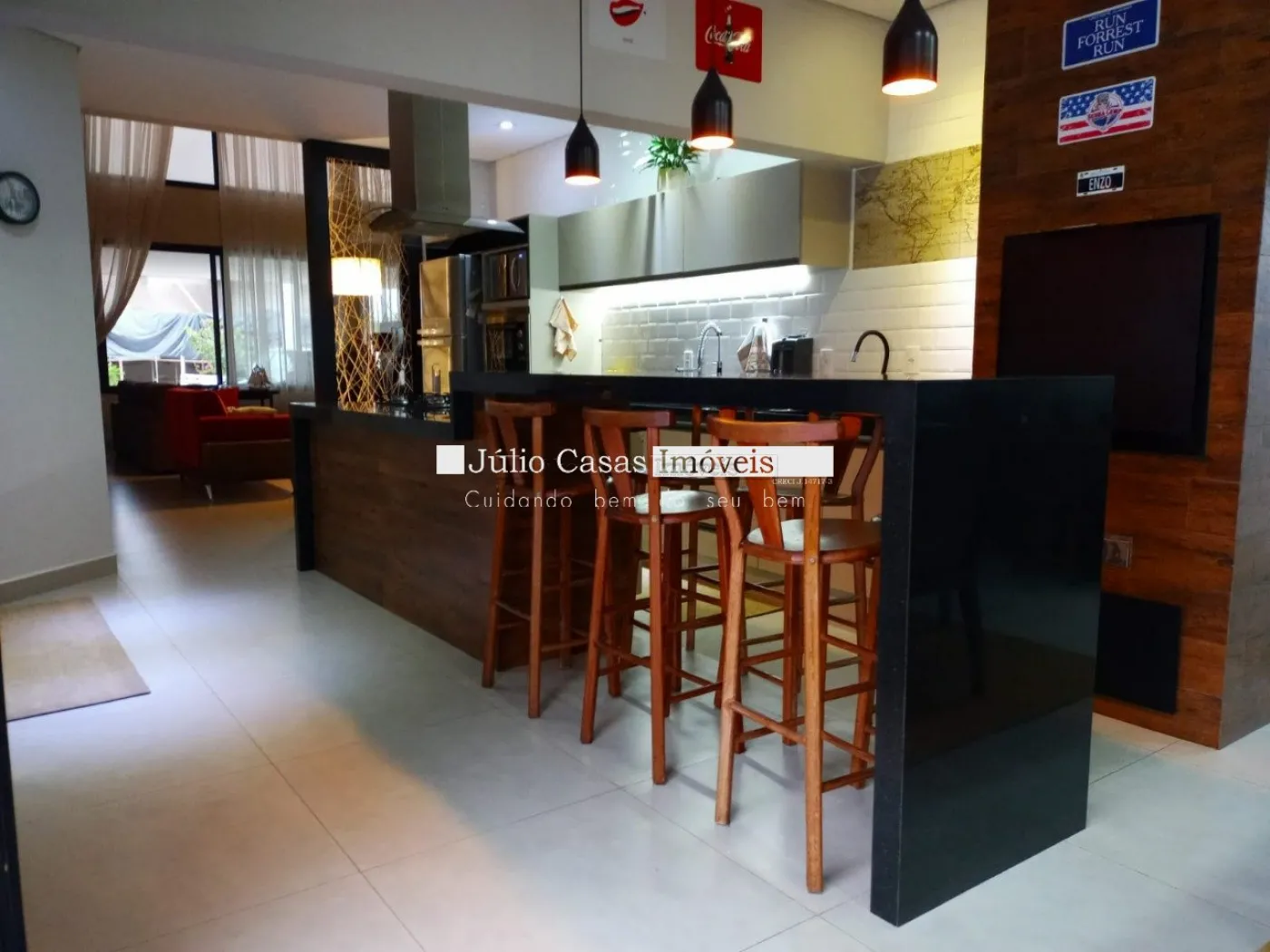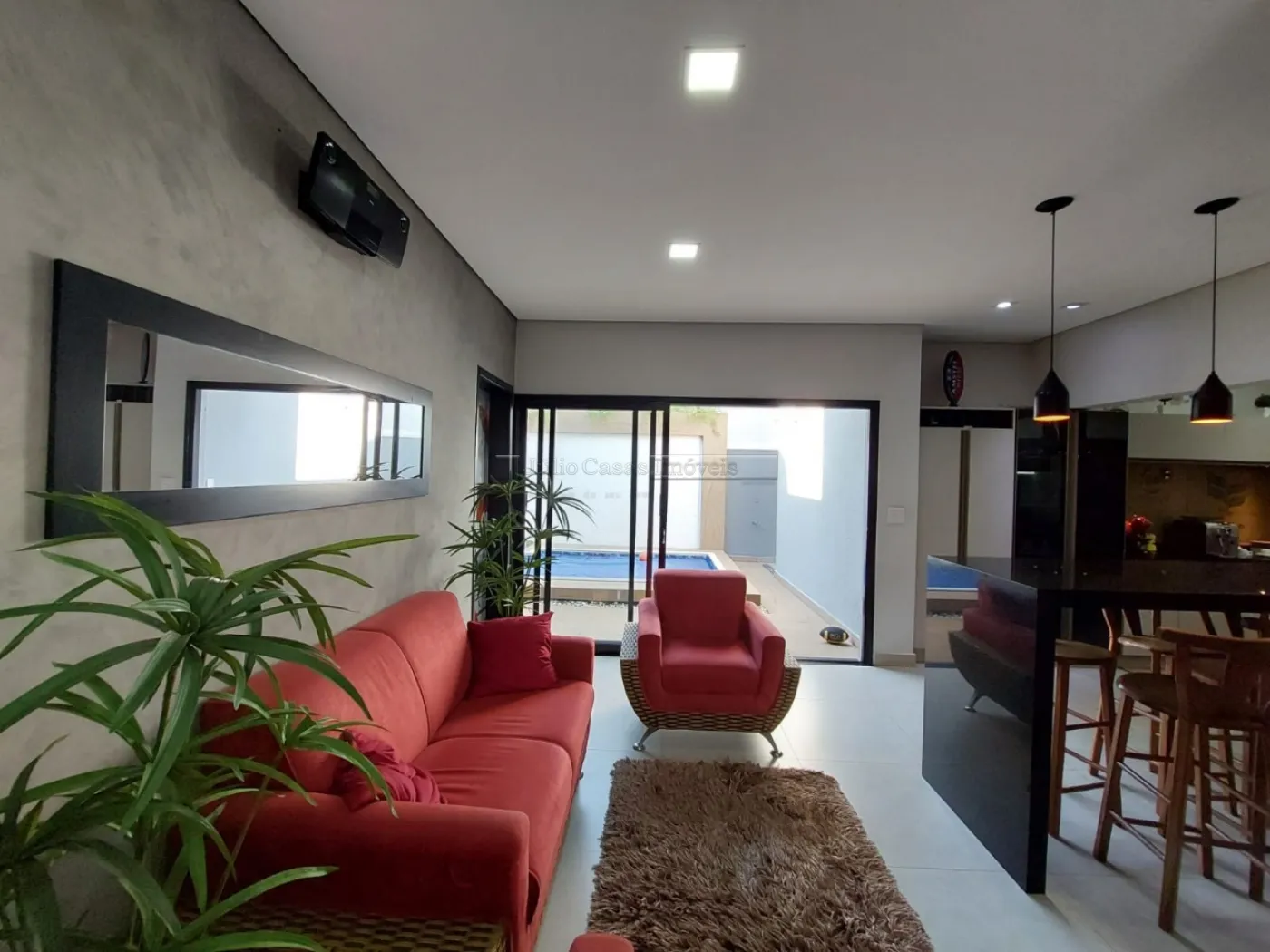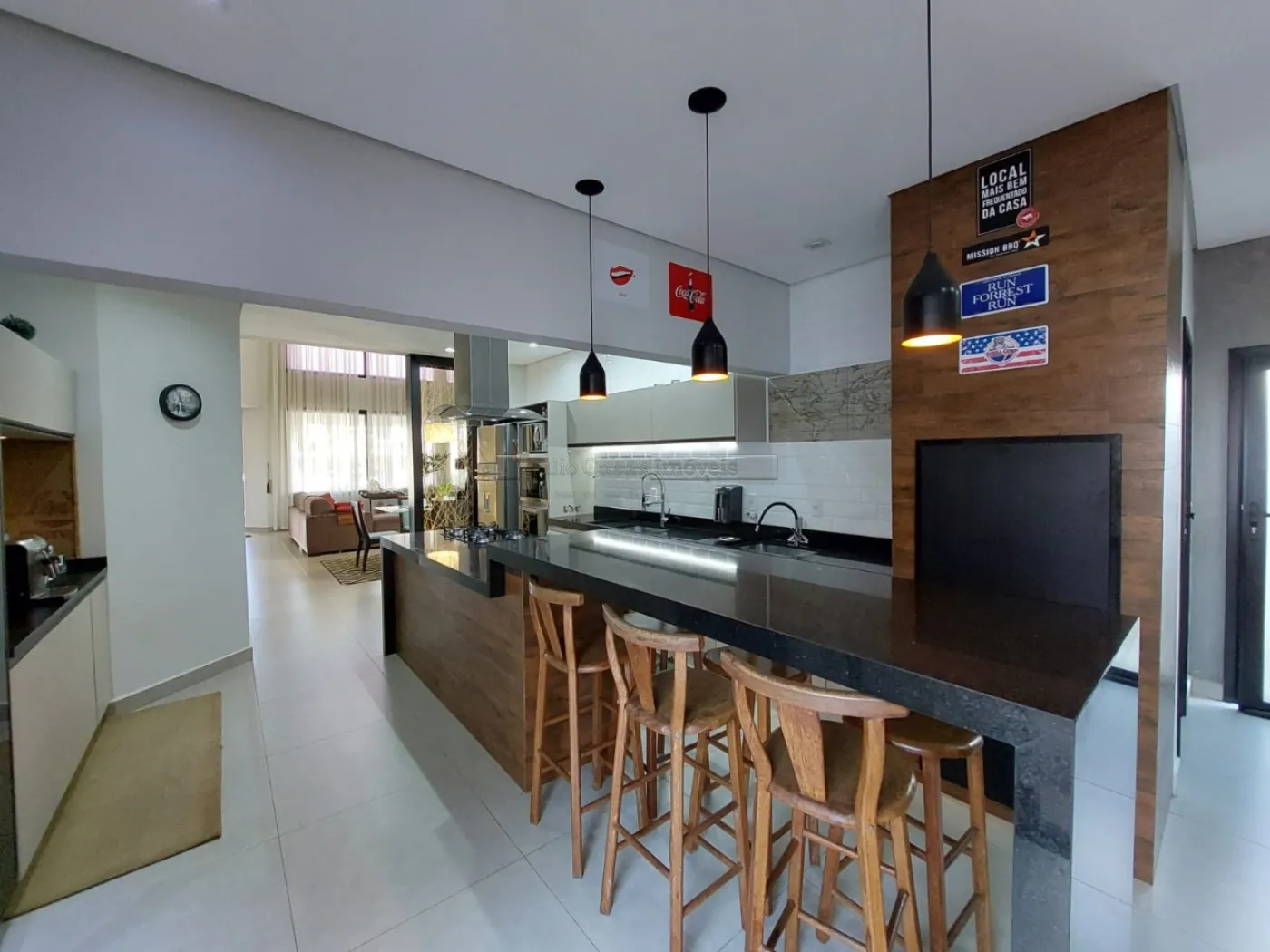 Casa térrea com excelente localização dentro do condomínio. A sala de estar e jantar integra dois ambientes com pé direito duplo, proporcionando uma sensação de amplitude e luminosidade. A cozinha é equipada com móveis planejados, uma ilha em granito e coifa de inox, além de um lavabo sofisticado com pedra de mármore e cuba esculpida. A área de serviço é funcional, com armários e acesso ao quintal, onde se encontra uma piscina aquecida e uma área gourmet completa, incluindo um banheiro.