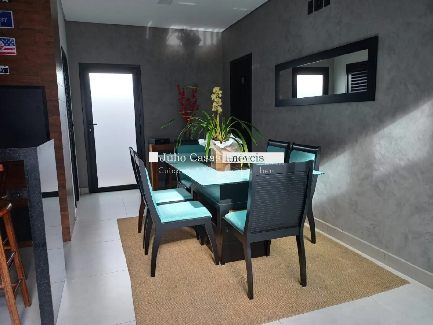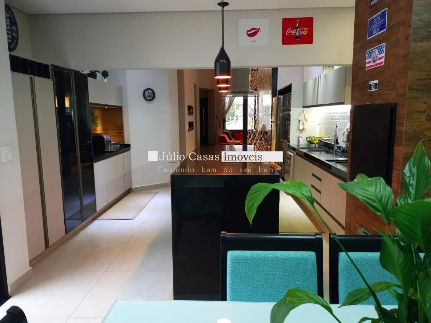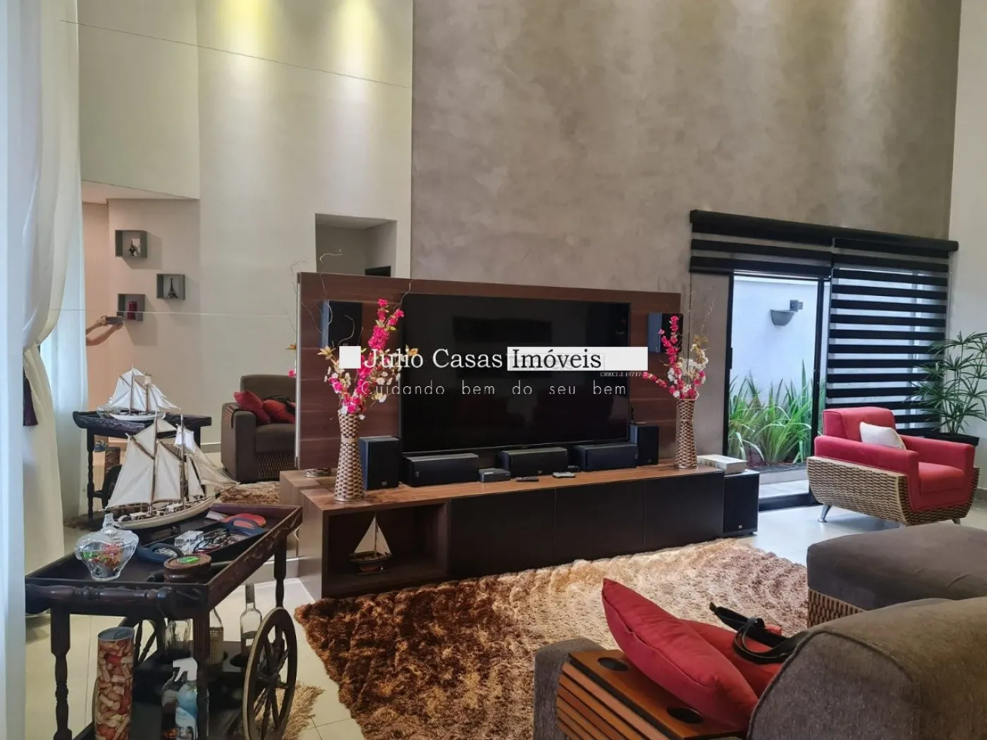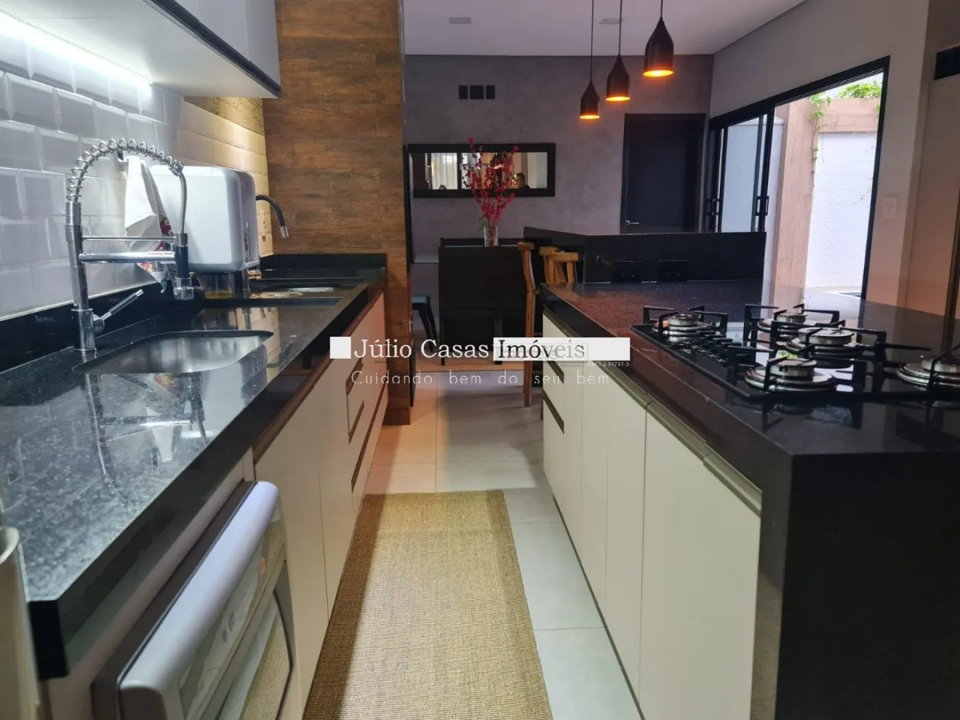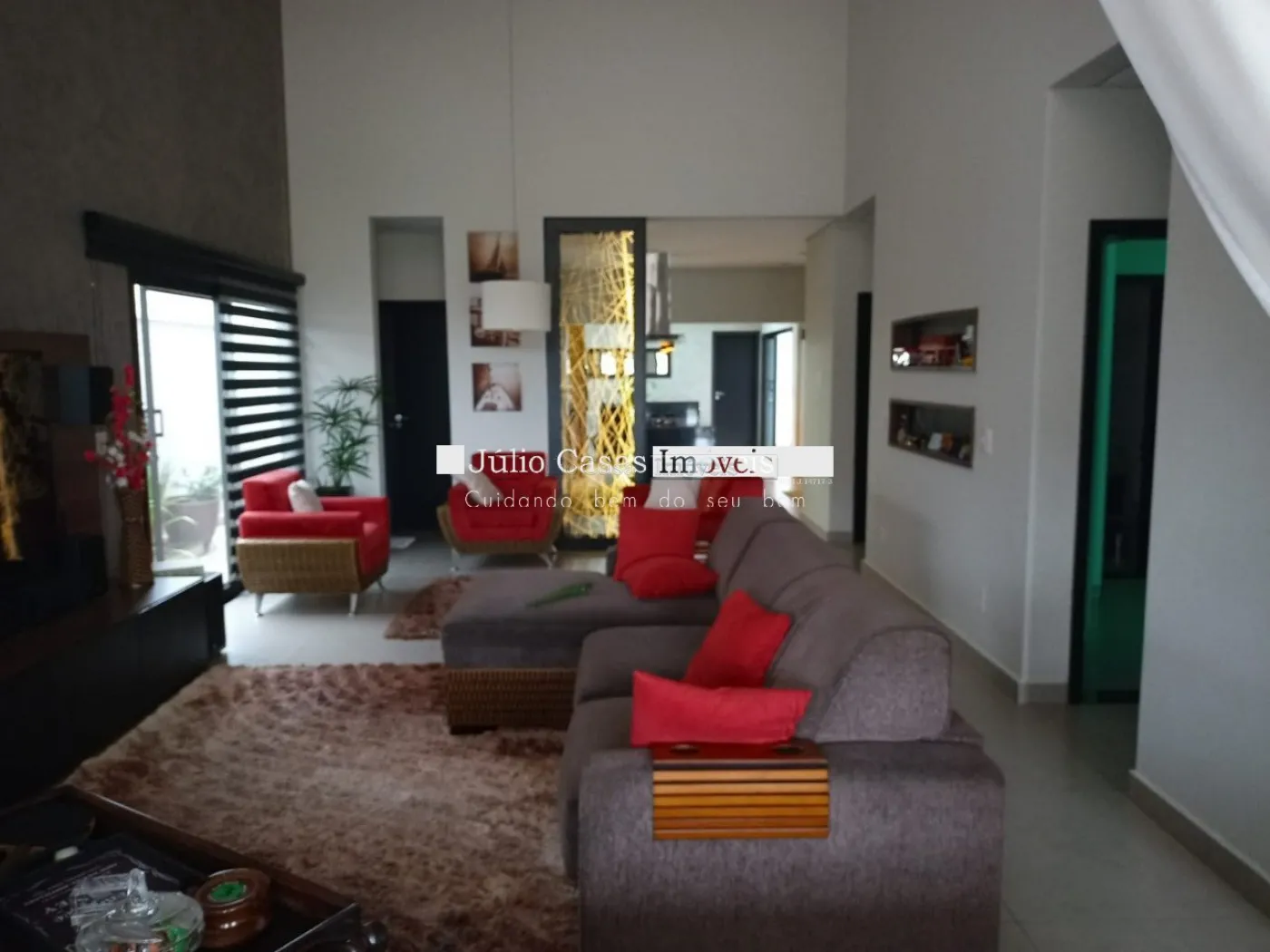 Casa térrea com excelente localização dentro do condomínio. A sala de estar e jantar integra dois ambientes com pé direito duplo, proporcionando uma sensação de amplitude e luminosidade. A cozinha é equipada com móveis planejados, uma ilha em granito e coifa de inox, além de um lavabo sofisticado com pedra de mármore e cuba esculpida. A área de serviço é funcional, com armários e acesso ao quintal, onde se encontra uma piscina aquecida e uma área gourmet completa, incluindo um banheiro.