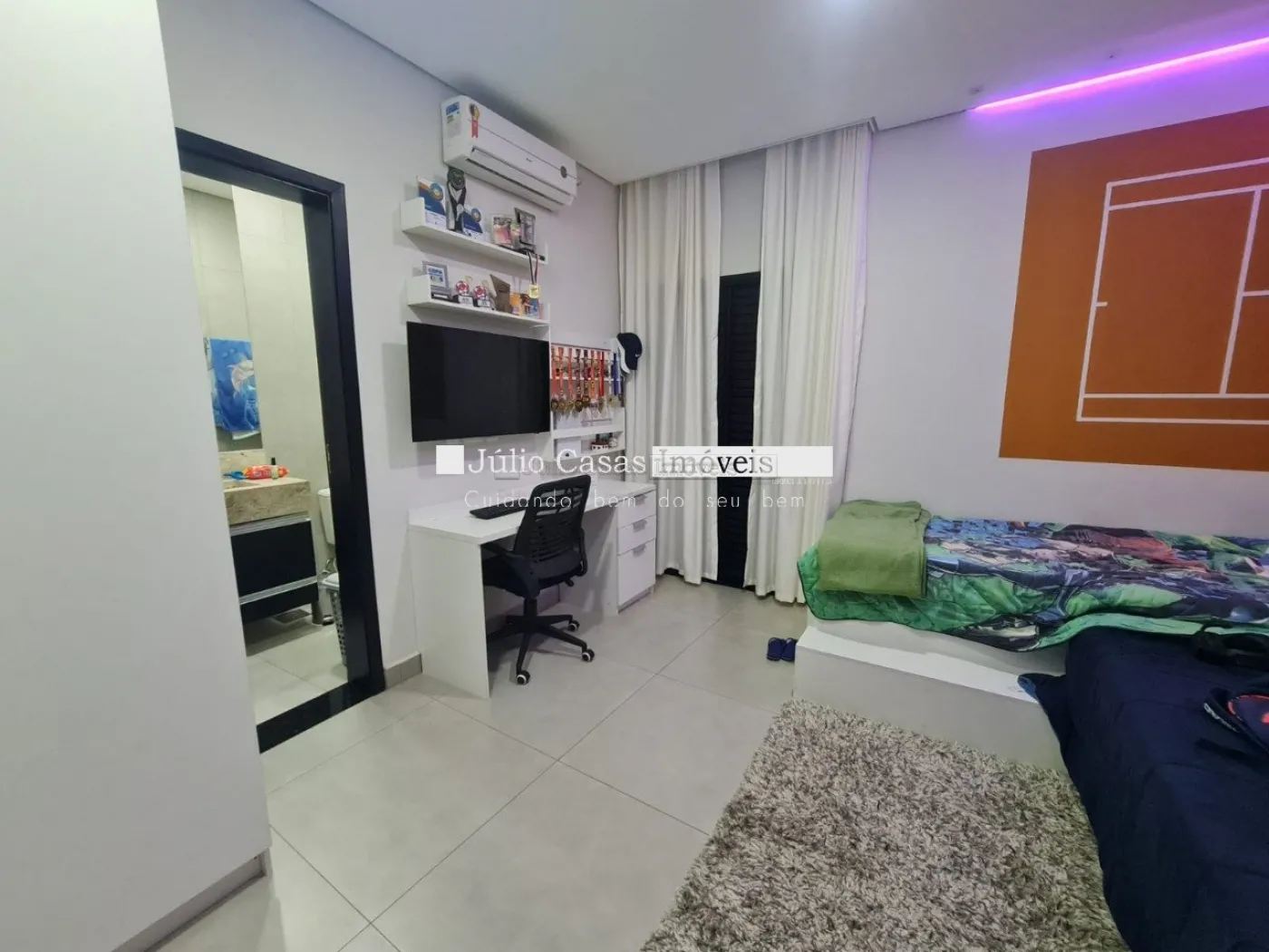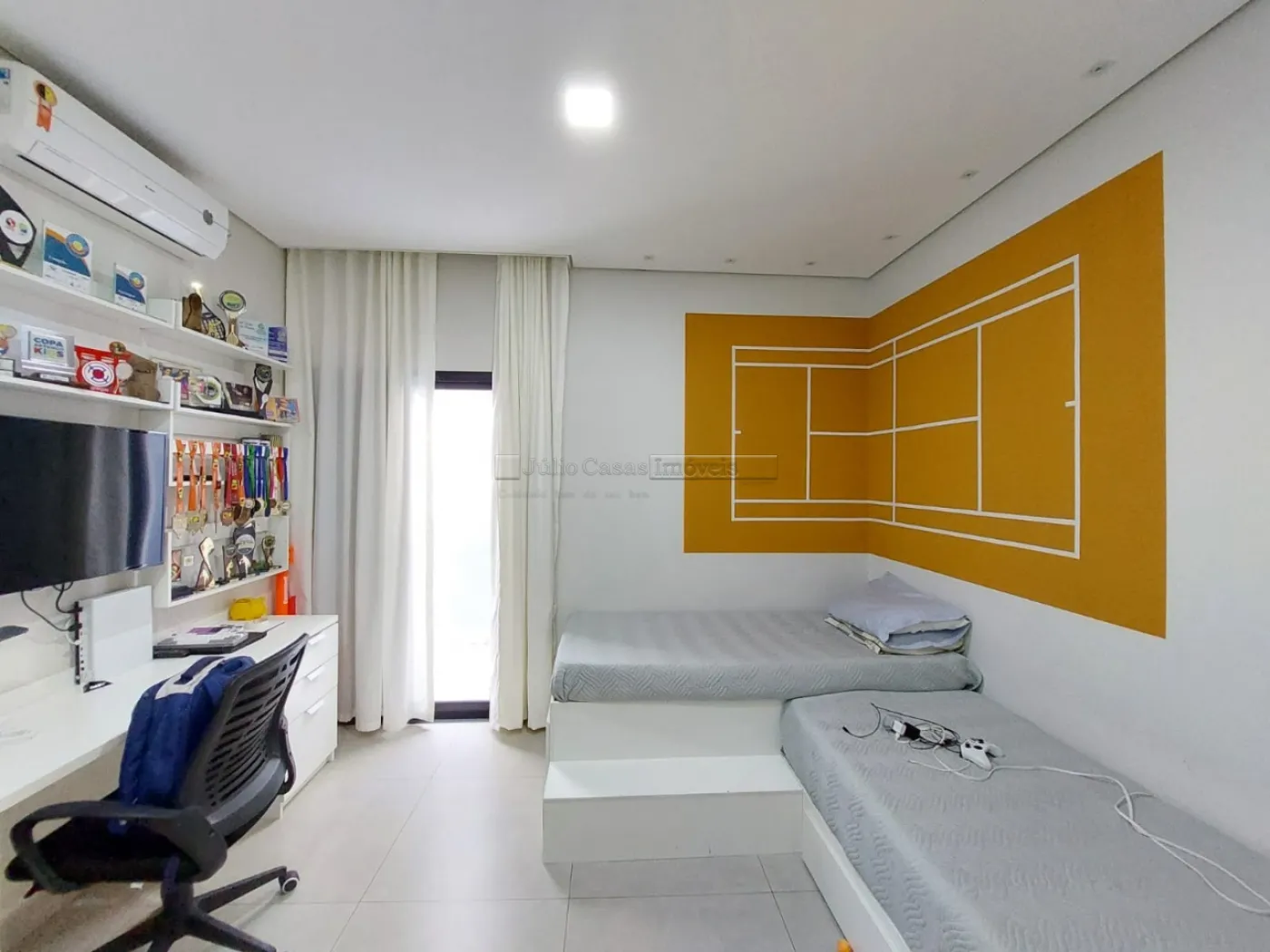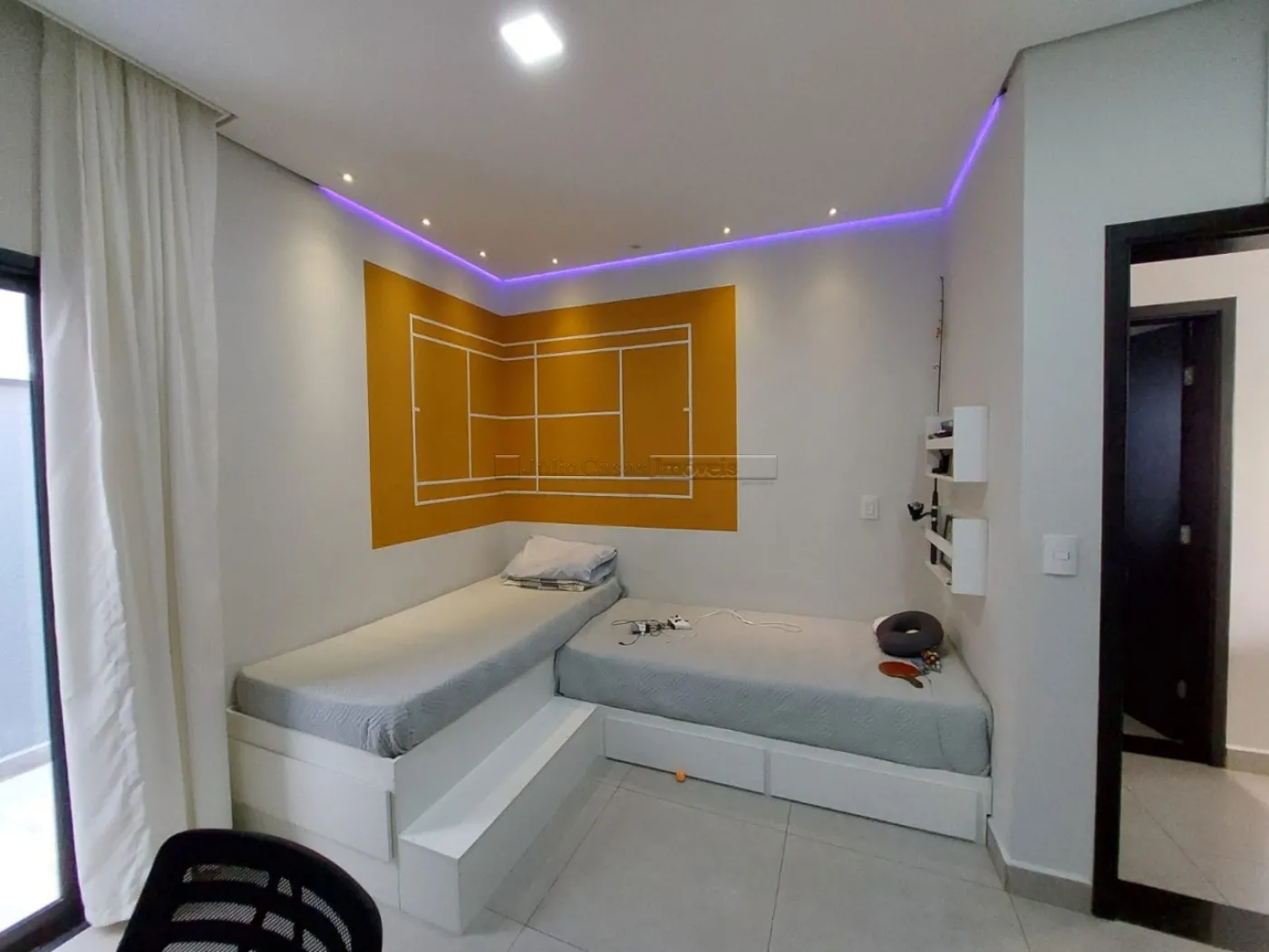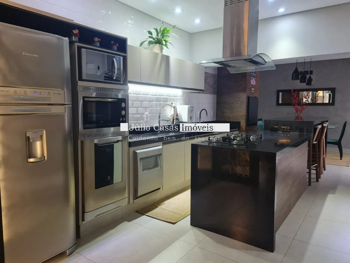 O imóvel possui um escritório modulado, perfeito para trabalho ou estudo, e três suítes, todas com móveis planejados, sendo uma delas uma suíte máster com closet. Para maior conforto, todos os dormitórios e o escritório estão equipados com ar condicionado. A casa é revestida com porcelanato de alta qualidade, possui sistema de aquecimento solar para torneiras e duchas, além de energia fotovoltaica, promovendo economia e sustentabilidade.