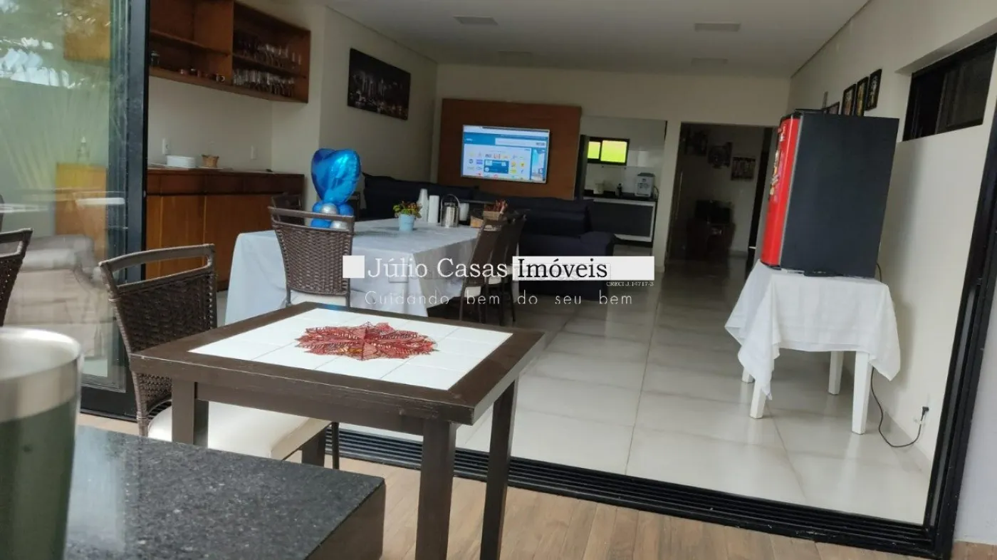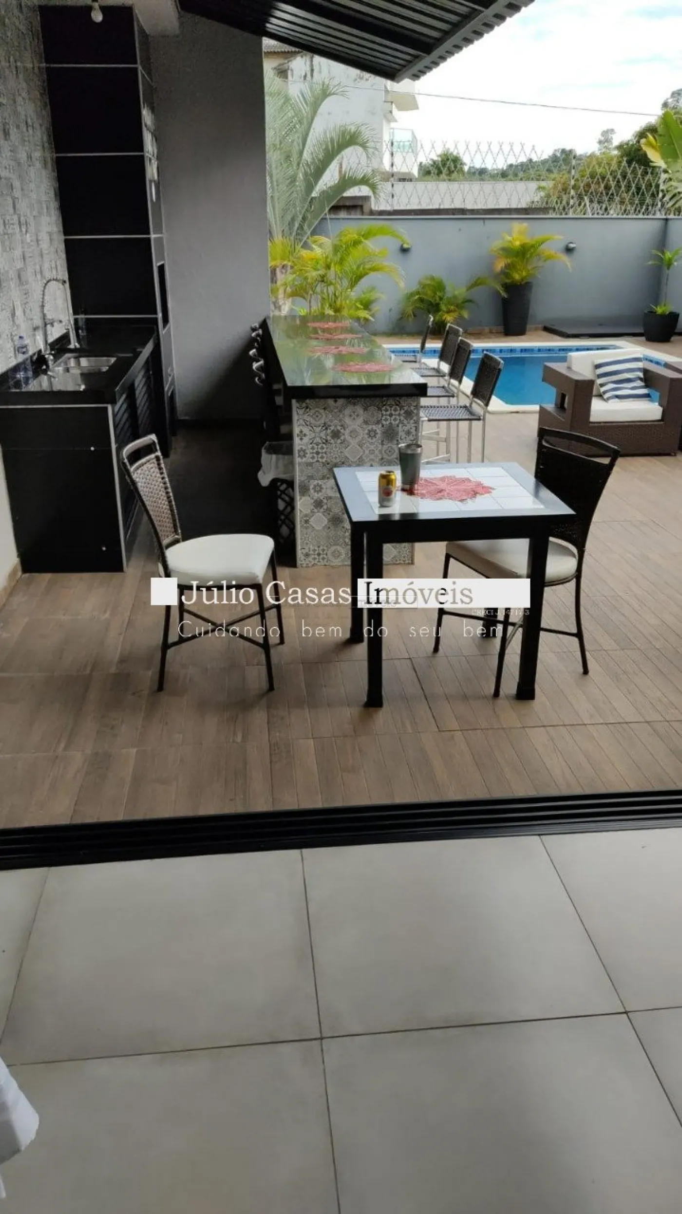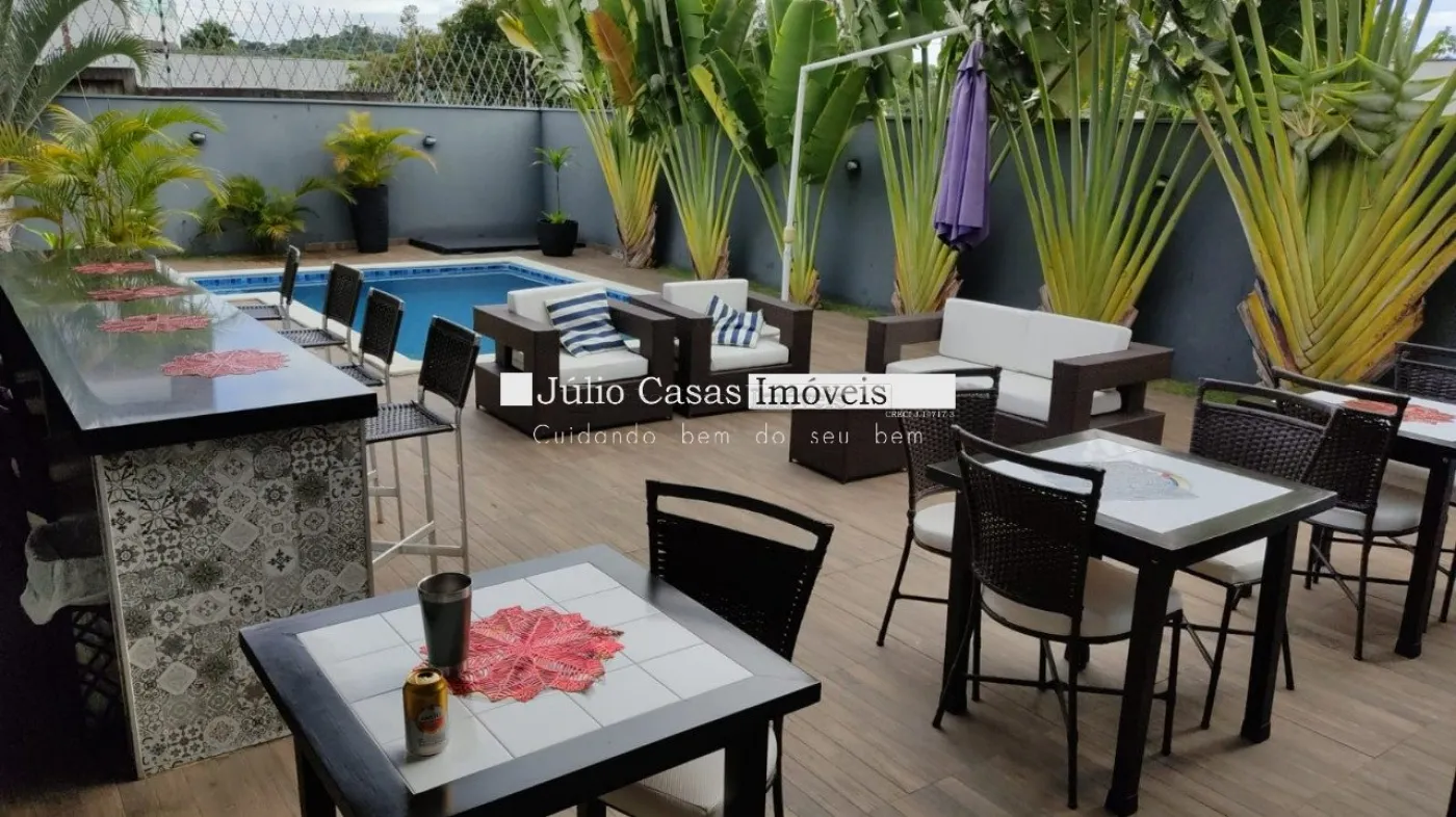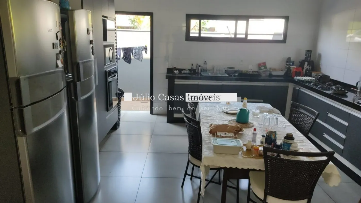 Casa térrea com sala 2 ambientes integrada com a área gourmet. lavabo, cozinha modulada e equipada, despensa, área de serviço, área gourmet com churrasqueira, pia de apoio, wc, piscina com praia, 3 suítes todas com closet.