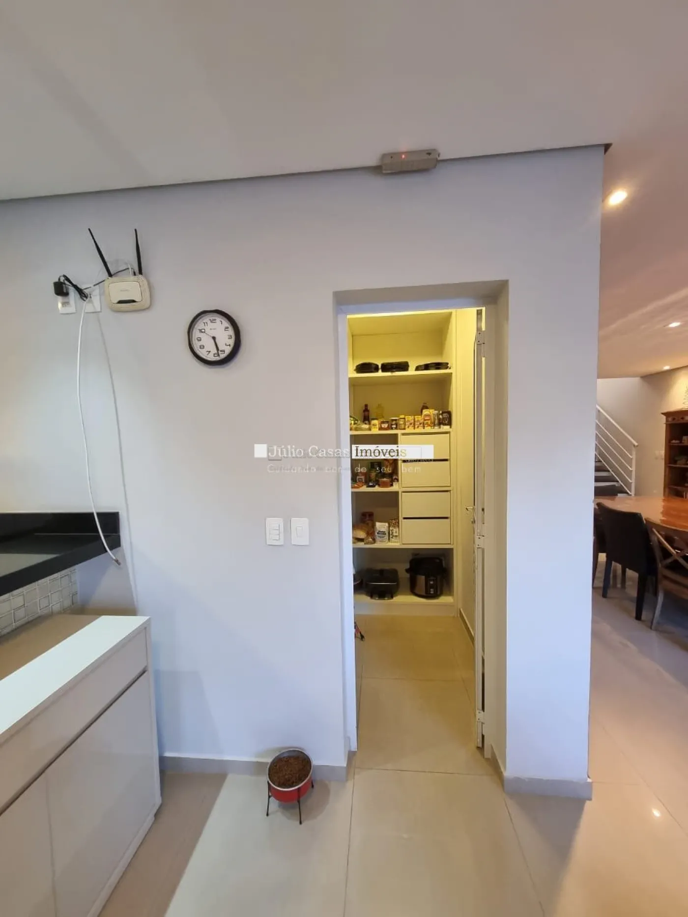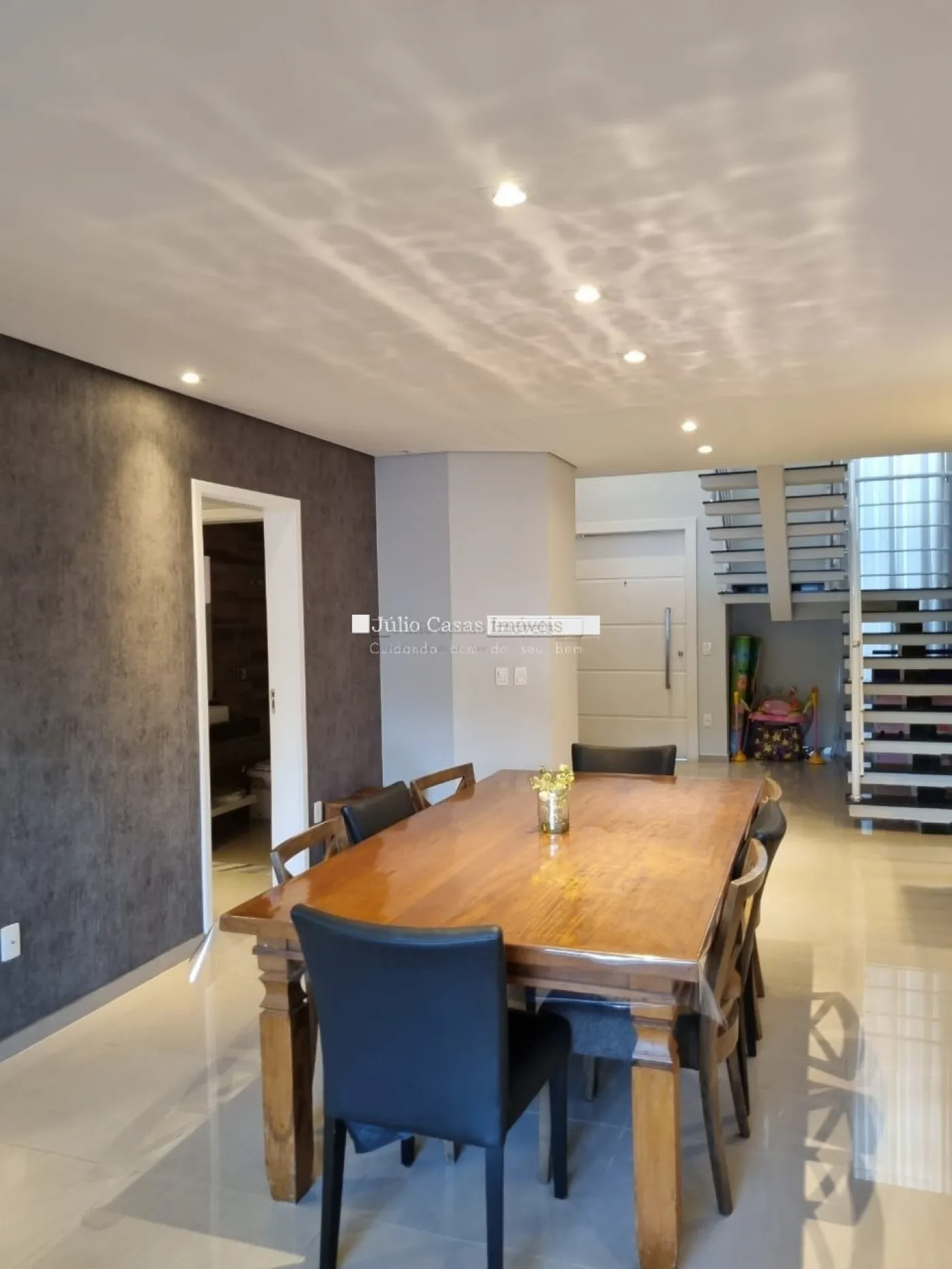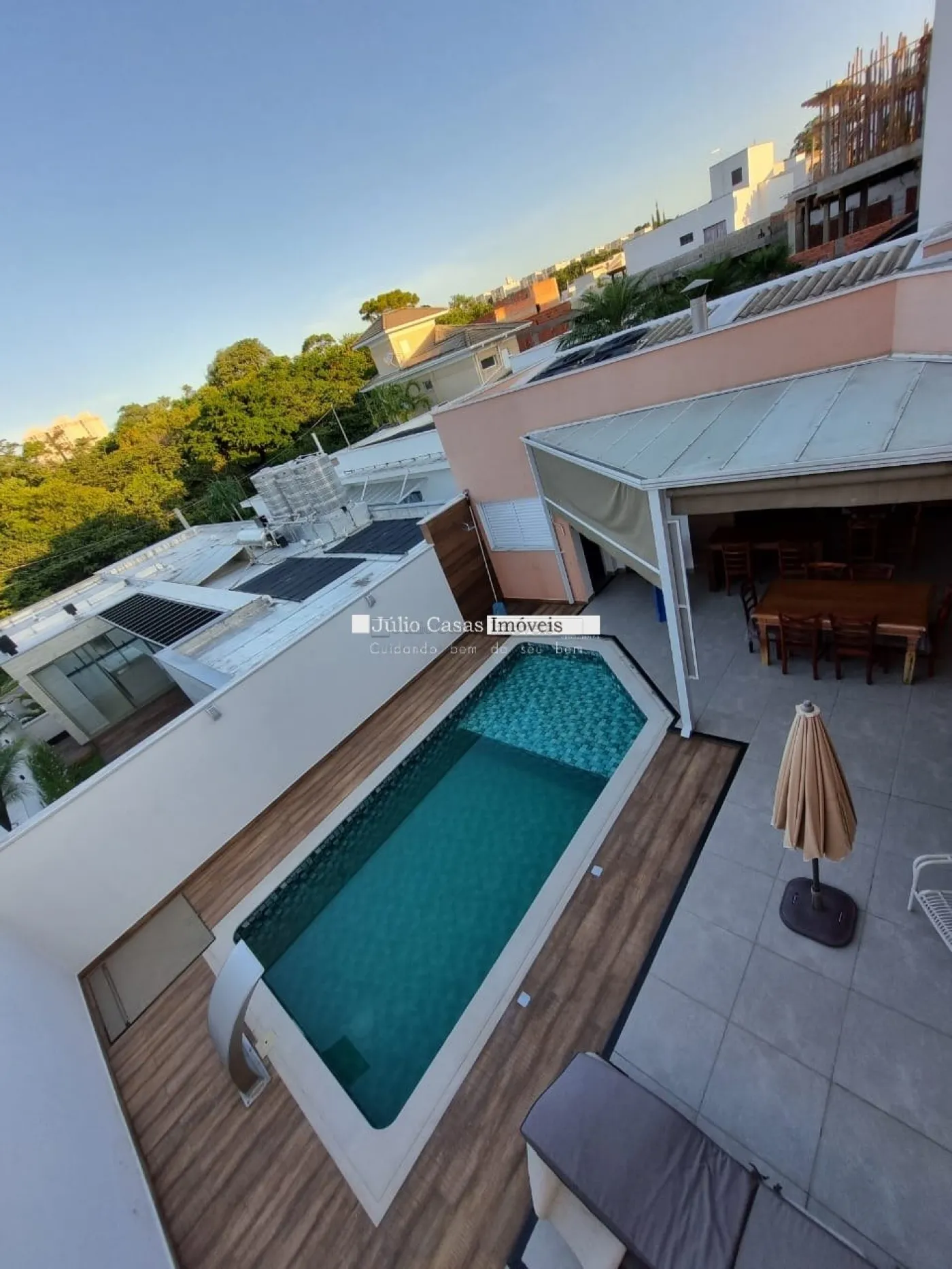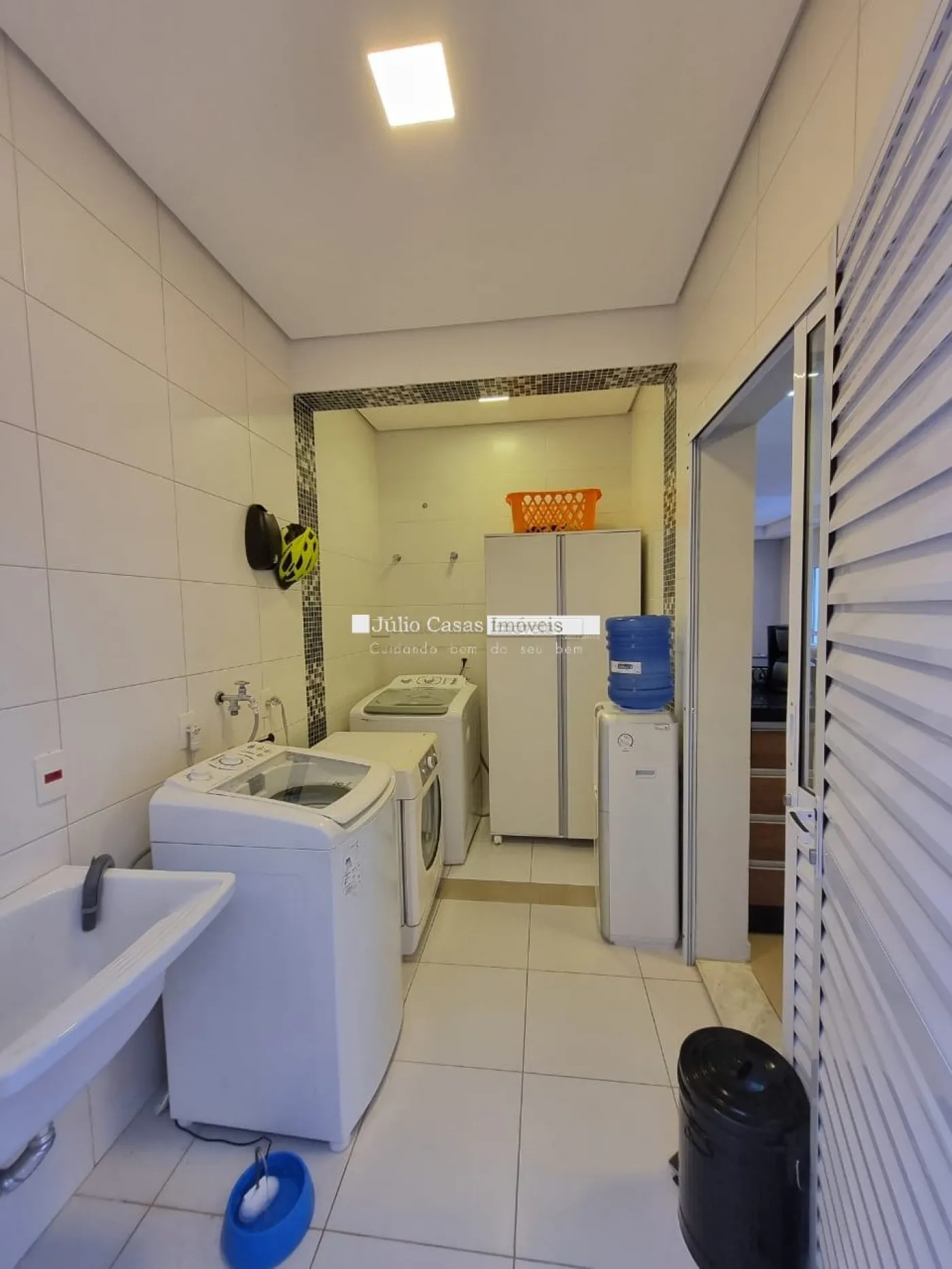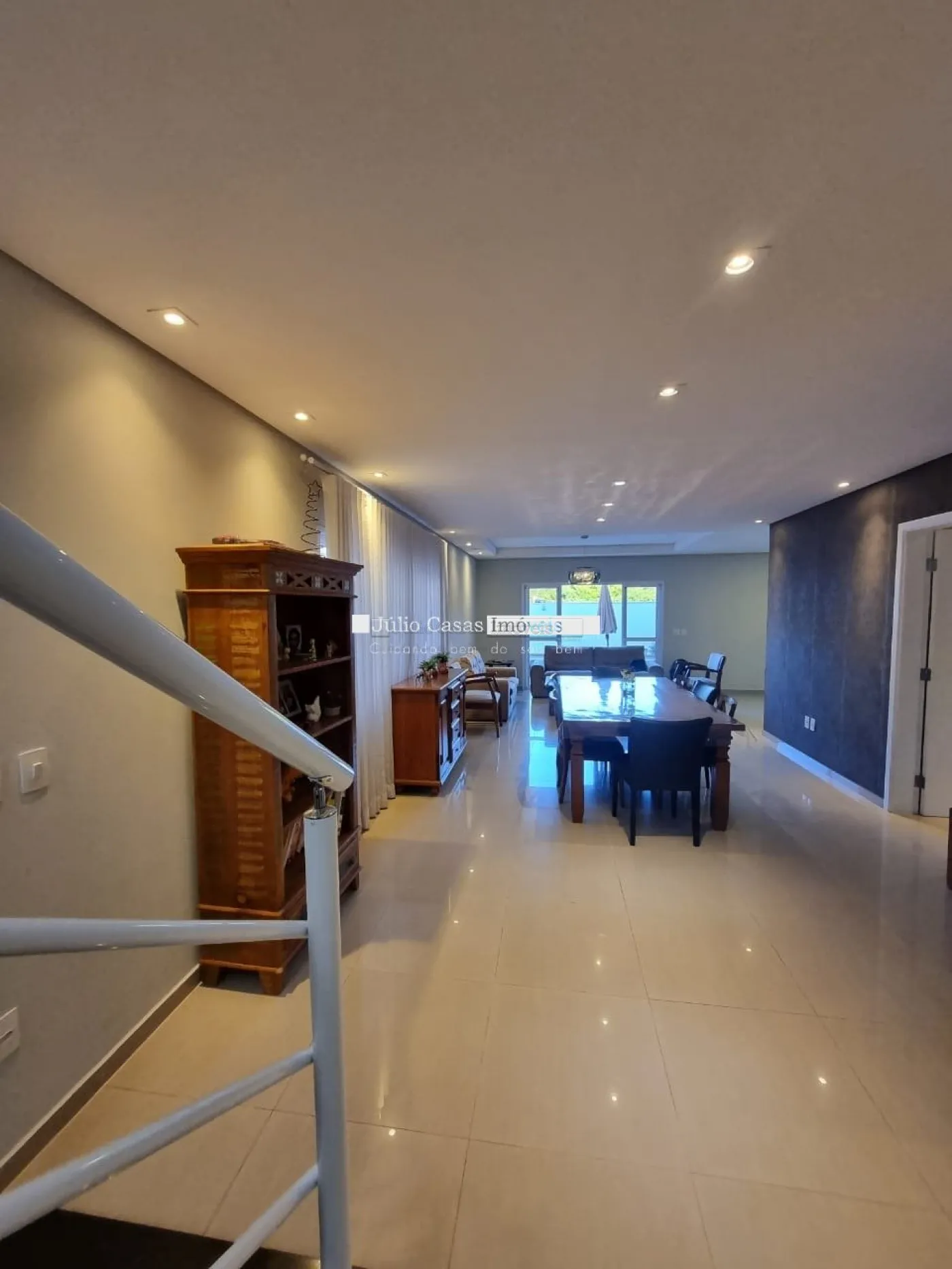 Sala com 2 ambientes em piso porcelanato e sancas em gesso, lavabo com pia e cuba sobreposta, cozinha modulada com coifa em inox, integrada com a área gourmet com pia e churrasqueira. Piscina aquecida, entrada de serviço independente, banheiro para piscina, sala de TV e escritório que pode ser revertido para suíte térrea, amplo hall entre os dormitórios.