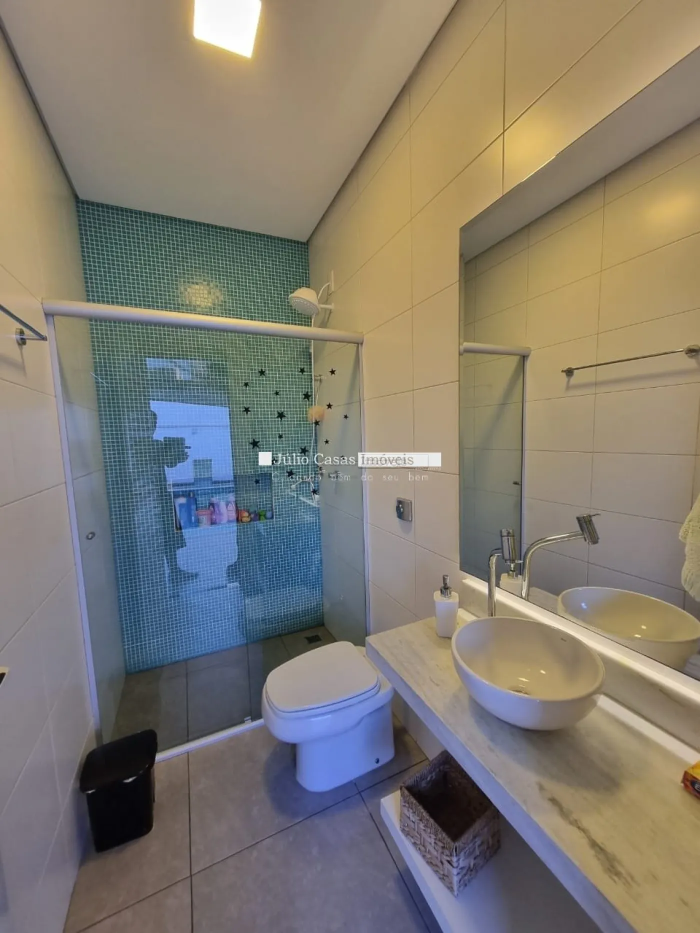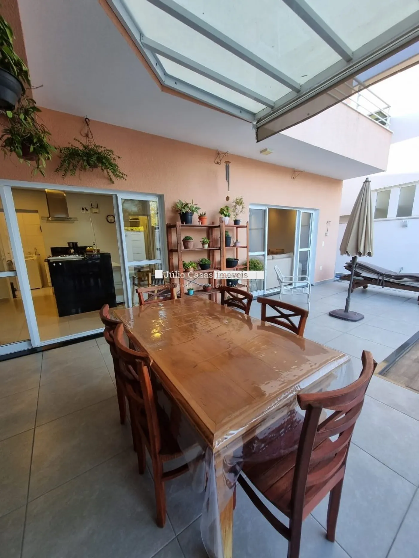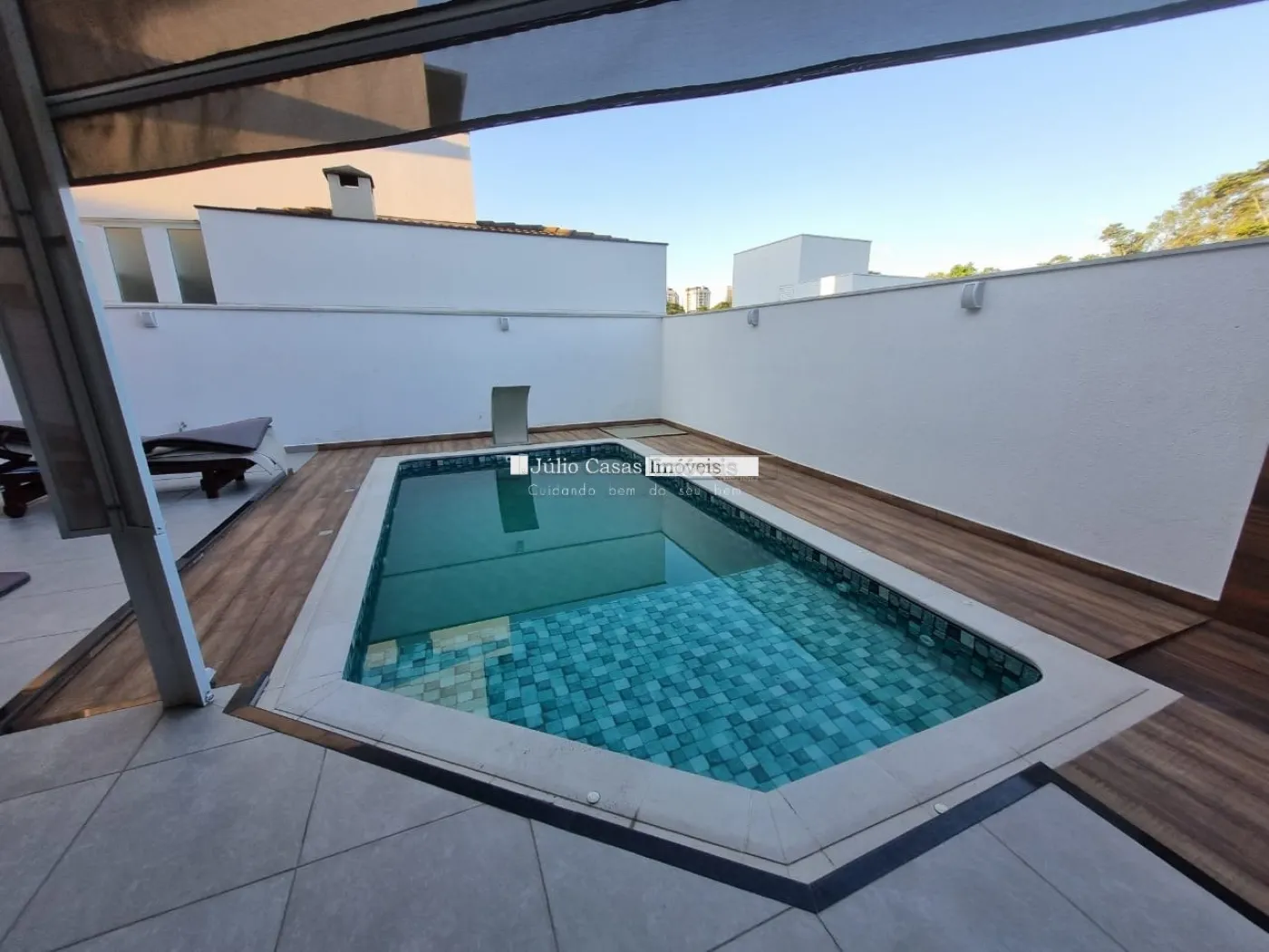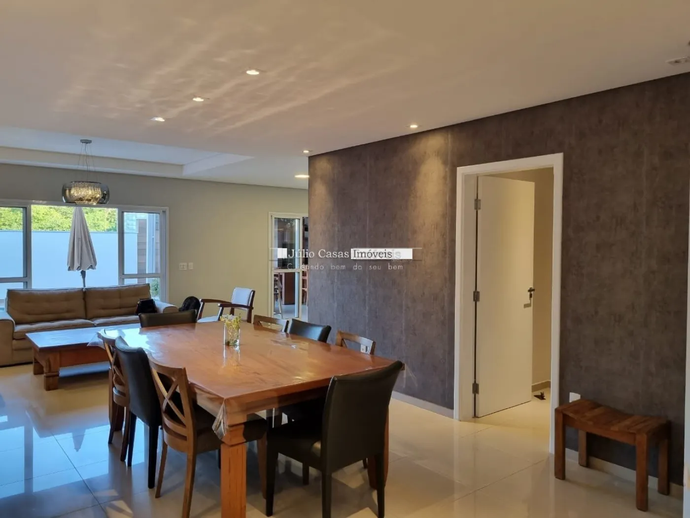 Sala com 2 ambientes em piso porcelanato e sancas em gesso, lavabo com pia e cuba sobreposta, cozinha modulada com coifa em inox, integrada com a área gourmet com pia e churrasqueira. Piscina aquecida, entrada de serviço independente, banheiro para piscina, sala de TV e escritório que pode ser revertido para suíte térrea, amplo hall entre os dormitórios.