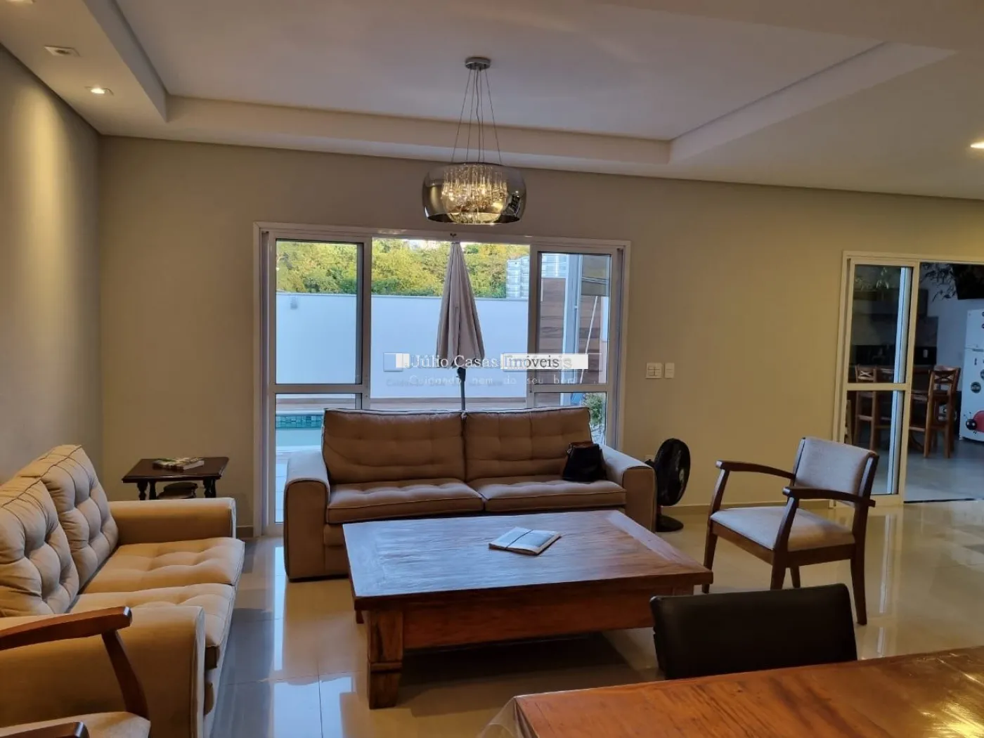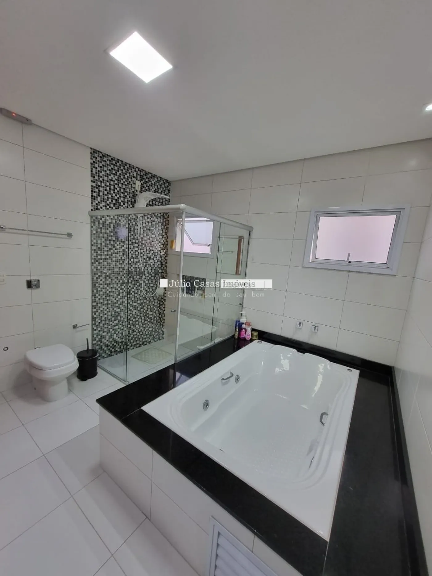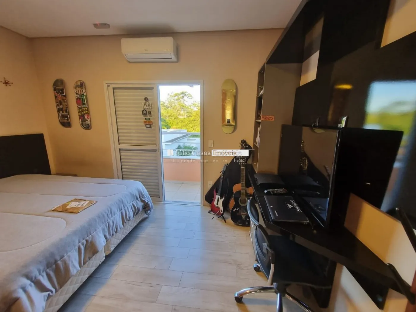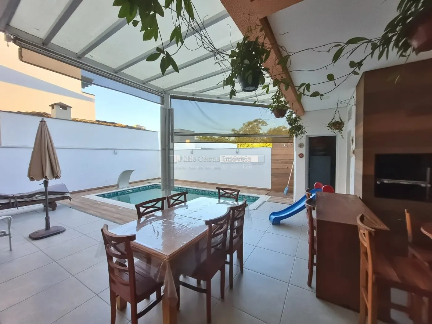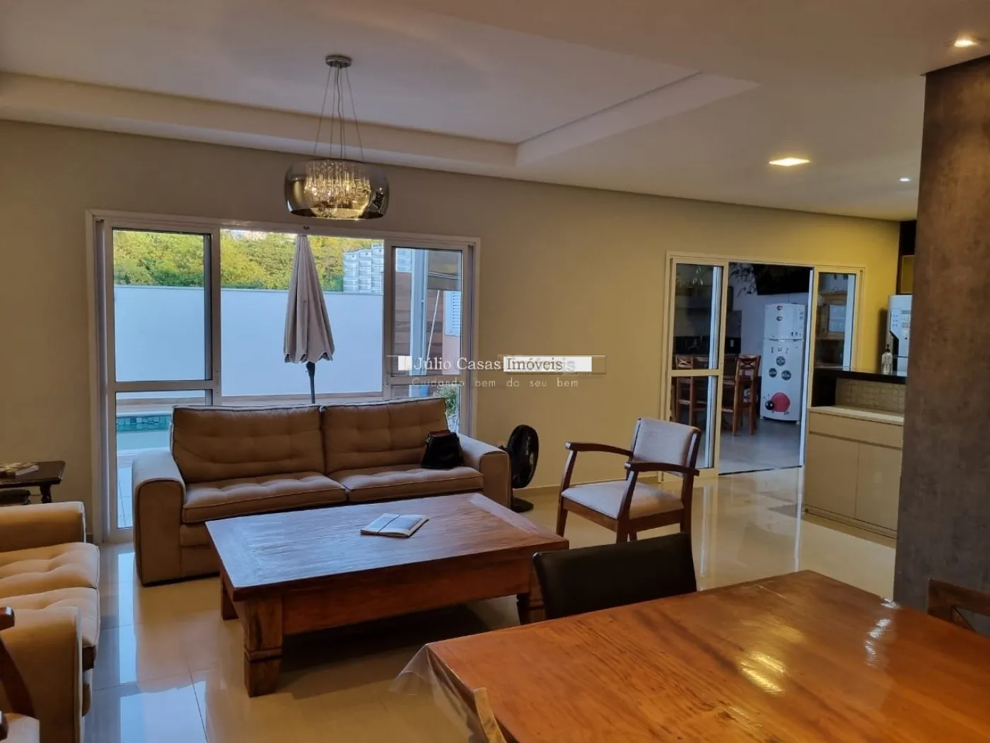 Sala com 2 ambientes em piso porcelanato e sancas em gesso, lavabo com pia e cuba sobreposta, cozinha modulada com coifa em inox, integrada com a área gourmet com pia e churrasqueira. Piscina aquecida, entrada de serviço independente, banheiro para piscina, sala de TV e escritório que pode ser revertido para suíte térrea, amplo hall entre os dormitórios.