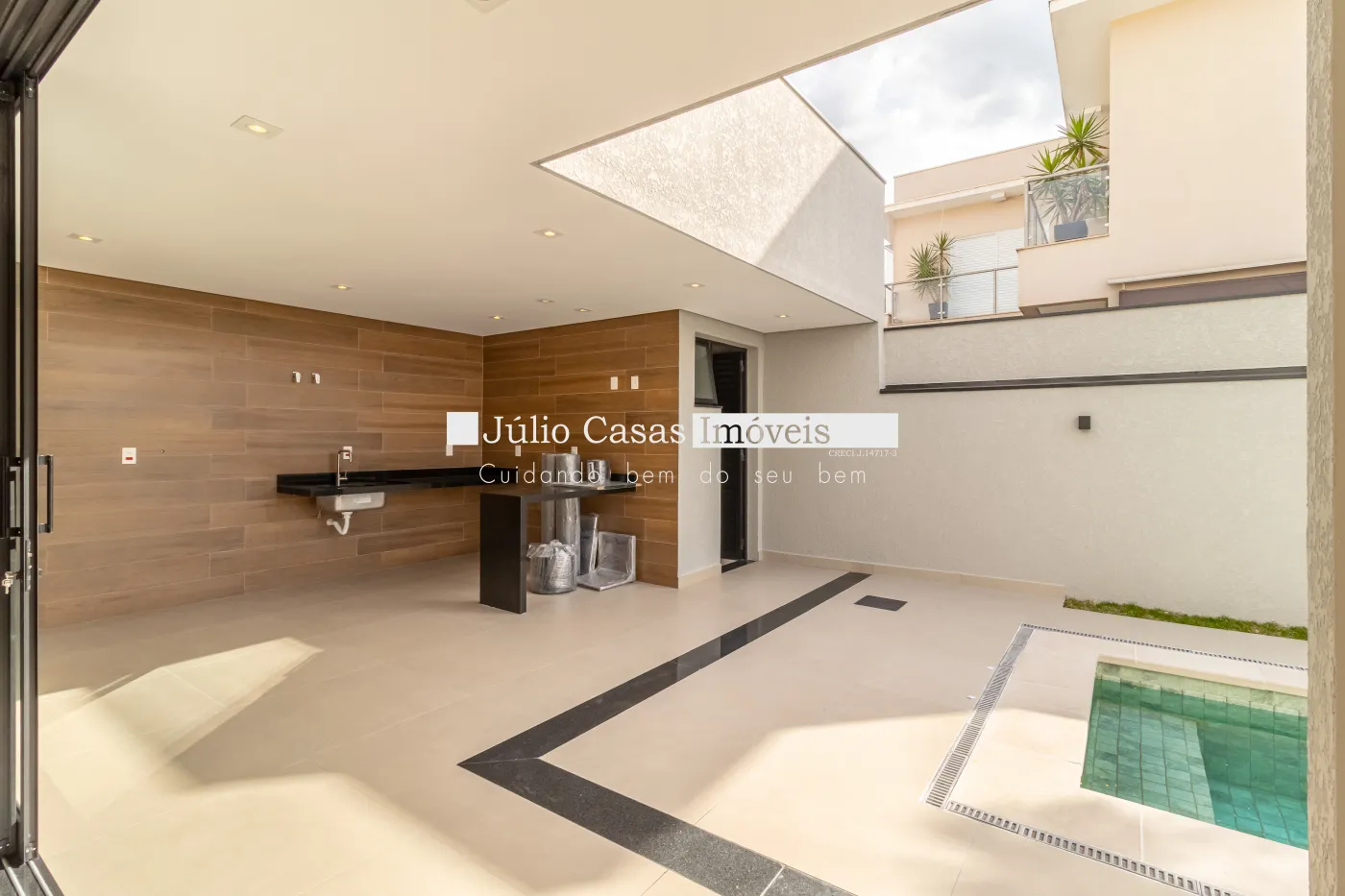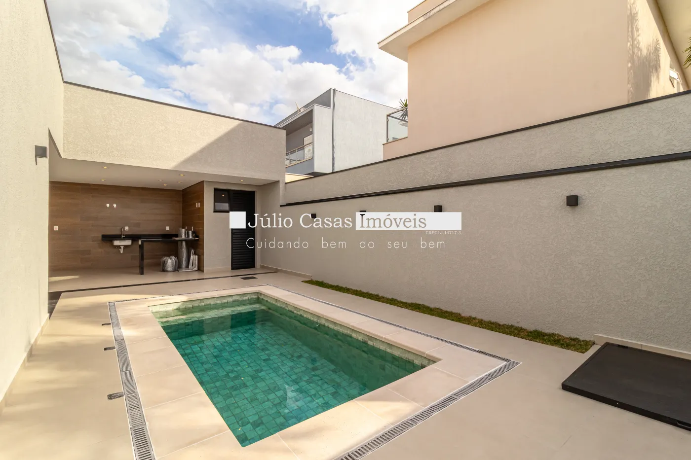 Na parte externa, o espaço gourmet se integra à área de lazer, destacando-se pela churrasqueira e pelo ambiente pensado para reunir pessoas com conforto. A piscina com iluminação e hidromassagem é o grande destaque, proporcionando relaxamento e sofisticação ao ar livre. O paisagismo cuidadosamente planejado valoriza ainda mais o projeto, trazendo equilíbrio entre a natureza e a arquitetura. A garagem comporta até seis veículos, sendo três vagas cobertas, garantindo praticidade e proteção.