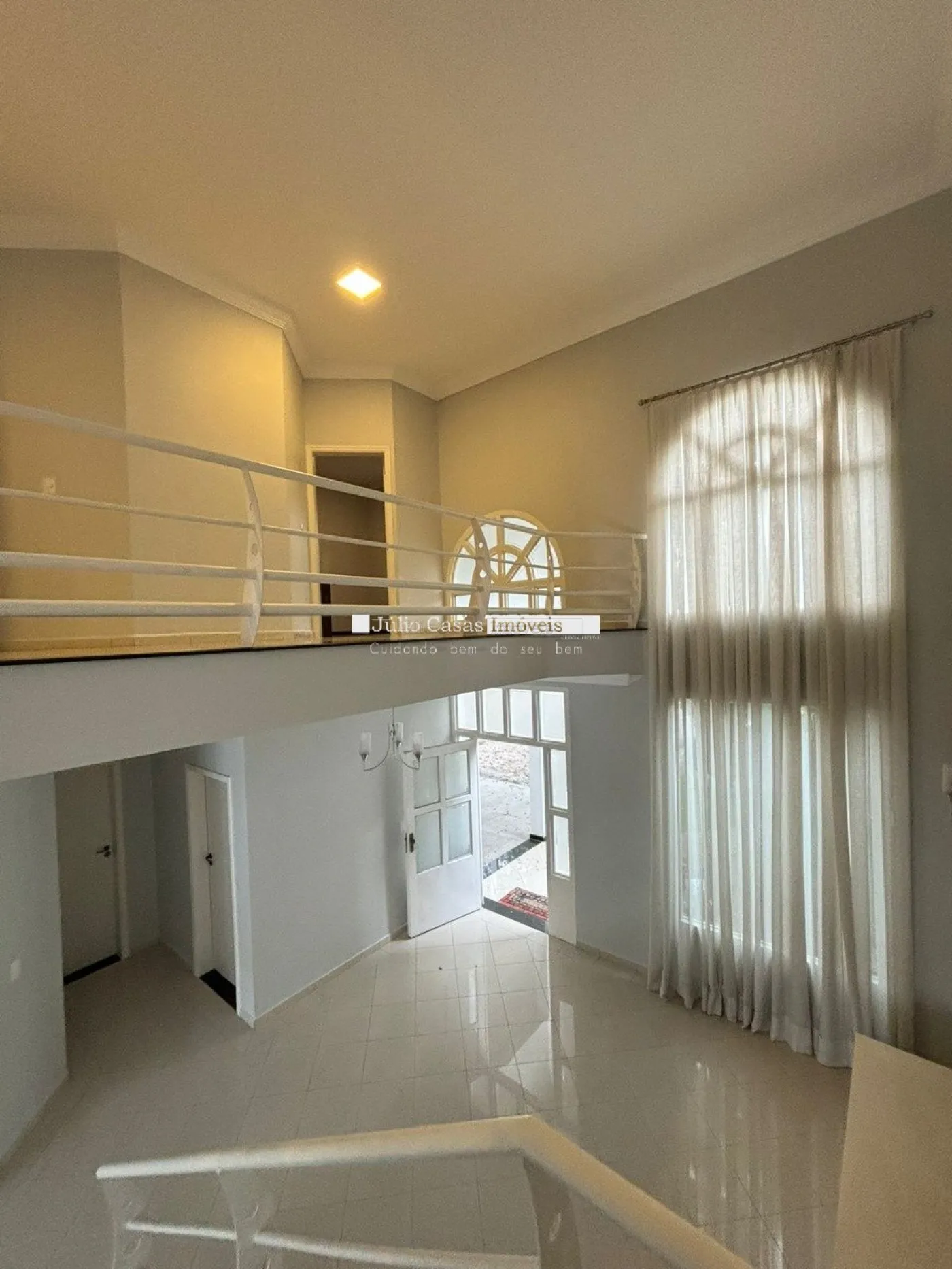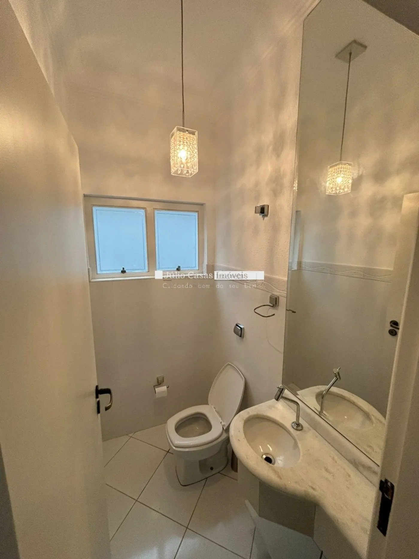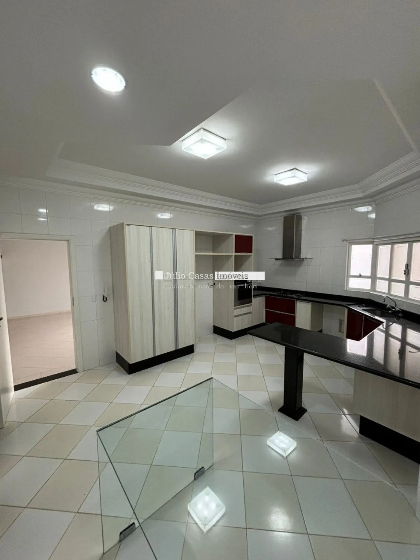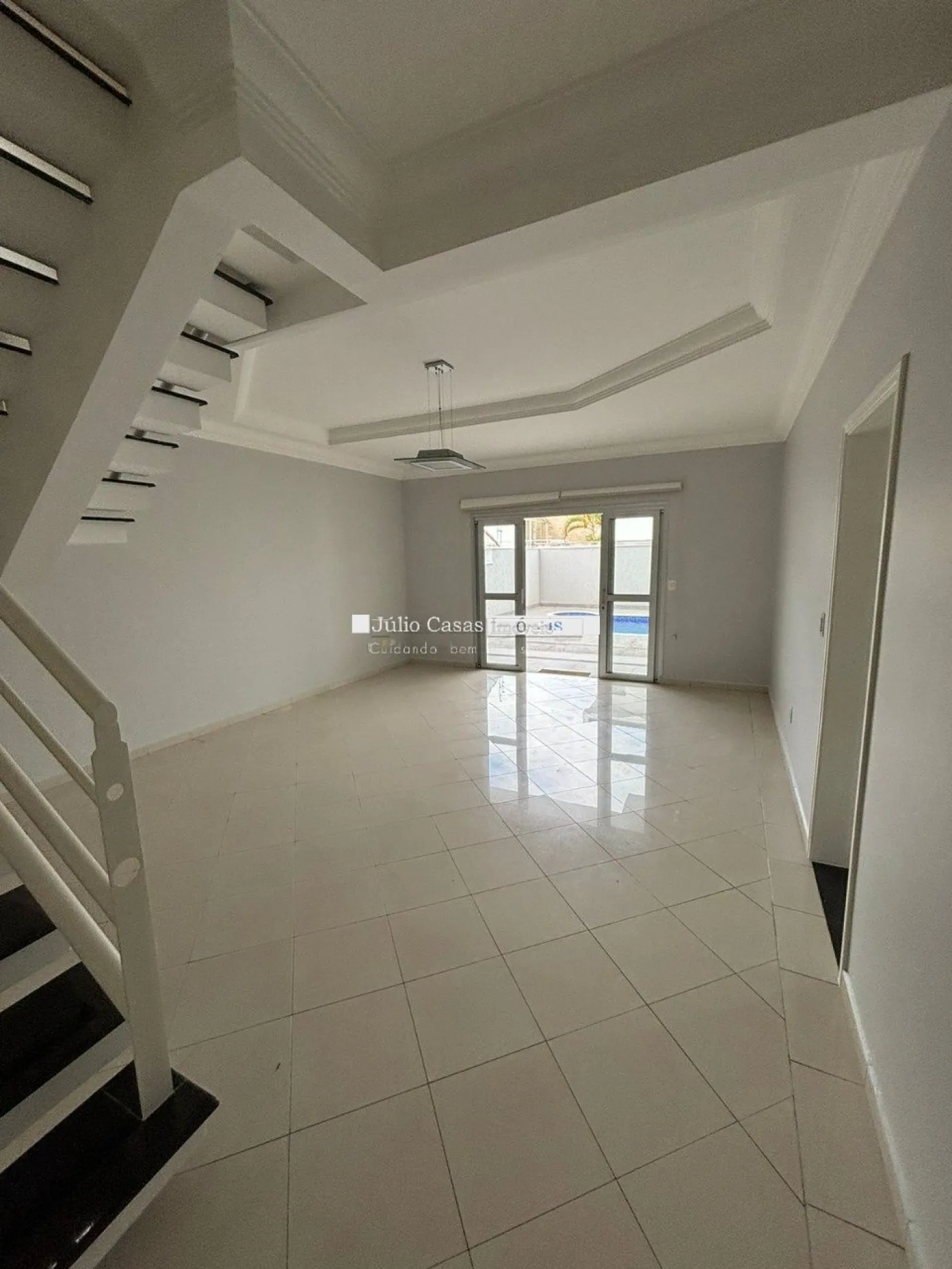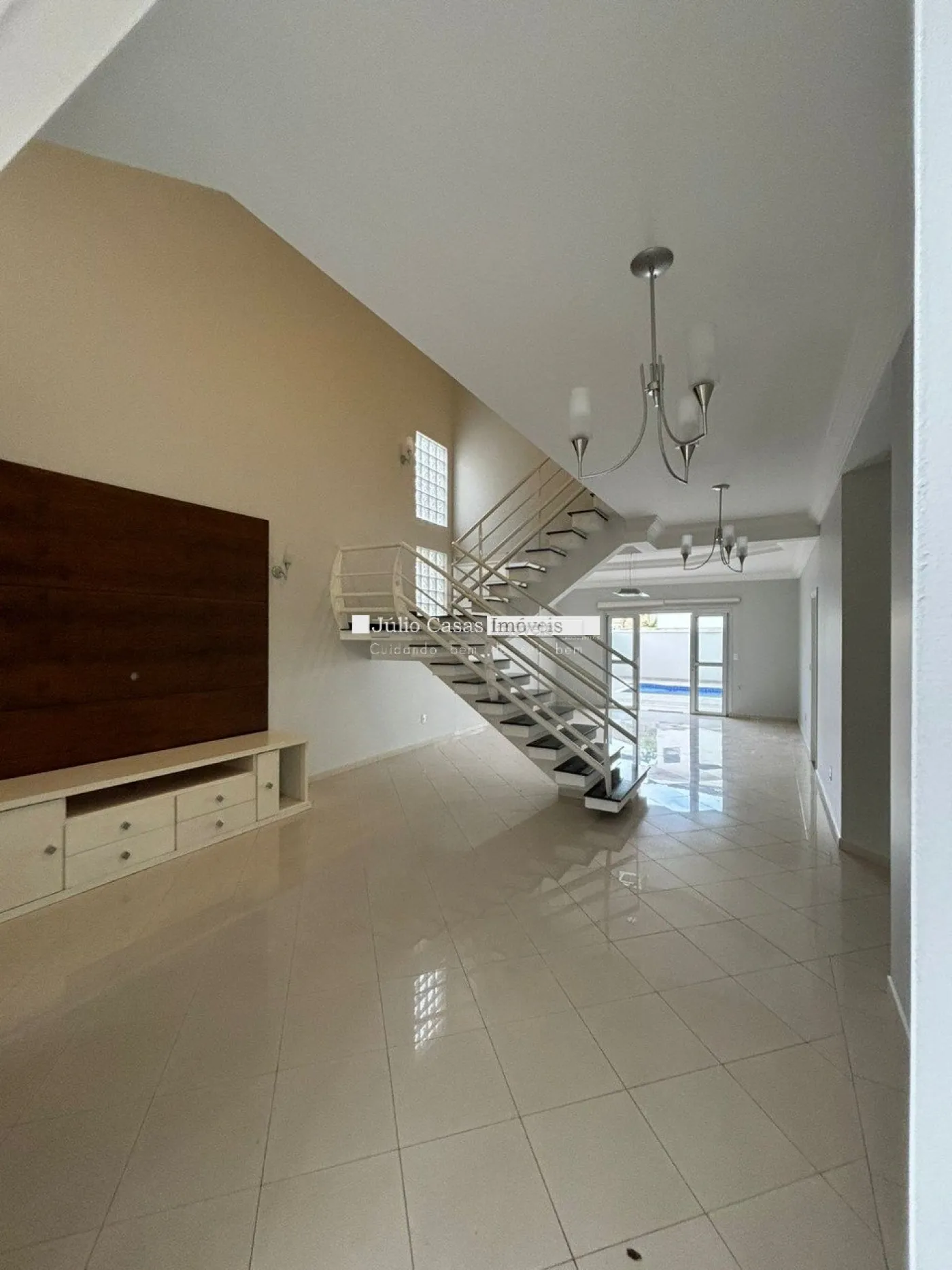A sala de estar possui dois ambientes com pé direito alto, janelas duplas e piso em porcelanato, criando um espaço amplo e elegante. A casa também conta com um lavabo e um escritório com móveis planejados. A cozinha é moderna e funcional, com armários modulados, bancadas em mármore São Gabriel, coifa, torre quente com forno elétrico e uma mesa de vidro. Há também uma despensa com prateleiras para armazenamento adicional e uma lavanderia com móveis modulados.