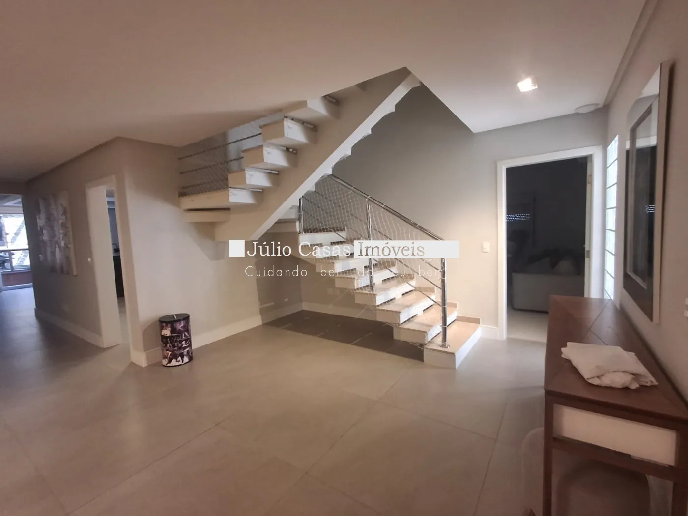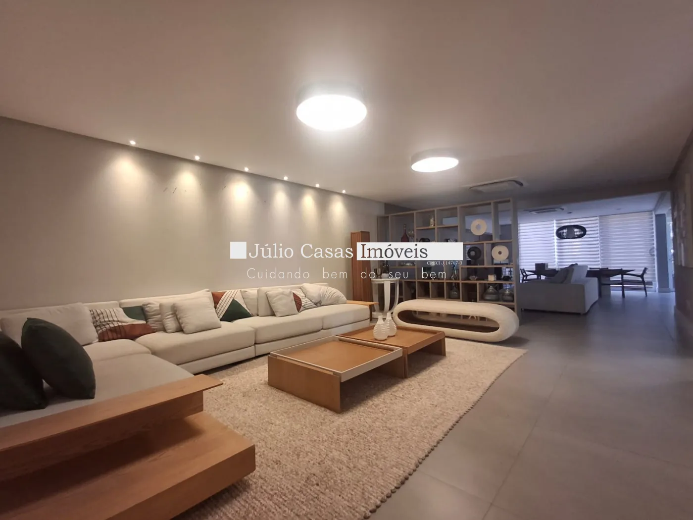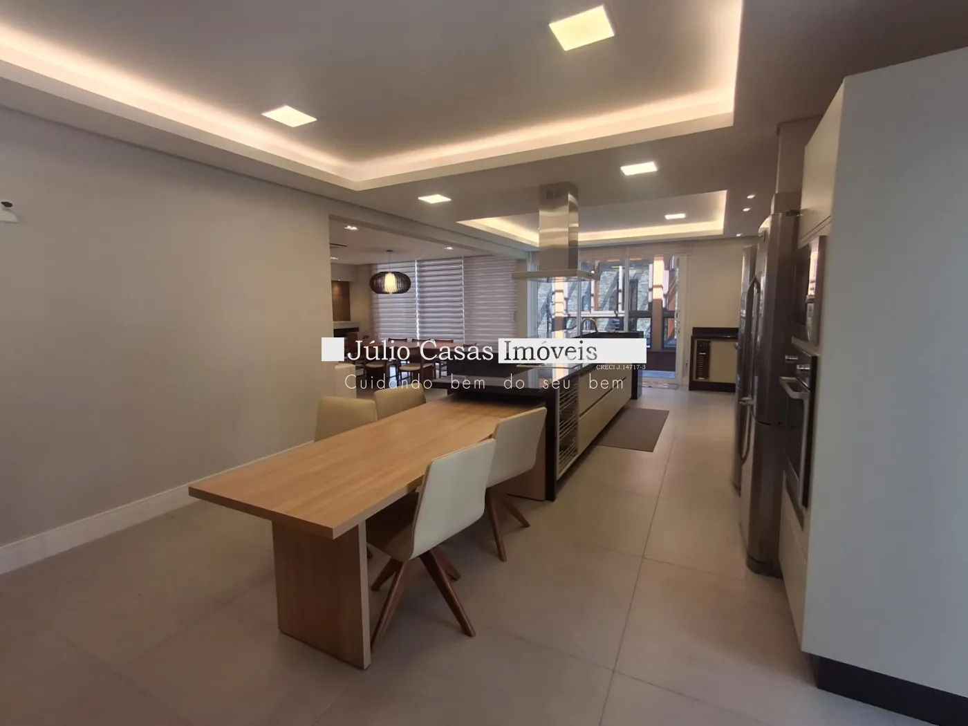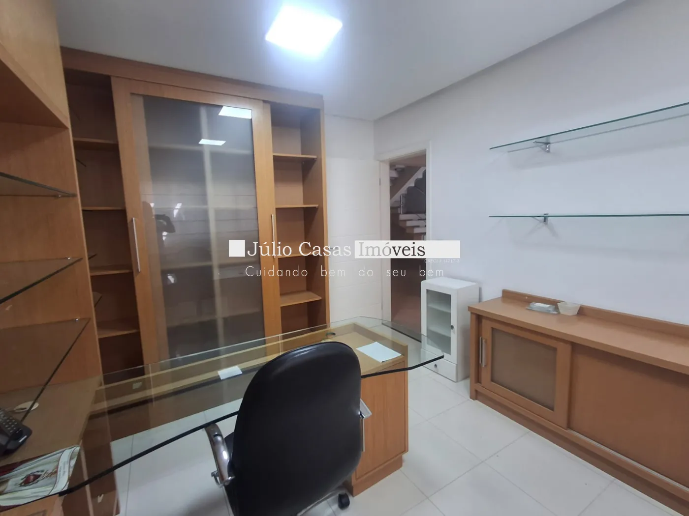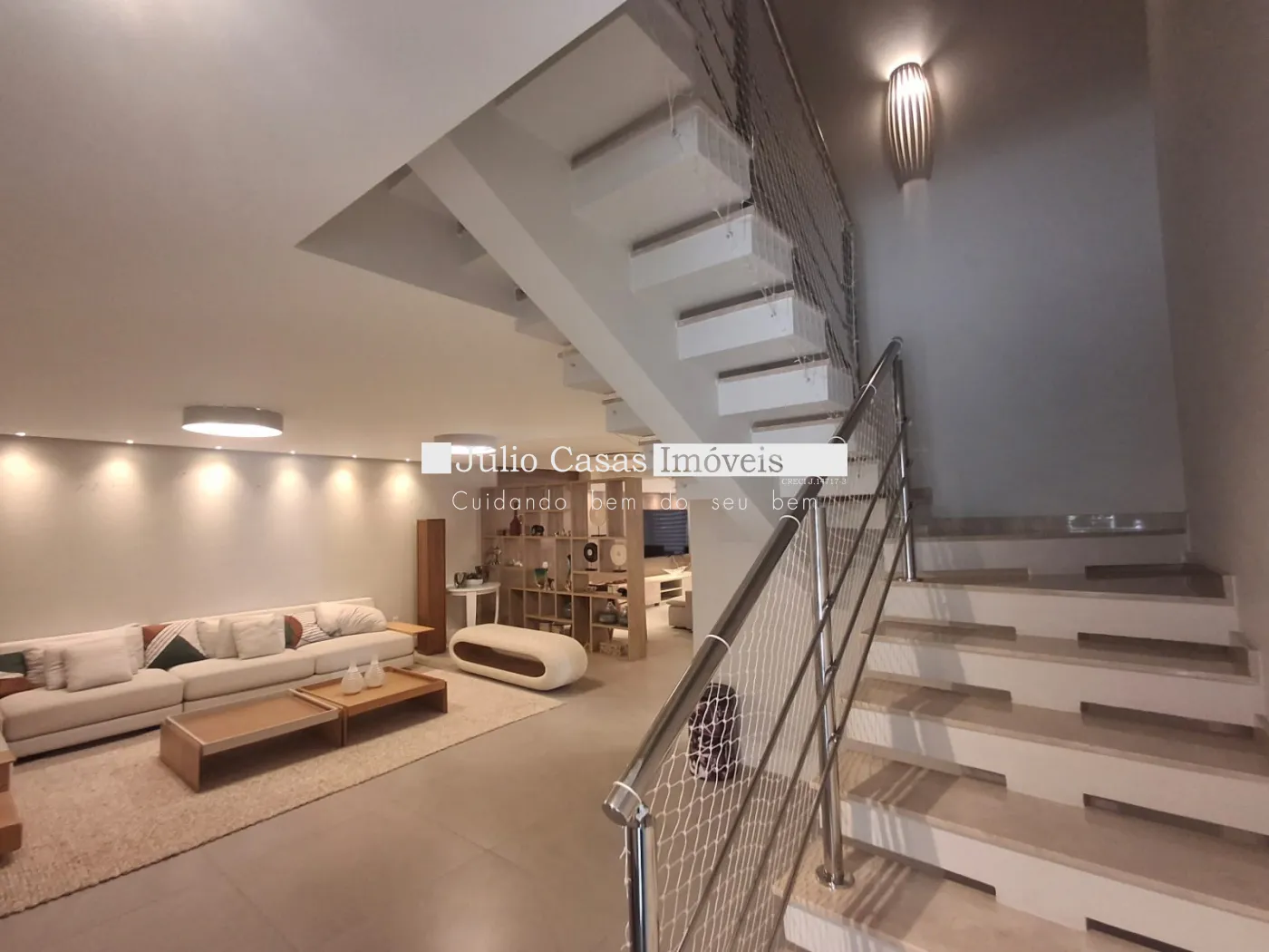 No pavimento inferior, o imóvel dispõe de amplos e integrados ambientes, com sala de estar, sala de TV, escritório, copa e uma cozinha totalmente equipada, harmoniosamente conectada às áreas sociais, proporcionando praticidade e requinte no dia a dia.