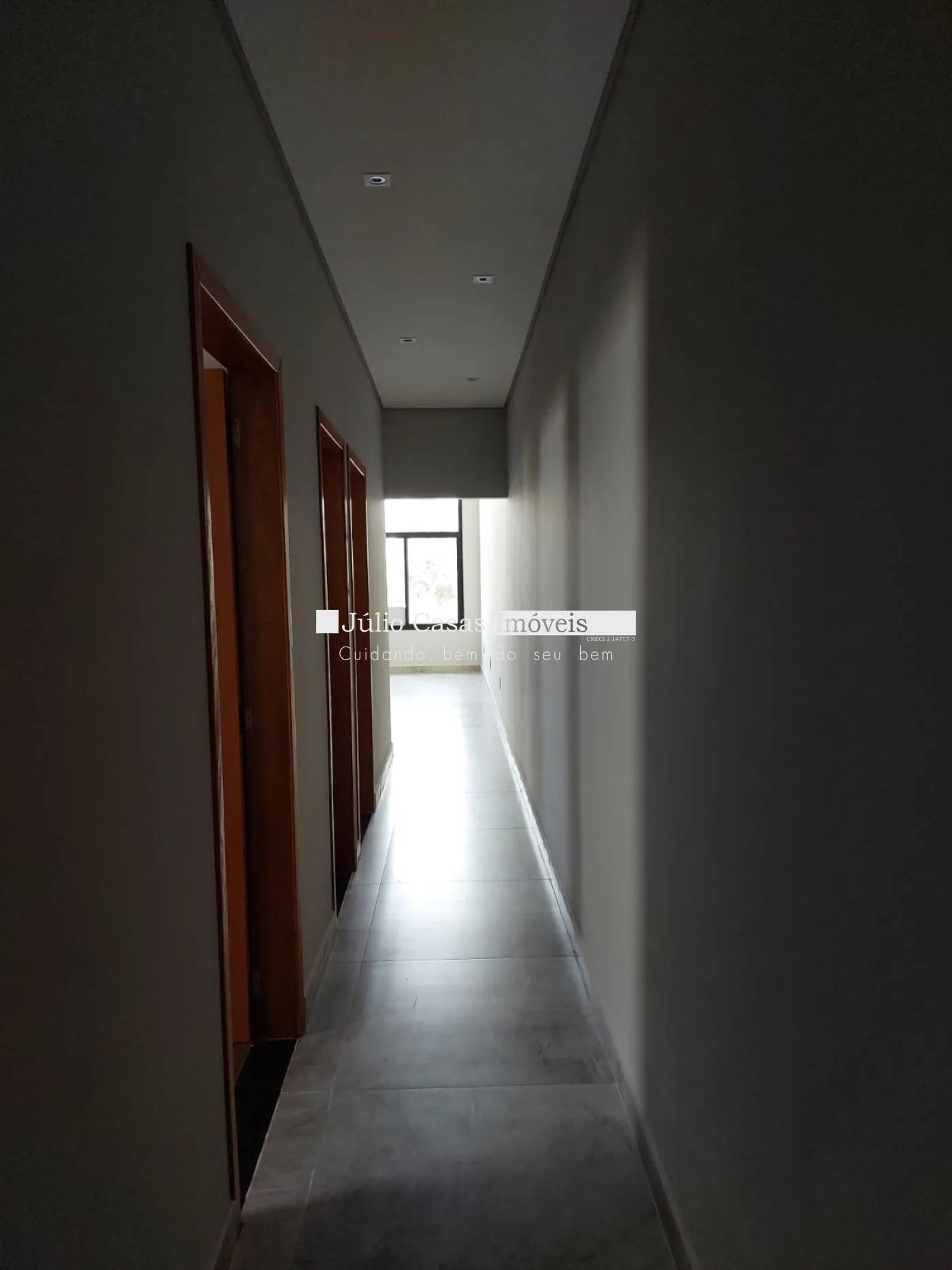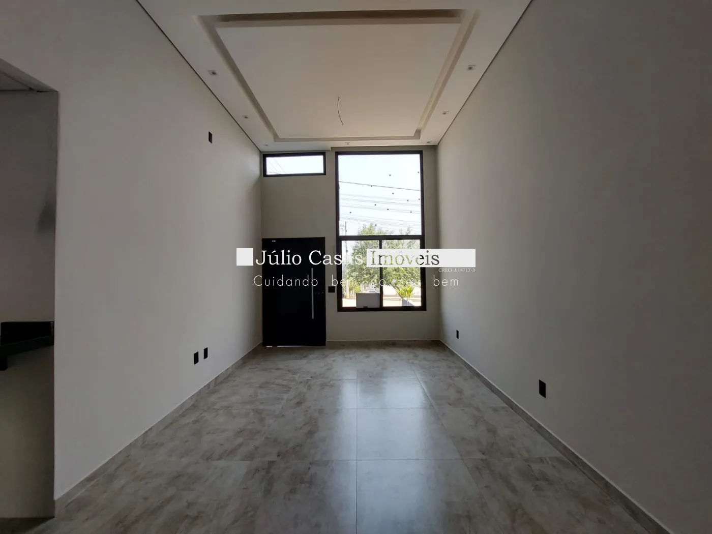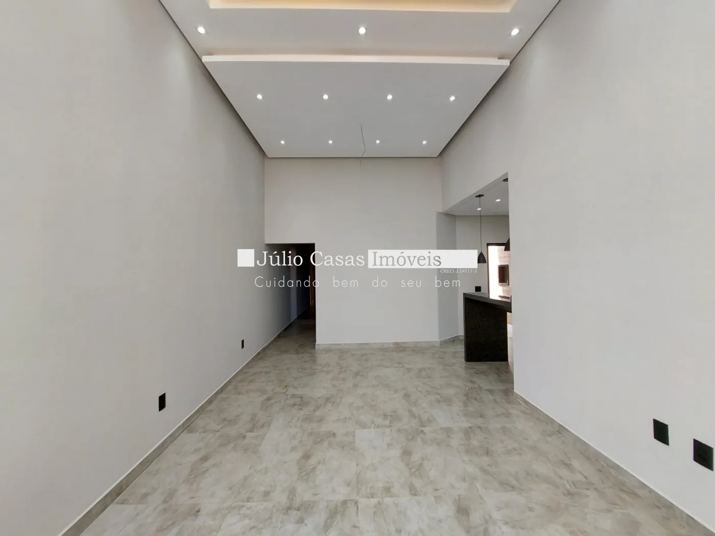 Esta casa térrea à venda no Condomínio Vilaggio Ipanema oferece um ambiente sofisticado e funcional. A sala destaca-se pelo pé direito alto, que, combinado com o teto com acabamento em gesso e luminárias embutidas, cria uma atmosfera elegante e arejada.