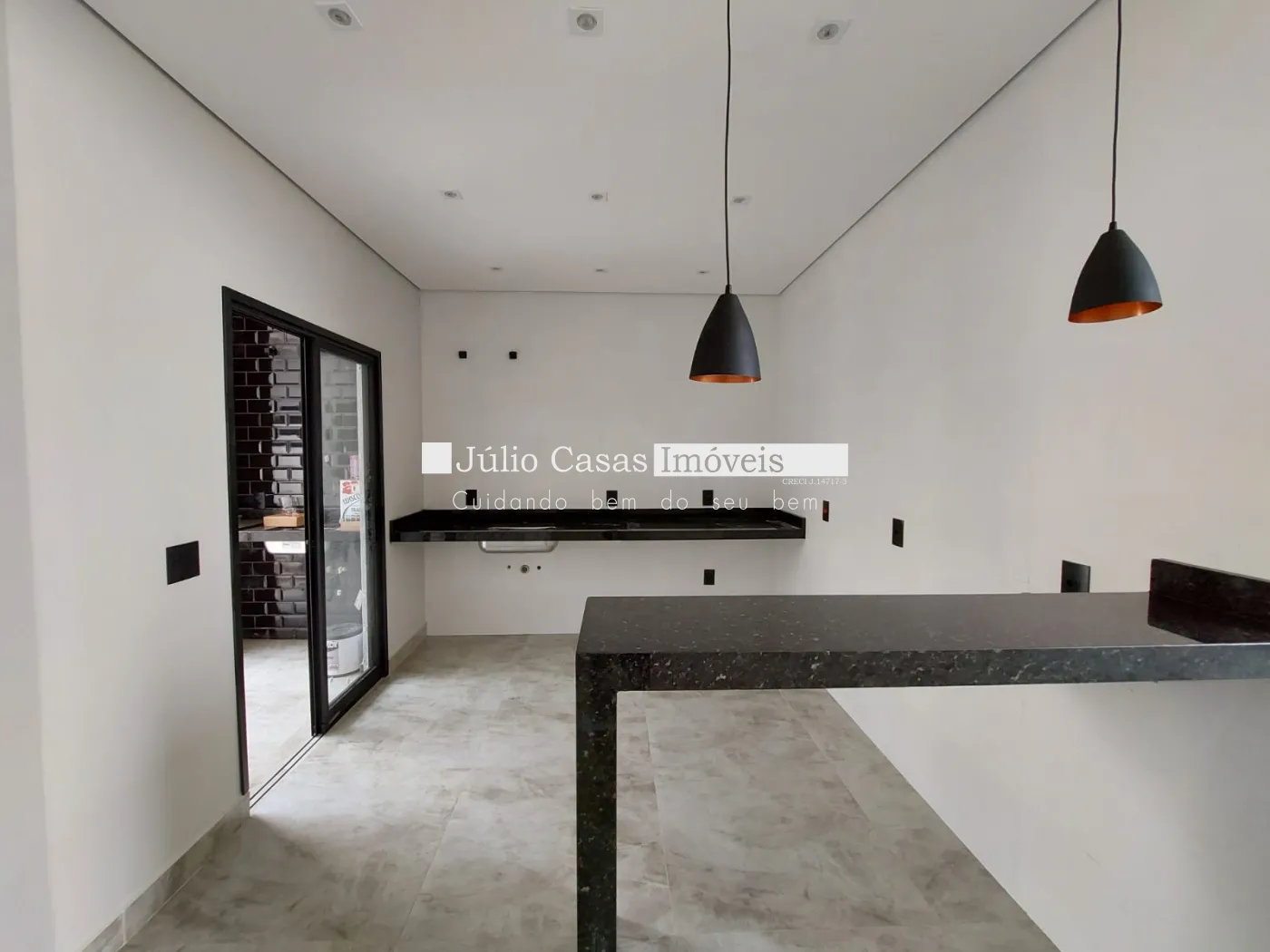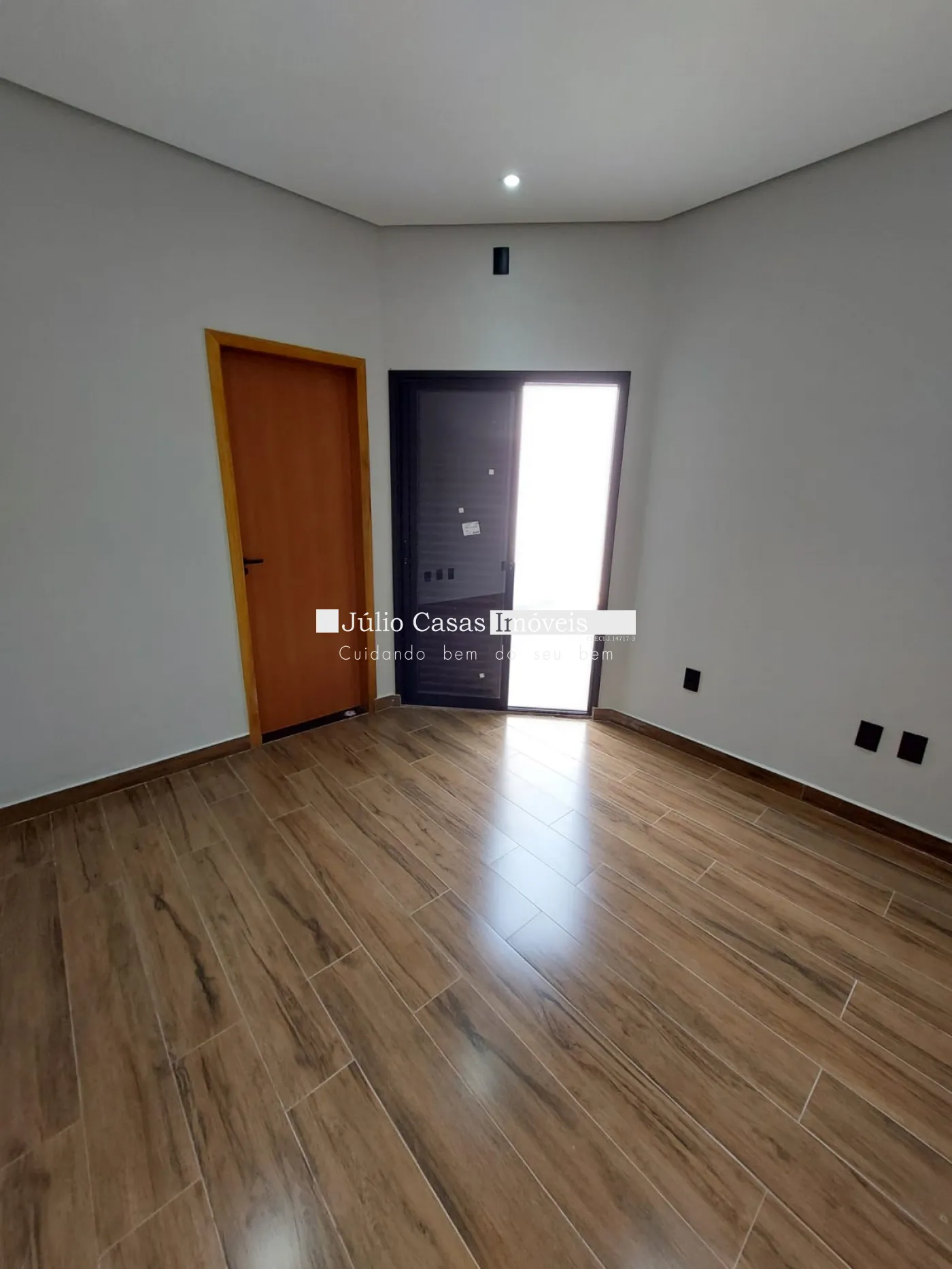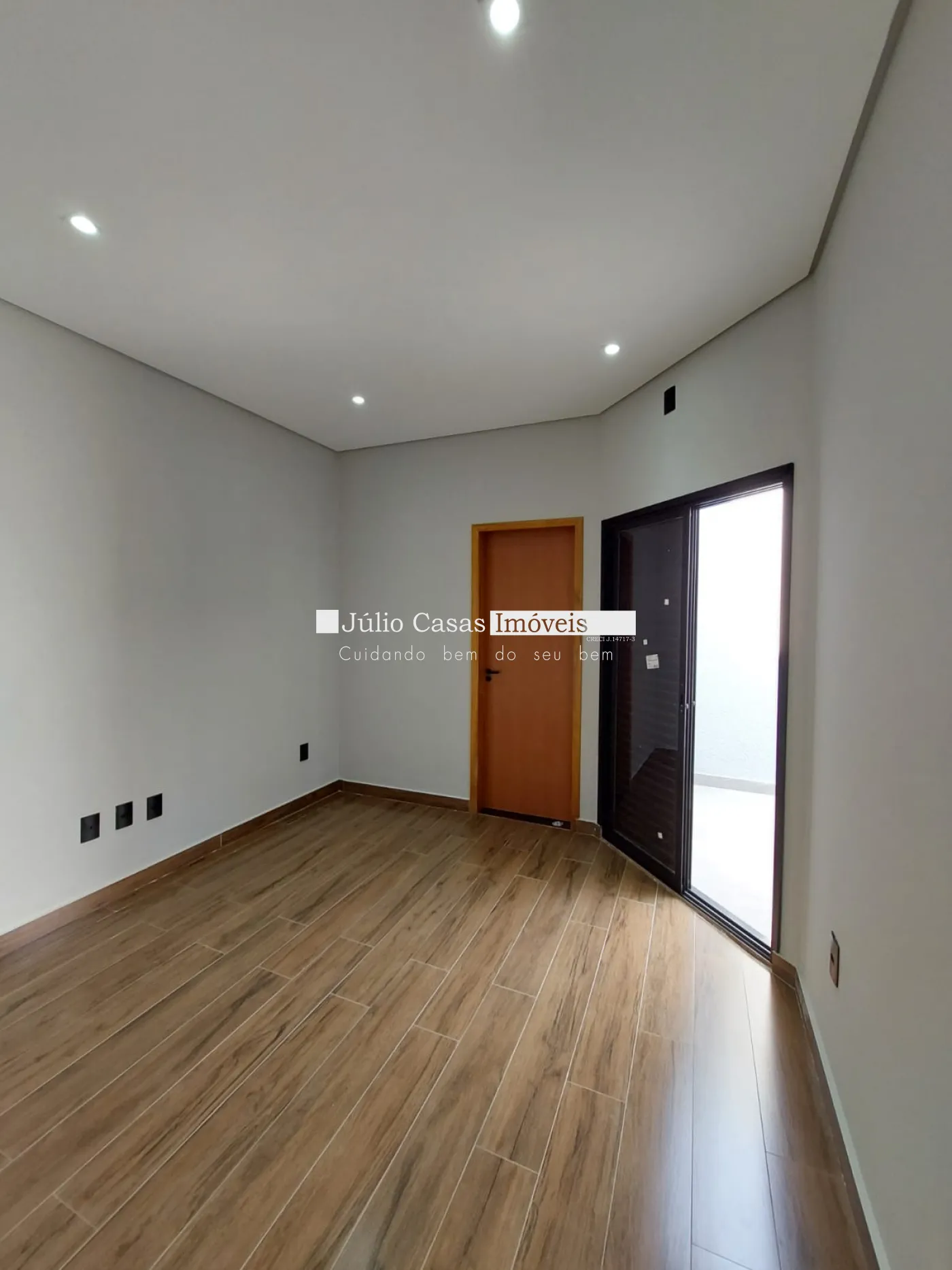 Esta casa térrea à venda no Condomínio Vilaggio Ipanema oferece um ambiente sofisticado e funcional. A sala destaca-se pelo pé direito alto, que, combinado com o teto com acabamento em gesso e luminárias embutidas, cria uma atmosfera elegante e arejada.