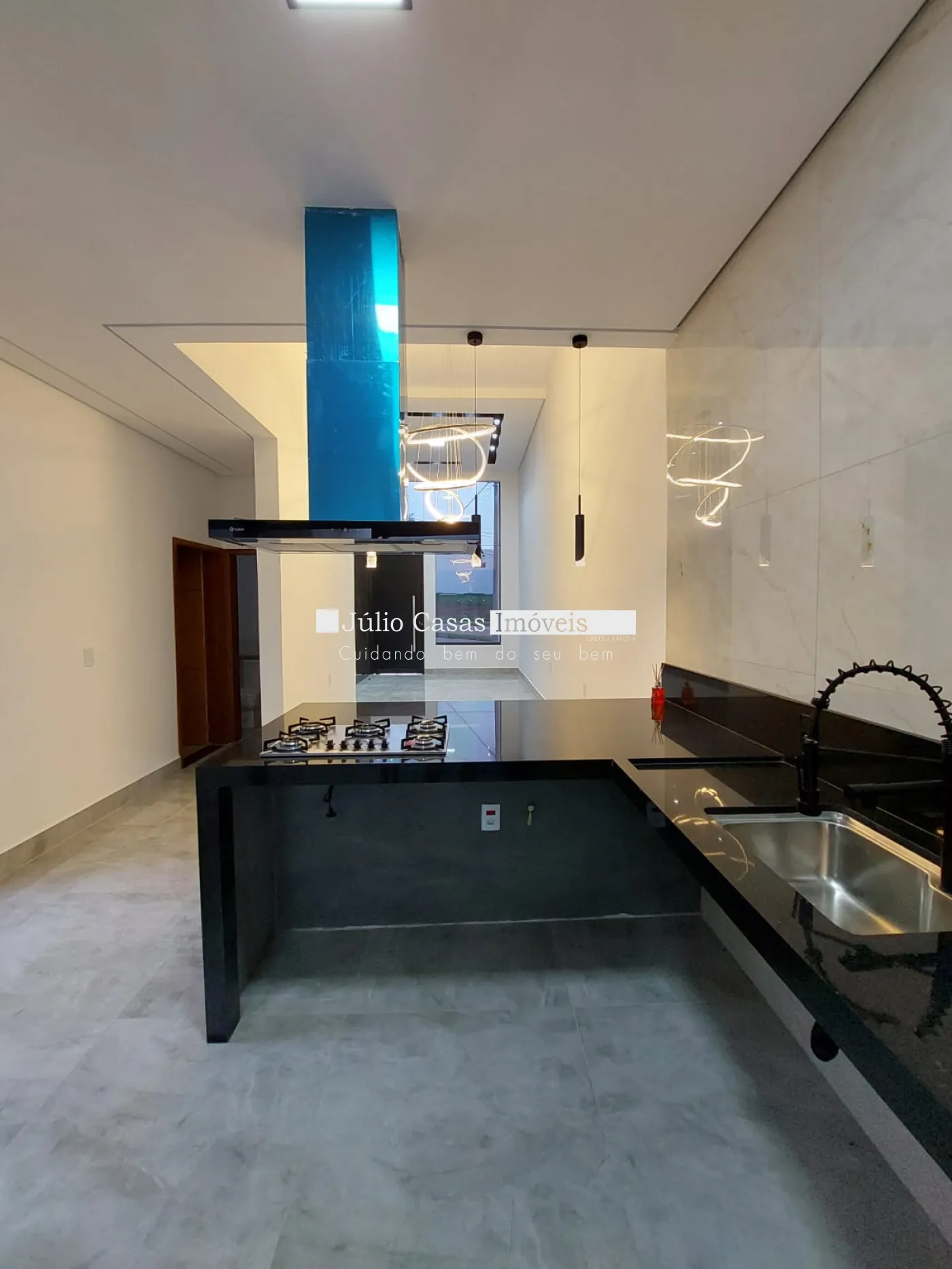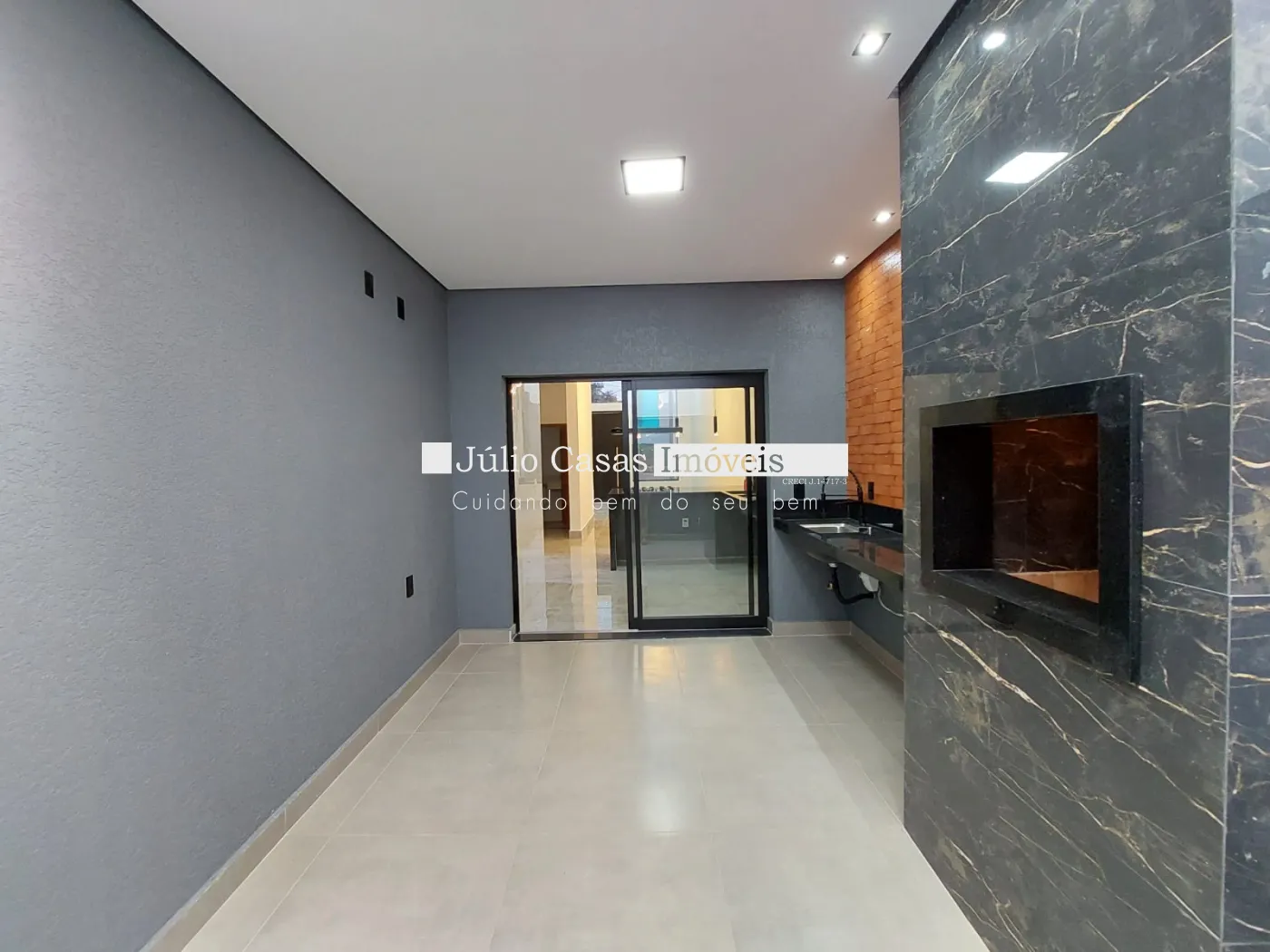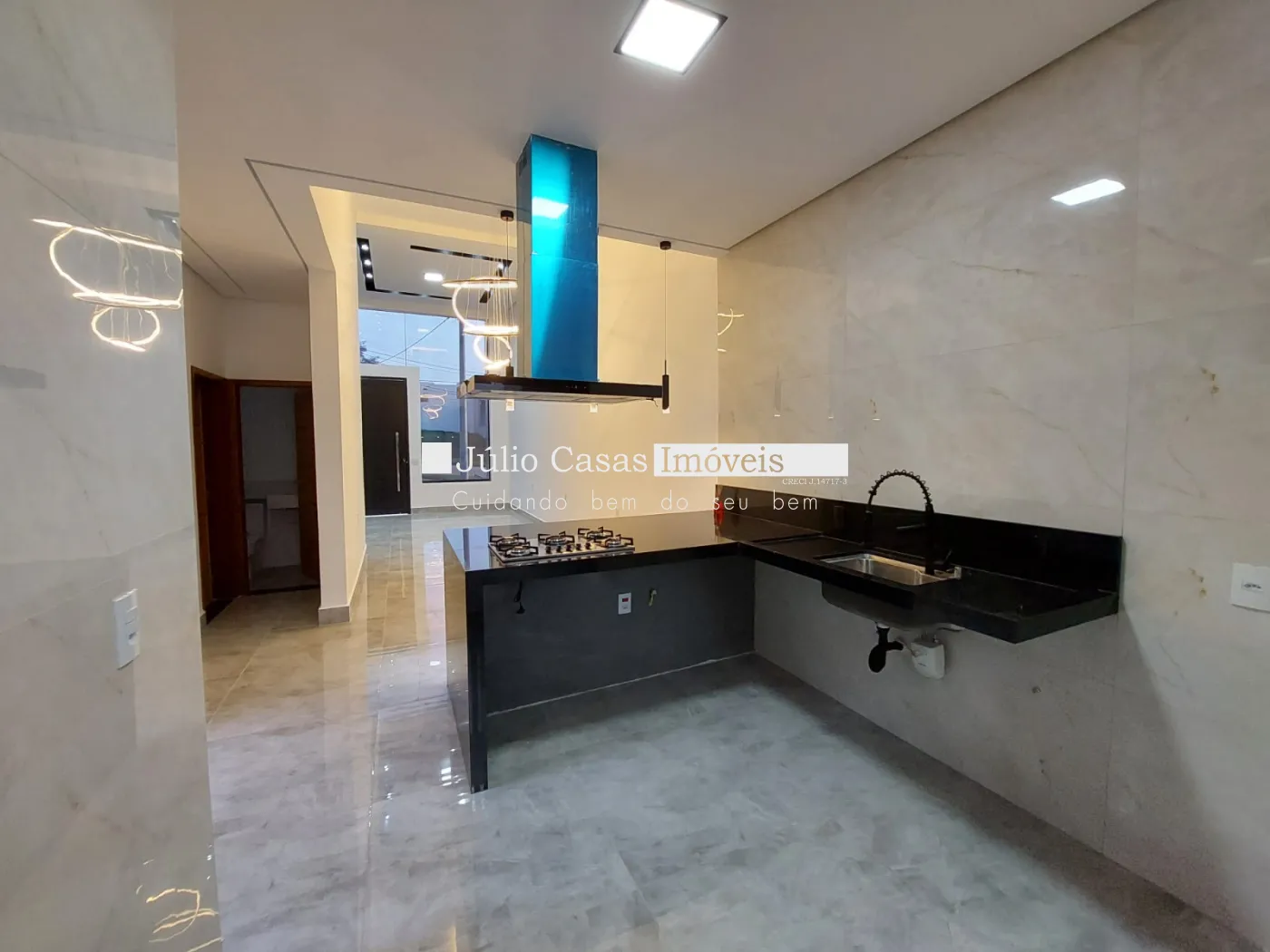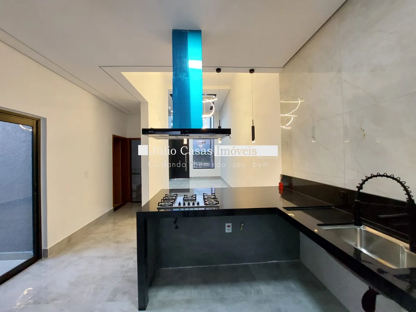 Casa térrea à venda com sala de pé direito alto, revestida em porcelanato e iluminada com LED. O ambiente integrado à cozinha conta com bancada em mármore preto e uma área gourmet completa, equipada com churrasqueira e pia em mármore preto. A lavanderia e o quintal oferecem praticidade e conforto.
