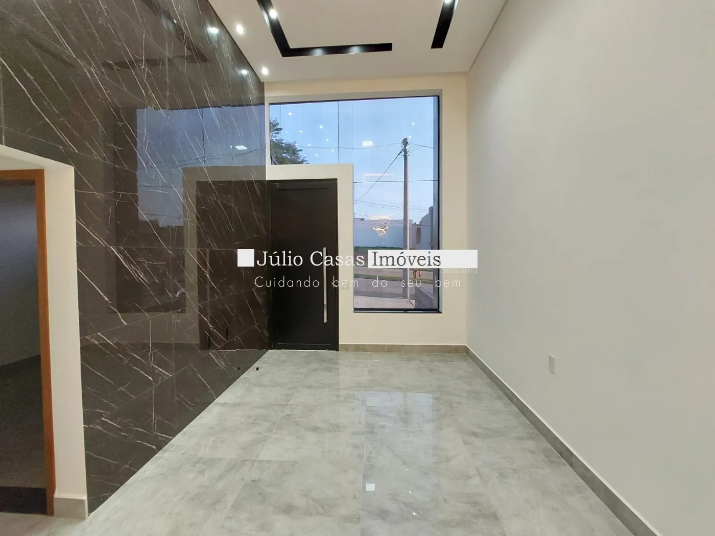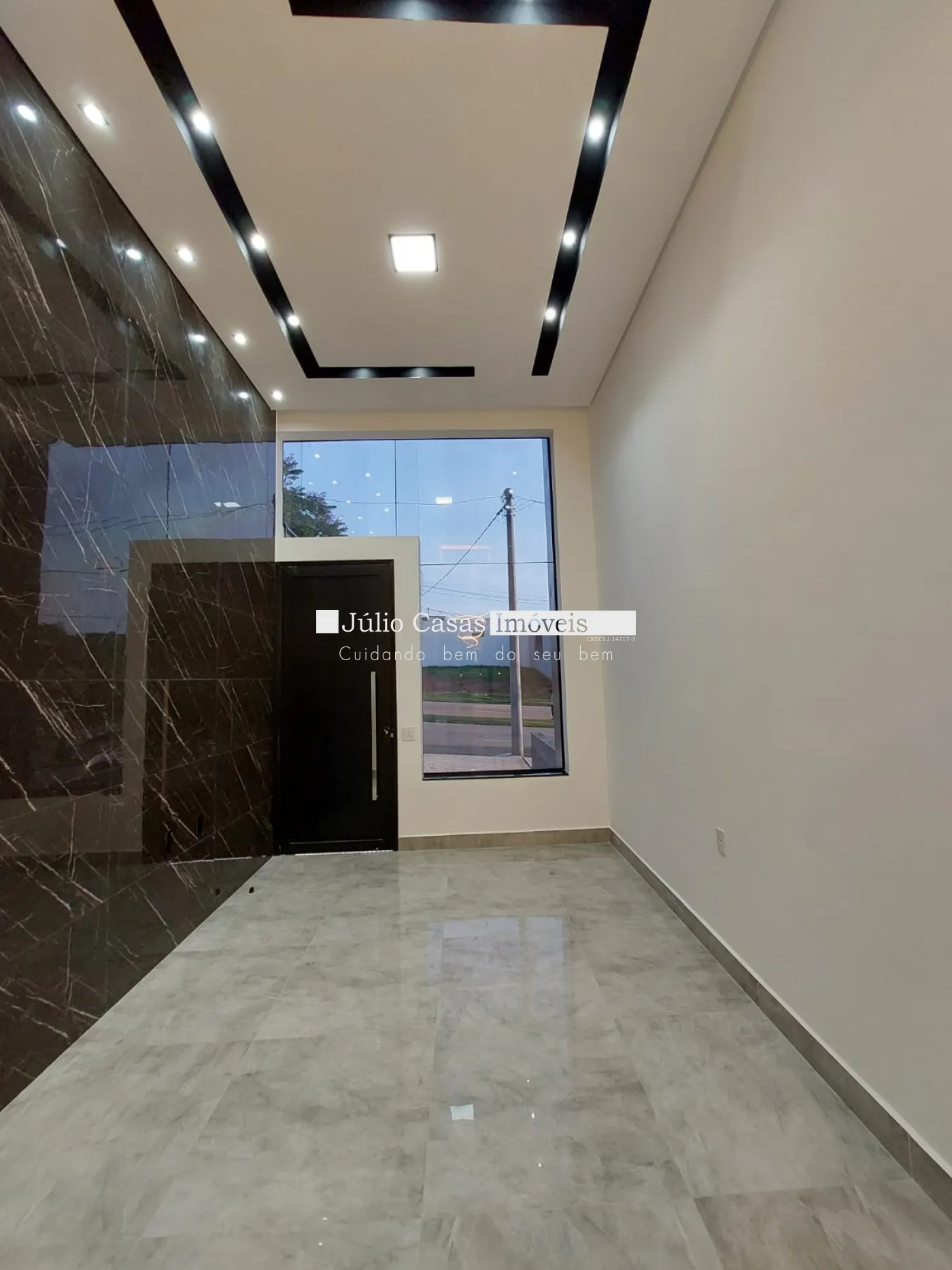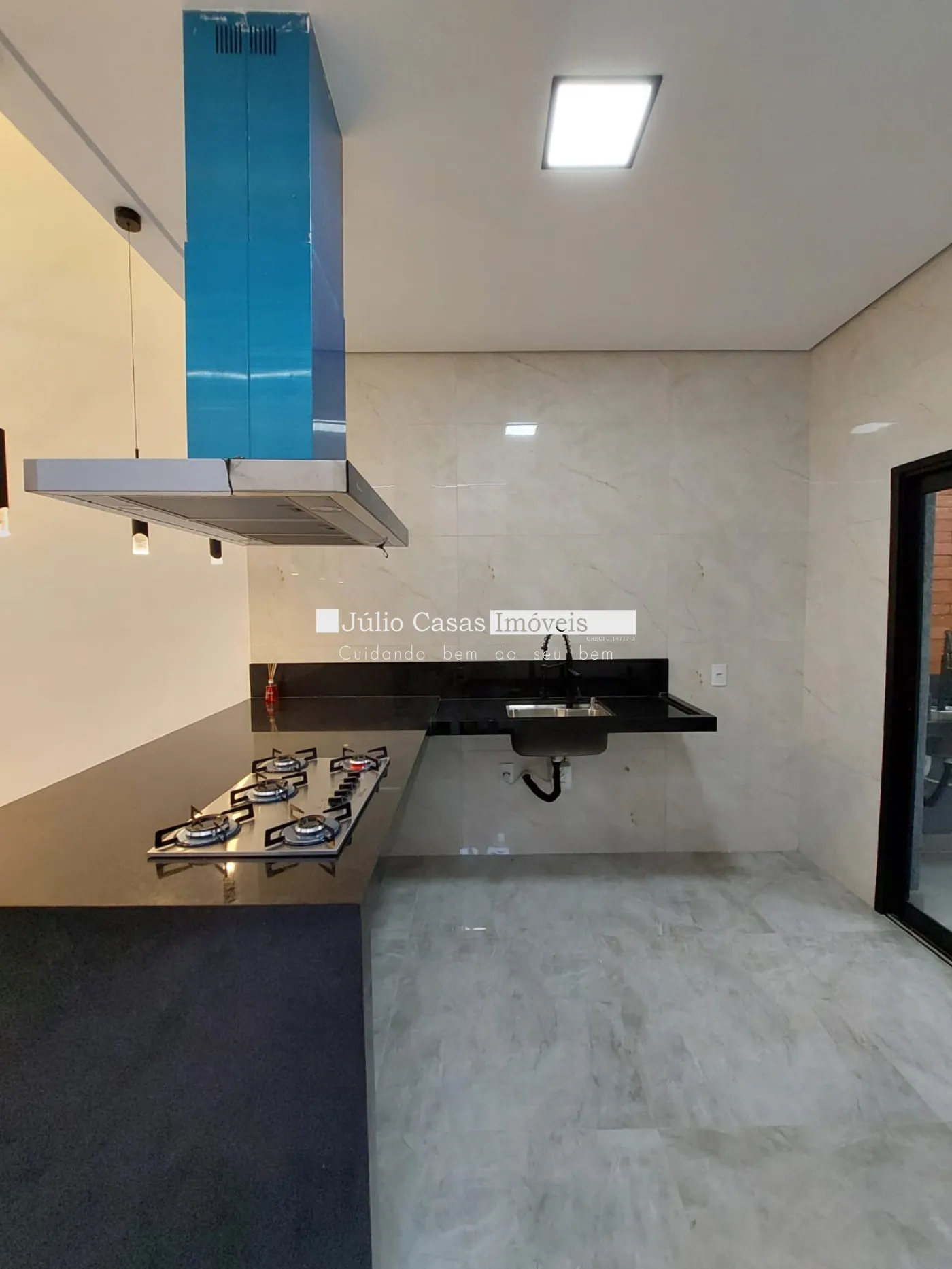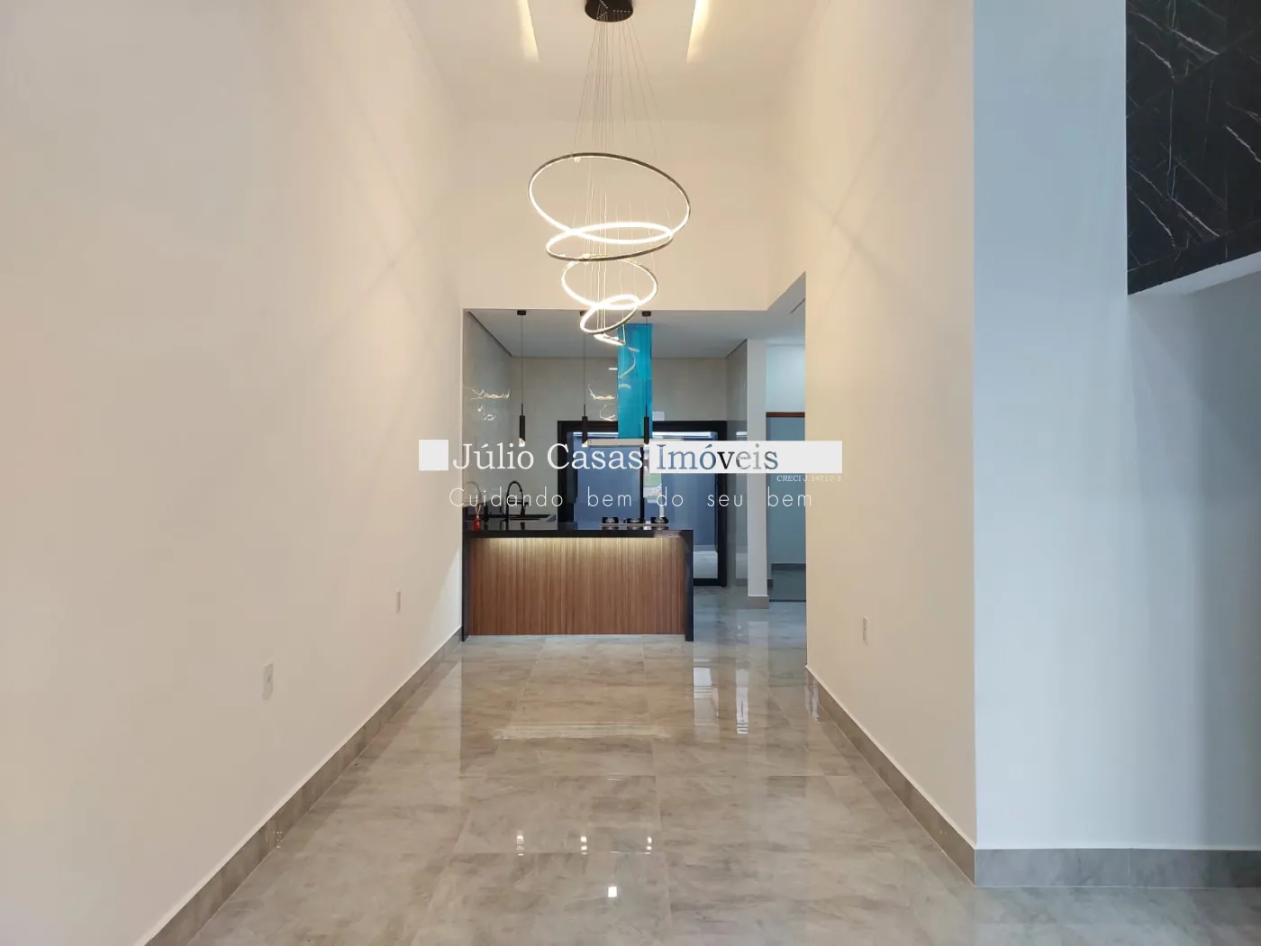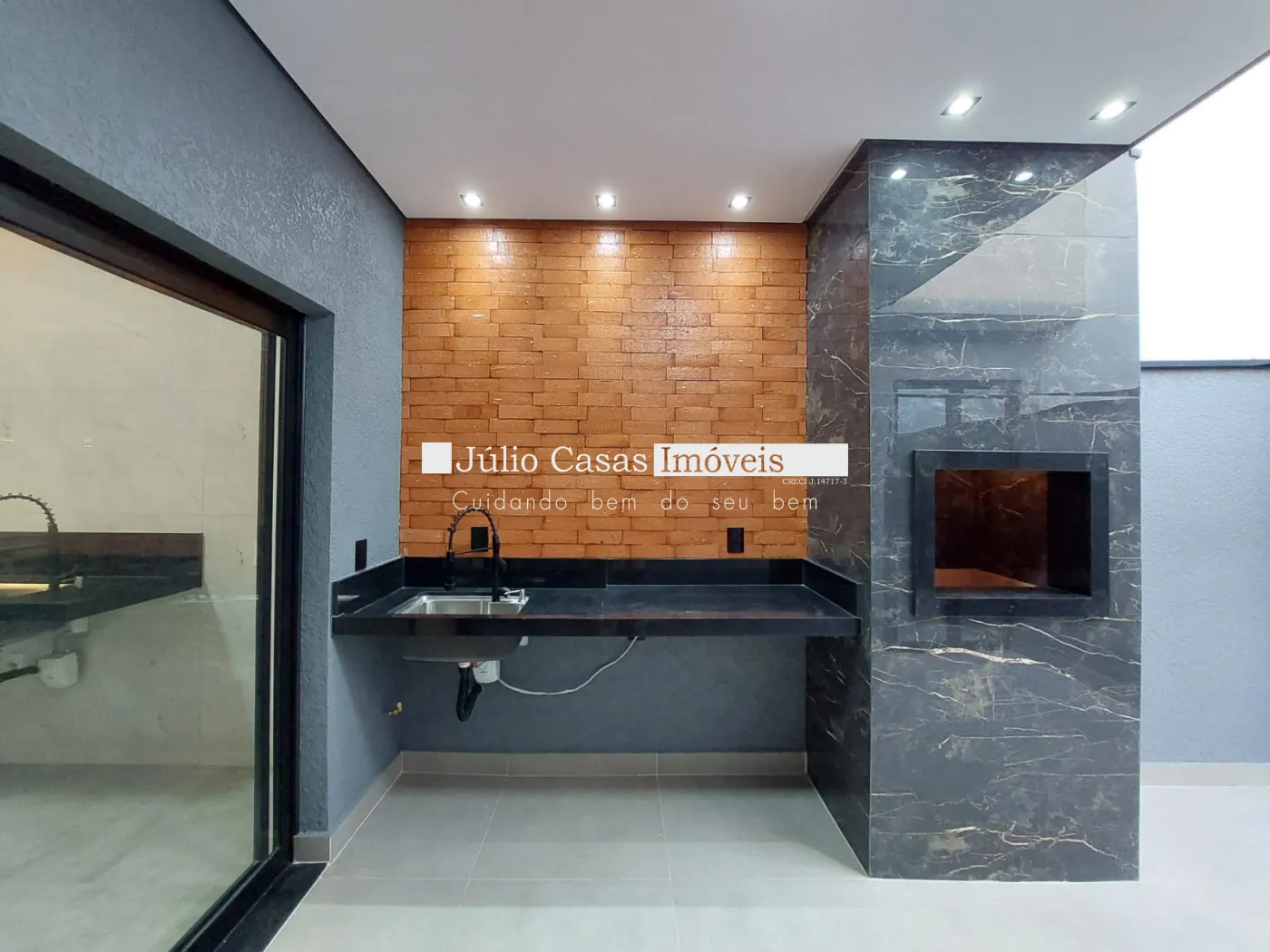 Casa térrea à venda com sala de pé direito alto, revestida em porcelanato e iluminada com LED. O ambiente integrado à cozinha conta com bancada em mármore preto e uma área gourmet completa, equipada com churrasqueira e pia em mármore preto. A lavanderia e o quintal oferecem praticidade e conforto.
