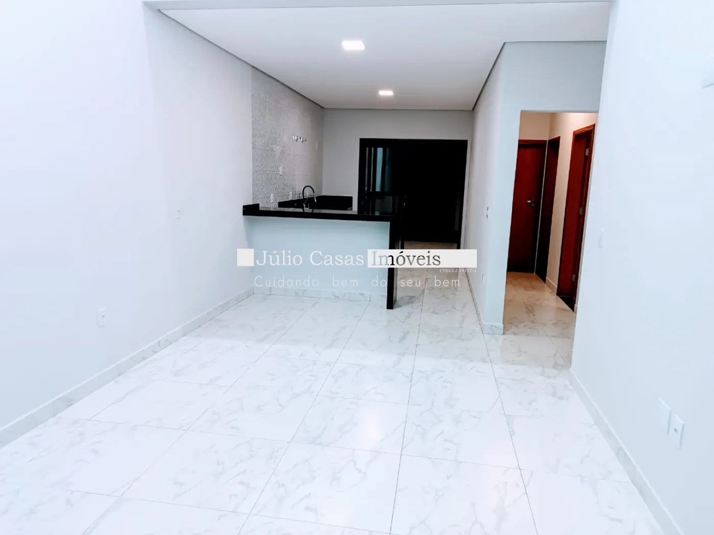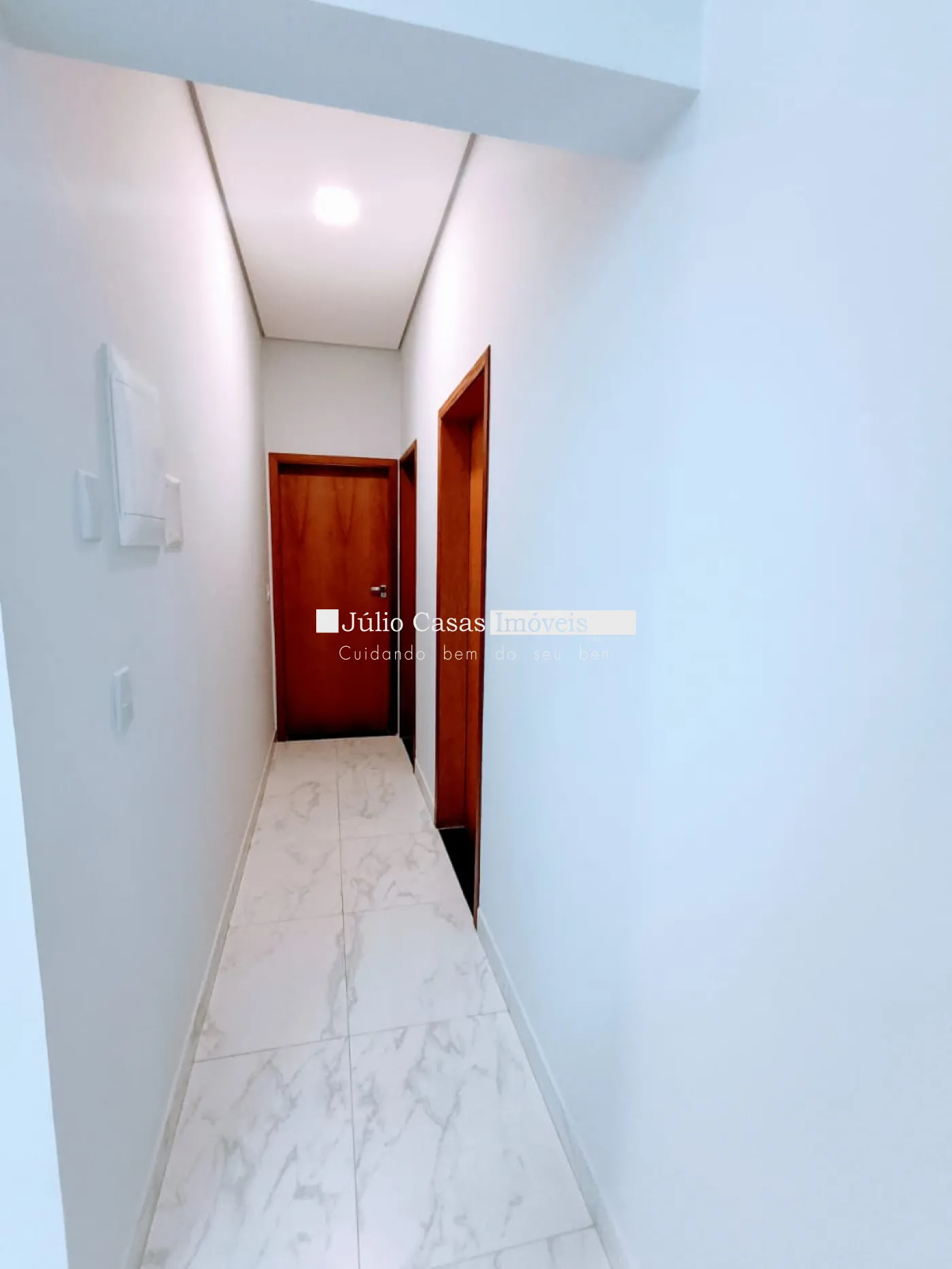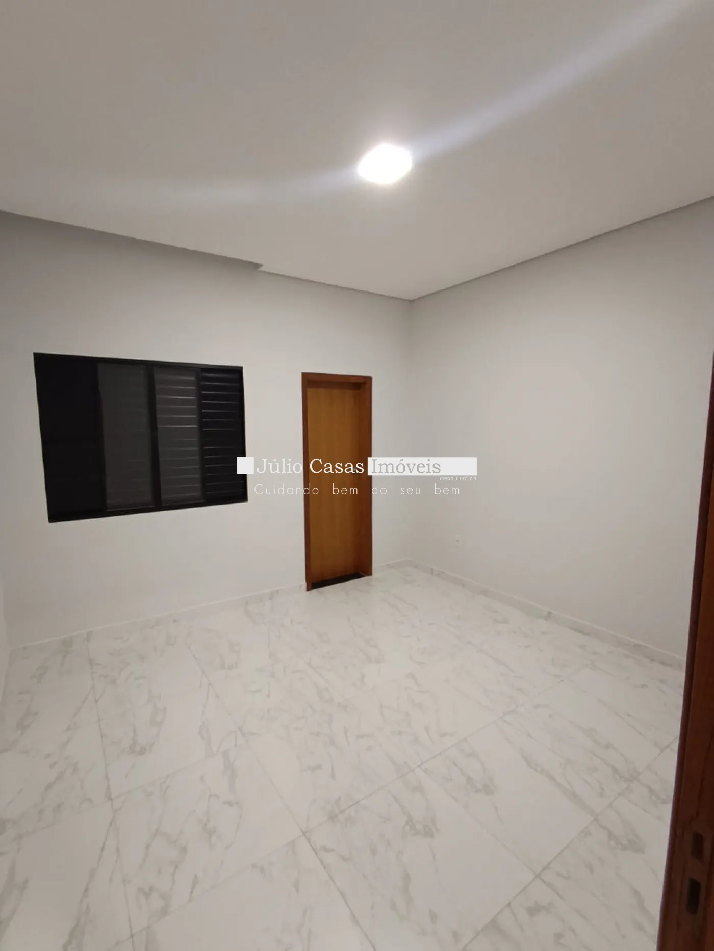 A residência dispõe de dois dormitórios, sendo uma suíte, além de um banheiro social. Todos os ambientes possuem revestimentos em porcelanato de alta qualidade, garantindo durabilidade, elegância e facilidade de manutenção. O acabamento em gesso, com sancas e luminárias embutidas, confere um toque de requinte, enquanto as esquadrias de alumínio asseguram resistência e segurança. A garagem comporta até duas vagas, oferecendo comodidade para você e sua família.