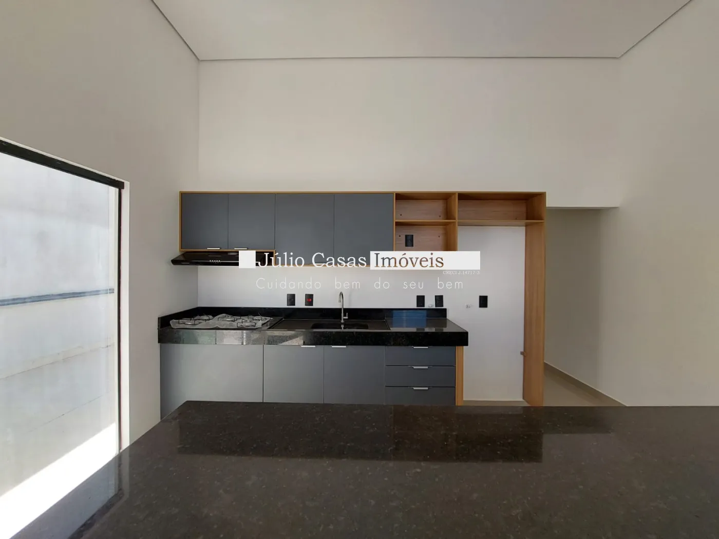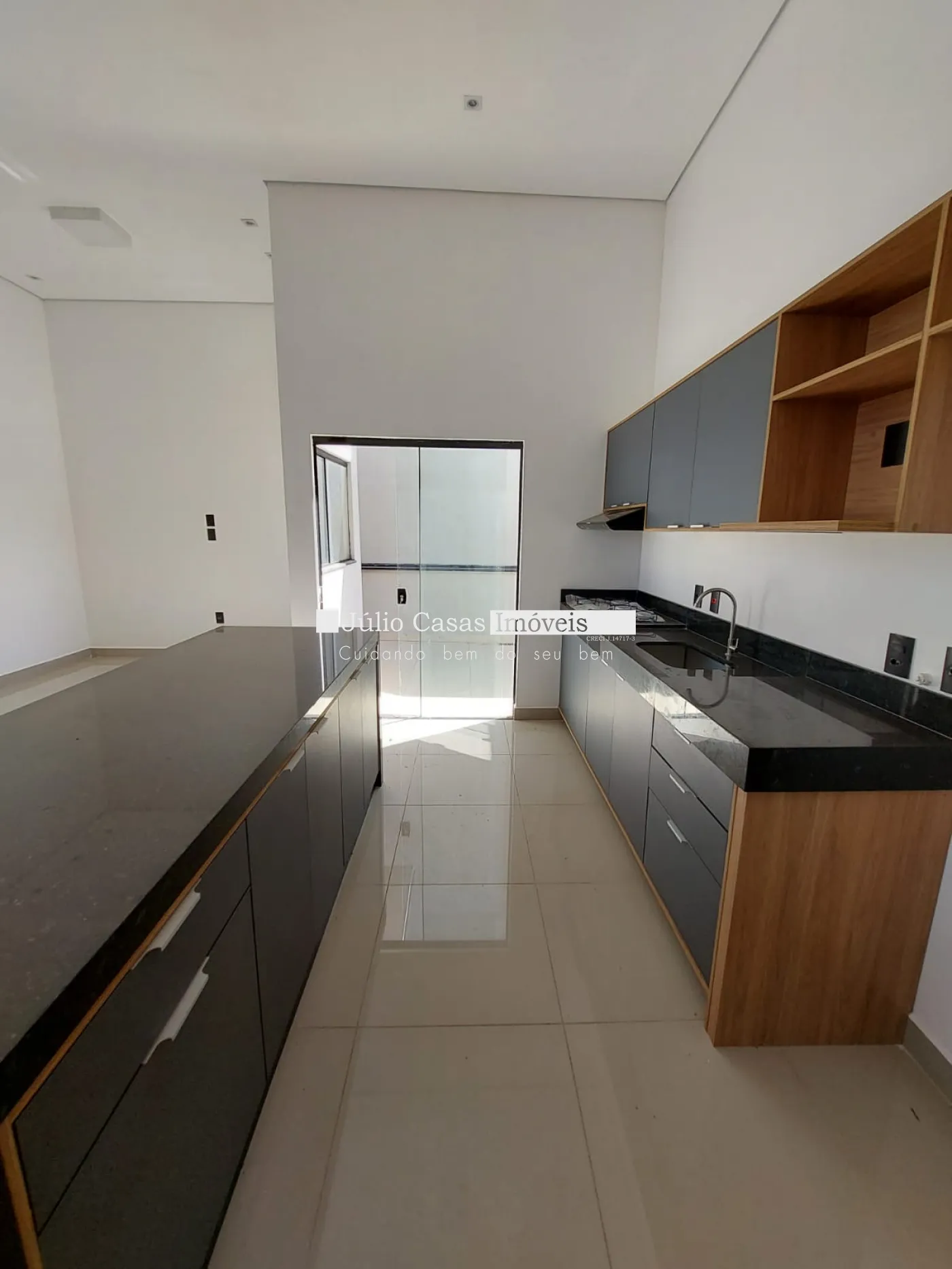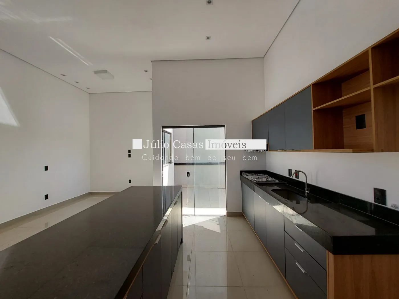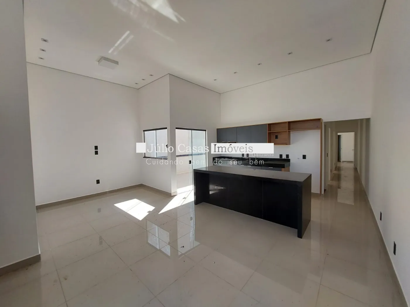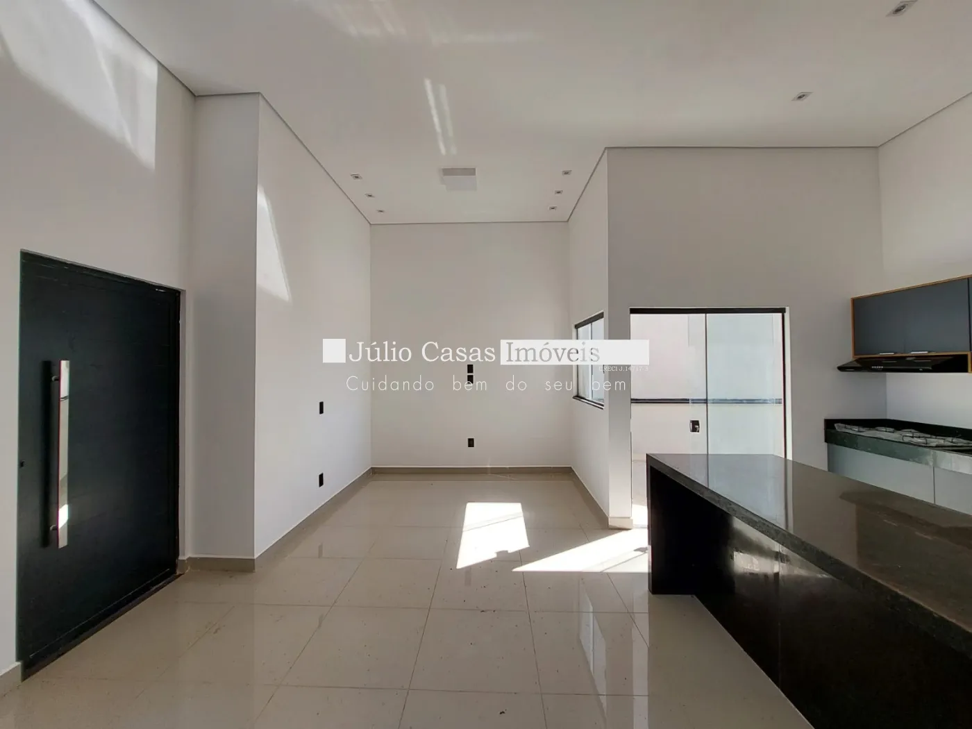 Imóvel com 3 quartos, sendo 1 suíte, e 1 banheiro social. A casa possui uma sala ampla com dois ambientes integrados à cozinha em estilo aberto, que conta com bancada em granito e armários planejados. Todos os ambientes são revestidos com porcelanato de alta qualidade.