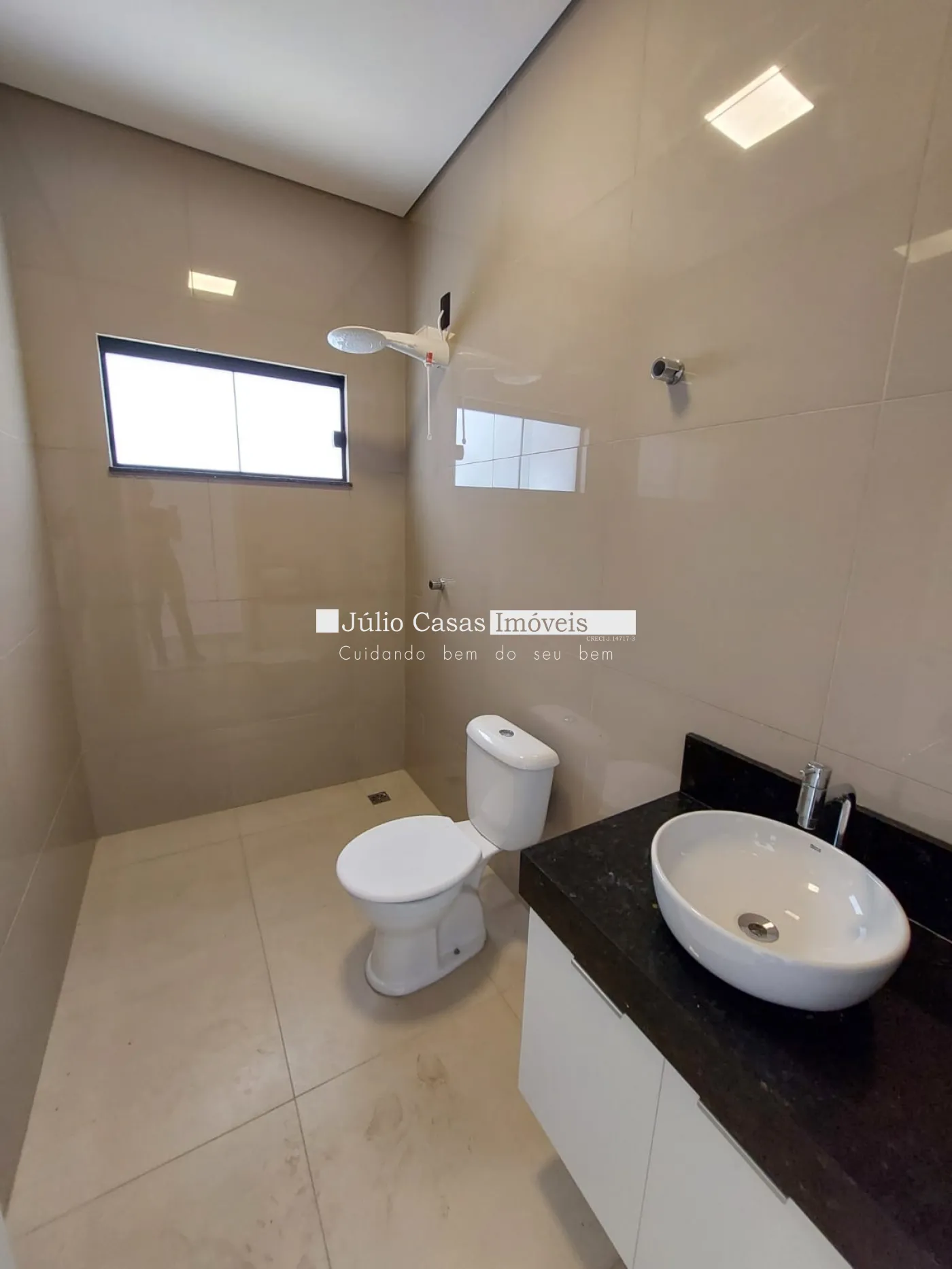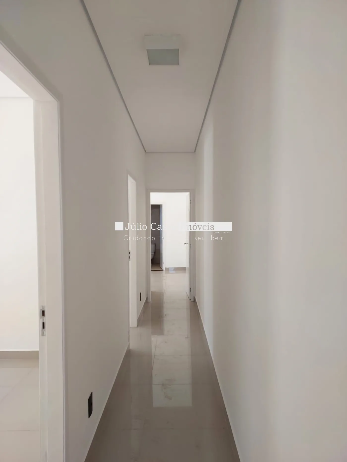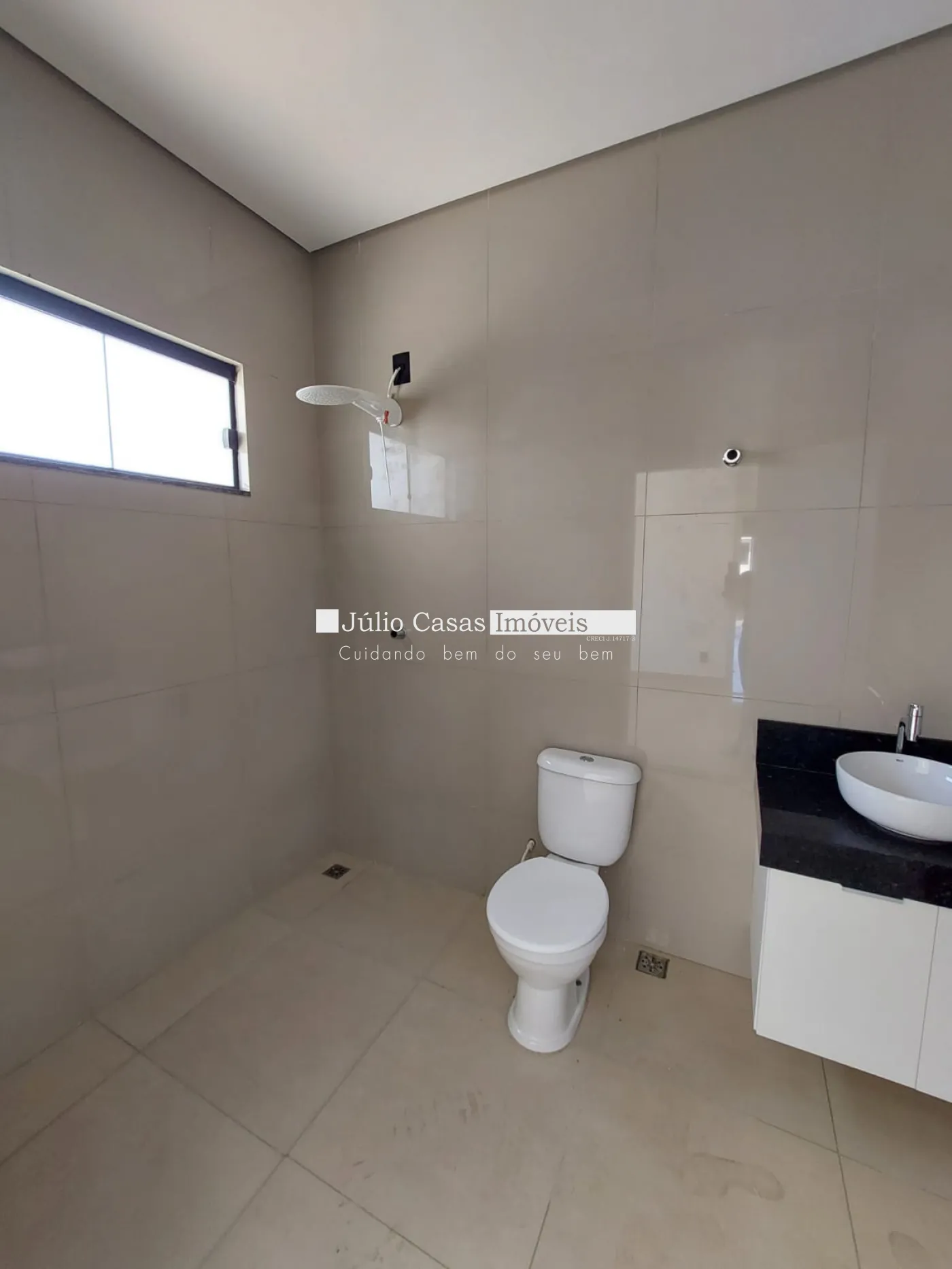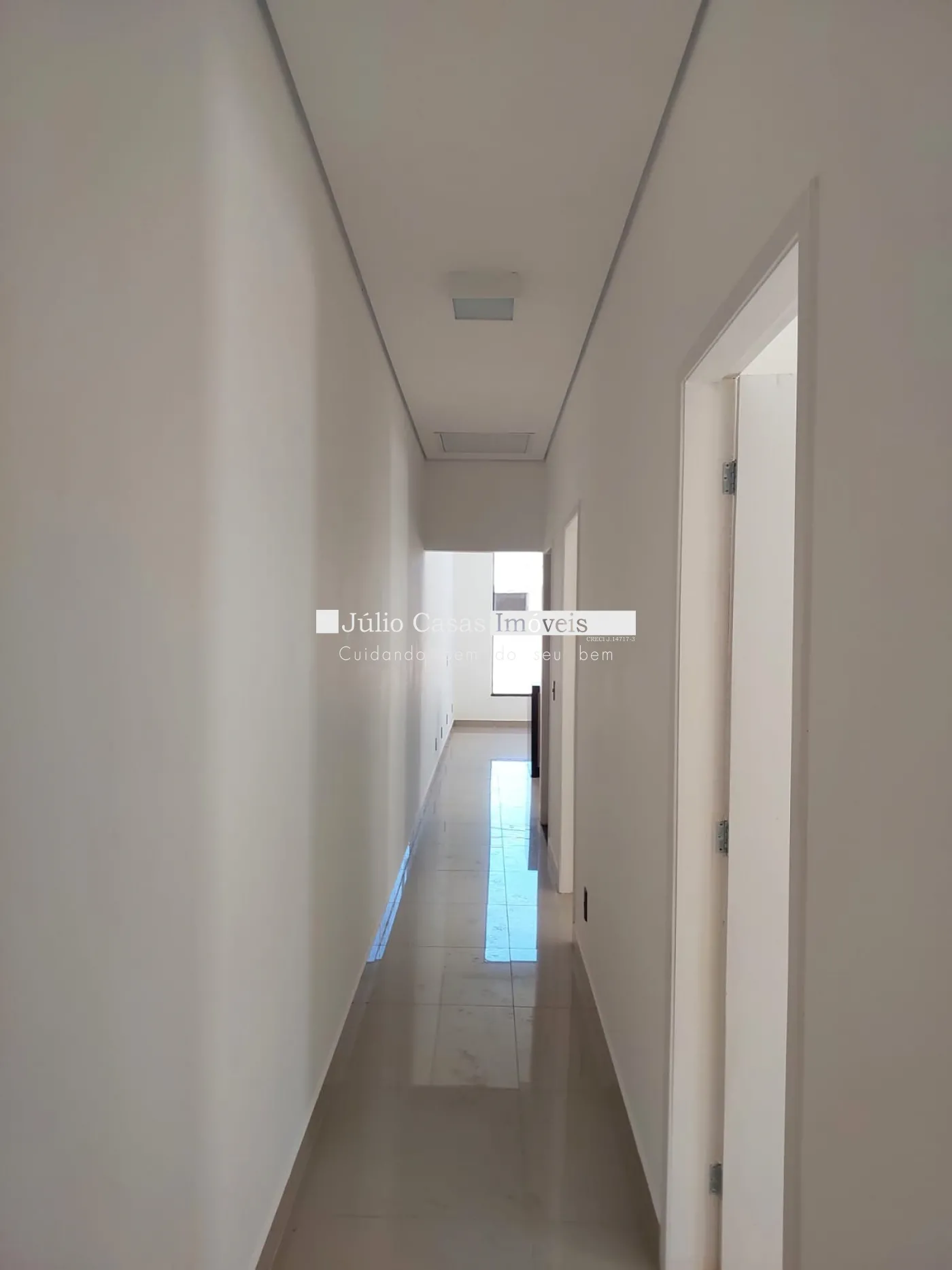 Imóvel com 3 quartos, sendo 1 suíte, e 1 banheiro social. A casa possui uma sala ampla com dois ambientes integrados à cozinha em estilo aberto, que conta com bancada em granito e armários planejados. Todos os ambientes são revestidos com porcelanato de alta qualidade.