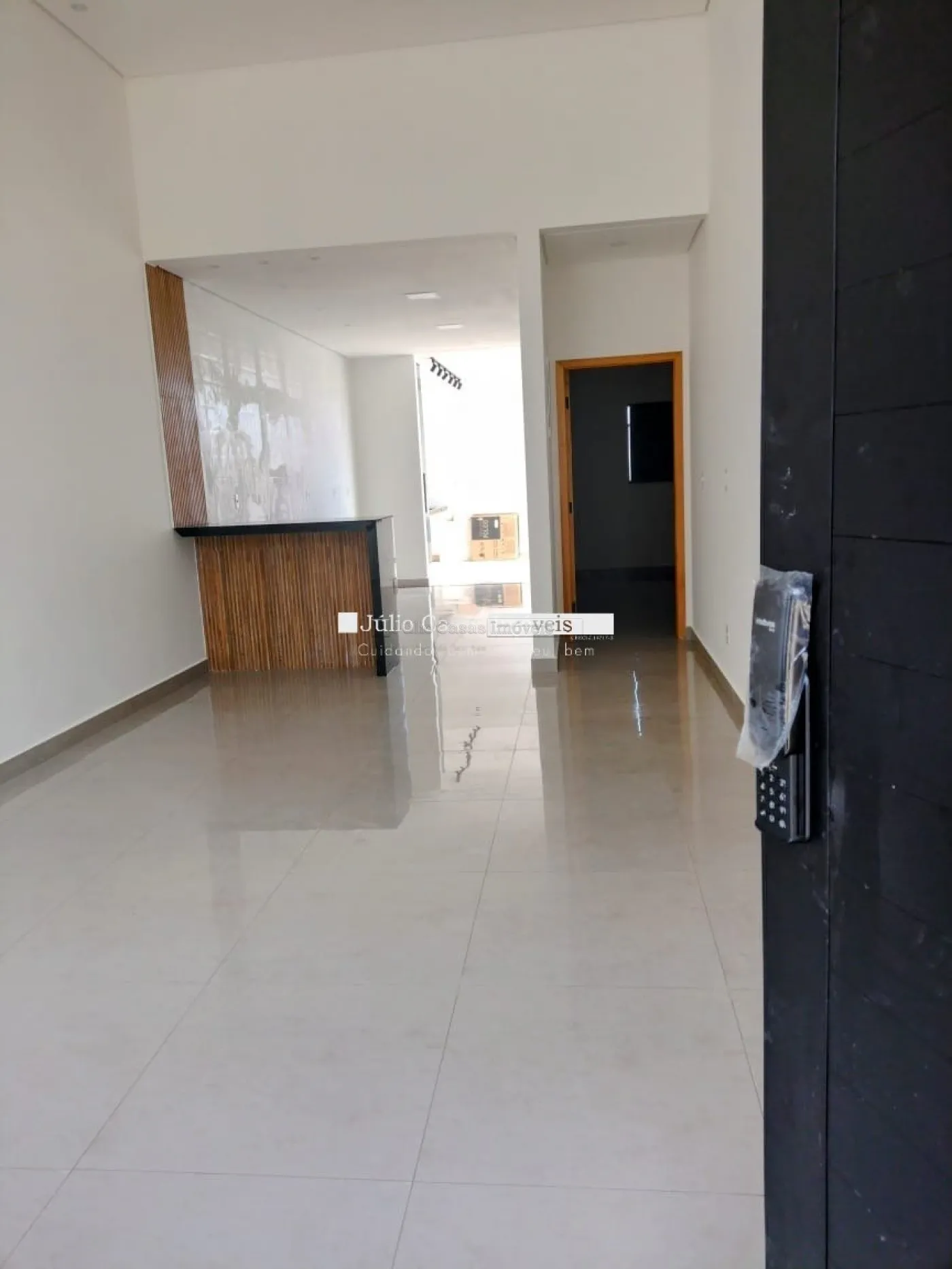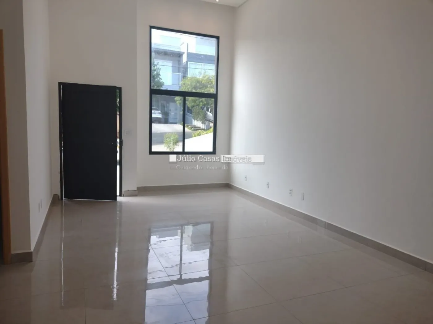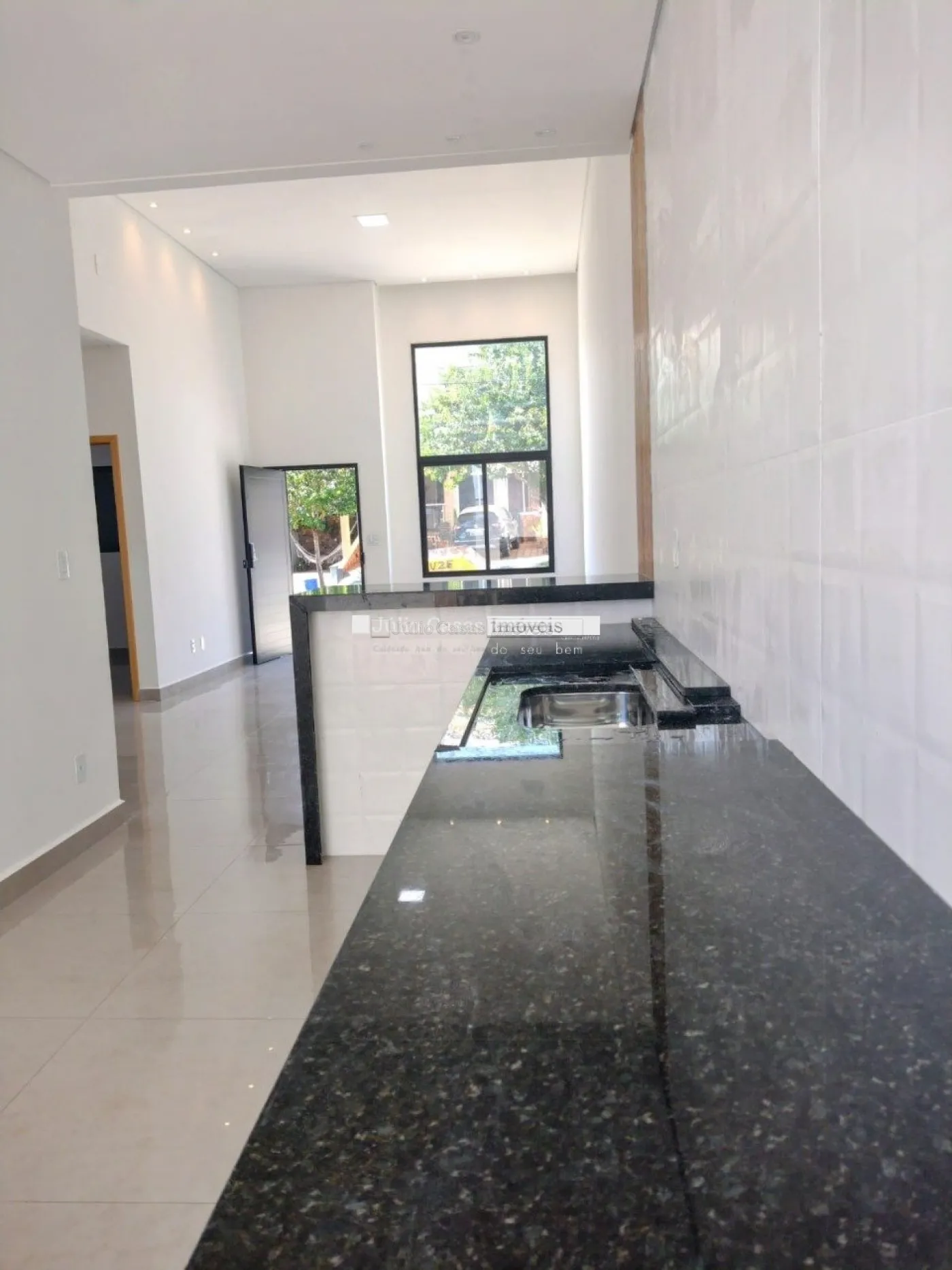 Sala em dois ambientes com pé direito alto, teto em gesso rebaixado piso em porcelanato de 90x90cm, esmaltado e iluminação em LED. Esquadrias na cor preta e porta com tranca eletrônica, cozinha americana com paredes azulejadas até o teto, balcão em granito preto via láctea integrada a área gourmet com churrasqueira.