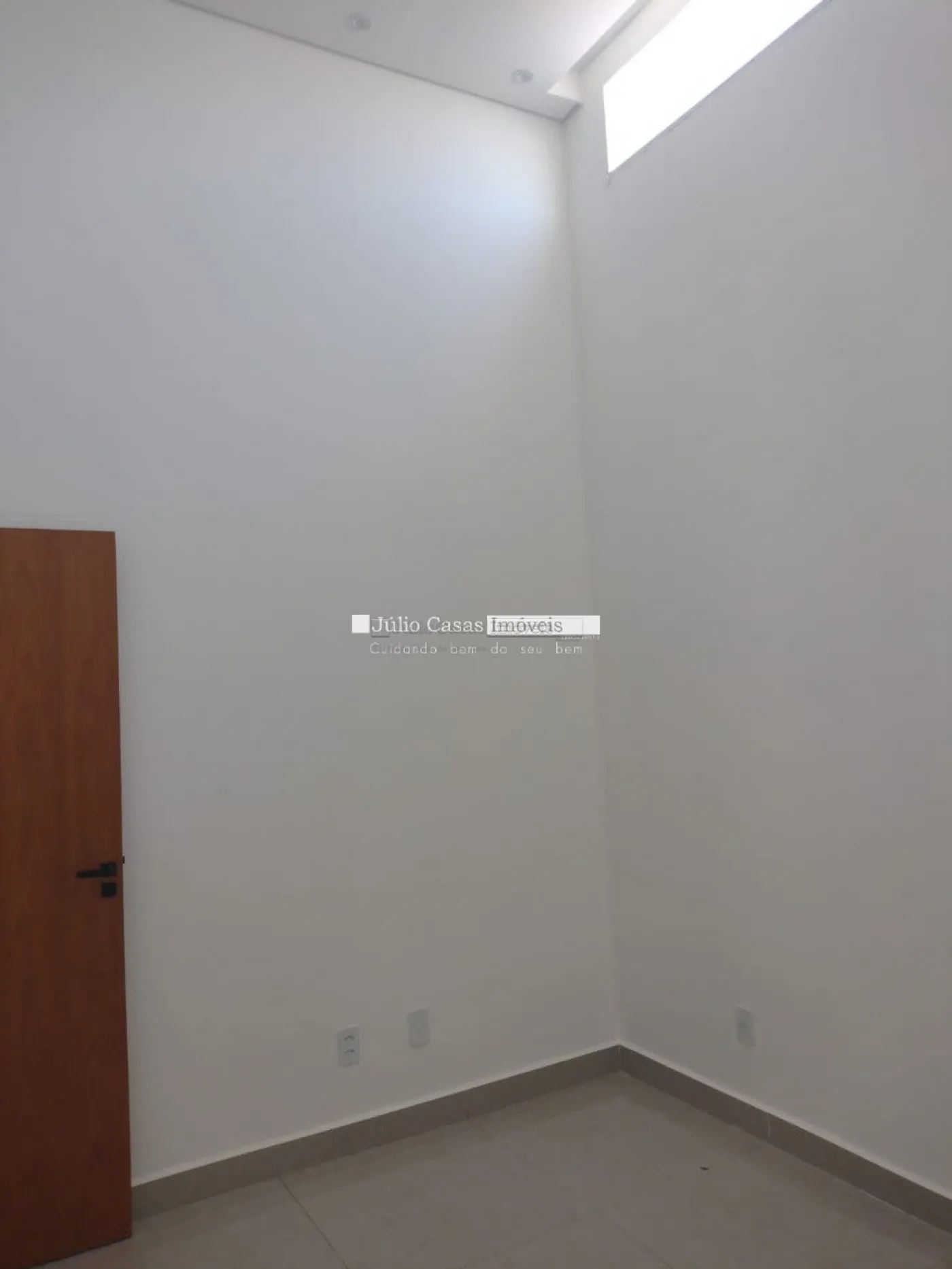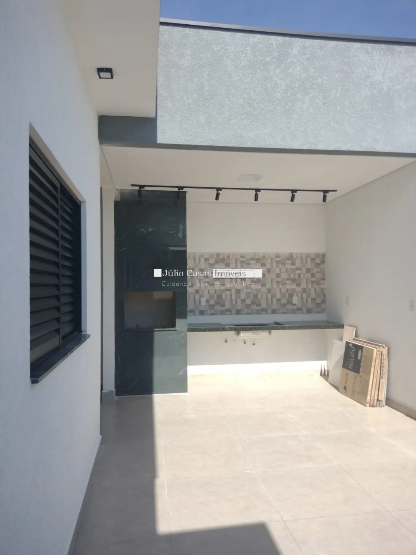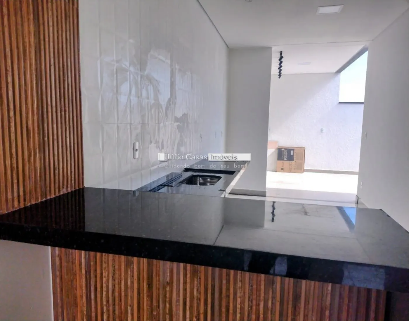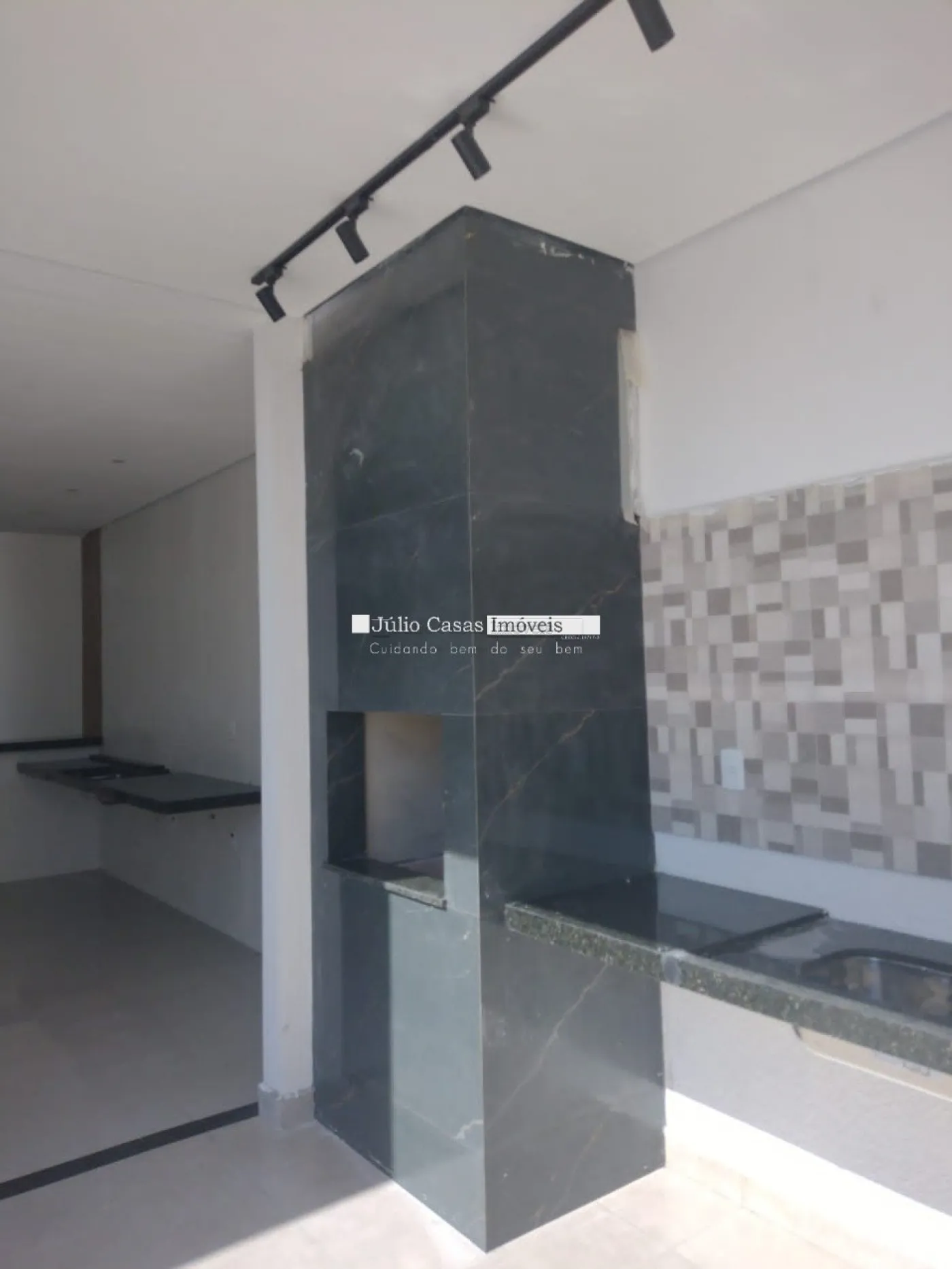 Sala em dois ambientes com pé direito alto, teto em gesso rebaixado piso em porcelanato de 90x90cm, esmaltado e iluminação em LED. Esquadrias na cor preta e porta com tranca eletrônica, cozinha americana com paredes azulejadas até o teto, balcão em granito preto via láctea integrada a área gourmet com churrasqueira.