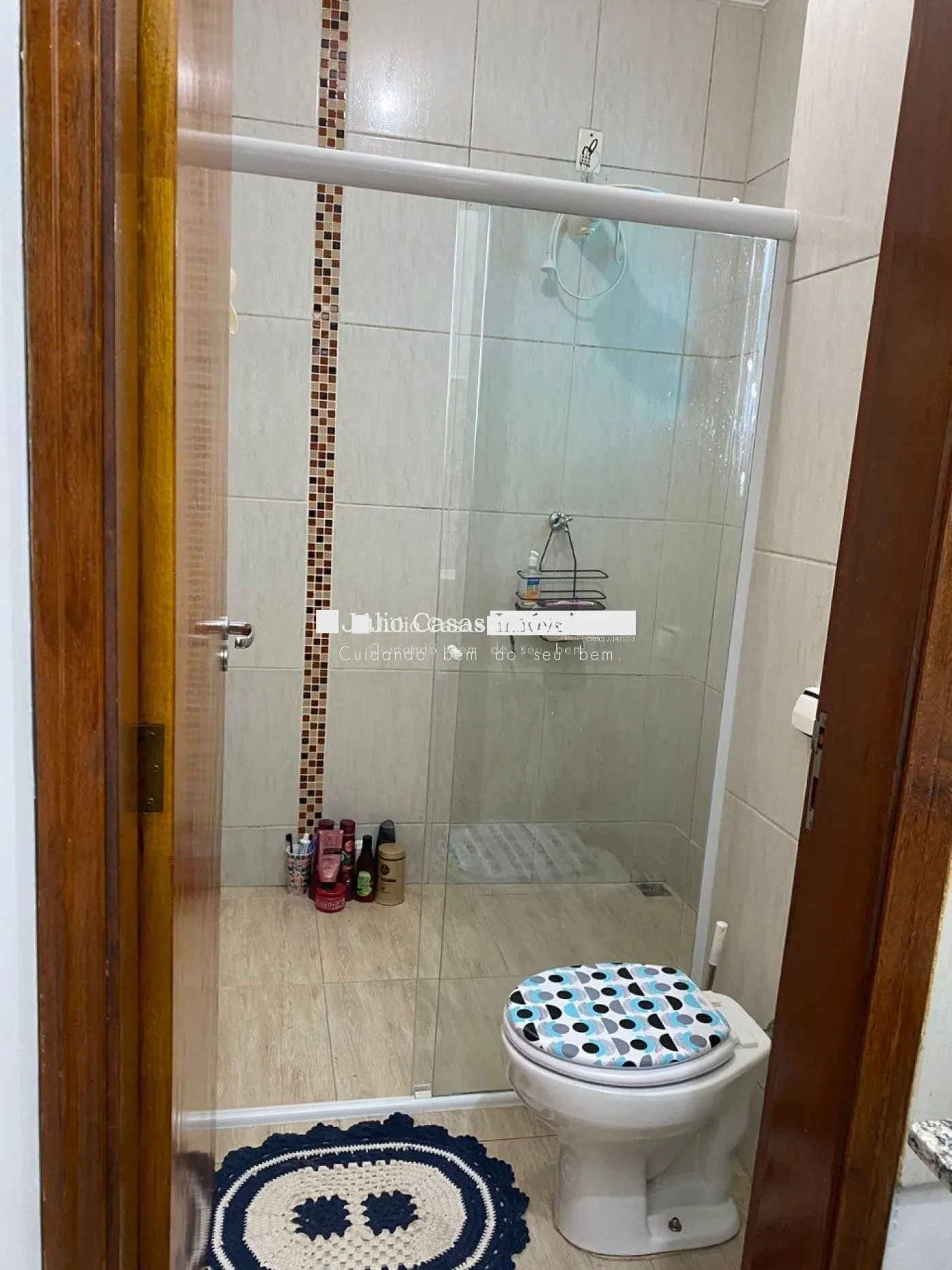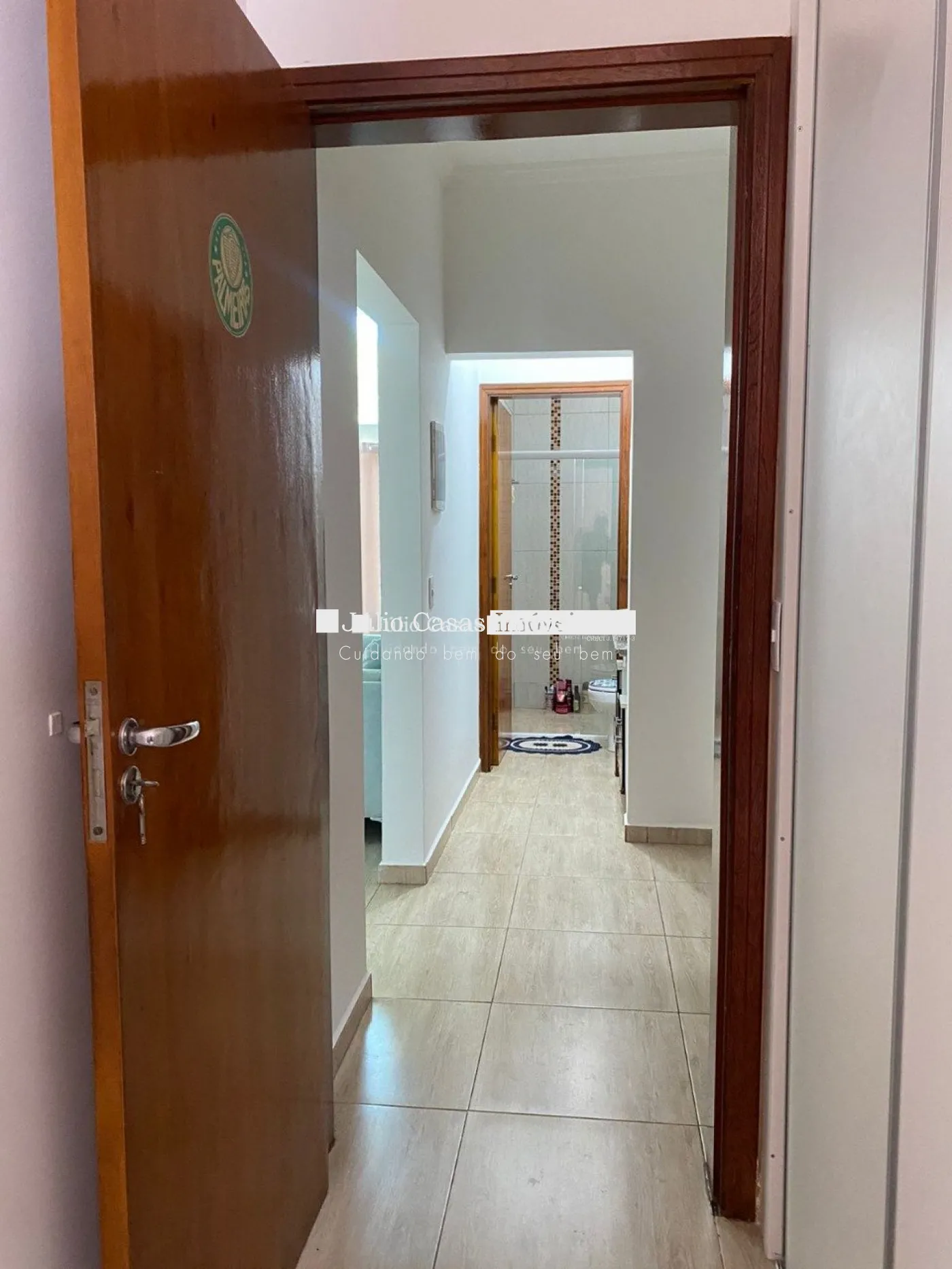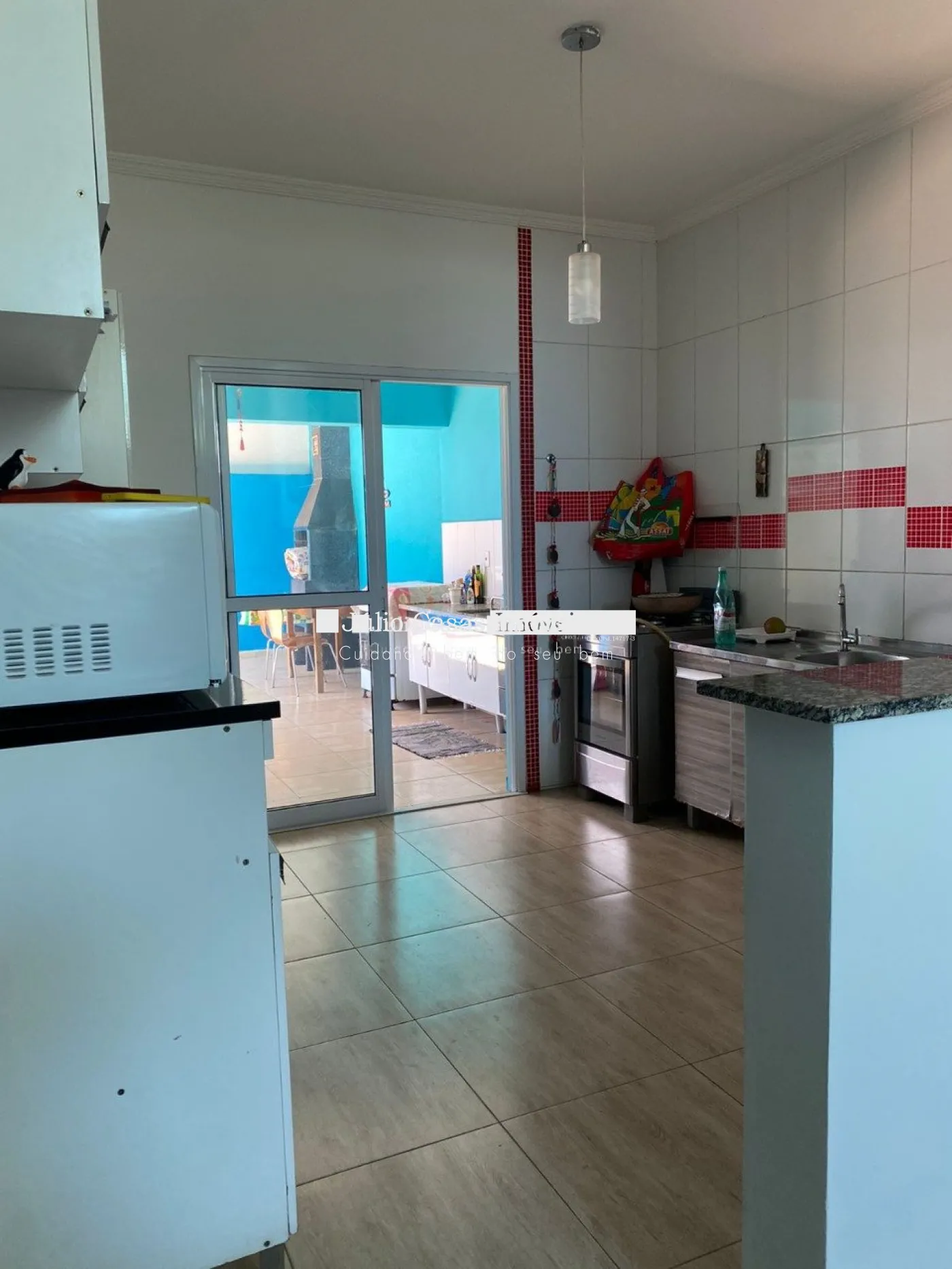 Casa térrea com 3 dormitórios, sendo 1 suíte, dormitórios com armários embutidos, 1 banheiro social, cozinha americana com modulados, sala de estar, quintal com área gourmet com pia de apoio com bancada, entrada lateral, garagem para 2 carros cobertos. Toda casa em piso cerâmico, box em vidros nos banheiros.