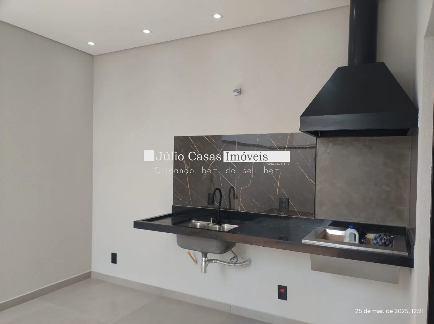 A sala, integrada em dois ambientes, conta com pé direito elevado, proporcionando sensação de amplitude e luminosidade. A cozinha, com conceito aberto e ilha central, possui coifa instalada, tornando o ambiente moderno e funcional.