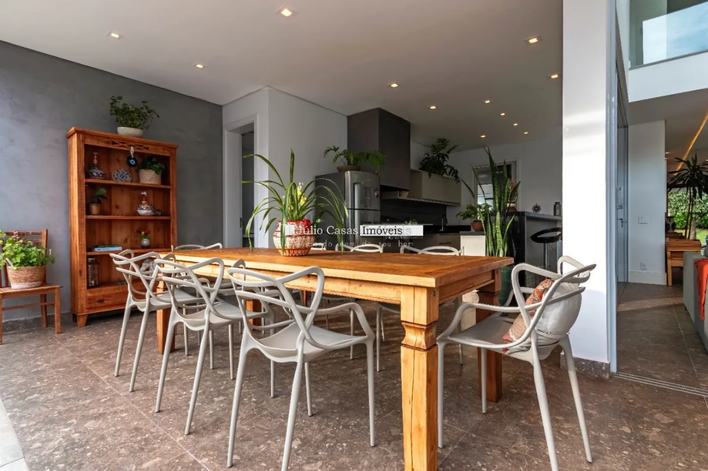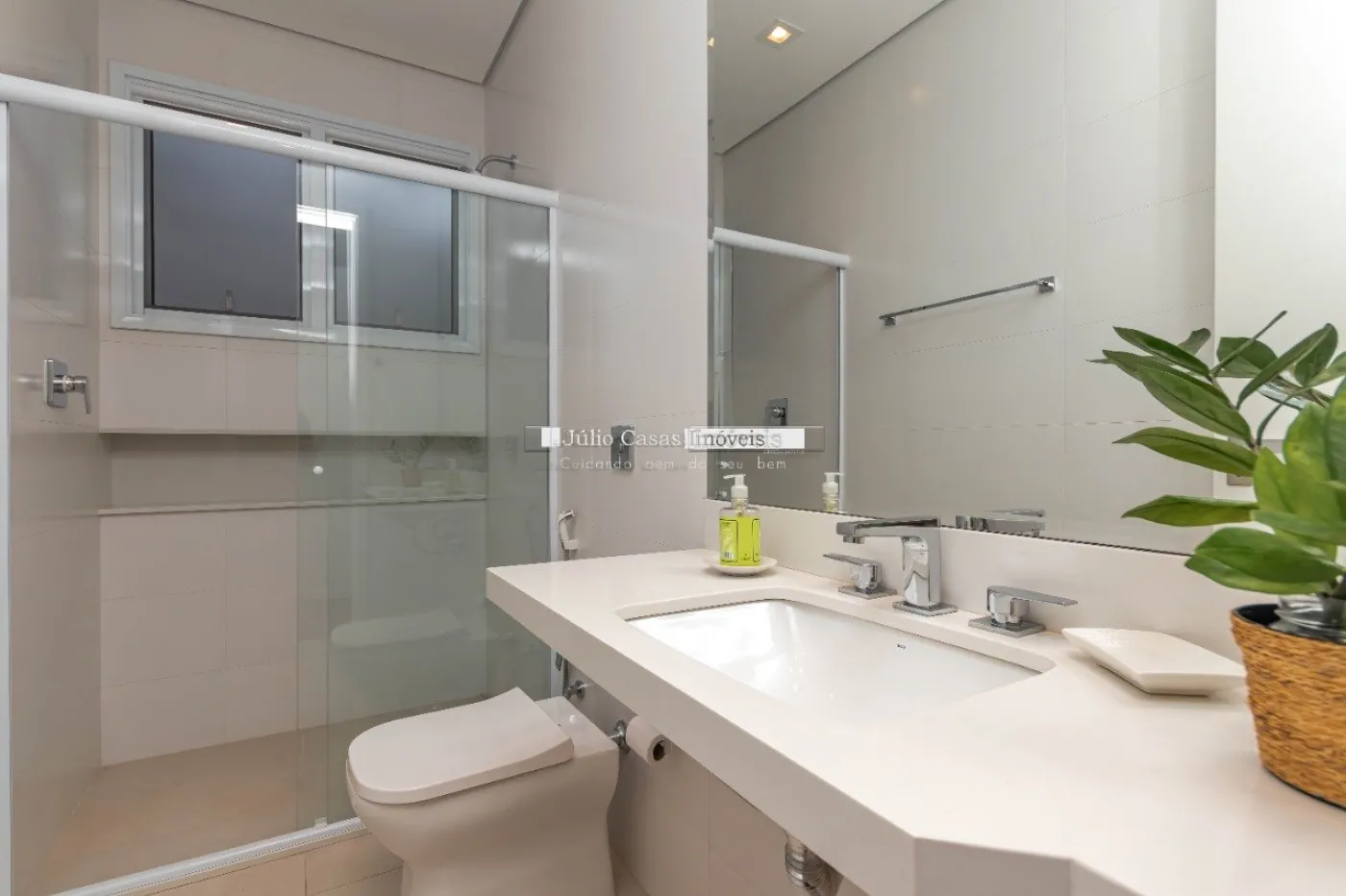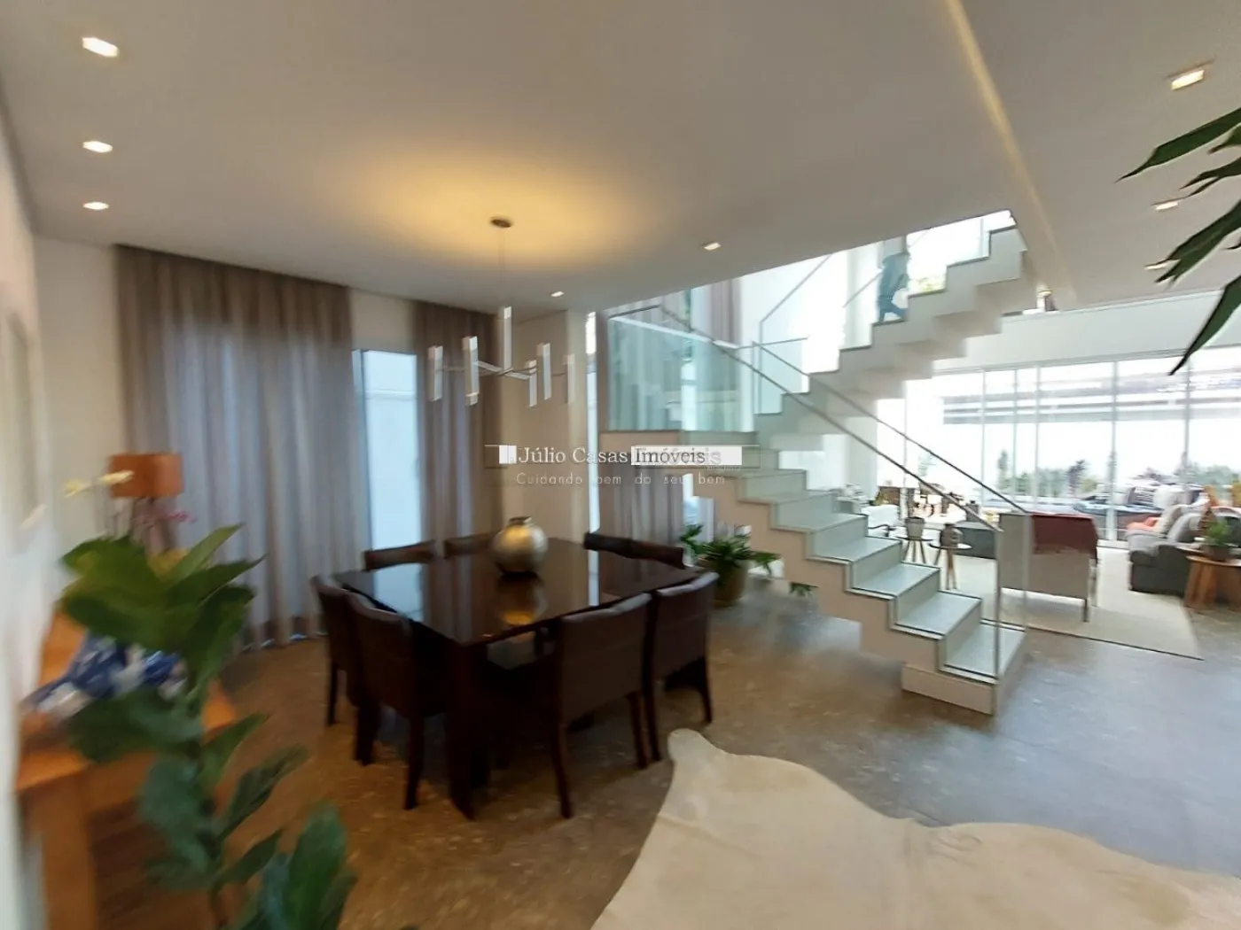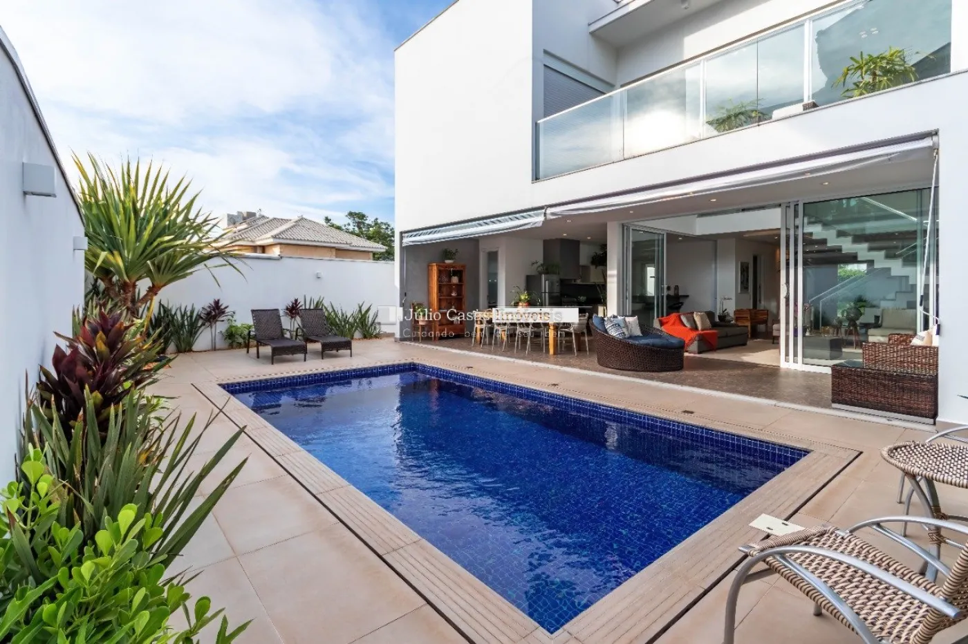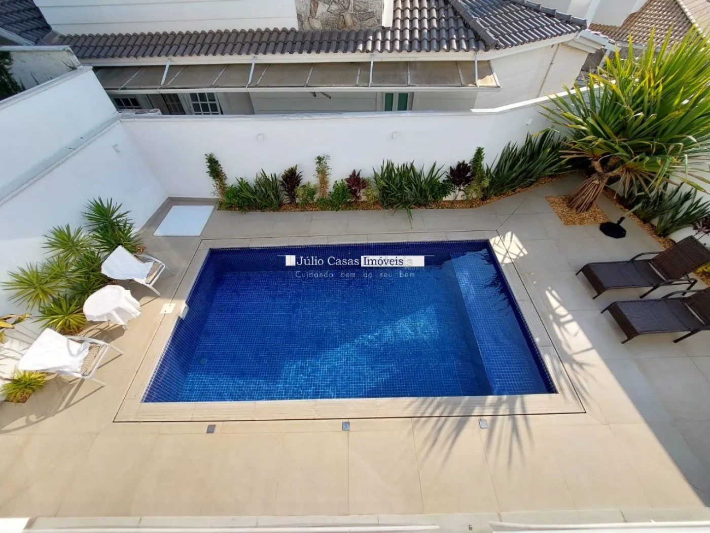 Casa em condomínio, com um térreo que inclui um hall de entrada, lavabo com cuba esculpida e uma suíte ampla. A sala de dois ambientes possui pé direito alto e se integra à área gourmet, que é fechada com vidro temperado. O quintal é equipado com piscina, banheiro externo e uma cozinha totalmente modulada com despensa. A lavanderia tem uma varanda técnica e a dependência de empregada é completa.