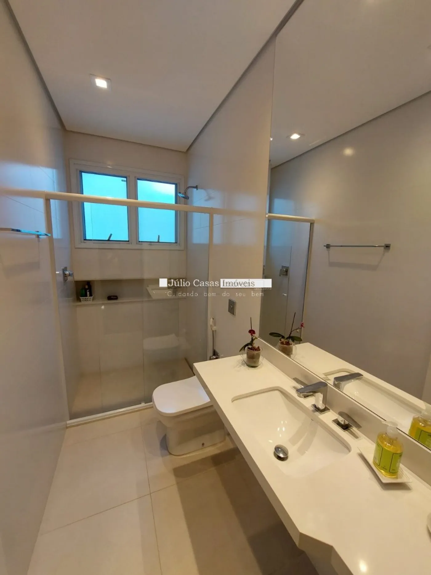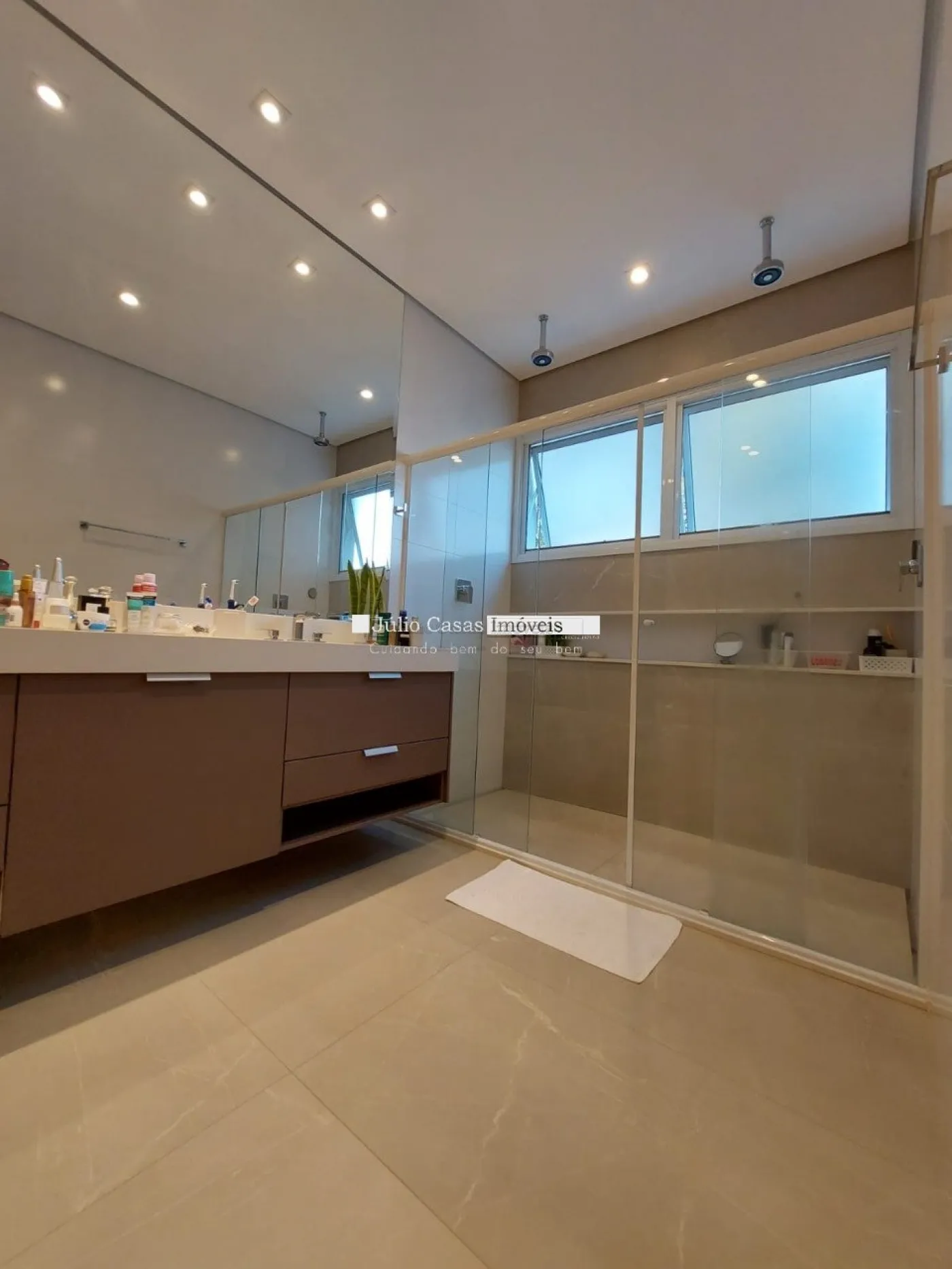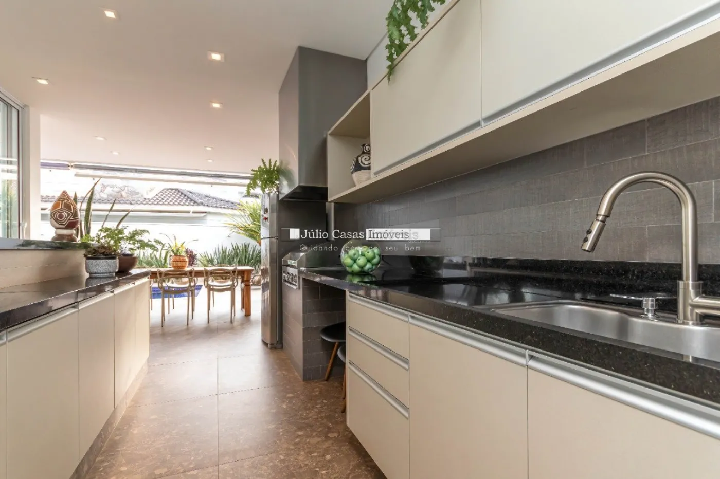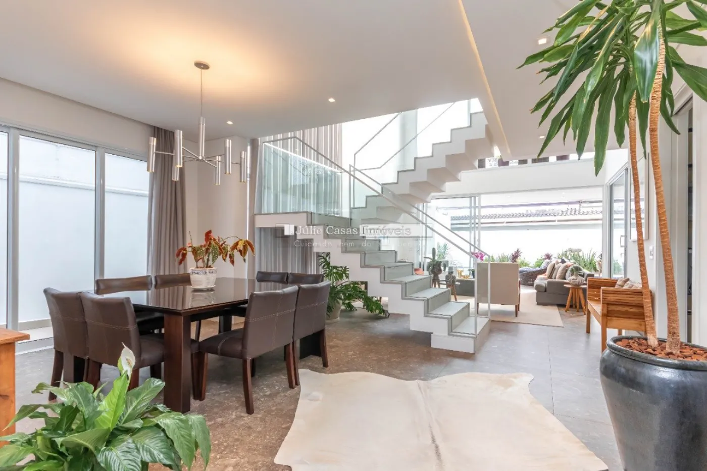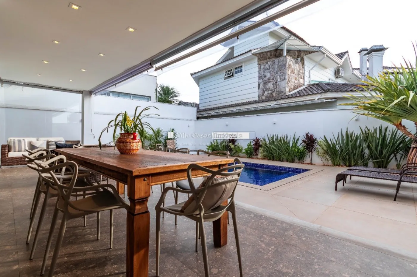 Casa em condomínio, com um térreo que inclui um hall de entrada, lavabo com cuba esculpida e uma suíte ampla. A sala de dois ambientes possui pé direito alto e se integra à área gourmet, que é fechada com vidro temperado. O quintal é equipado com piscina, banheiro externo e uma cozinha totalmente modulada com despensa. A lavanderia tem uma varanda técnica e a dependência de empregada é completa.