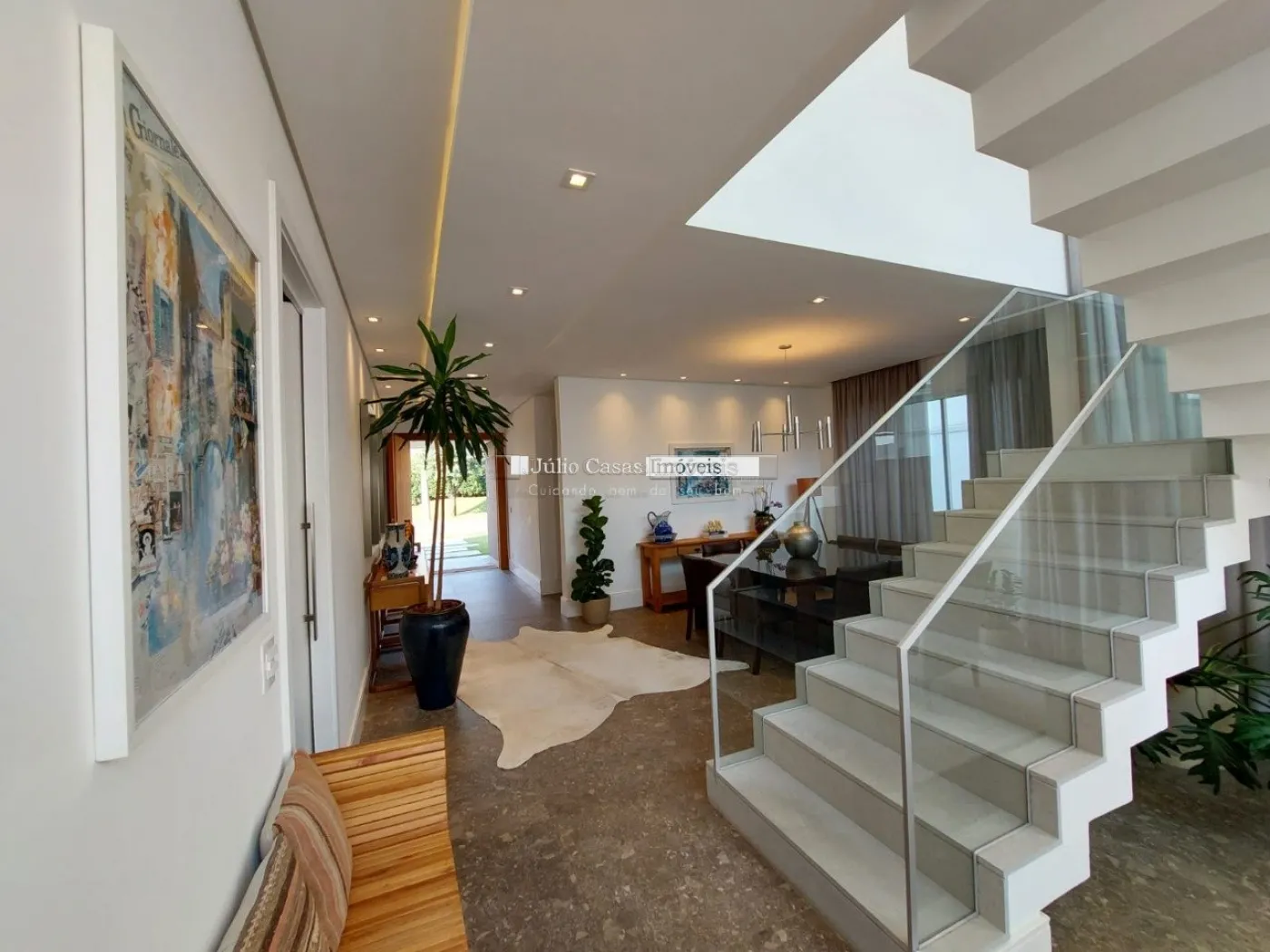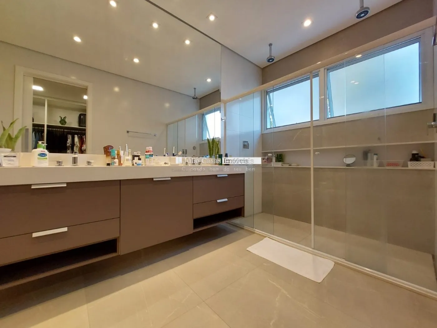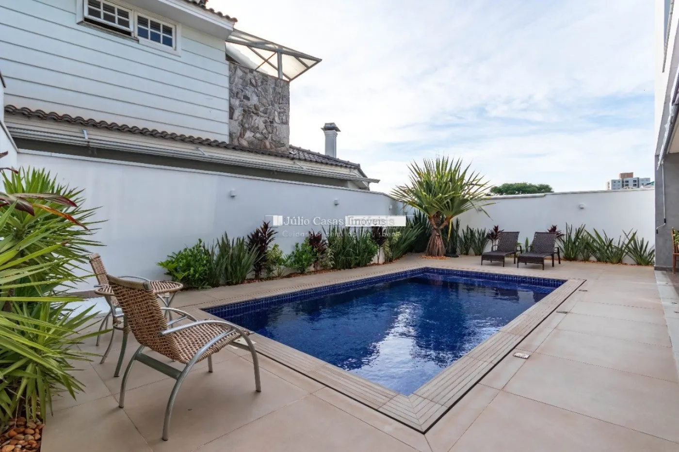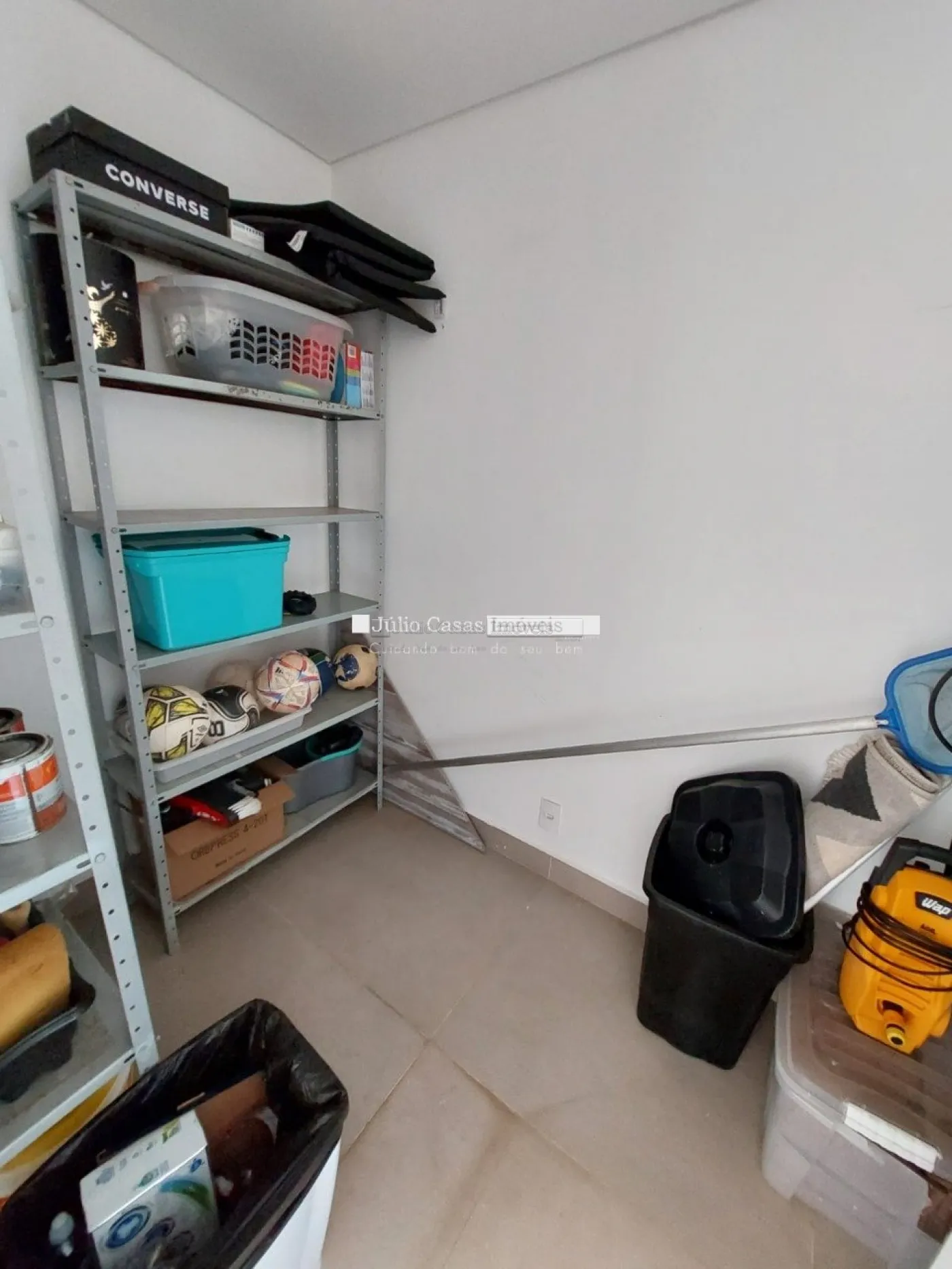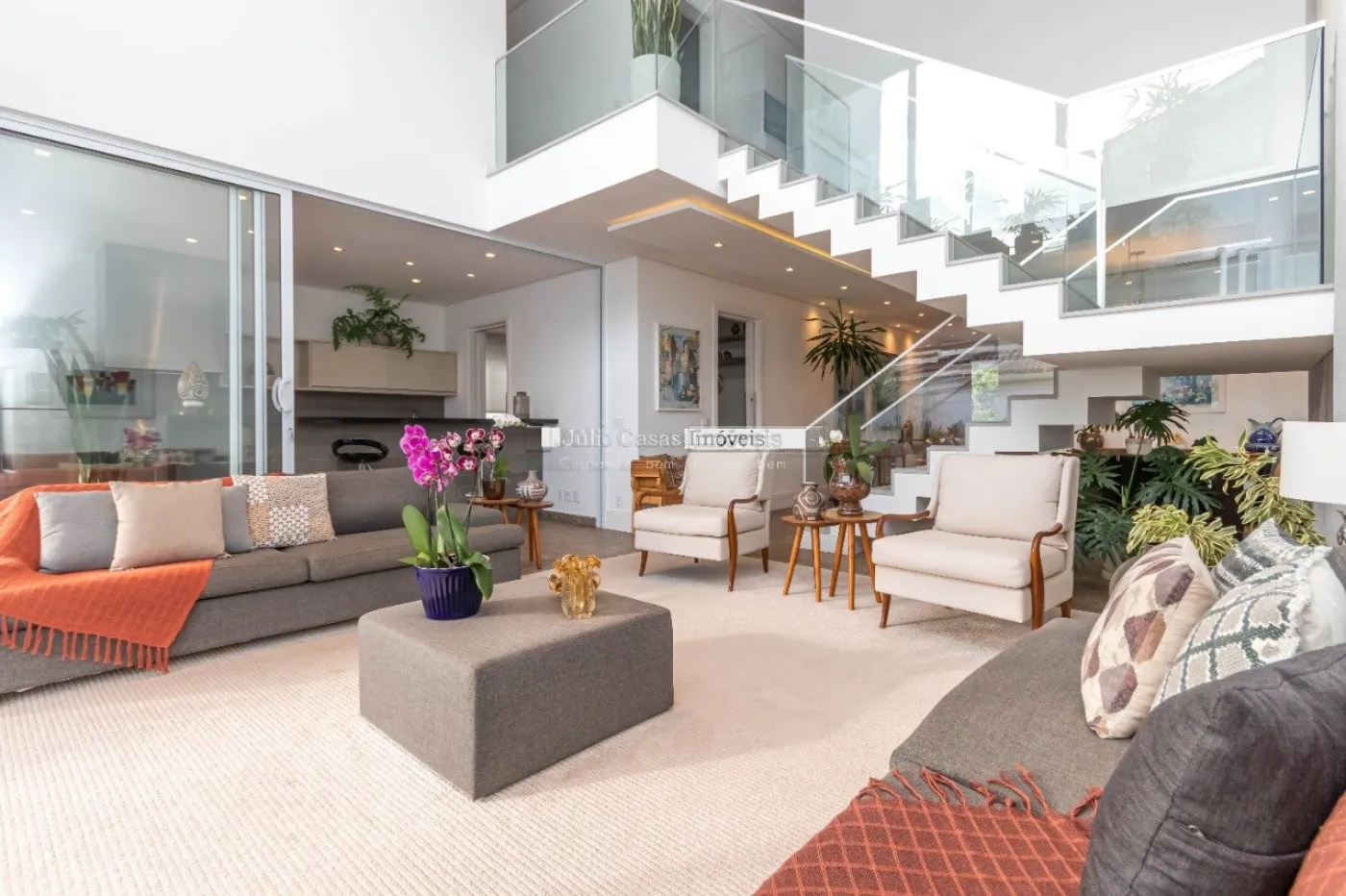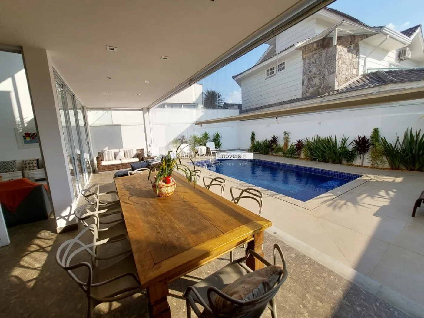 Casa em condomínio, com um térreo que inclui um hall de entrada, lavabo com cuba esculpida e uma suíte ampla. A sala de dois ambientes possui pé direito alto e se integra à área gourmet, que é fechada com vidro temperado. O quintal é equipado com piscina, banheiro externo e uma cozinha totalmente modulada com despensa. A lavanderia tem uma varanda técnica e a dependência de empregada é completa.