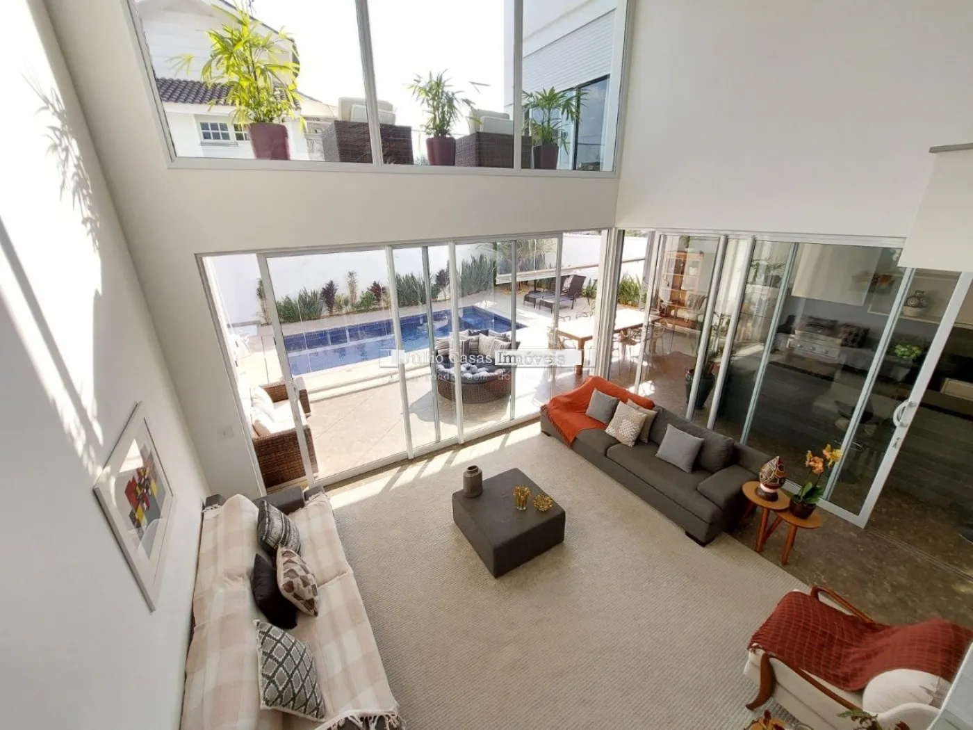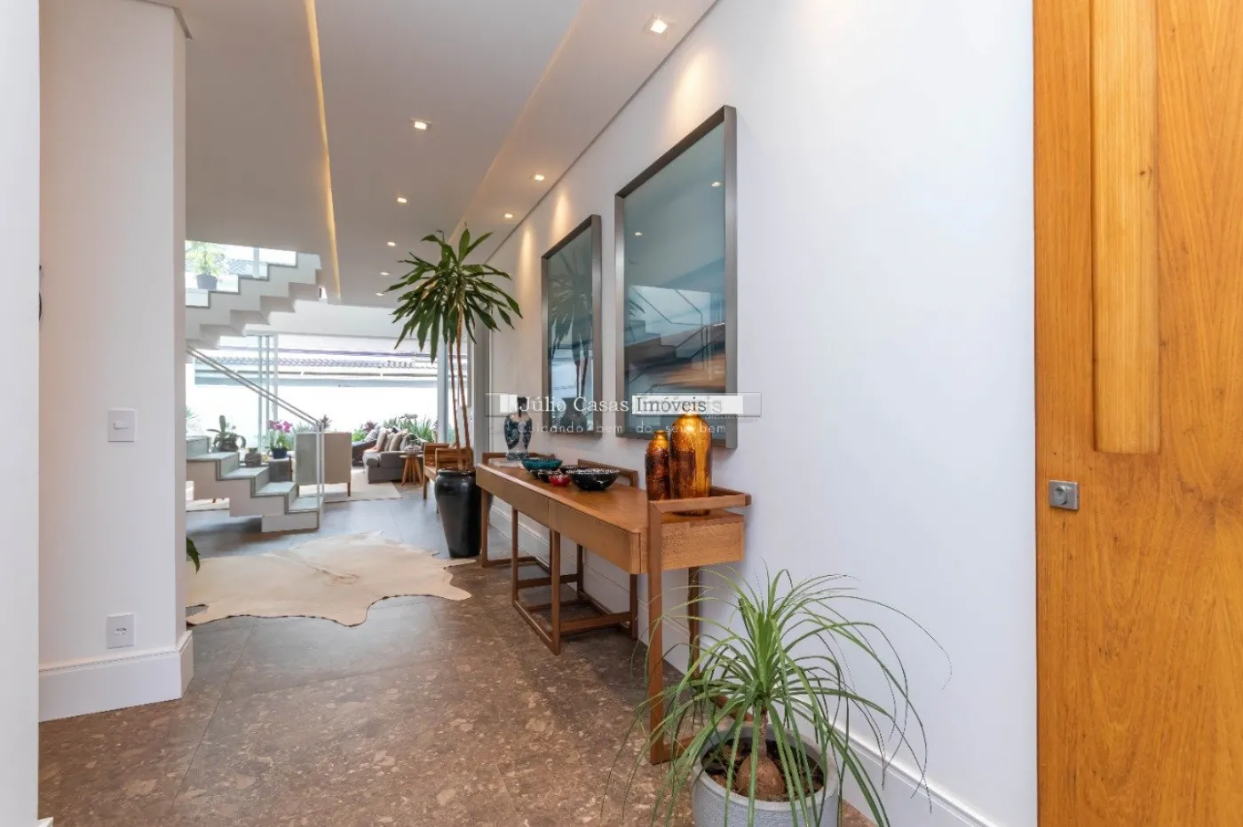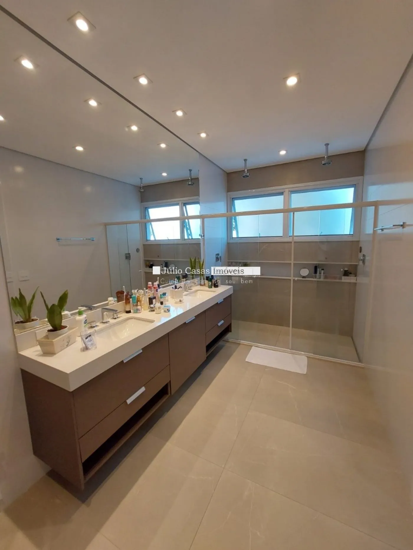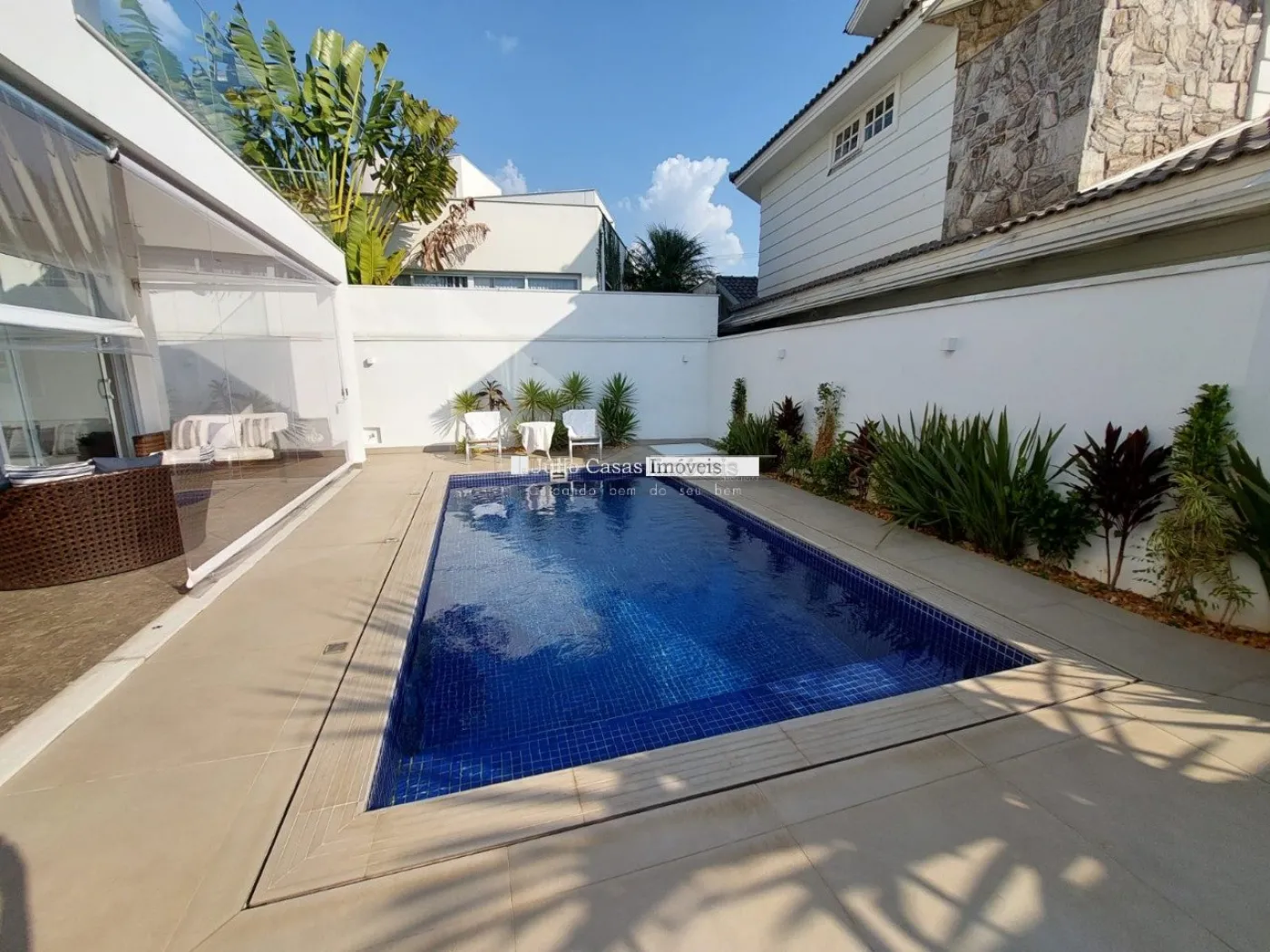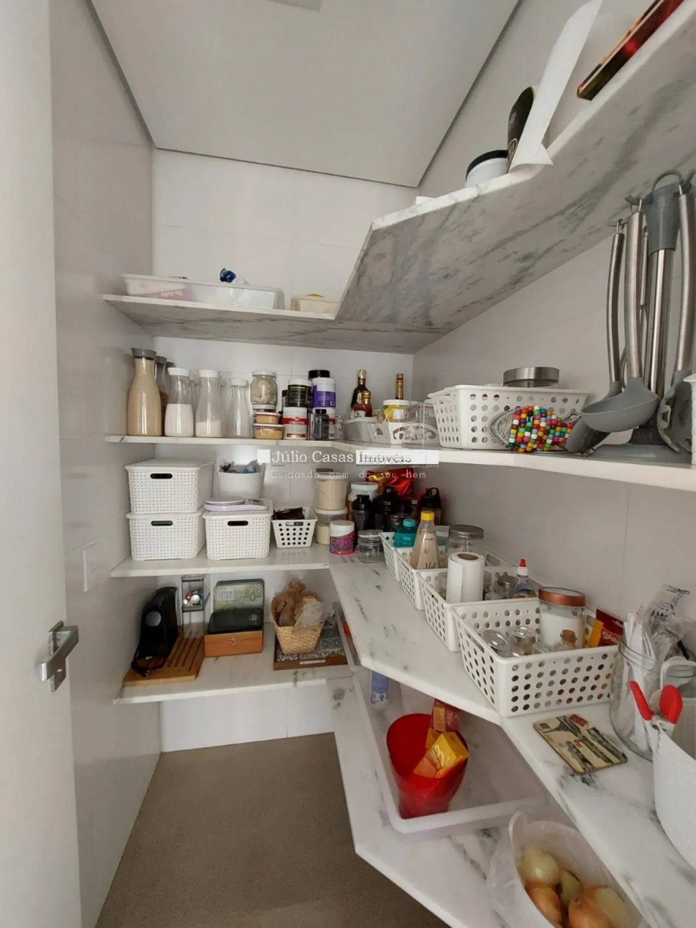 Casa em condomínio, com um térreo que inclui um hall de entrada, lavabo com cuba esculpida e uma suíte ampla. A sala de dois ambientes possui pé direito alto e se integra à área gourmet, que é fechada com vidro temperado. O quintal é equipado com piscina, banheiro externo e uma cozinha totalmente modulada com despensa. A lavanderia tem uma varanda técnica e a dependência de empregada é completa.