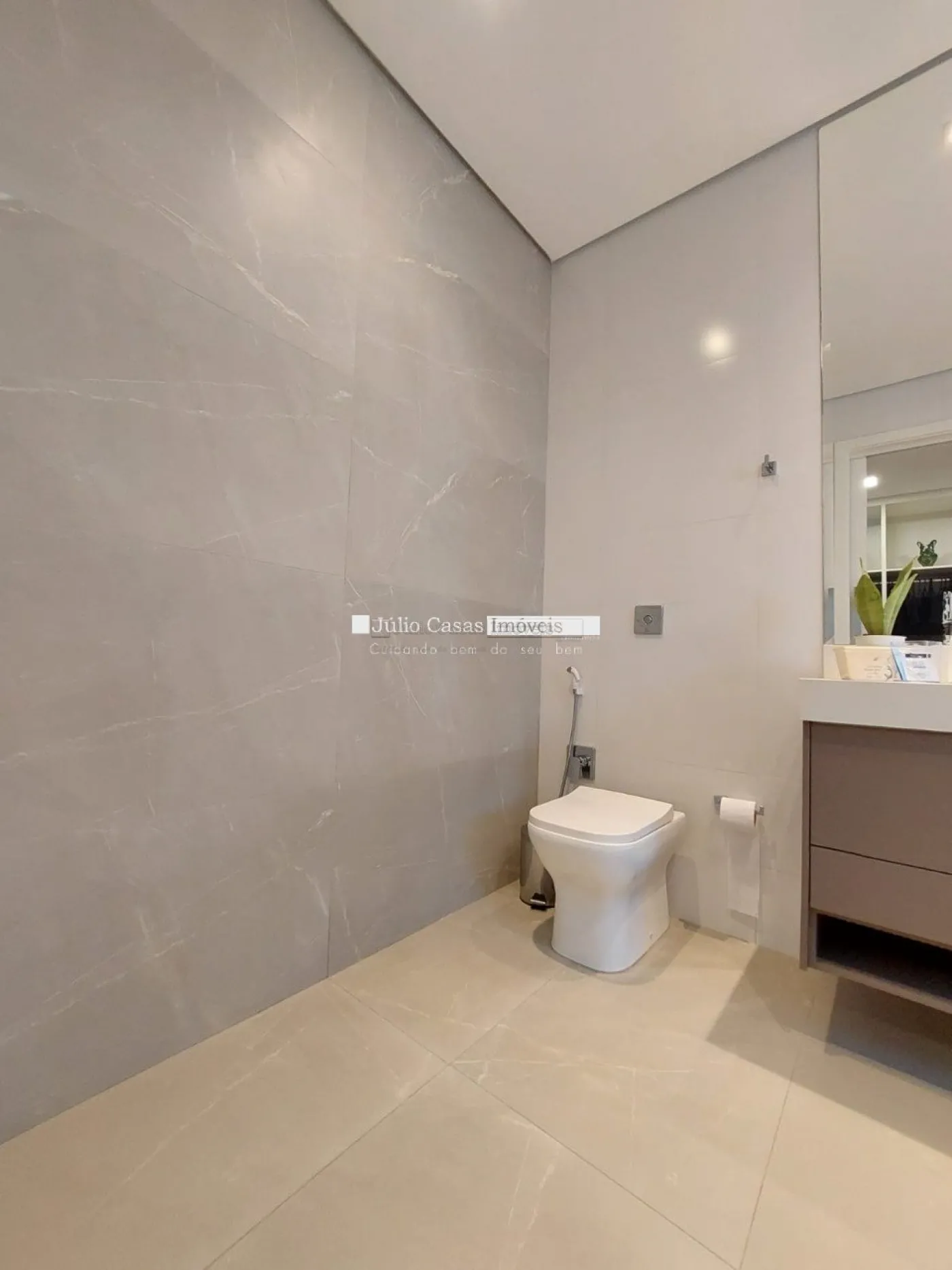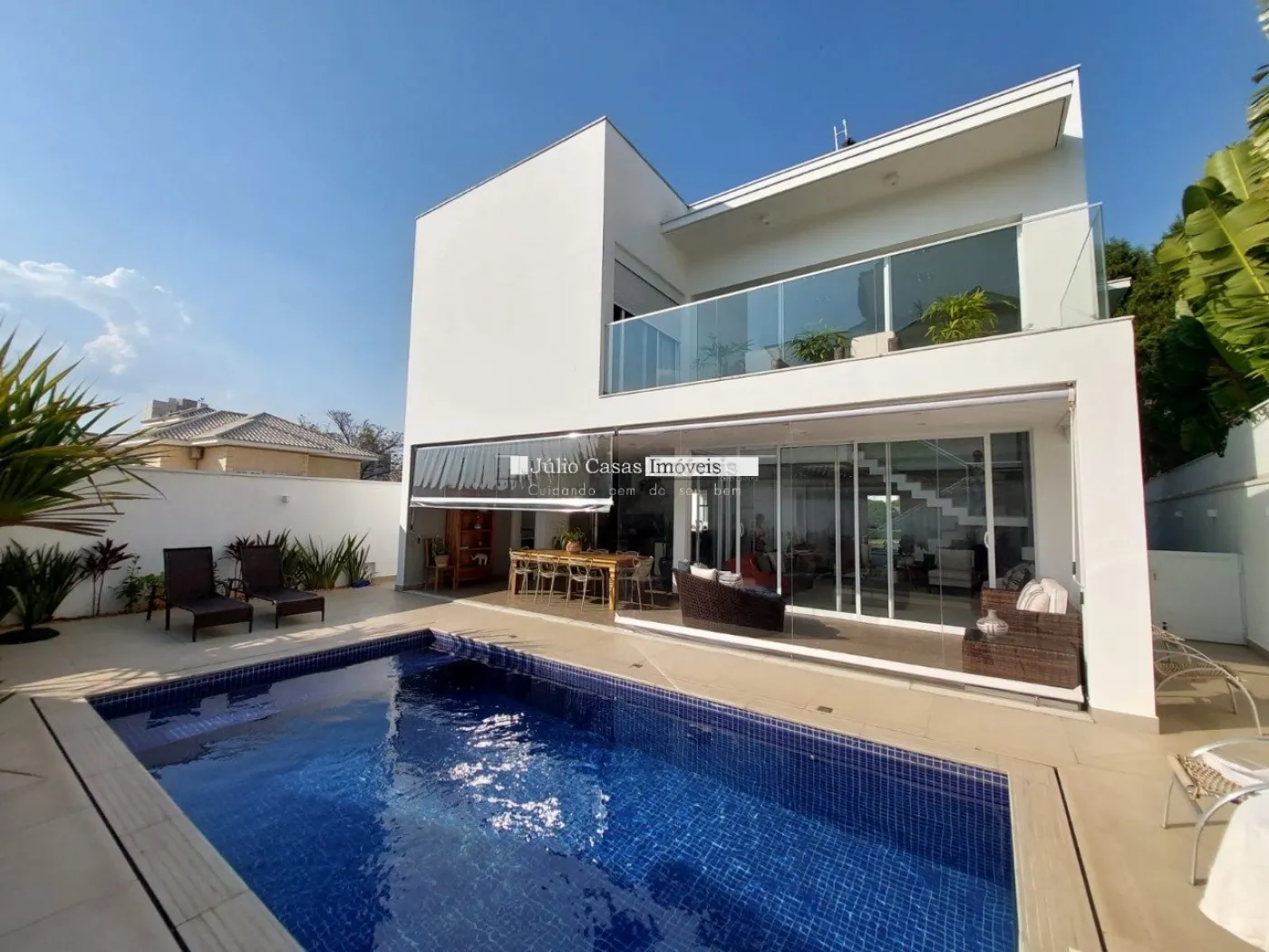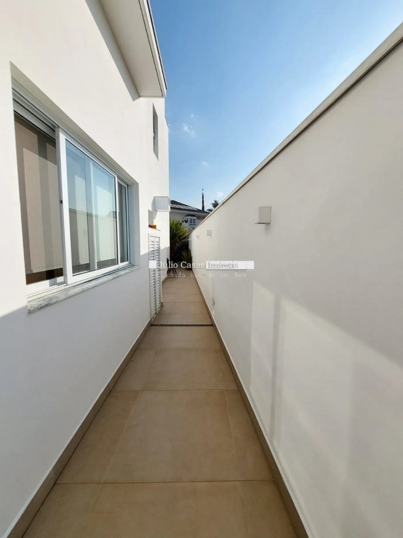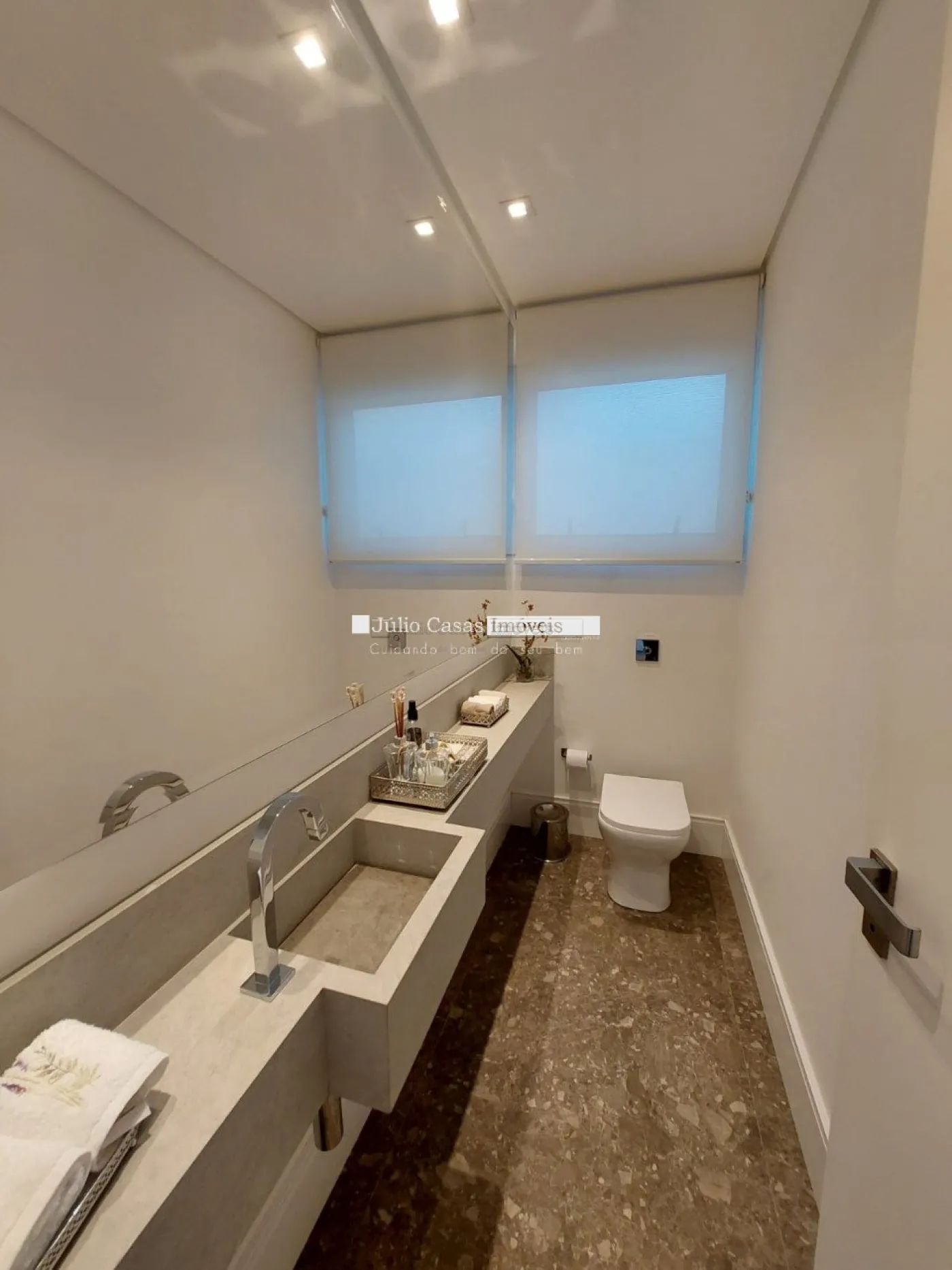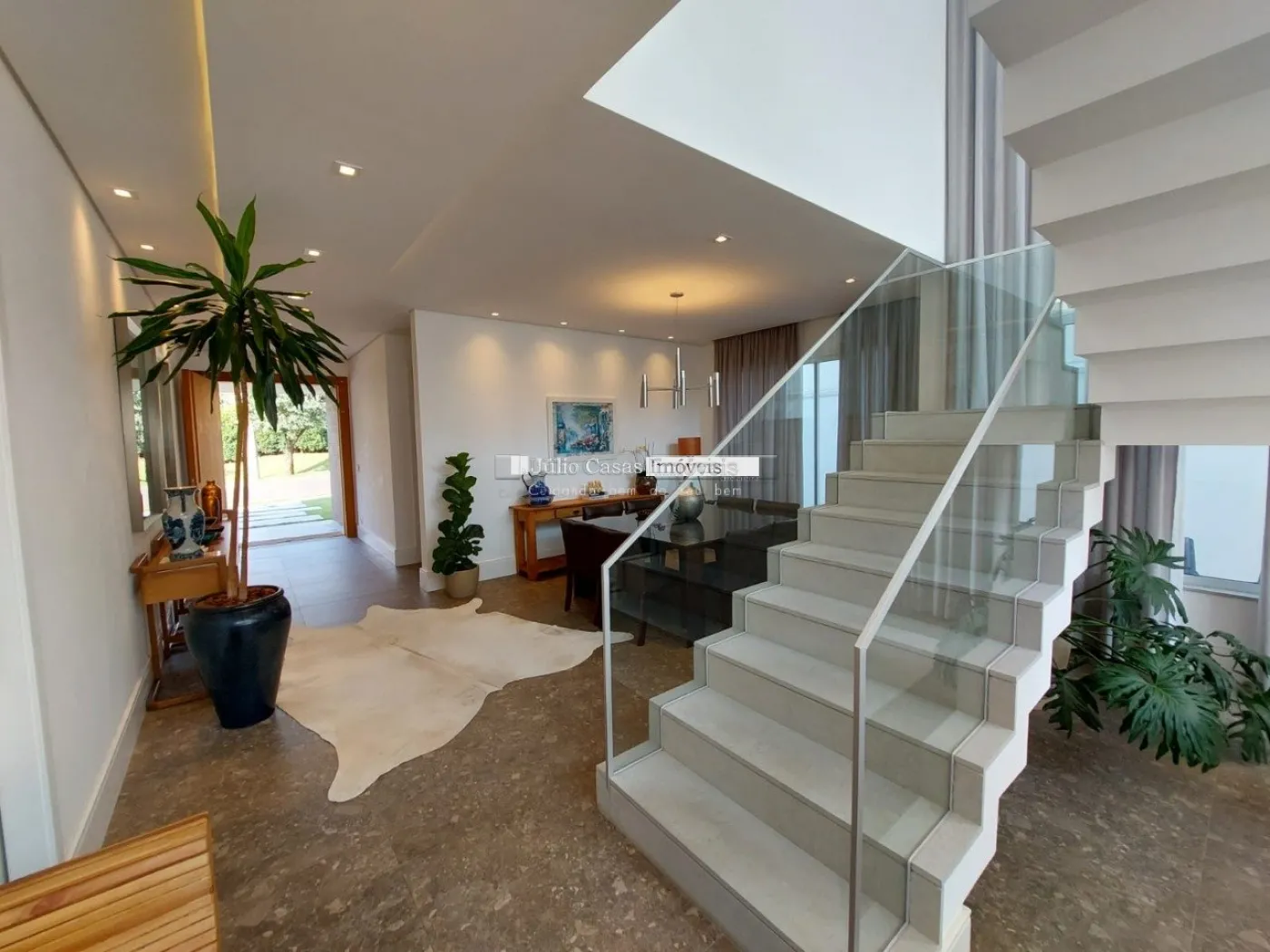 Casa em condomínio, com um térreo que inclui um hall de entrada, lavabo com cuba esculpida e uma suíte ampla. A sala de dois ambientes possui pé direito alto e se integra à área gourmet, que é fechada com vidro temperado. O quintal é equipado com piscina, banheiro externo e uma cozinha totalmente modulada com despensa. A lavanderia tem uma varanda técnica e a dependência de empregada é completa.