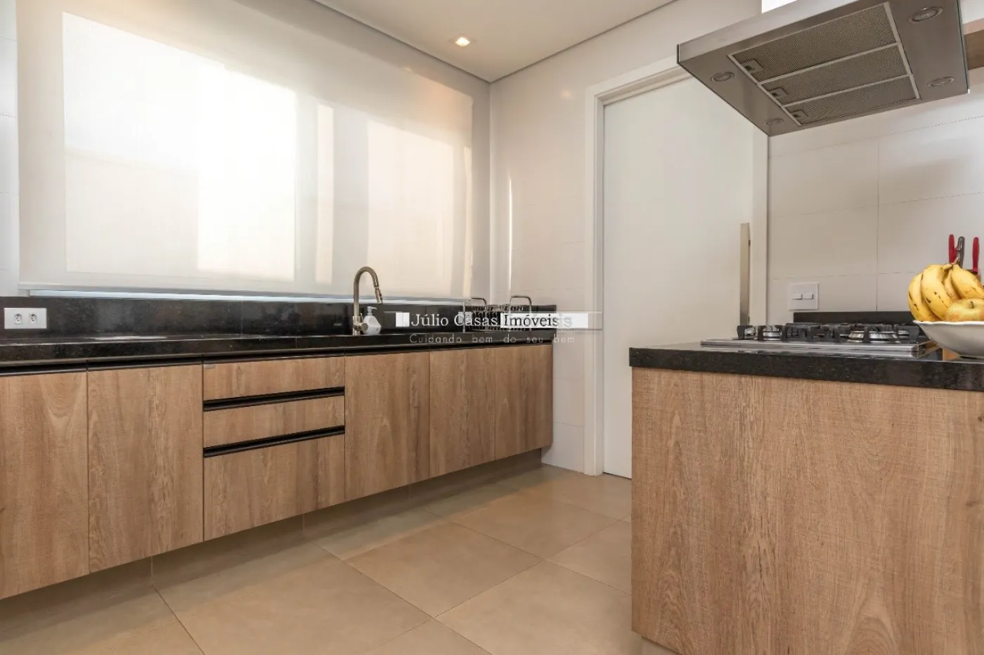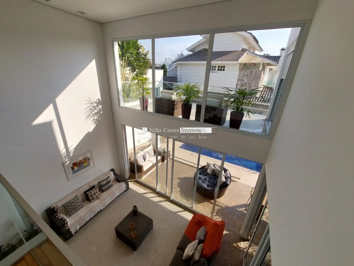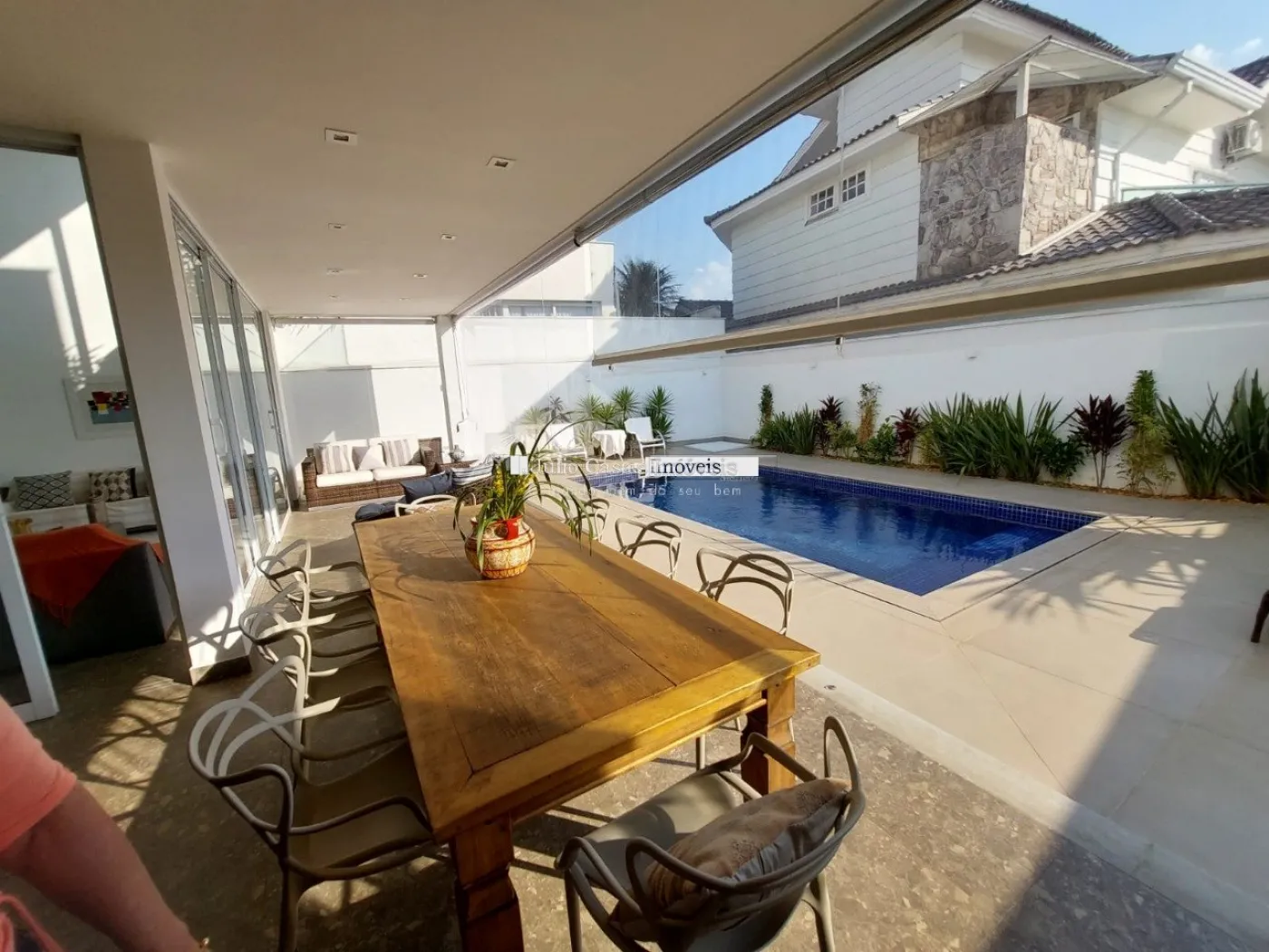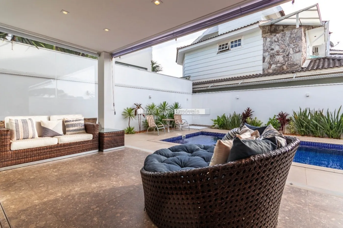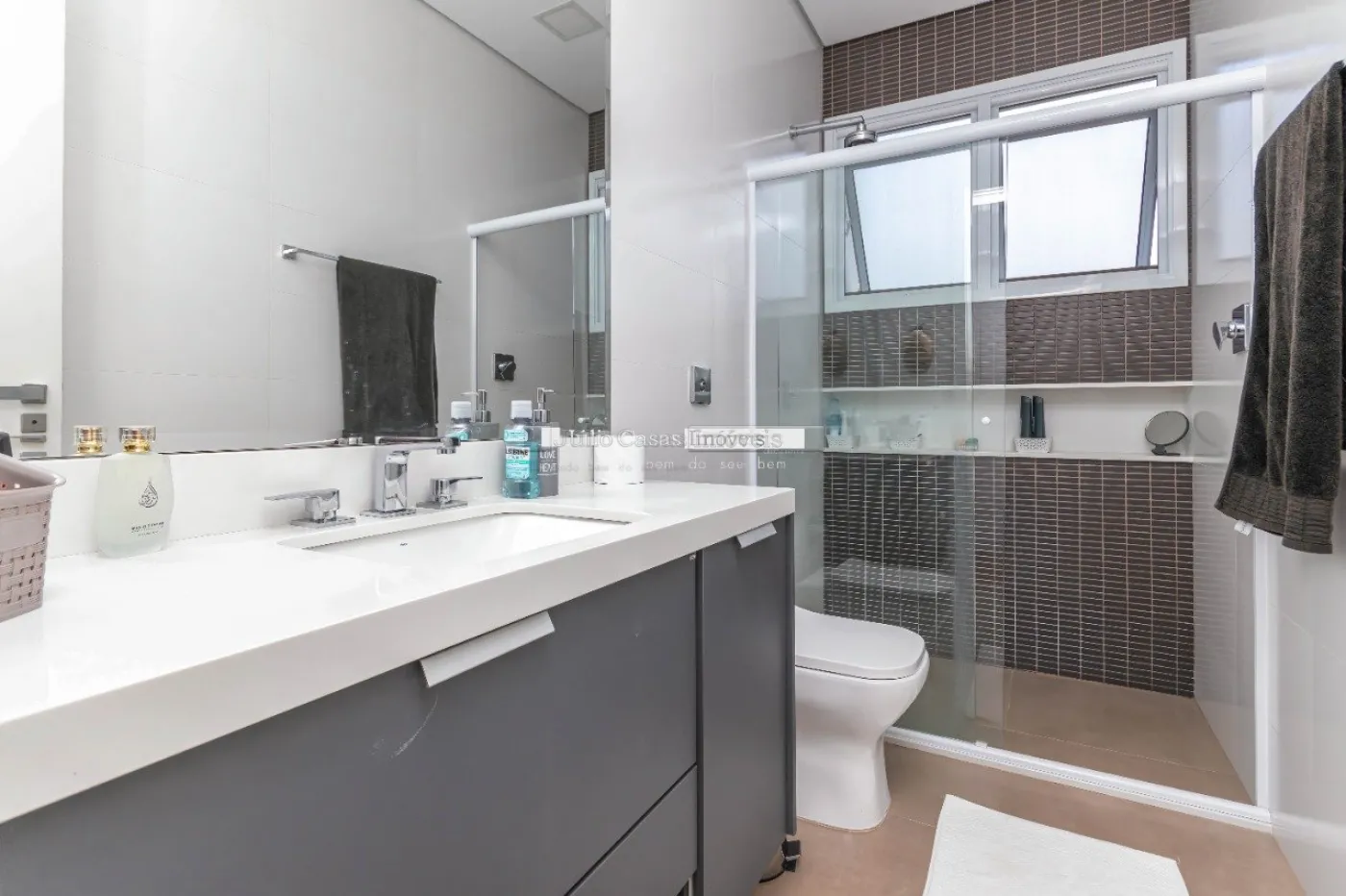 Casa em condomínio, com um térreo que inclui um hall de entrada, lavabo com cuba esculpida e uma suíte ampla. A sala de dois ambientes possui pé direito alto e se integra à área gourmet, que é fechada com vidro temperado. O quintal é equipado com piscina, banheiro externo e uma cozinha totalmente modulada com despensa. A lavanderia tem uma varanda técnica e a dependência de empregada é completa.