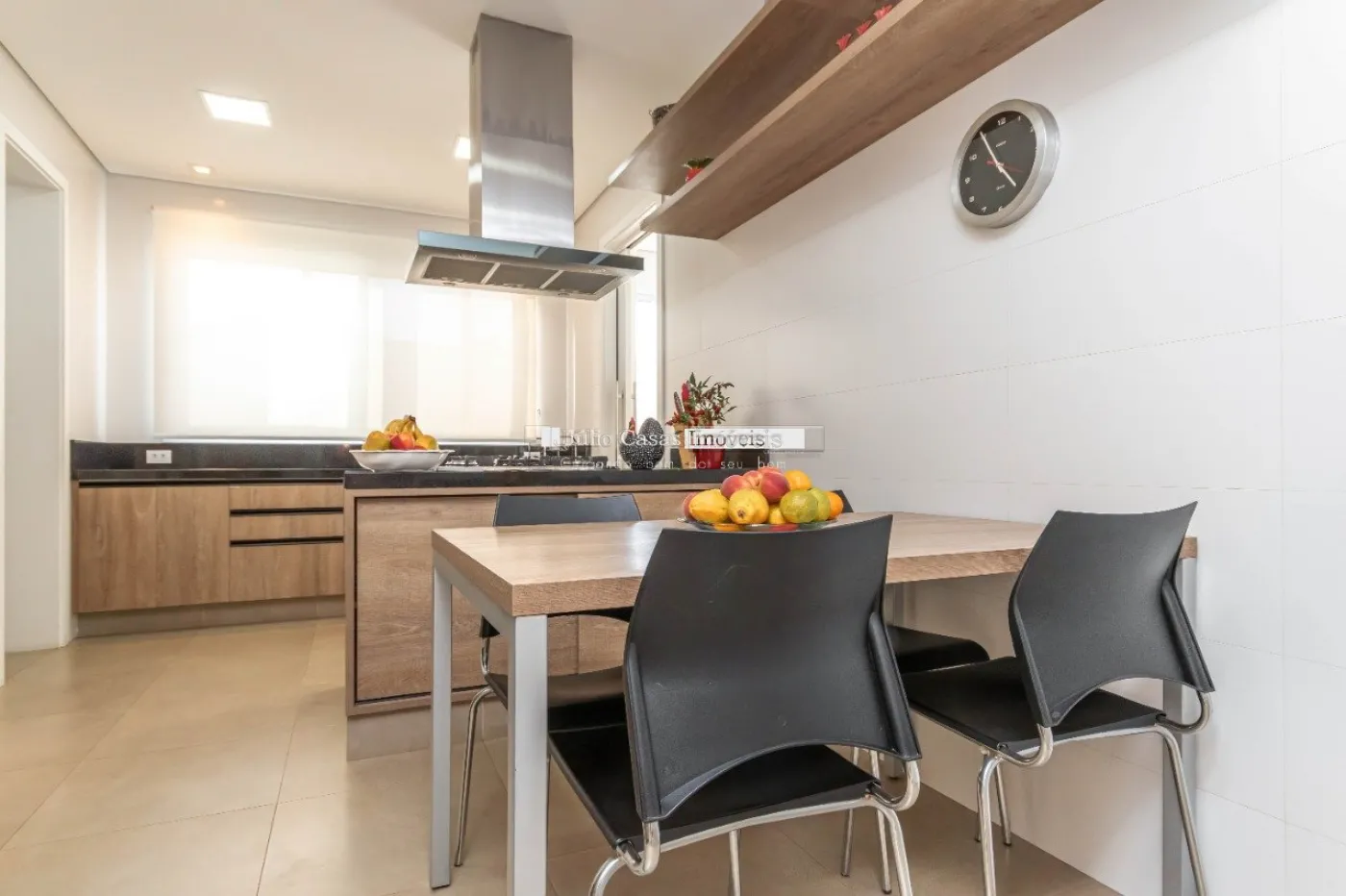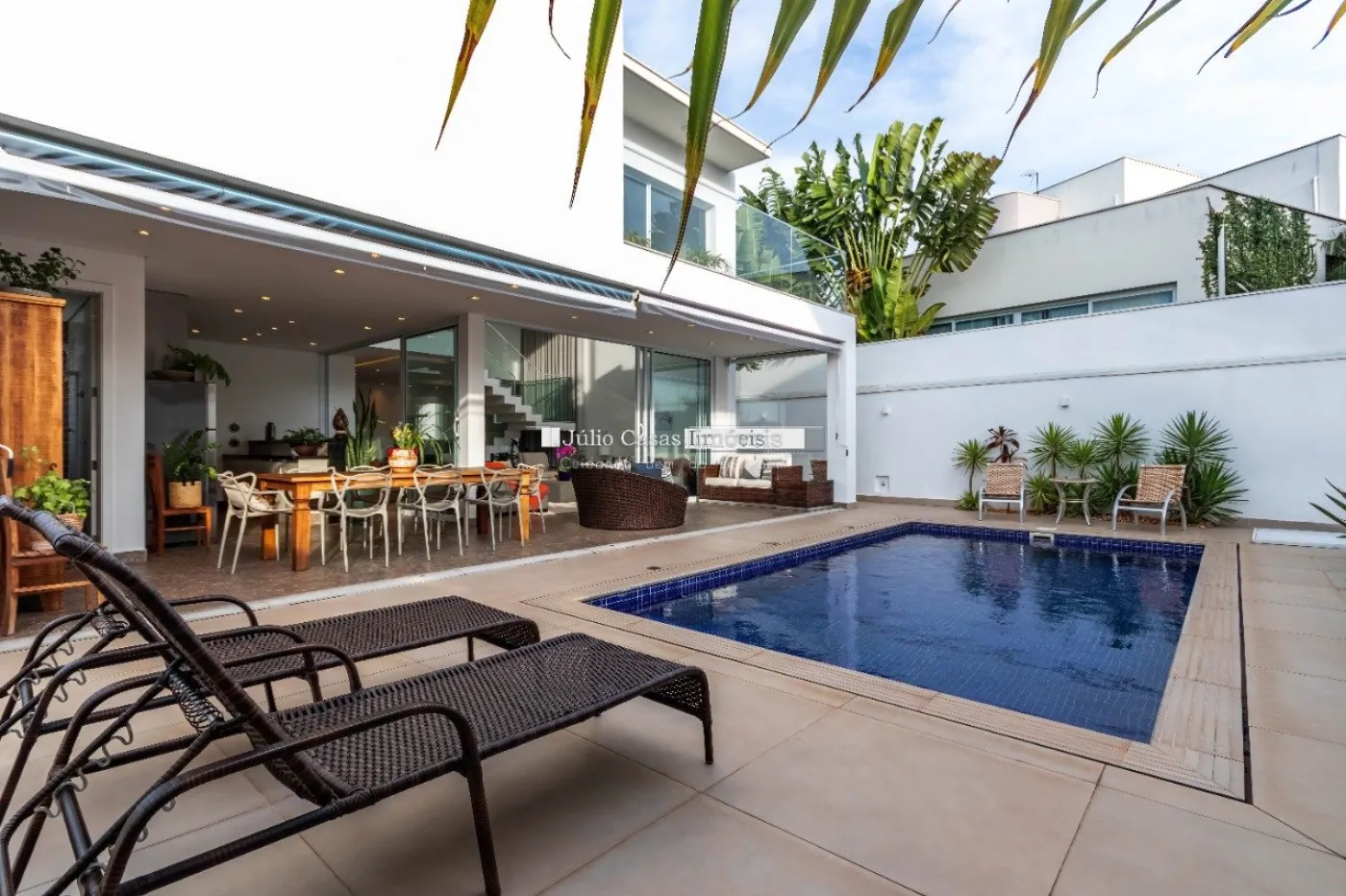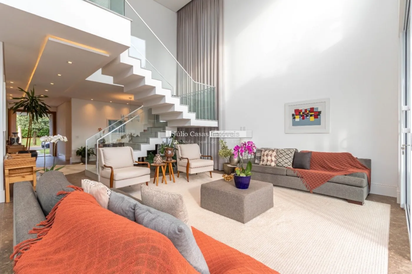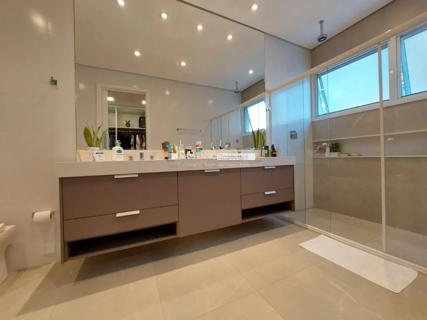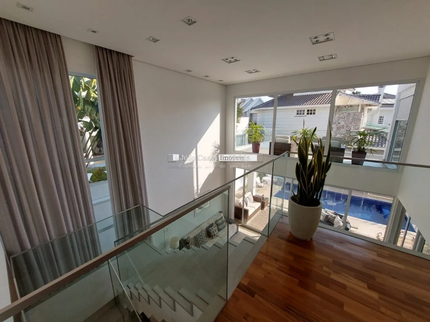 Casa em condomínio, com um térreo que inclui um hall de entrada, lavabo com cuba esculpida e uma suíte ampla. A sala de dois ambientes possui pé direito alto e se integra à área gourmet, que é fechada com vidro temperado. O quintal é equipado com piscina, banheiro externo e uma cozinha totalmente modulada com despensa. A lavanderia tem uma varanda técnica e a dependência de empregada é completa.