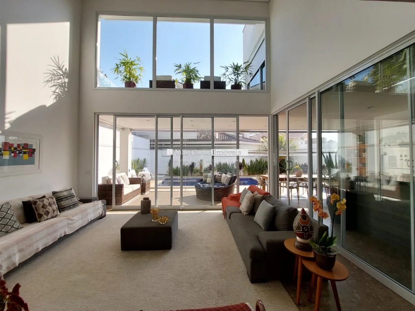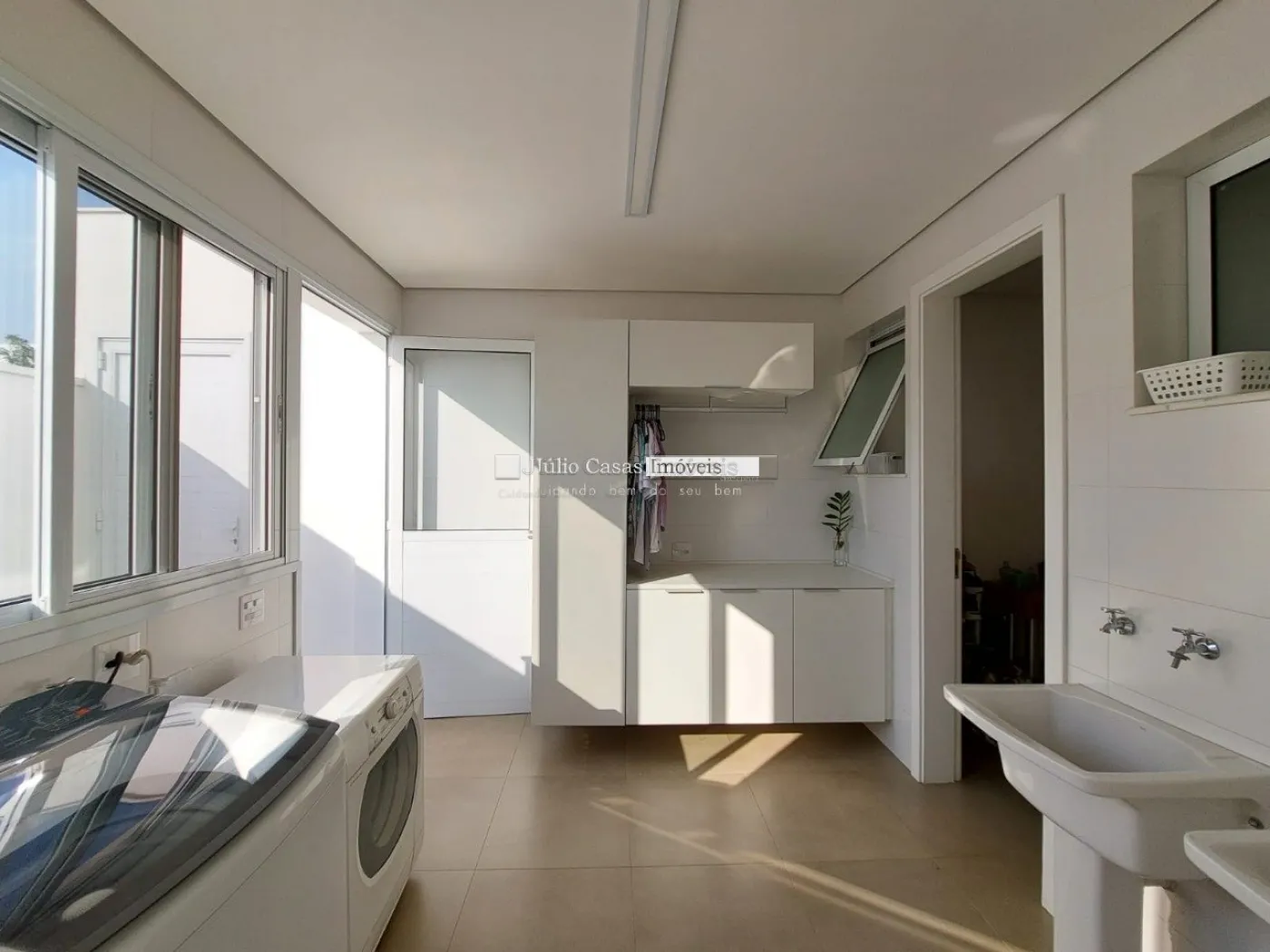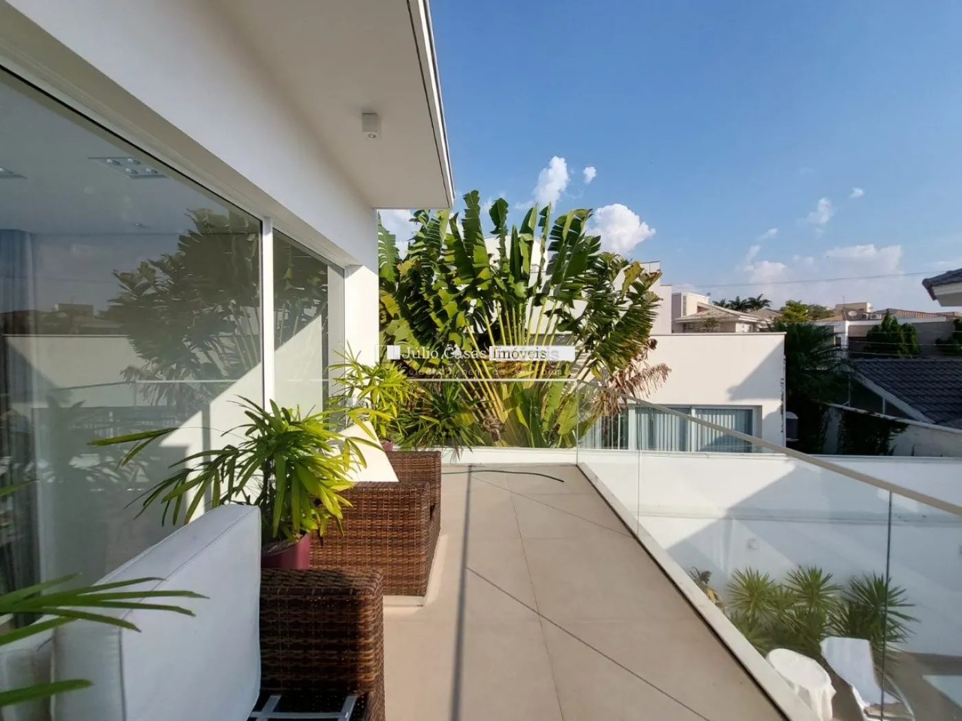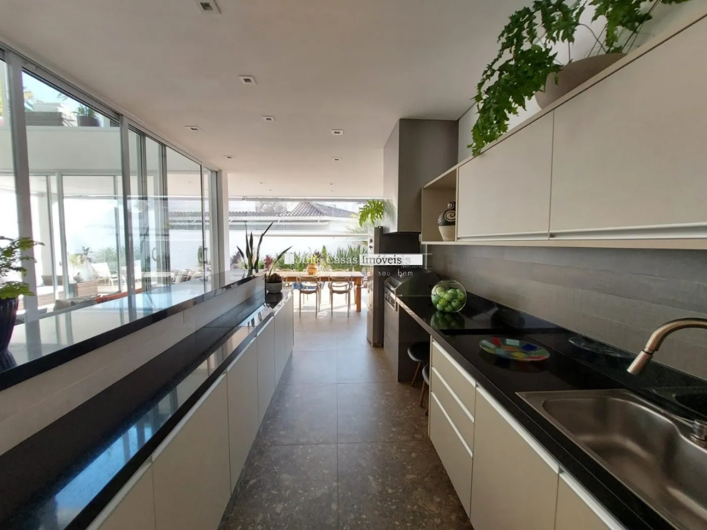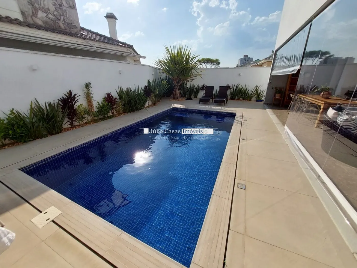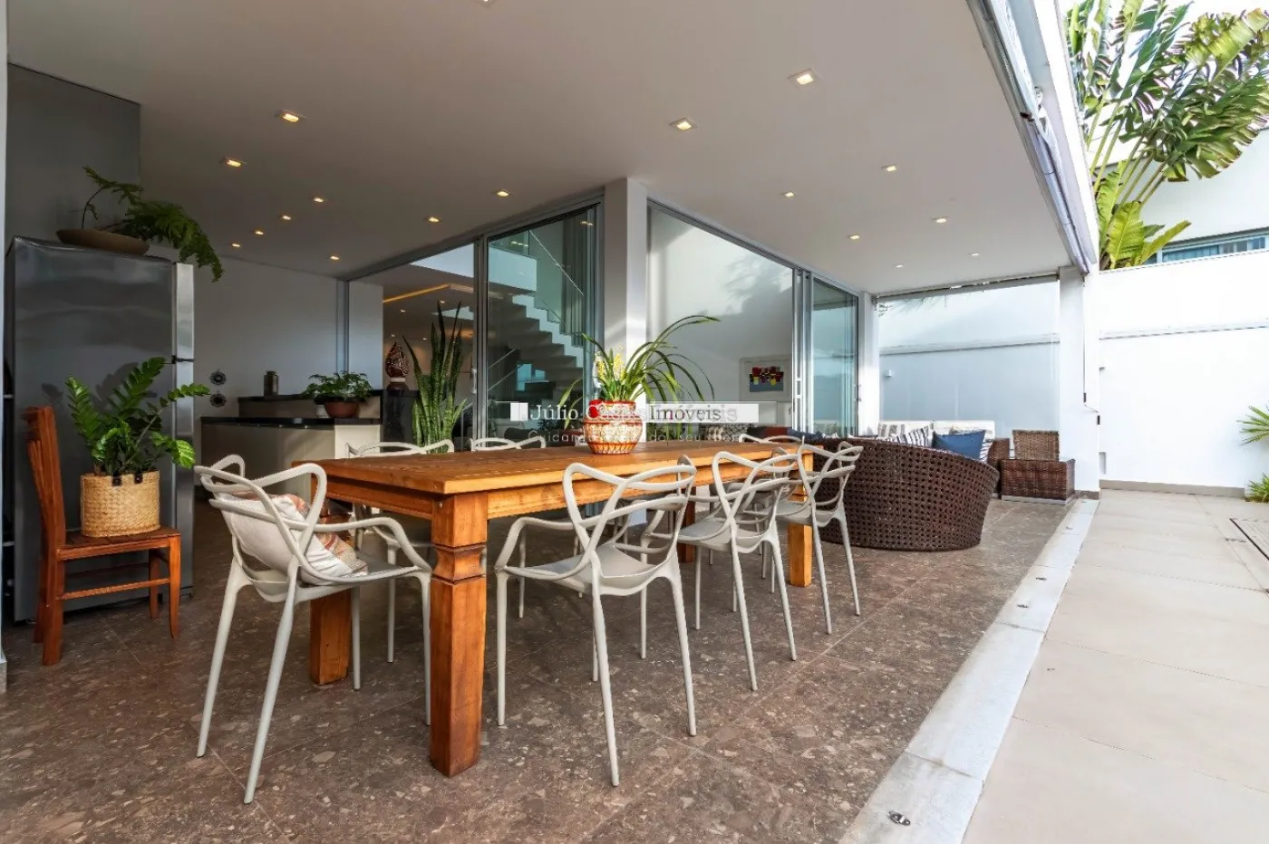 Casa em condomínio, com um térreo que inclui um hall de entrada, lavabo com cuba esculpida e uma suíte ampla. A sala de dois ambientes possui pé direito alto e se integra à área gourmet, que é fechada com vidro temperado. O quintal é equipado com piscina, banheiro externo e uma cozinha totalmente modulada com despensa. A lavanderia tem uma varanda técnica e a dependência de empregada é completa.