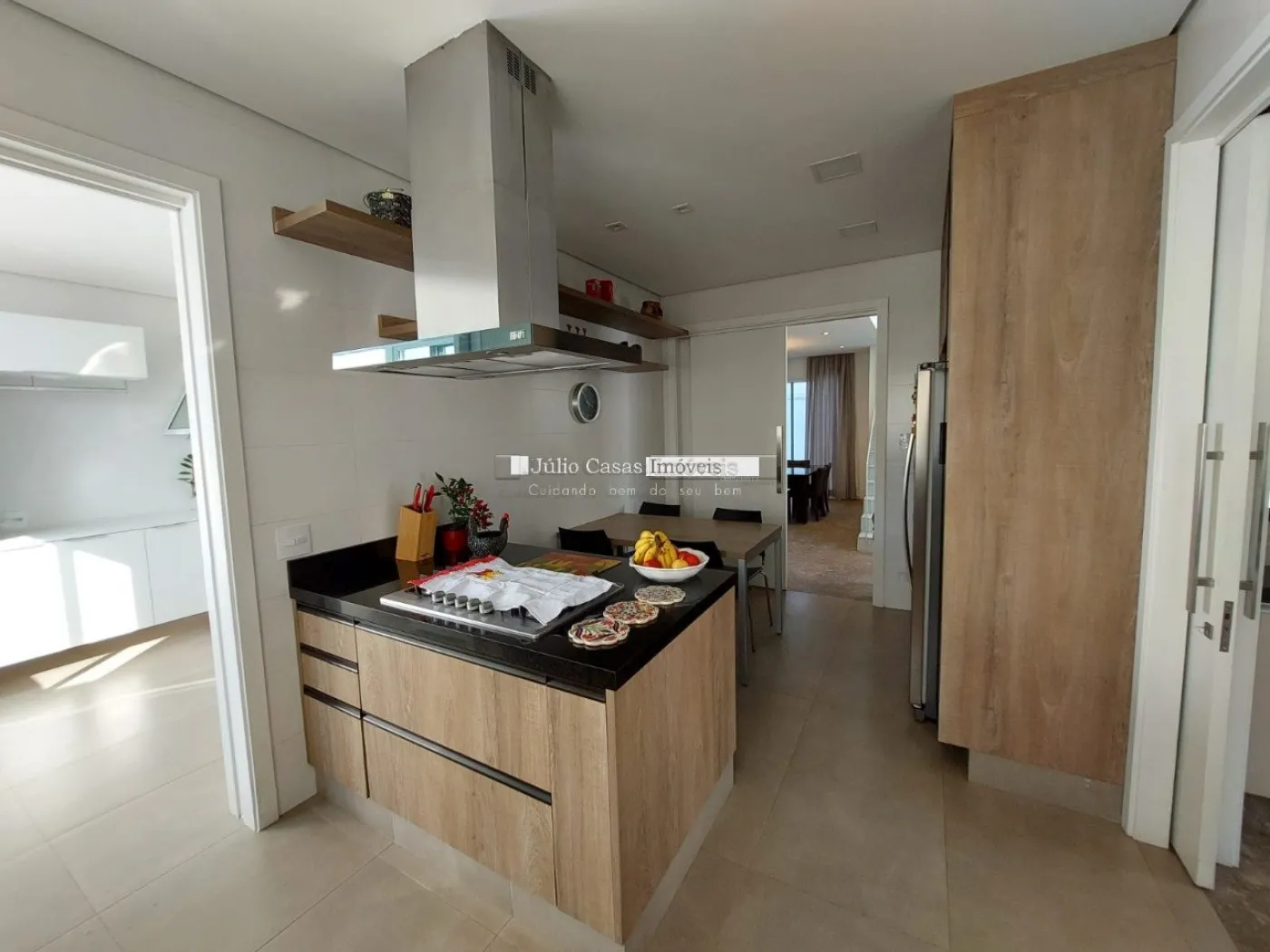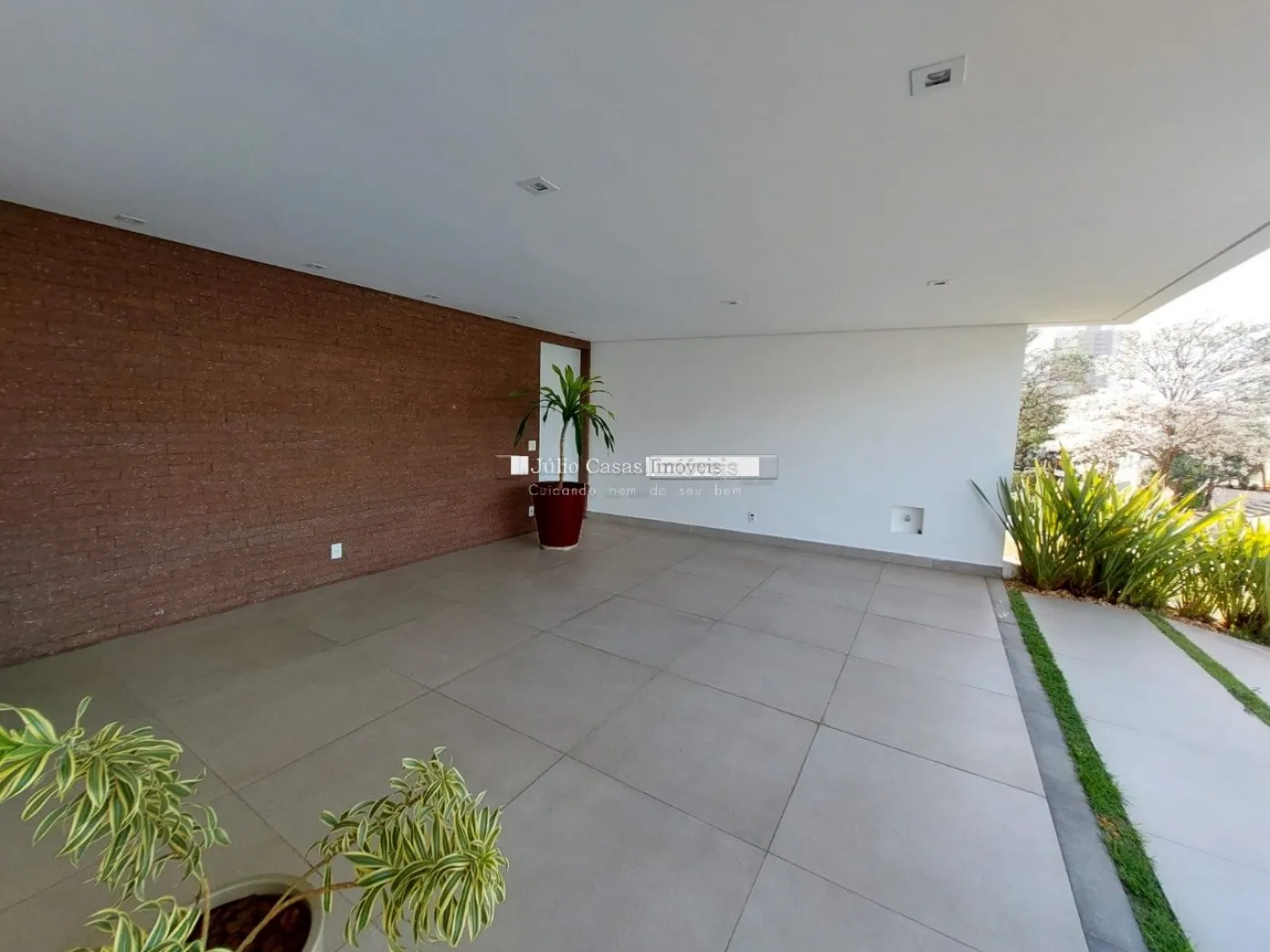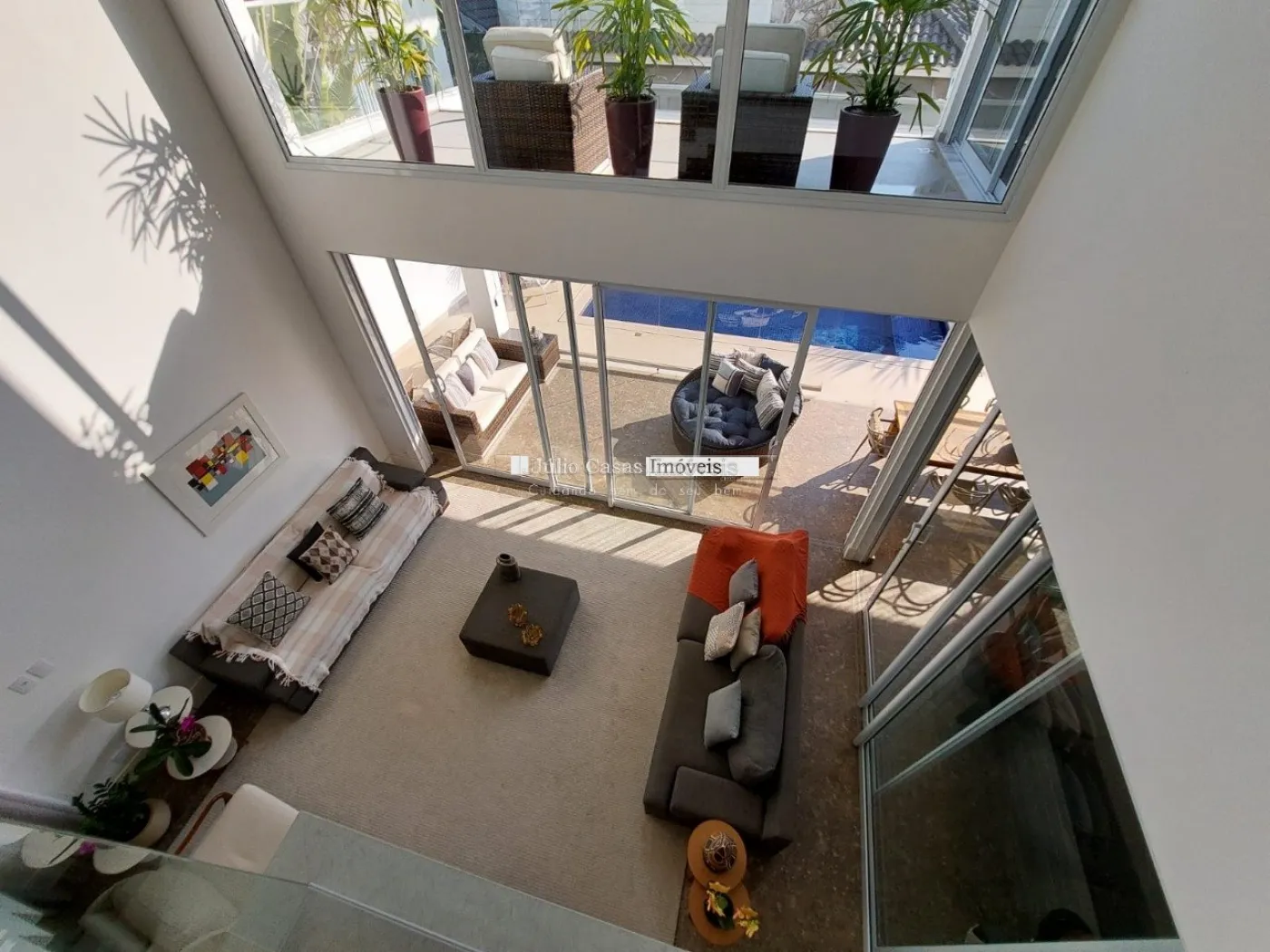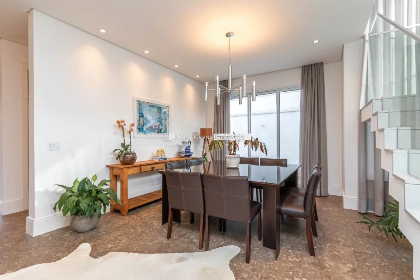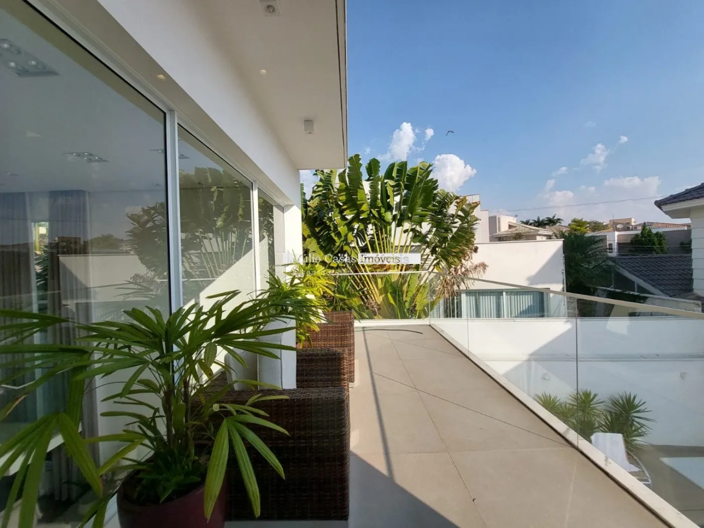 Casa em condomínio, com um térreo que inclui um hall de entrada, lavabo com cuba esculpida e uma suíte ampla. A sala de dois ambientes possui pé direito alto e se integra à área gourmet, que é fechada com vidro temperado. O quintal é equipado com piscina, banheiro externo e uma cozinha totalmente modulada com despensa. A lavanderia tem uma varanda técnica e a dependência de empregada é completa.