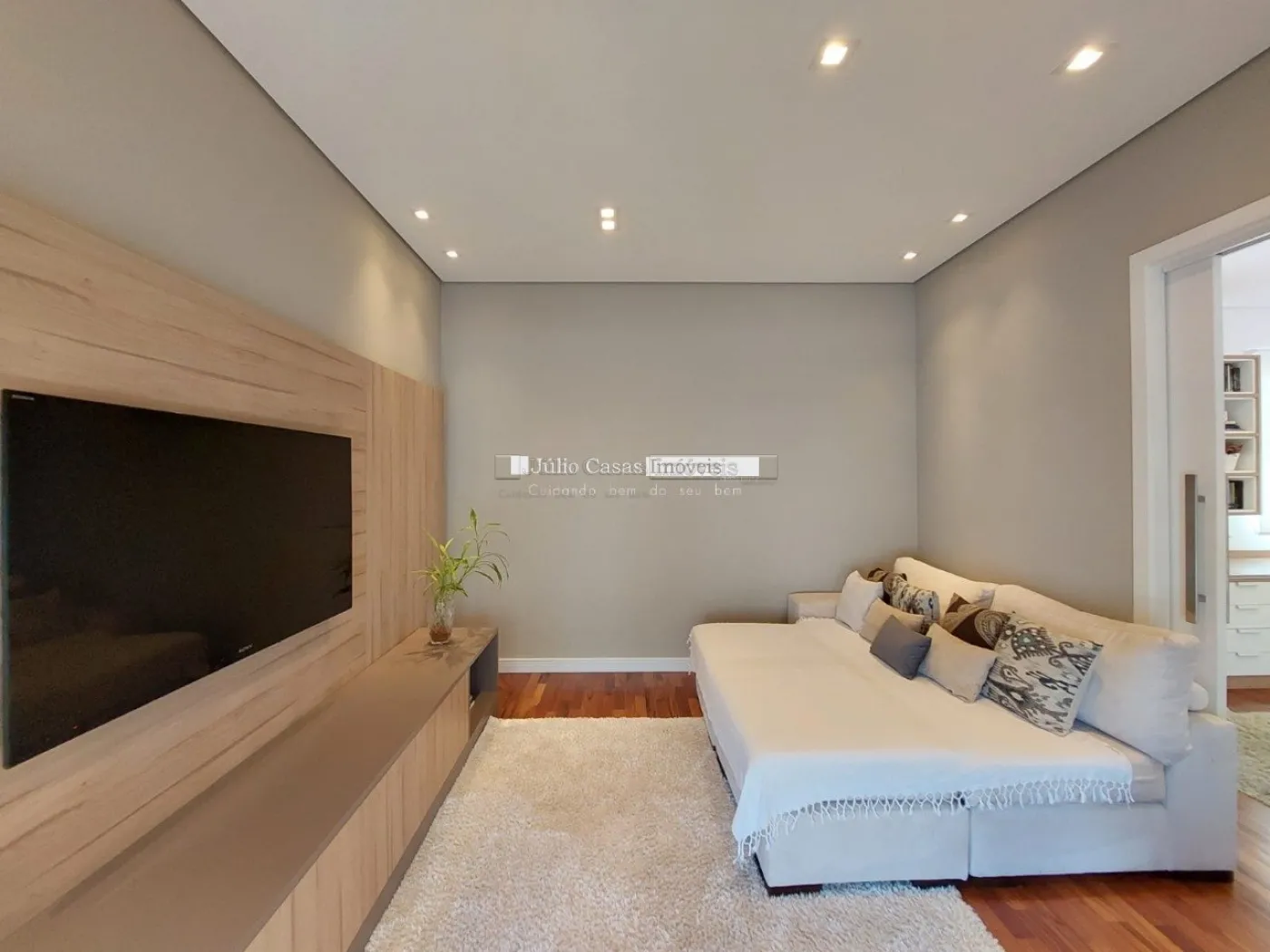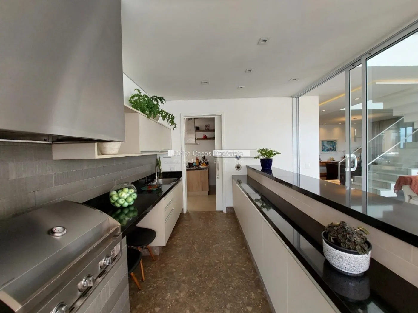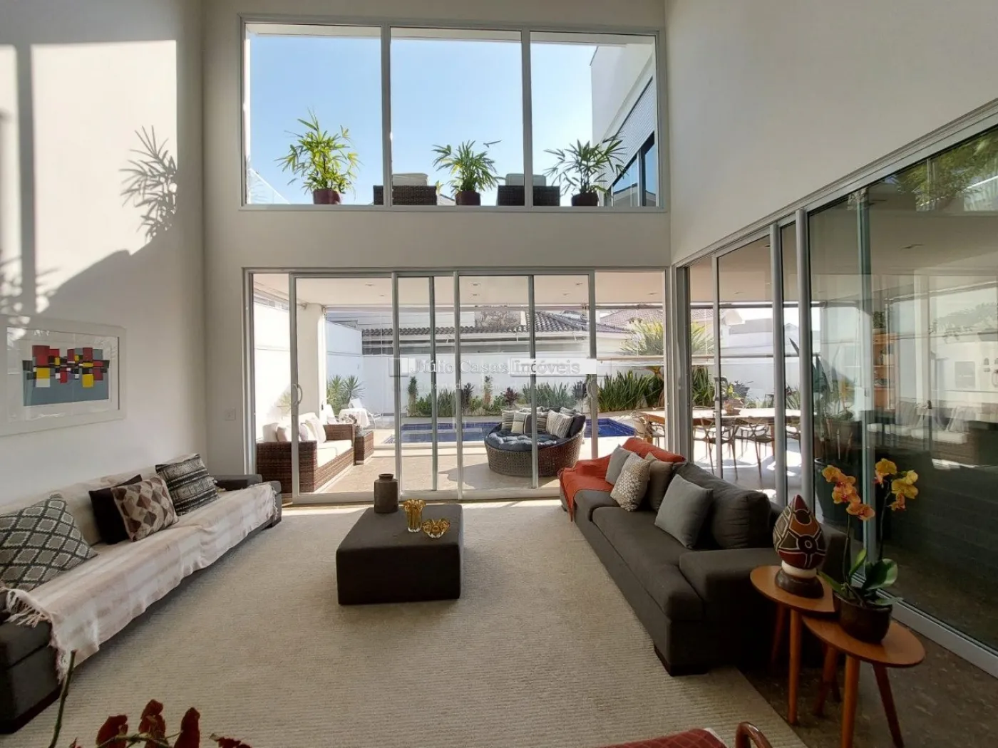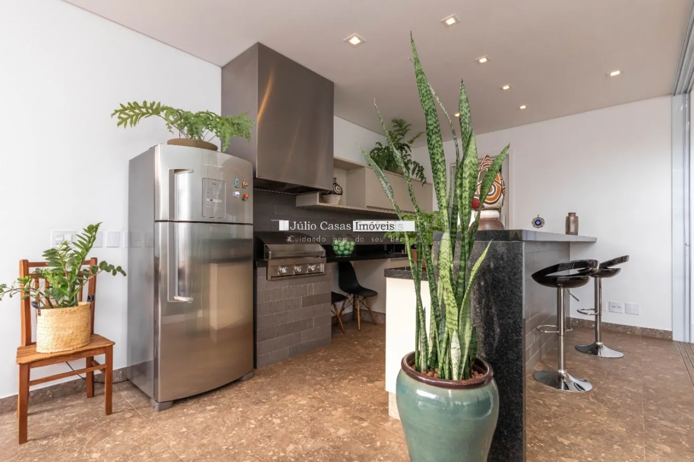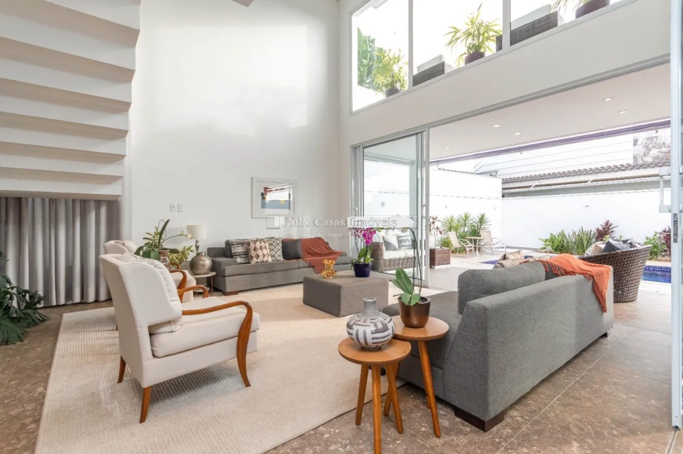 Casa em condomínio, com um térreo que inclui um hall de entrada, lavabo com cuba esculpida e uma suíte ampla. A sala de dois ambientes possui pé direito alto e se integra à área gourmet, que é fechada com vidro temperado. O quintal é equipado com piscina, banheiro externo e uma cozinha totalmente modulada com despensa. A lavanderia tem uma varanda técnica e a dependência de empregada é completa.