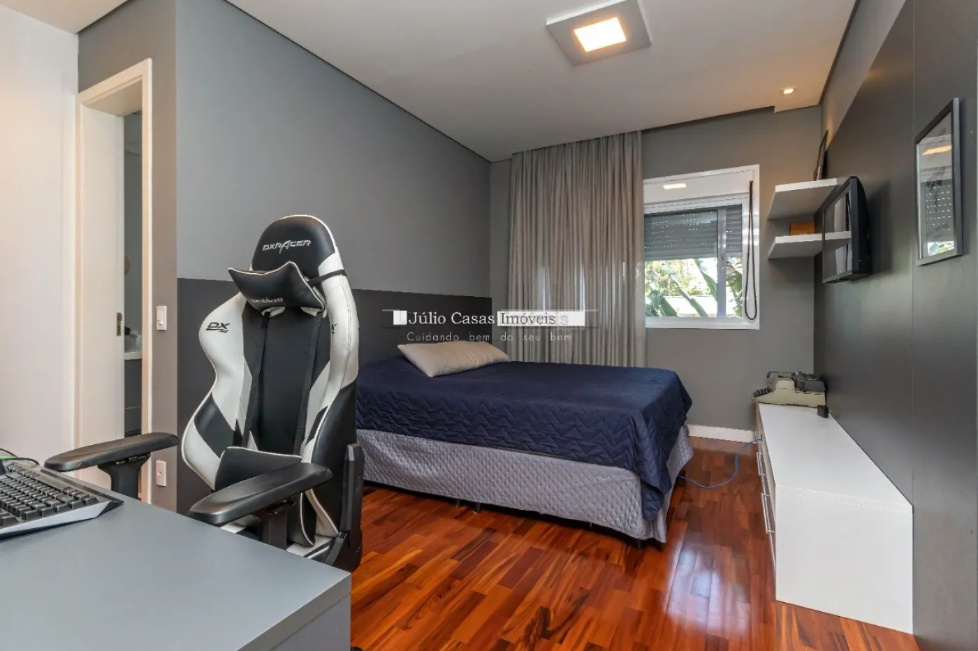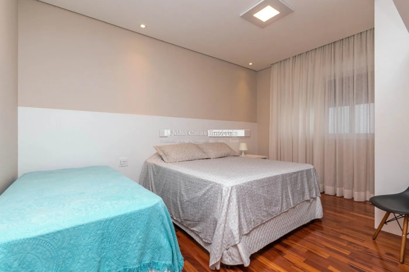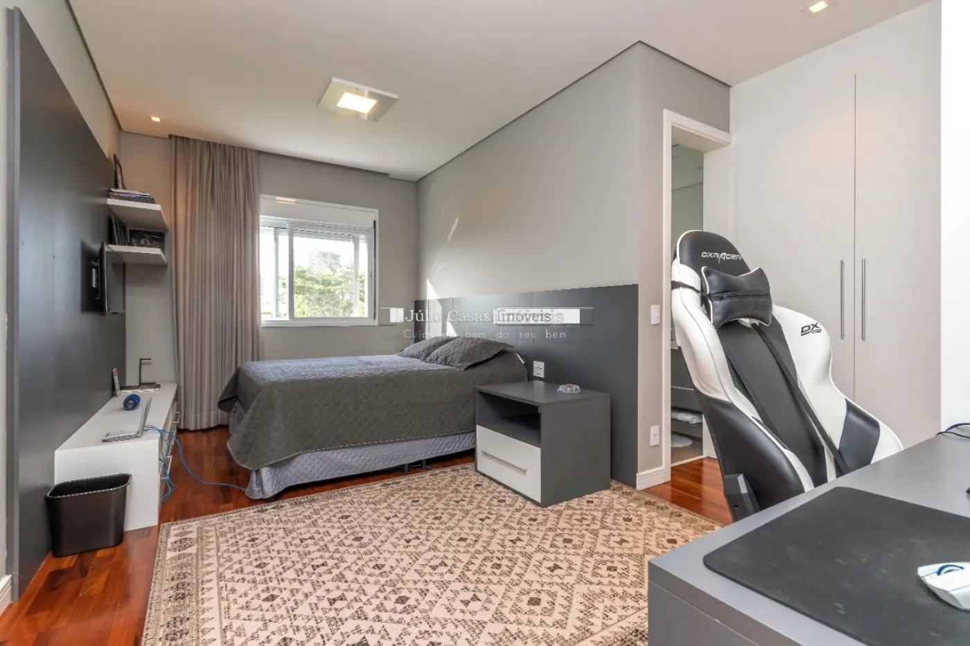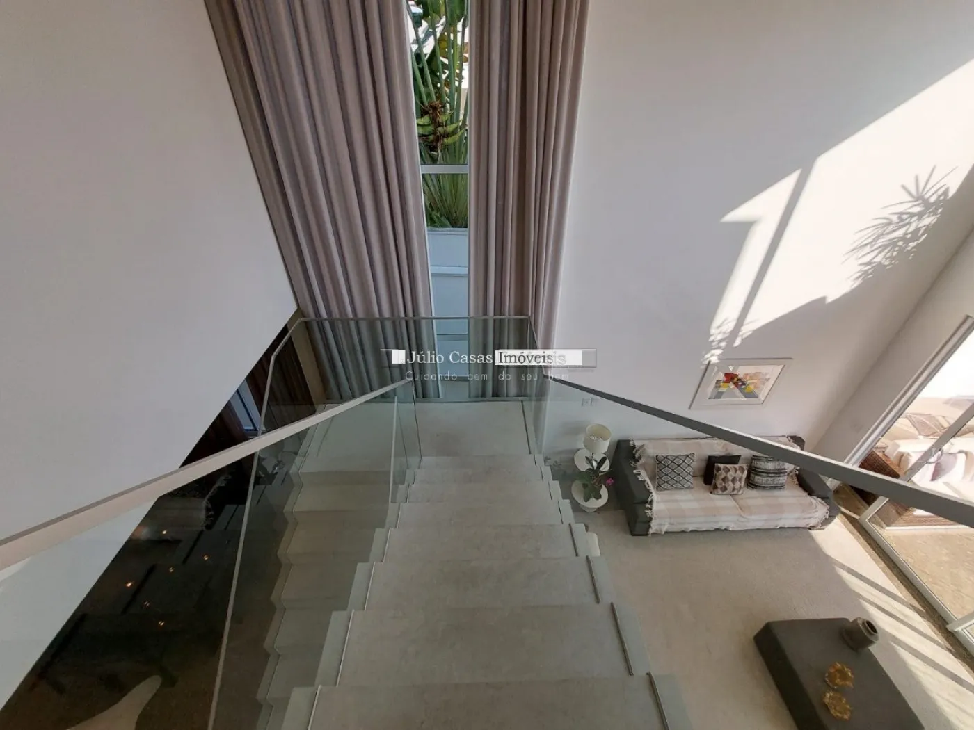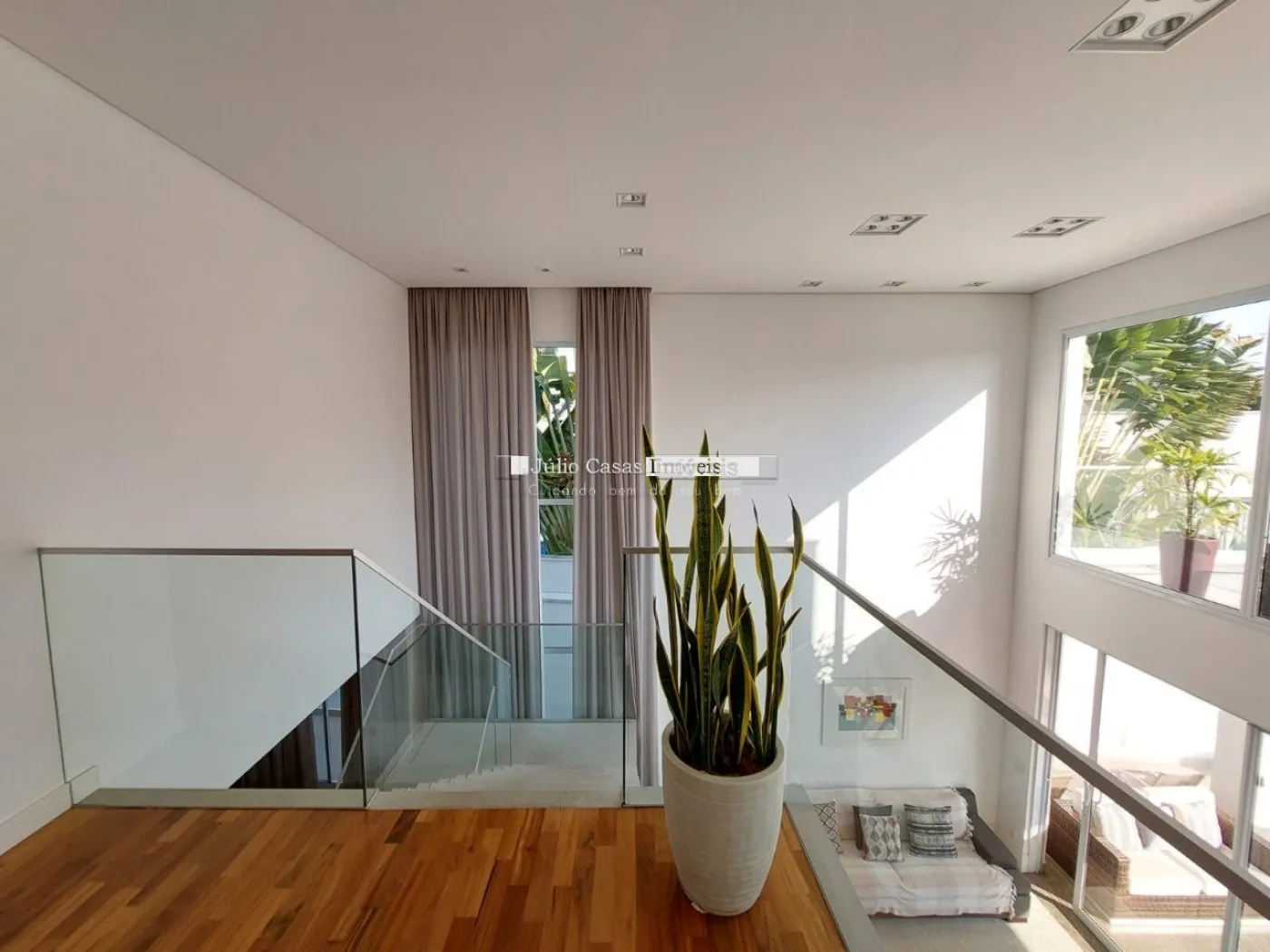 No andar superior, há três suítes amplas, sendo uma máster, além de uma ampla varanda, escritório e home theater com varanda. Todos os ambientes são modulados, com dormitórios em piso de madeira e os demais ambientes em porcelanato. A casa conta com seis vagas de garagem, sendo três cobertas.