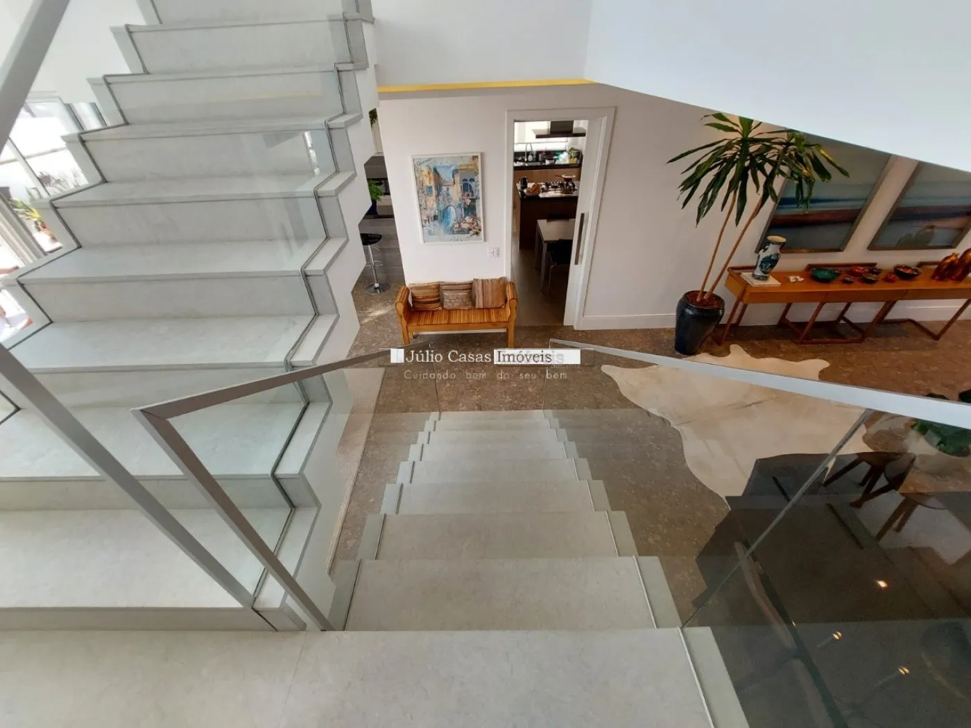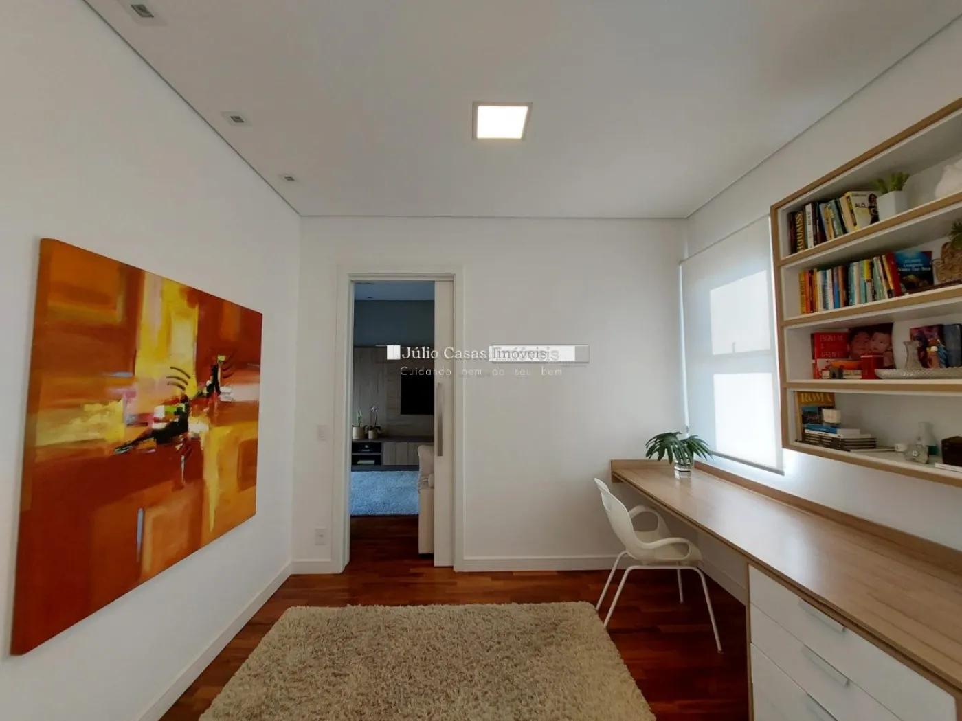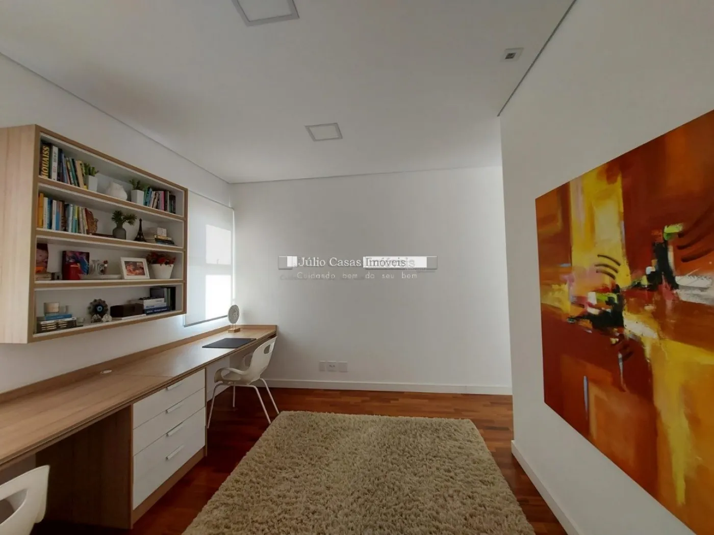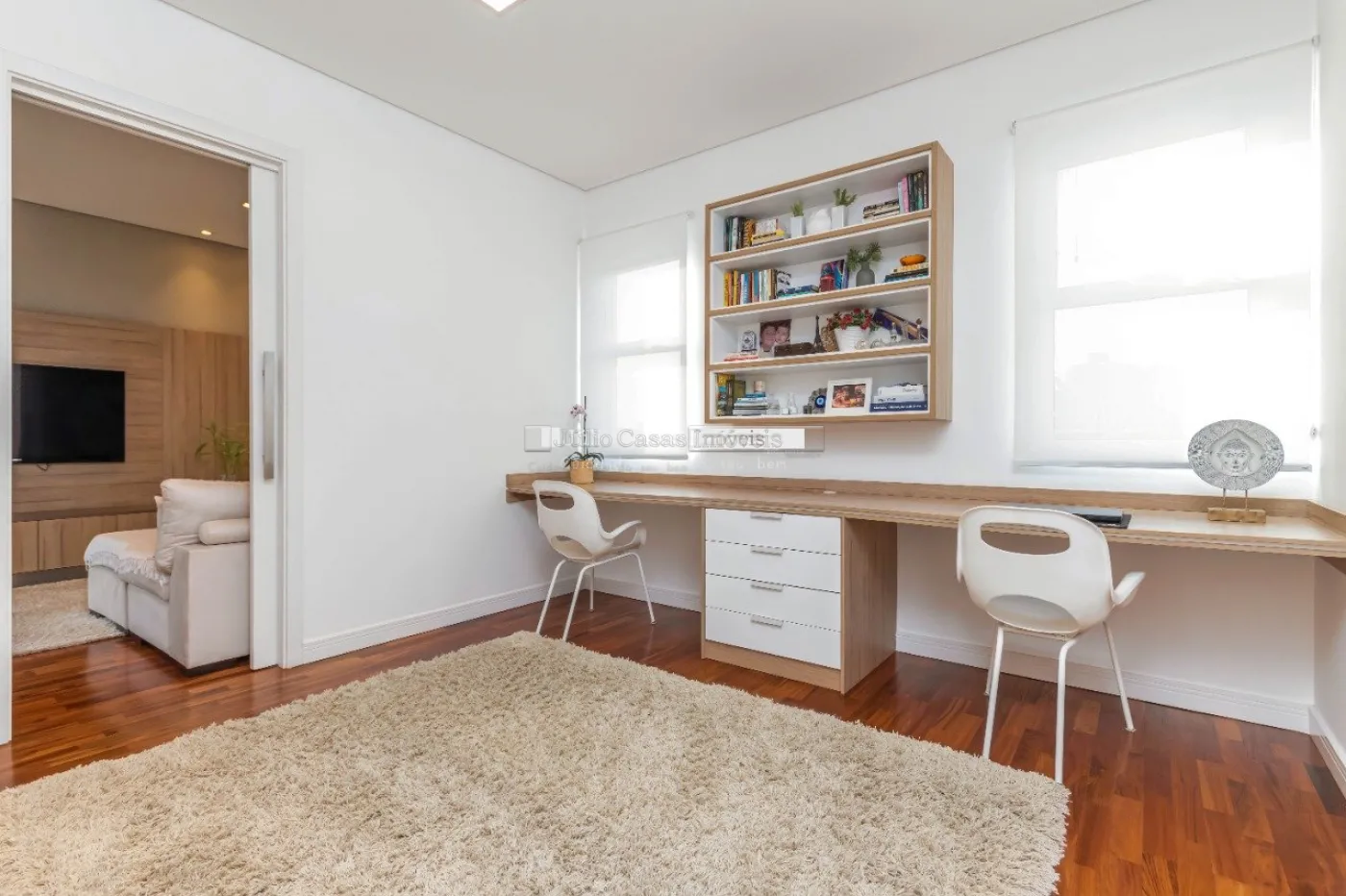No andar superior, há três suítes amplas, sendo uma máster, além de uma ampla varanda, escritório e home theater com varanda. Todos os ambientes são modulados, com dormitórios em piso de madeira e os demais ambientes em porcelanato. A casa conta com seis vagas de garagem, sendo três cobertas.