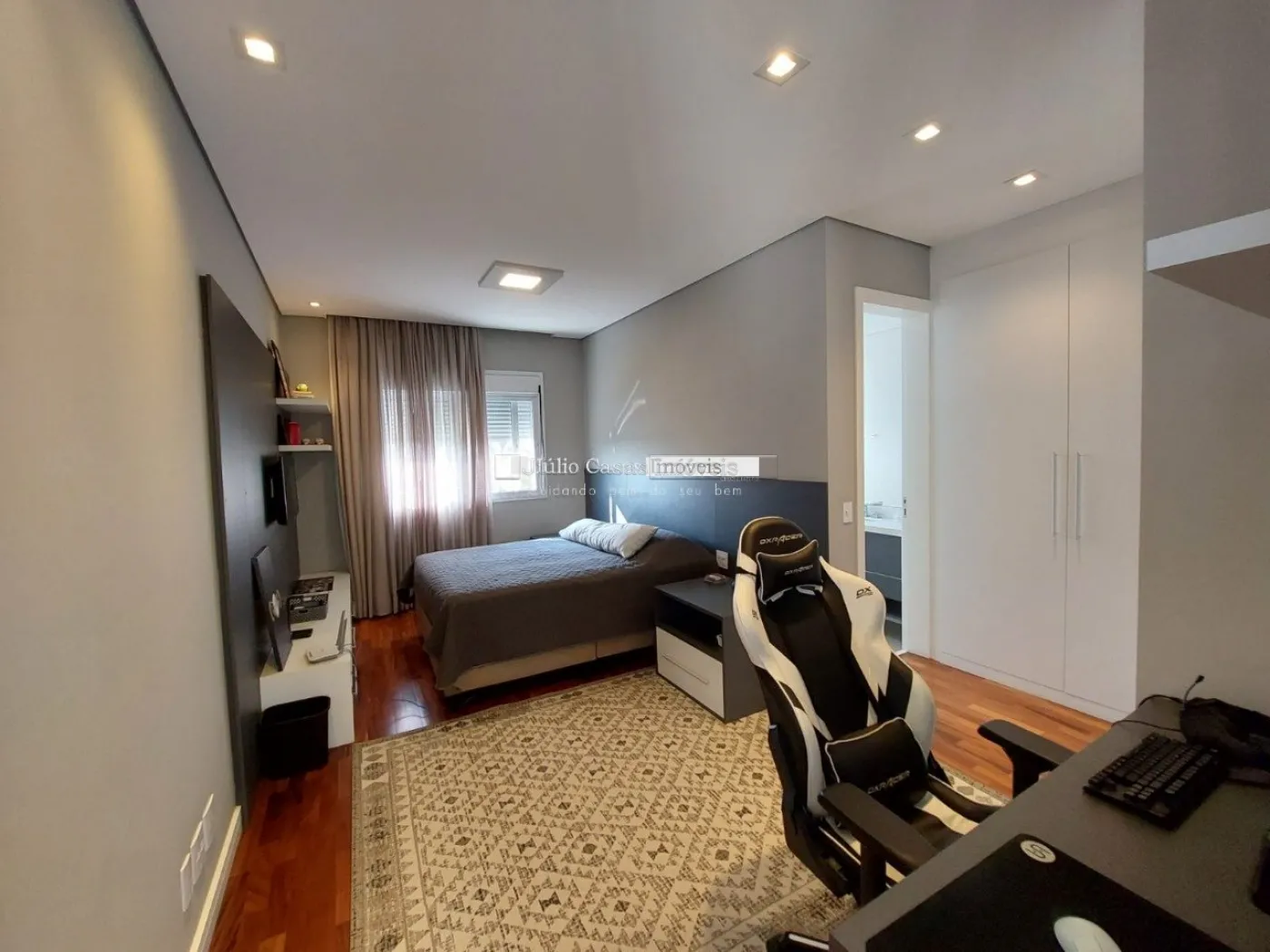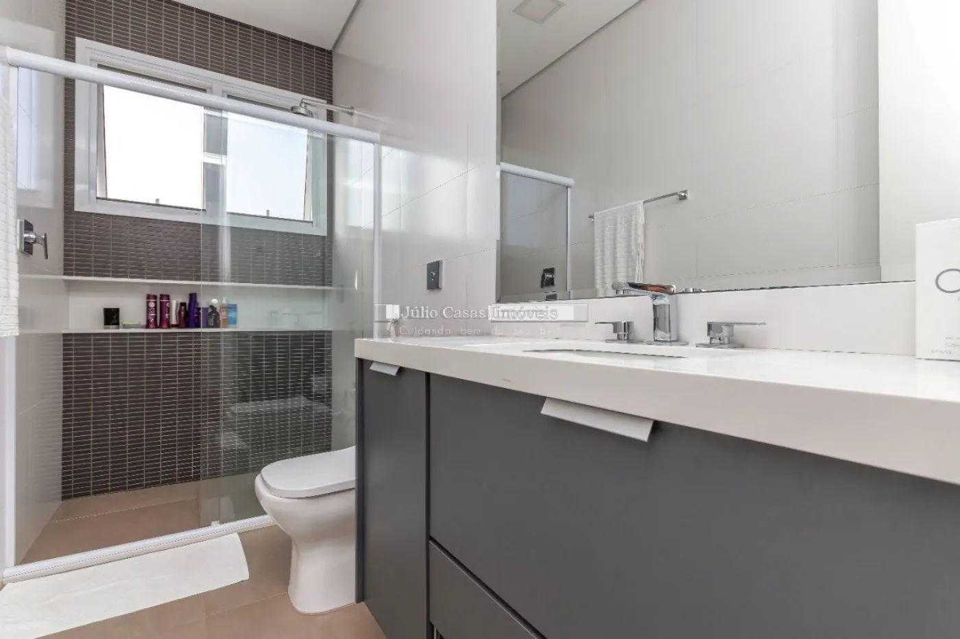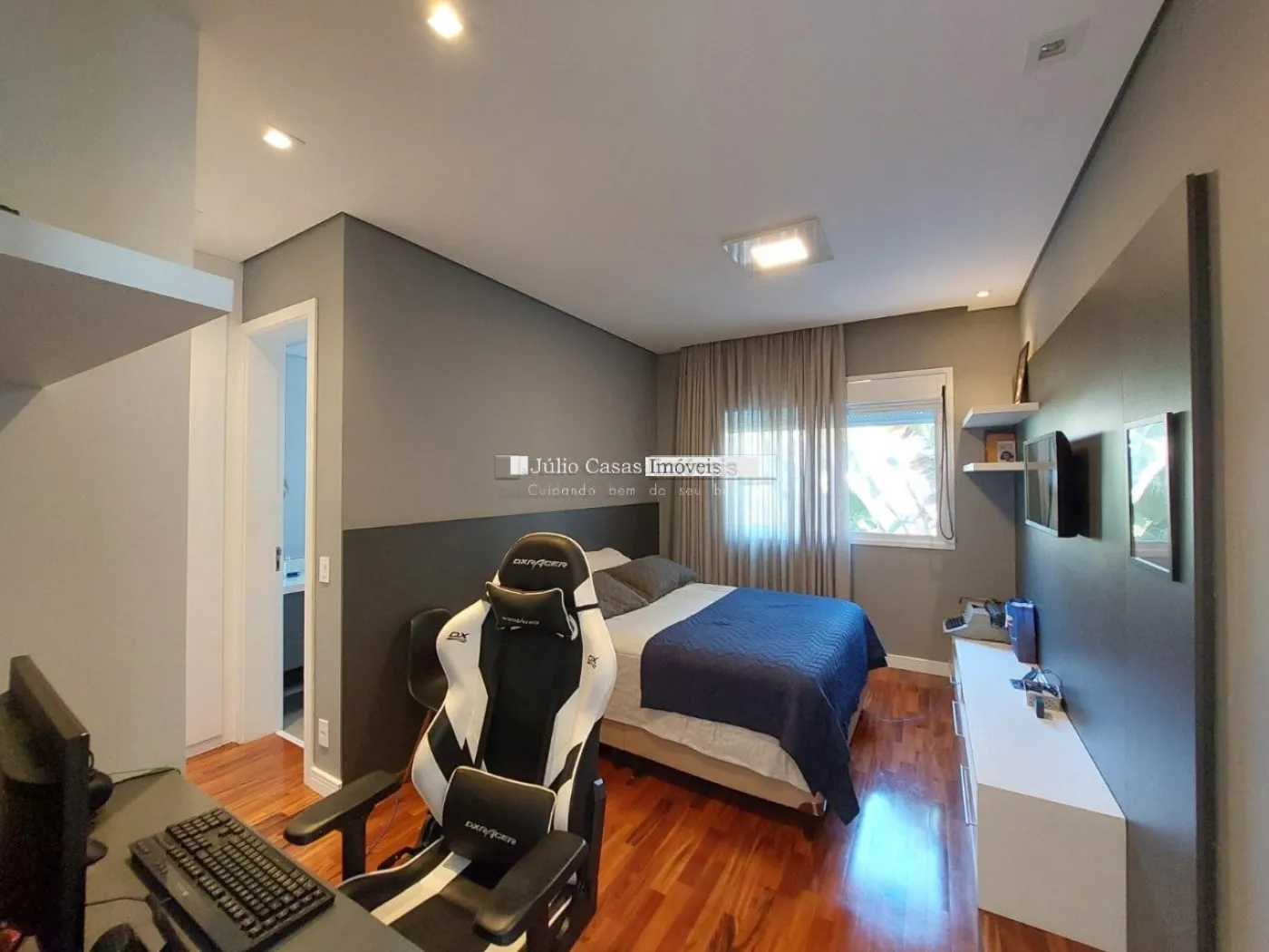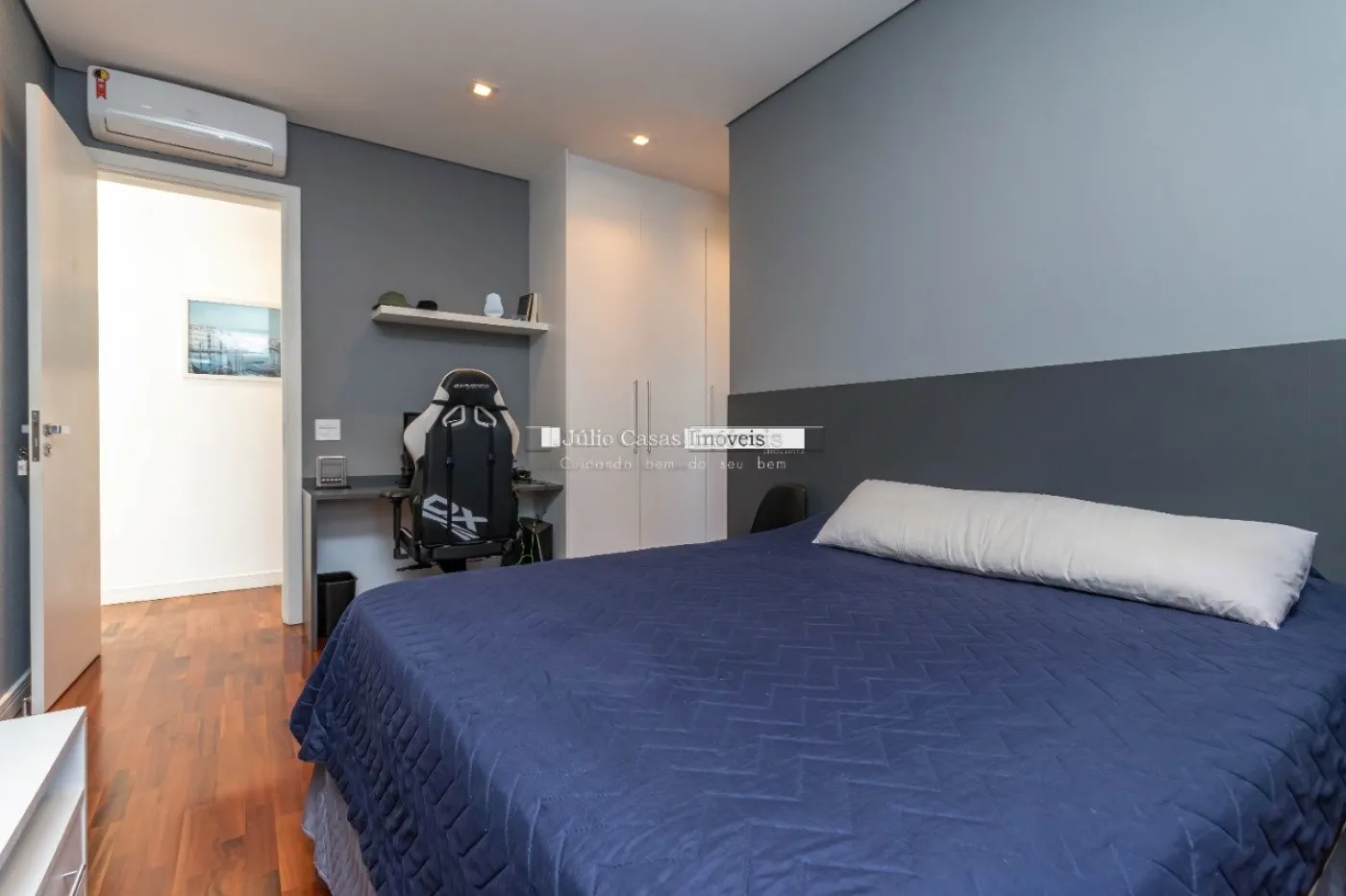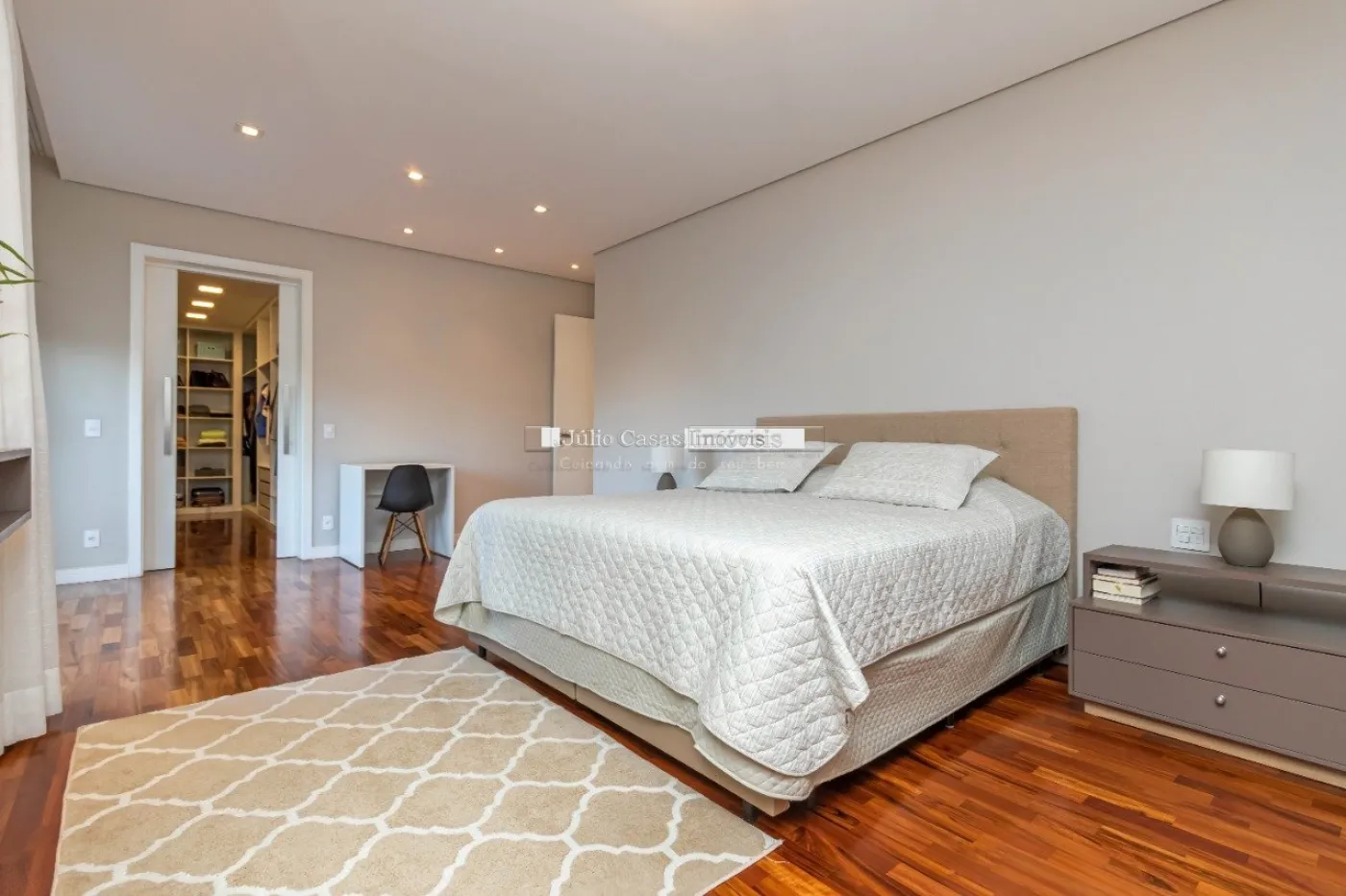 No andar superior, há três suítes amplas, sendo uma máster, além de uma ampla varanda, escritório e home theater com varanda. Todos os ambientes são modulados, com dormitórios em piso de madeira e os demais ambientes em porcelanato. A casa conta com seis vagas de garagem, sendo três cobertas.