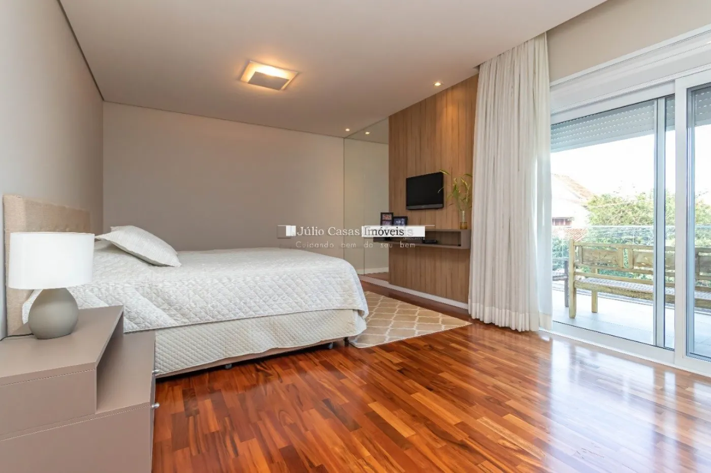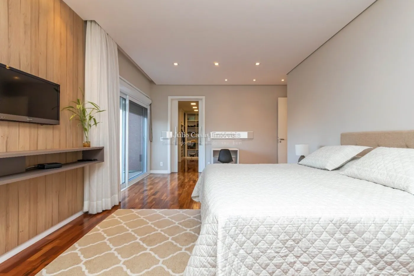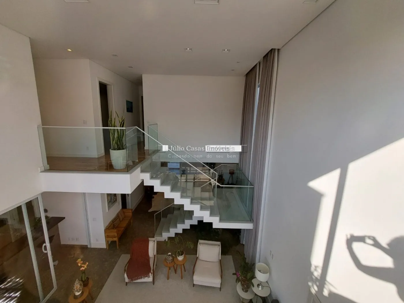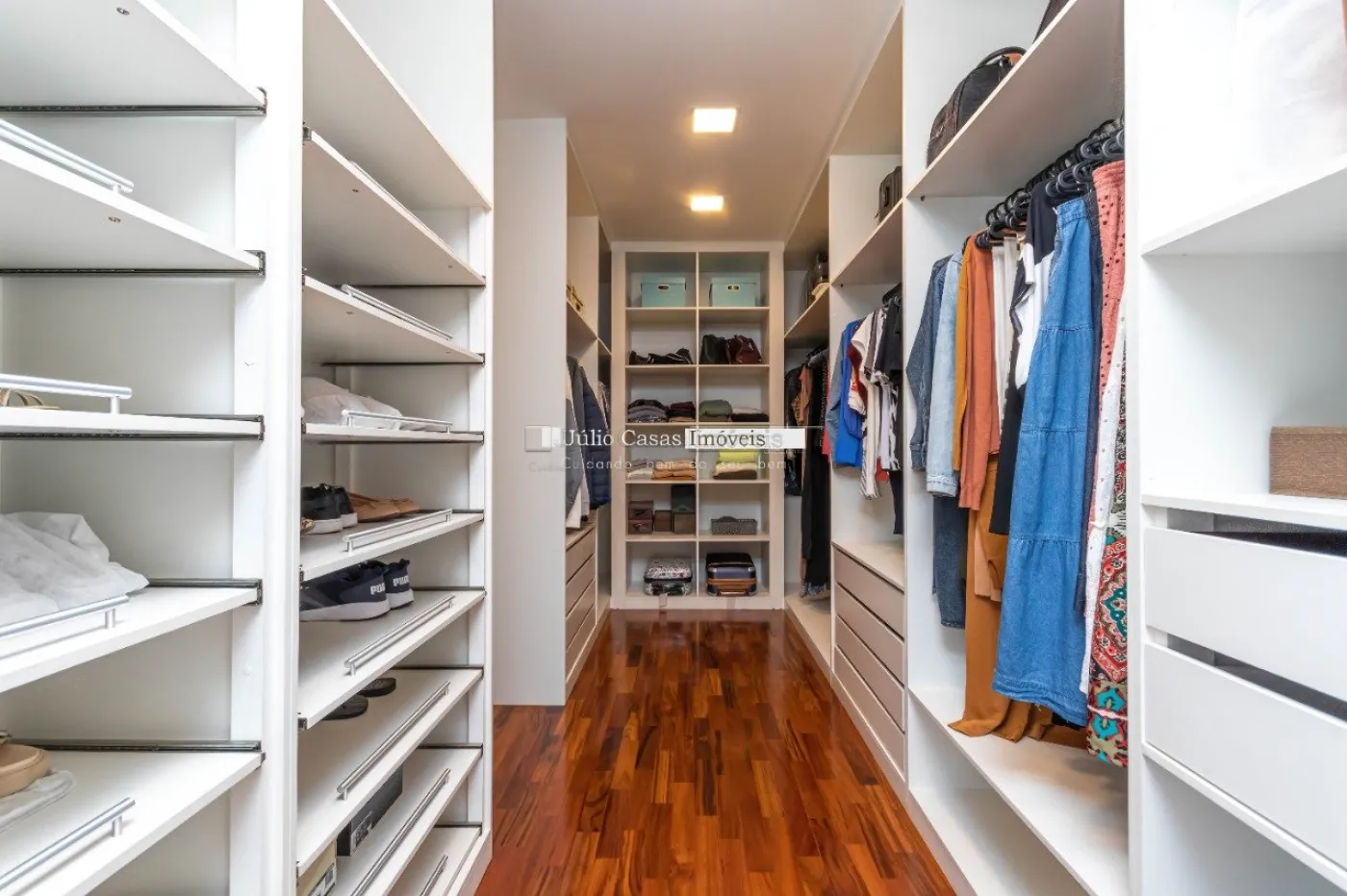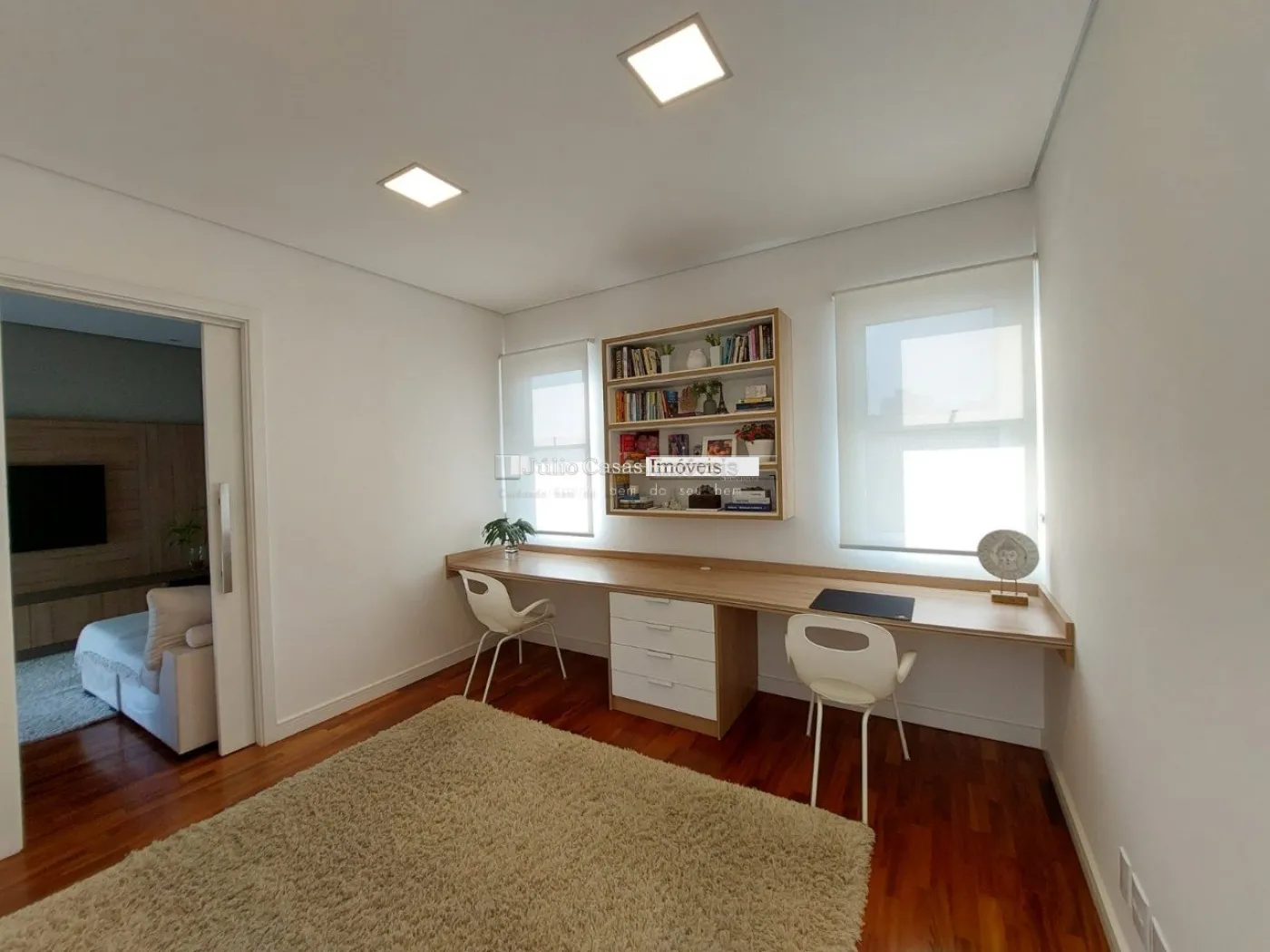 No andar superior, há três suítes amplas, sendo uma máster, além de uma ampla varanda, escritório e home theater com varanda. Todos os ambientes são modulados, com dormitórios em piso de madeira e os demais ambientes em porcelanato. A casa conta com seis vagas de garagem, sendo três cobertas.