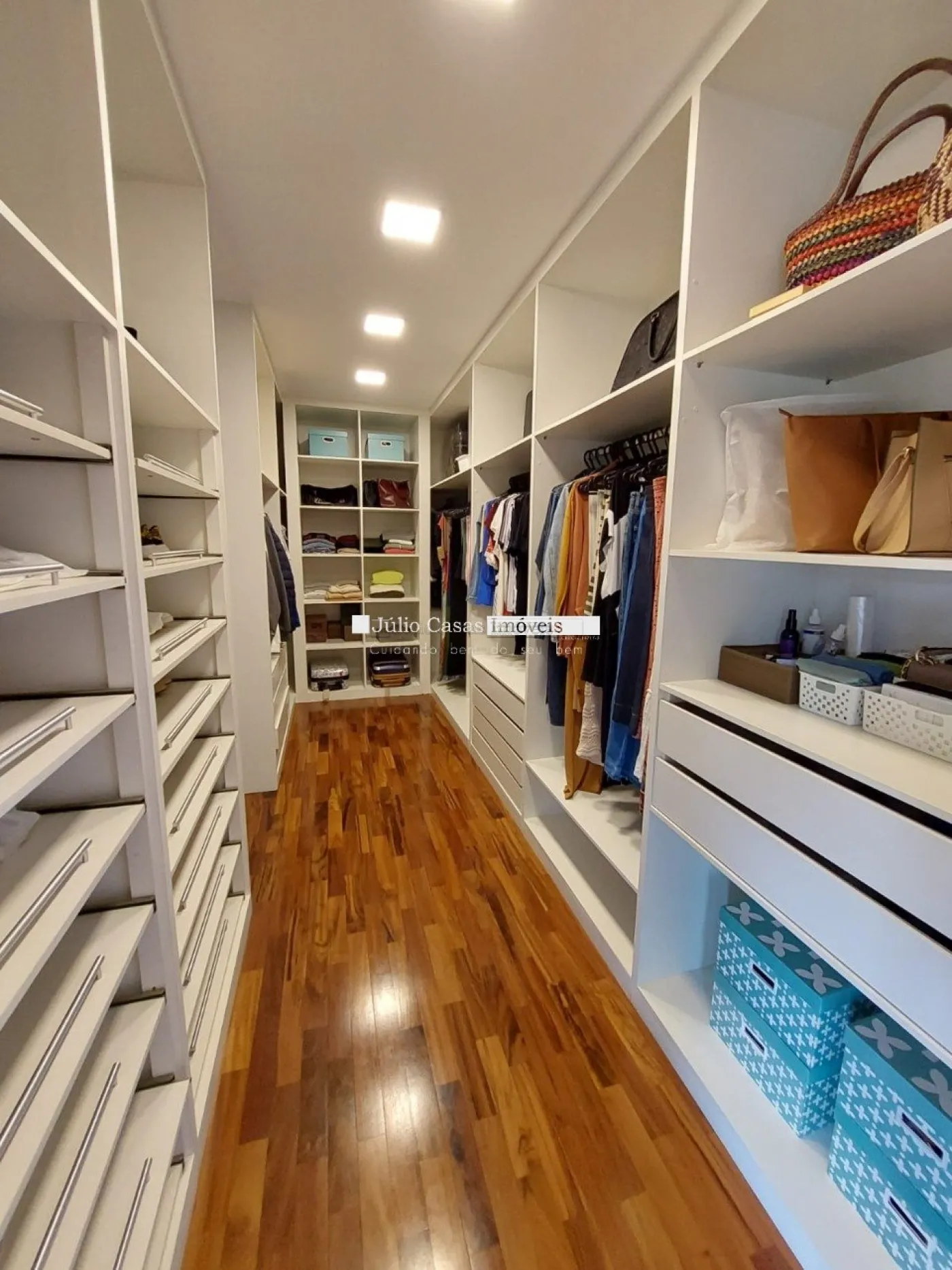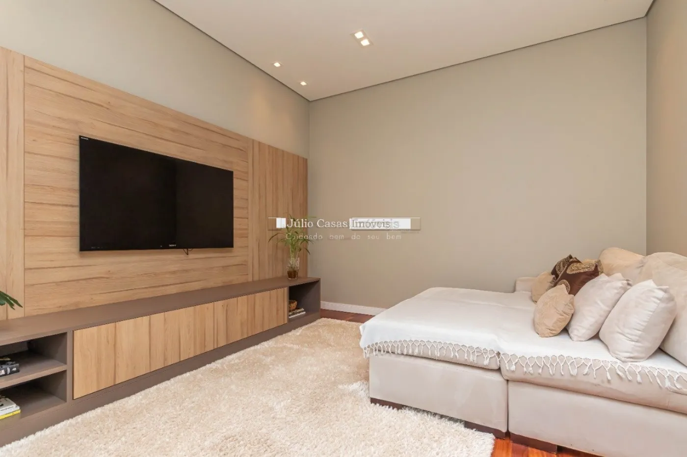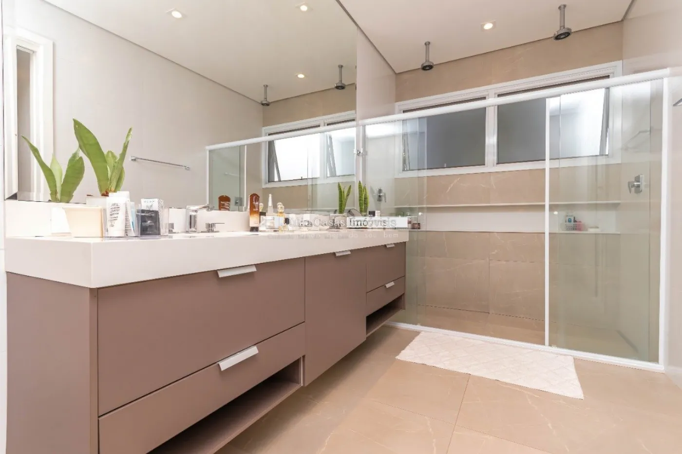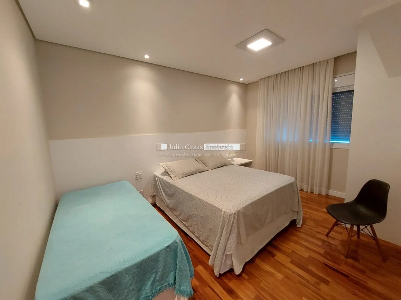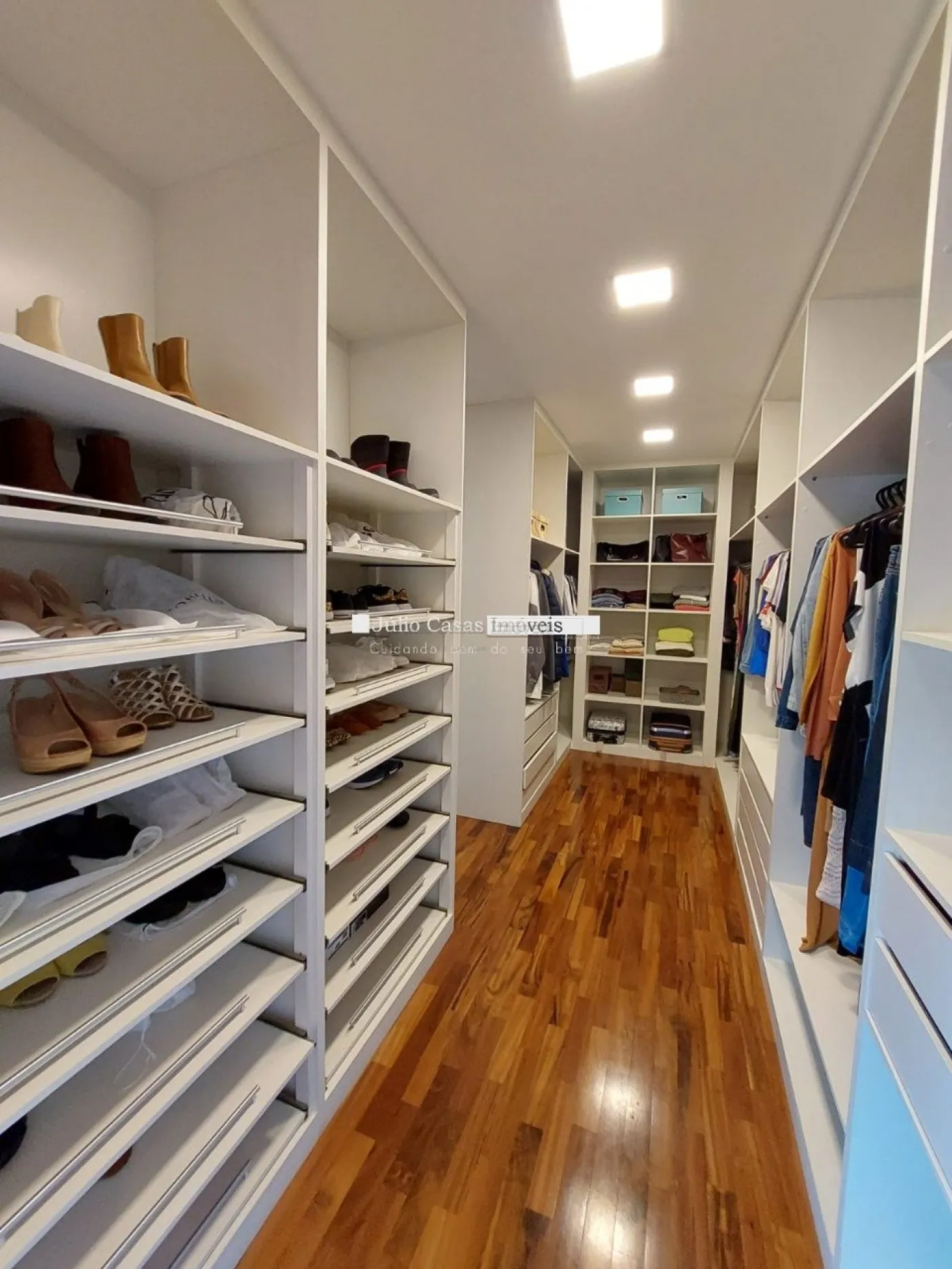 No andar superior, há três suítes amplas, sendo uma máster, além de uma ampla varanda, escritório e home theater com varanda. Todos os ambientes são modulados, com dormitórios em piso de madeira e os demais ambientes em porcelanato. A casa conta com seis vagas de garagem, sendo três cobertas.