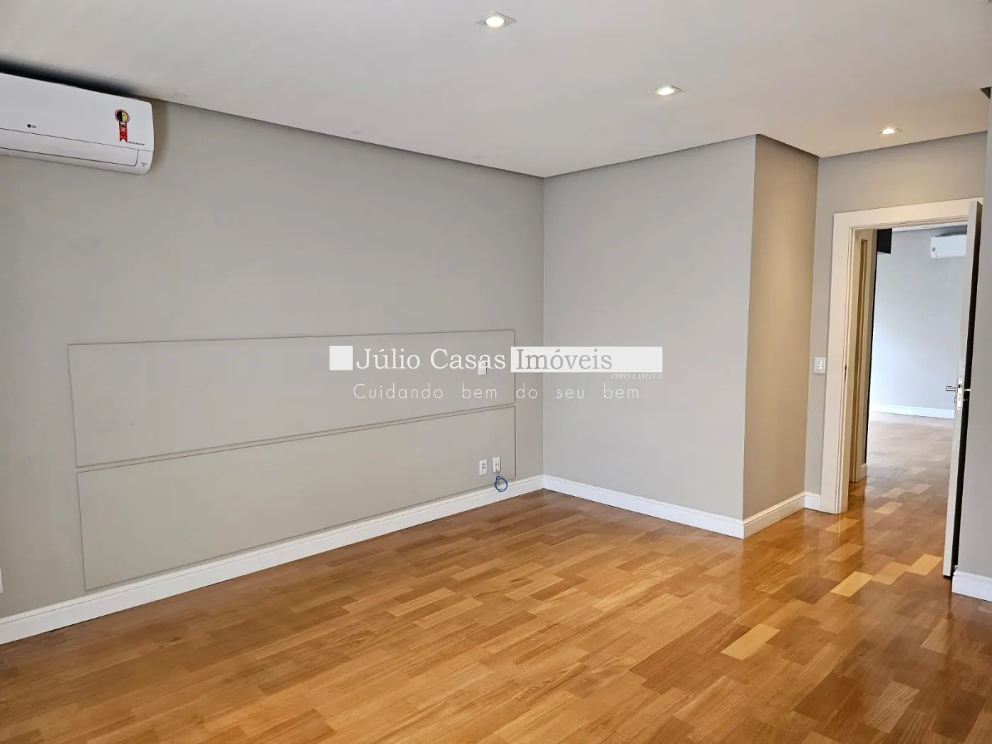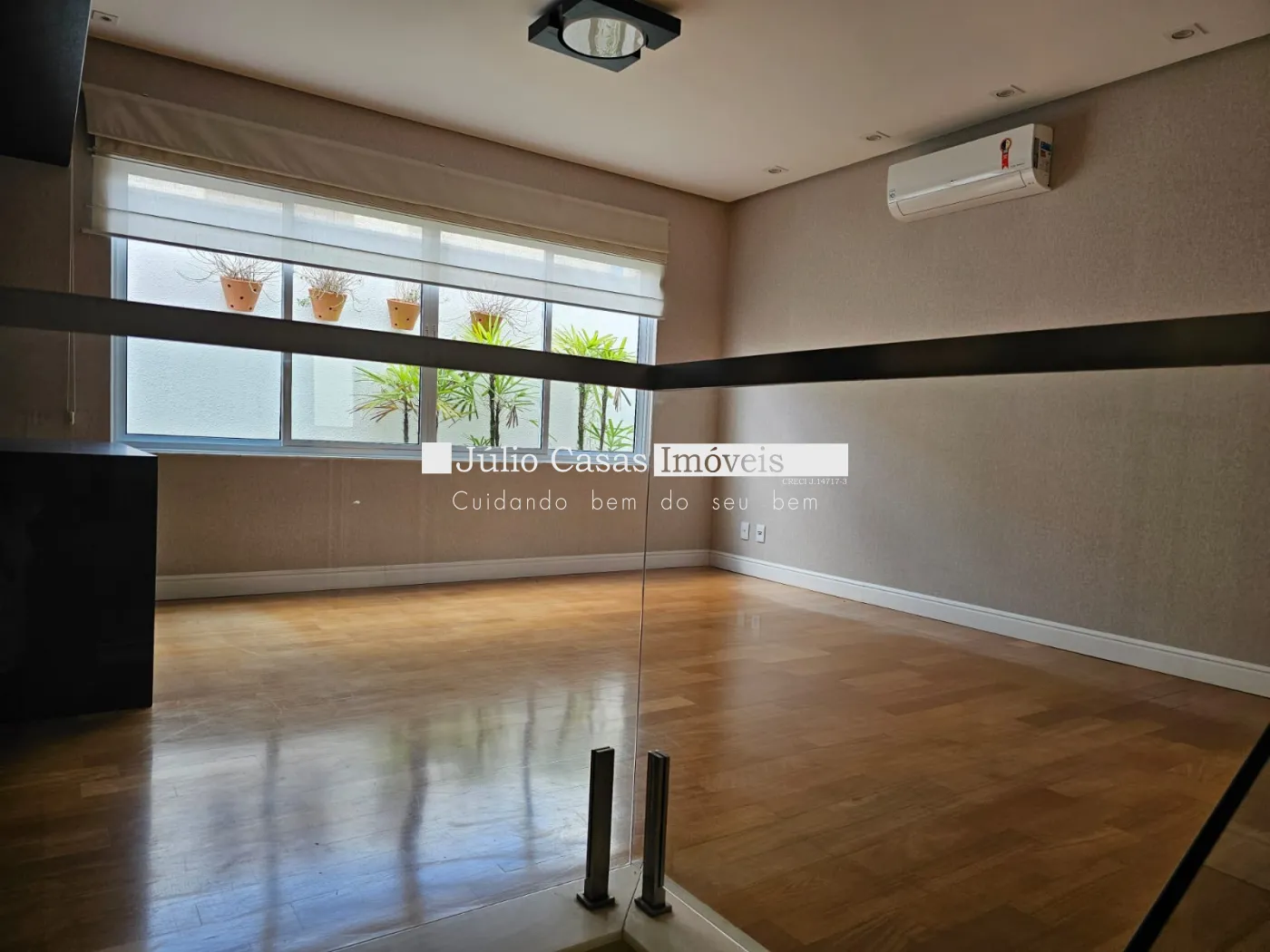 - Piso superior revestido em madeira, com uma ampla sala de home theater e um escritório mobiliado sob medida.