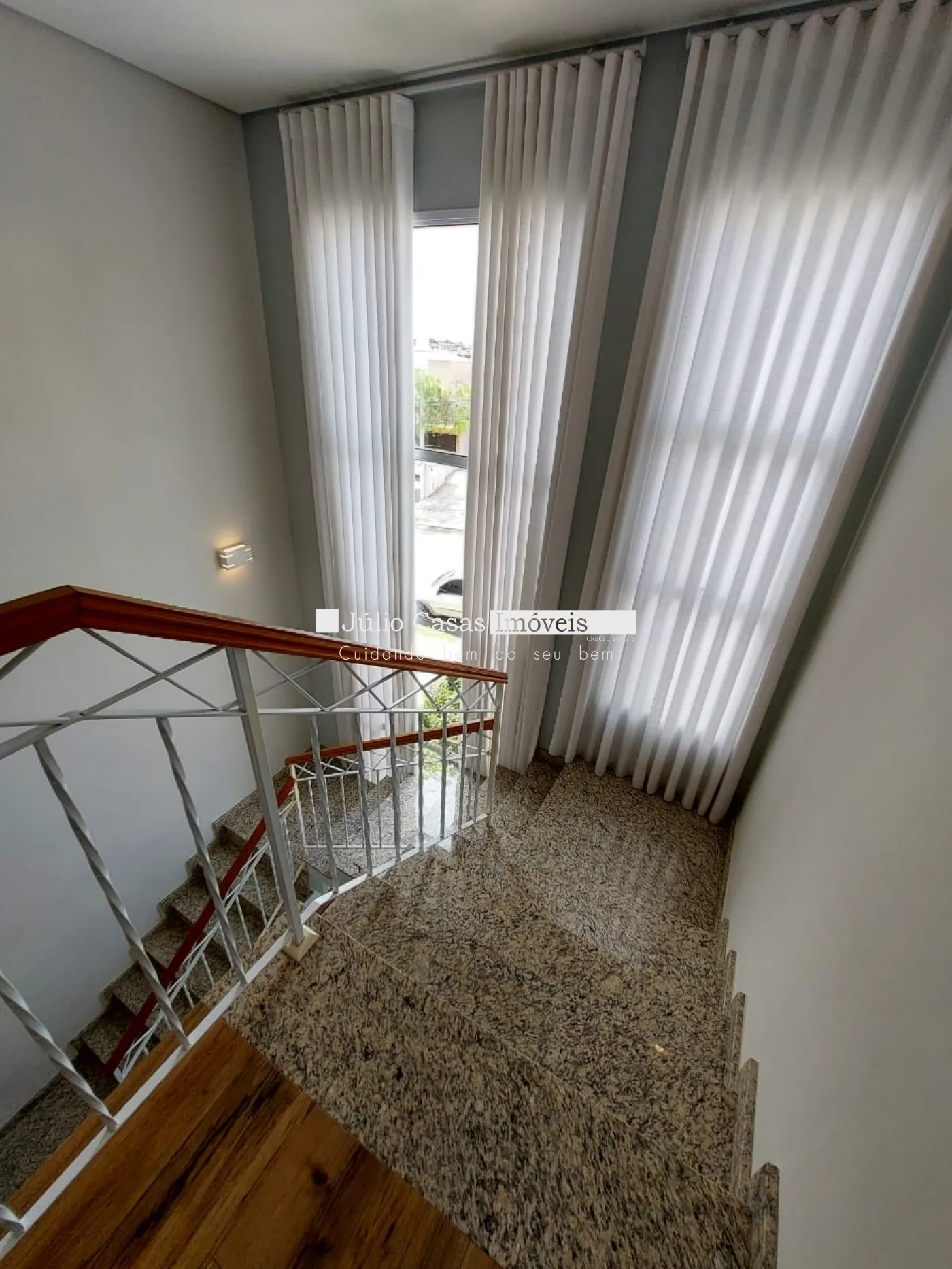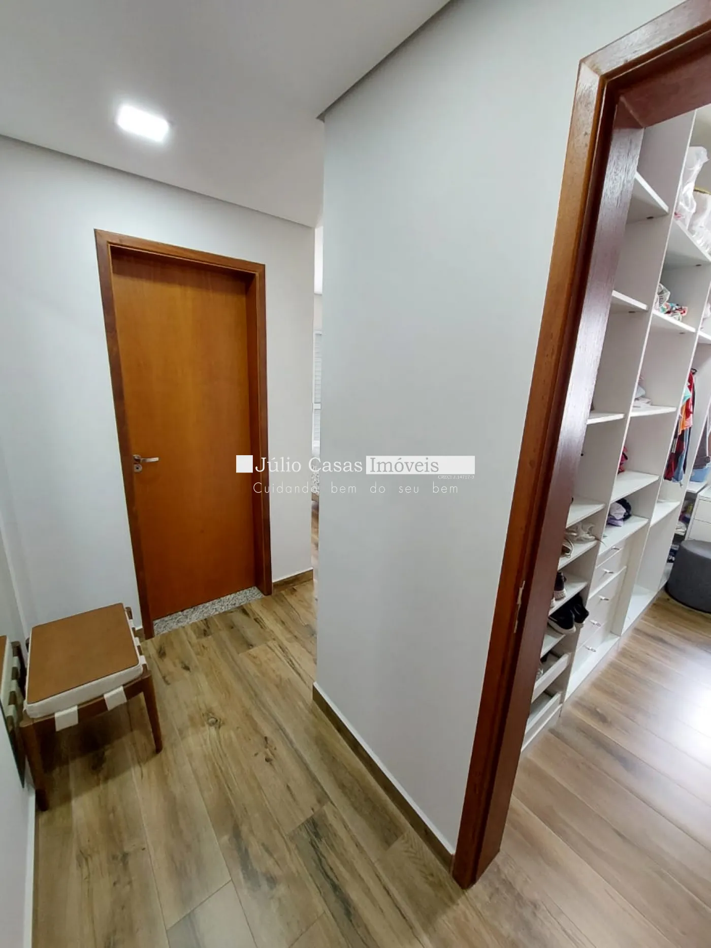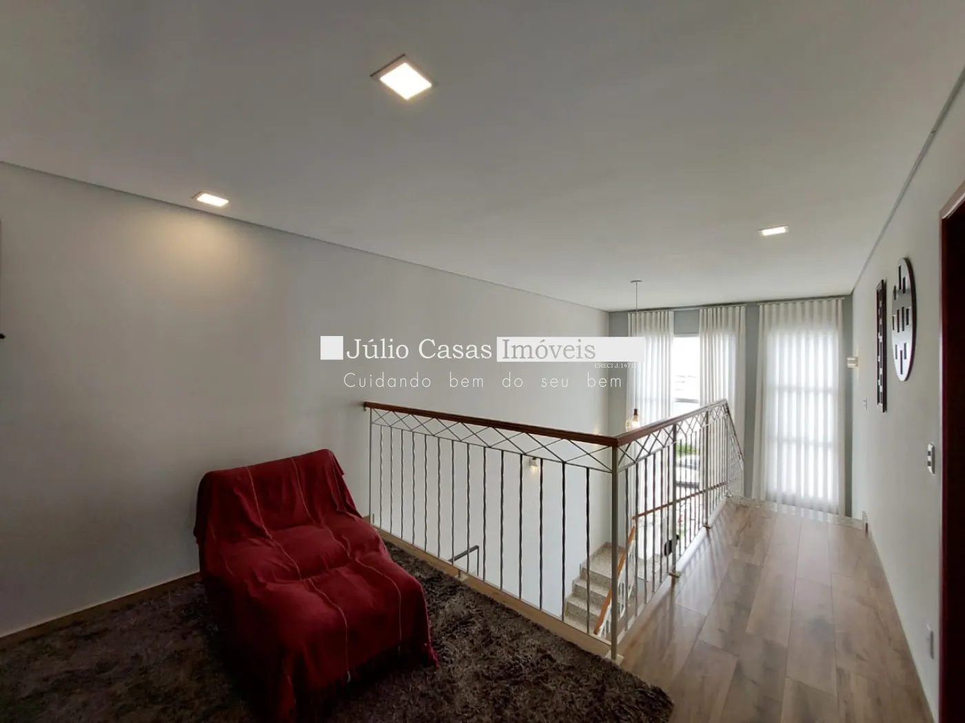 No andar superior, uma elegante escada em granito leva à sala íntima entre os quartos. São três suítes amplas, todas com varanda, sendo uma delas suíte master com closet. Todos os quartos possuem piso porcelanato imitando madeira, trazendo sofisticação ao ambiente. O bar modulado sob a escada agrega ainda mais charme ao imóvel.