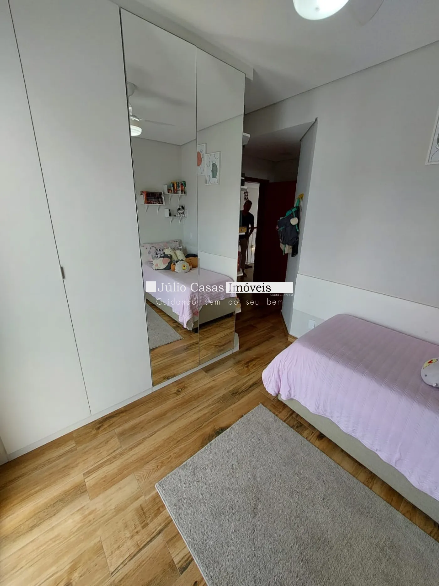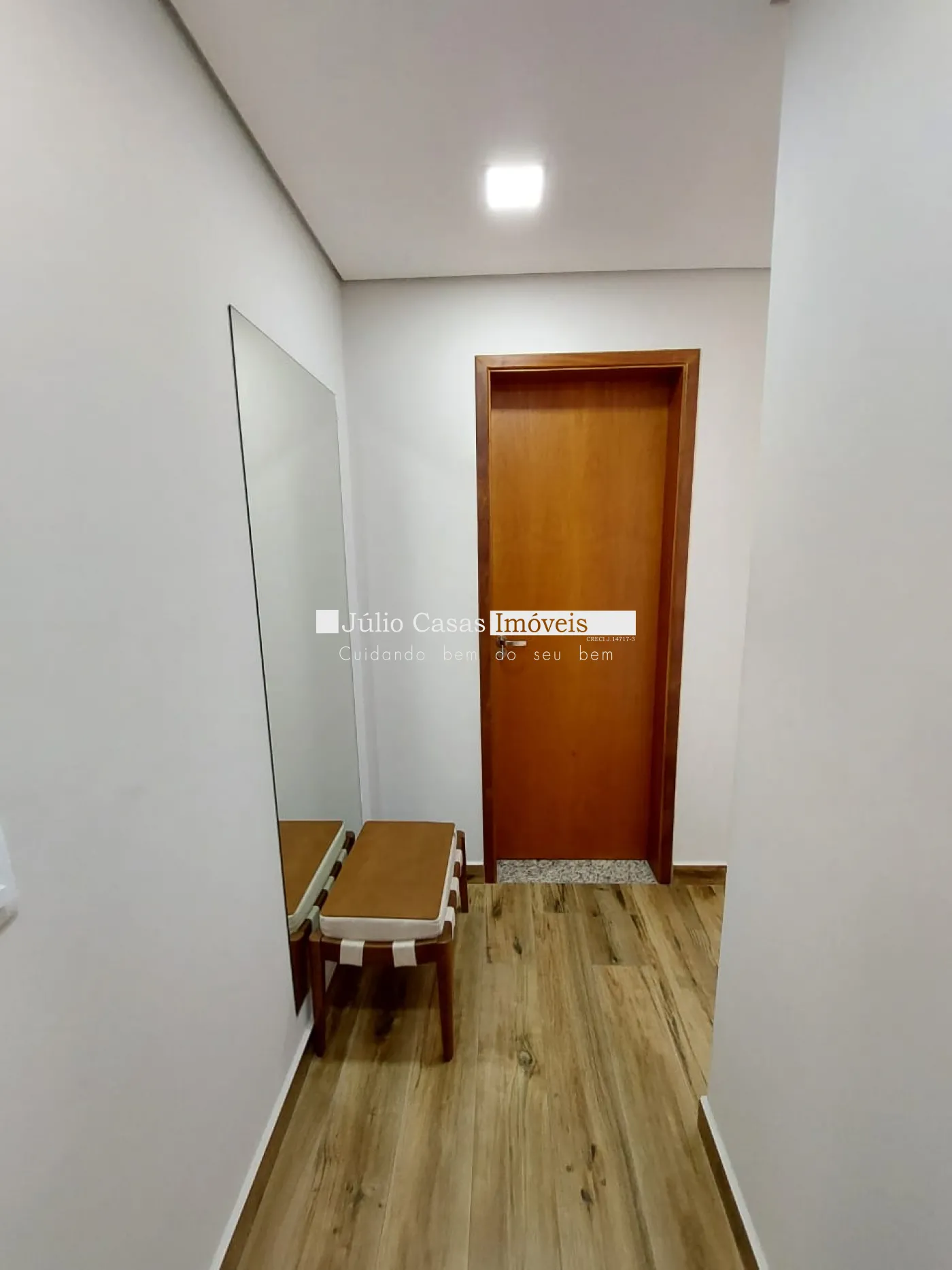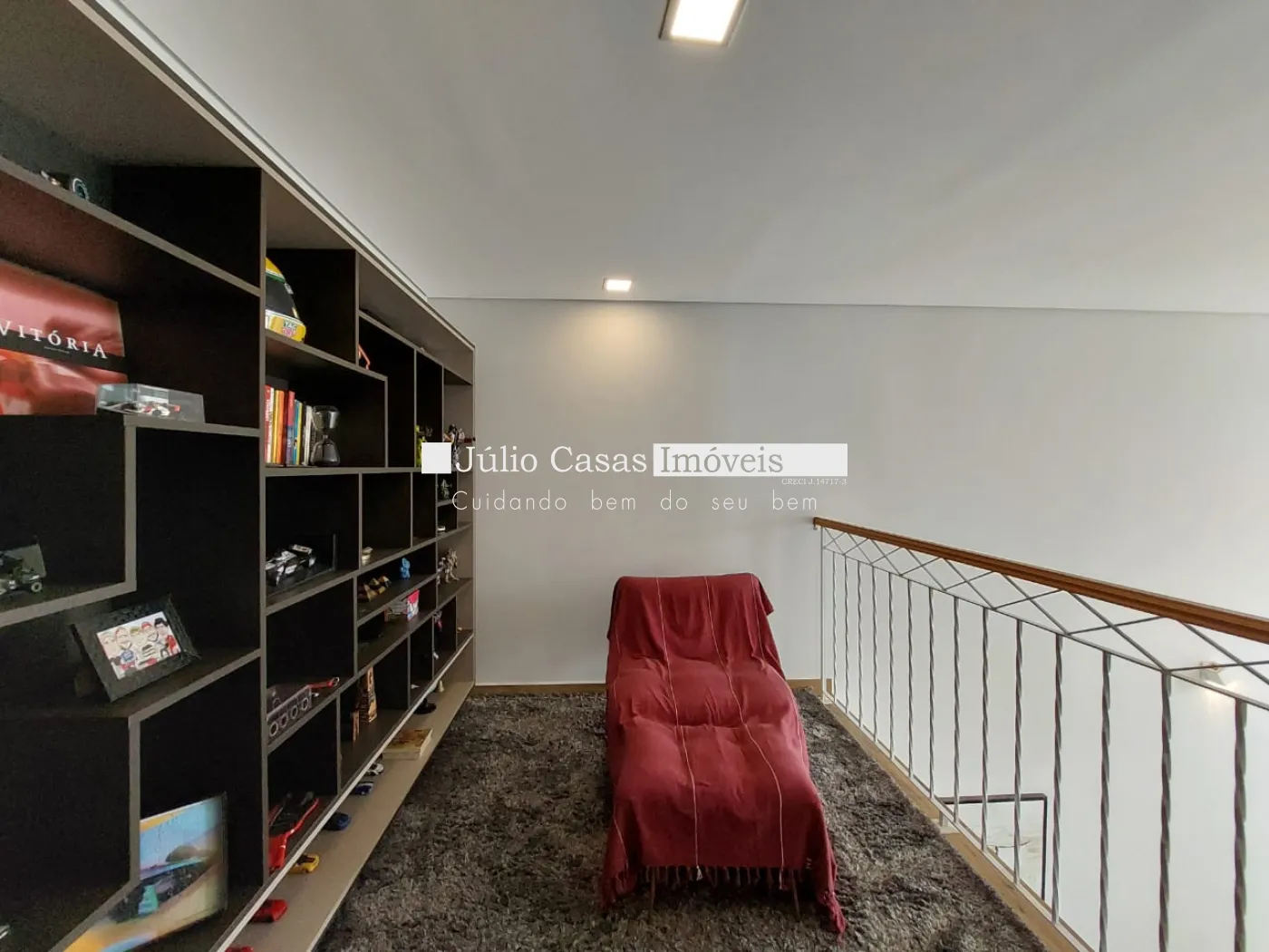 No andar superior, uma elegante escada em granito leva à sala íntima entre os quartos. São três suítes amplas, todas com varanda, sendo uma delas suíte master com closet. Todos os quartos possuem piso porcelanato imitando madeira, trazendo sofisticação ao ambiente. O bar modulado sob a escada agrega ainda mais charme ao imóvel.