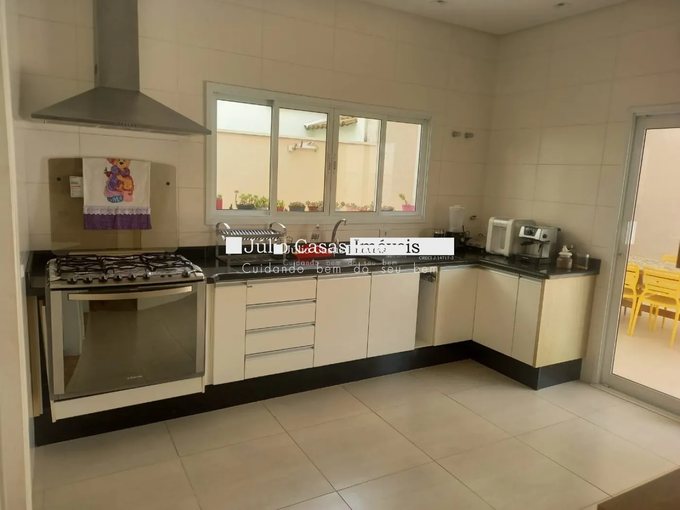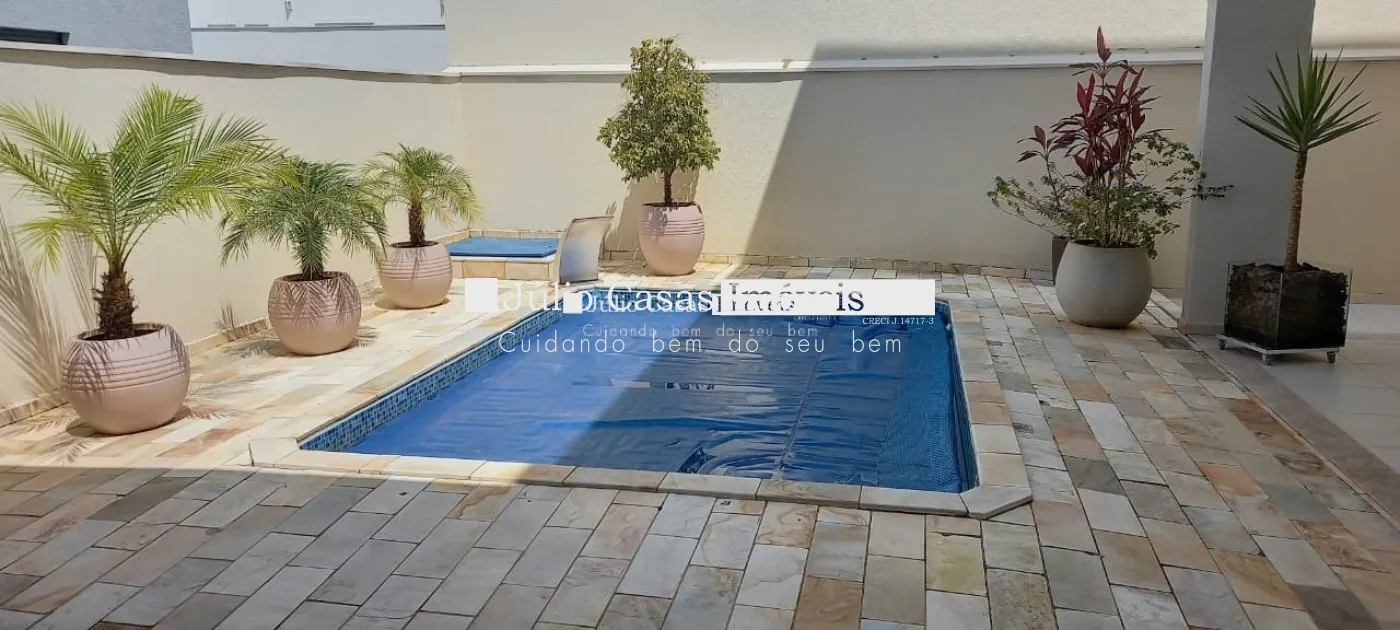 Casa térrea com três suítes, todas com ar condicionado, uma com armário e outra com closet , banheiro com pia e chuveiro duplos, sala ampla com jardim de inverno, cozinha modulada com balcão em granito e dupla pia, cooktop, despensa, área de serviço com armários, área secagem, espaço gourmet fechado com armários, mesa e painel, banheiro com gabinete, espelho , box e chuveiro, piscina, quintal e quatro vagas. Acabamento de primeira qualidade