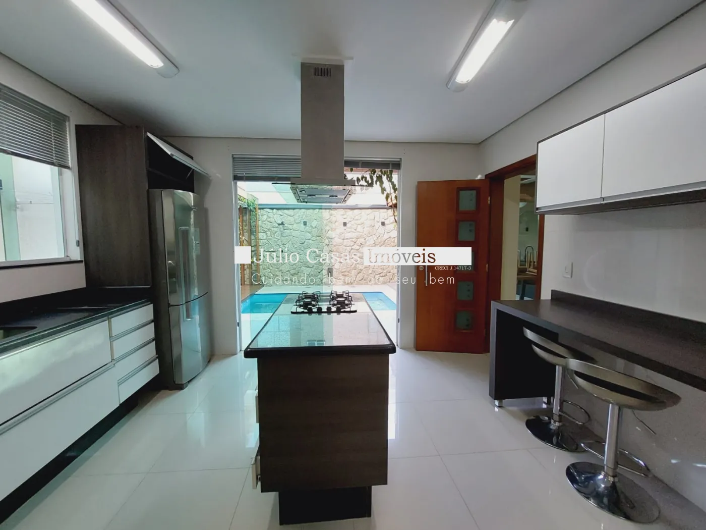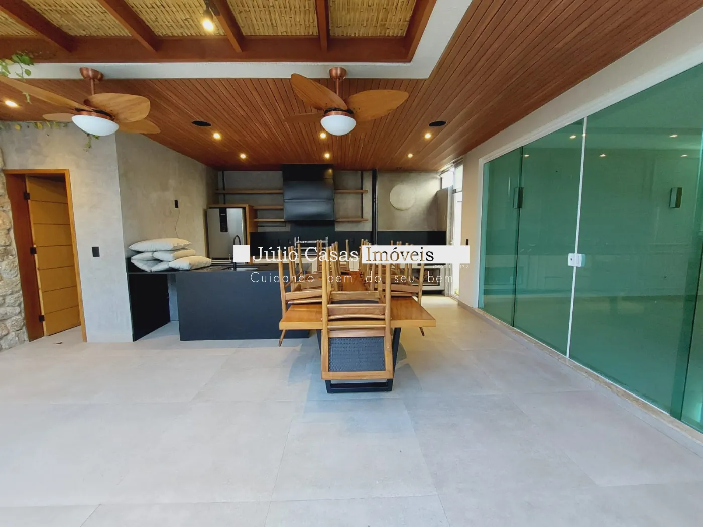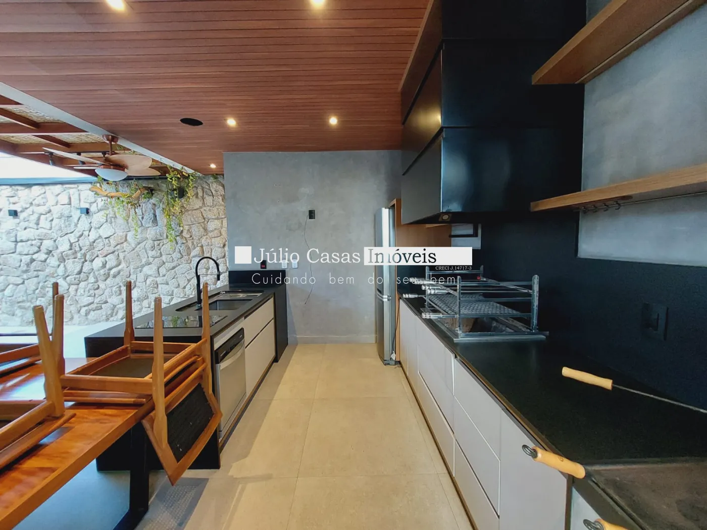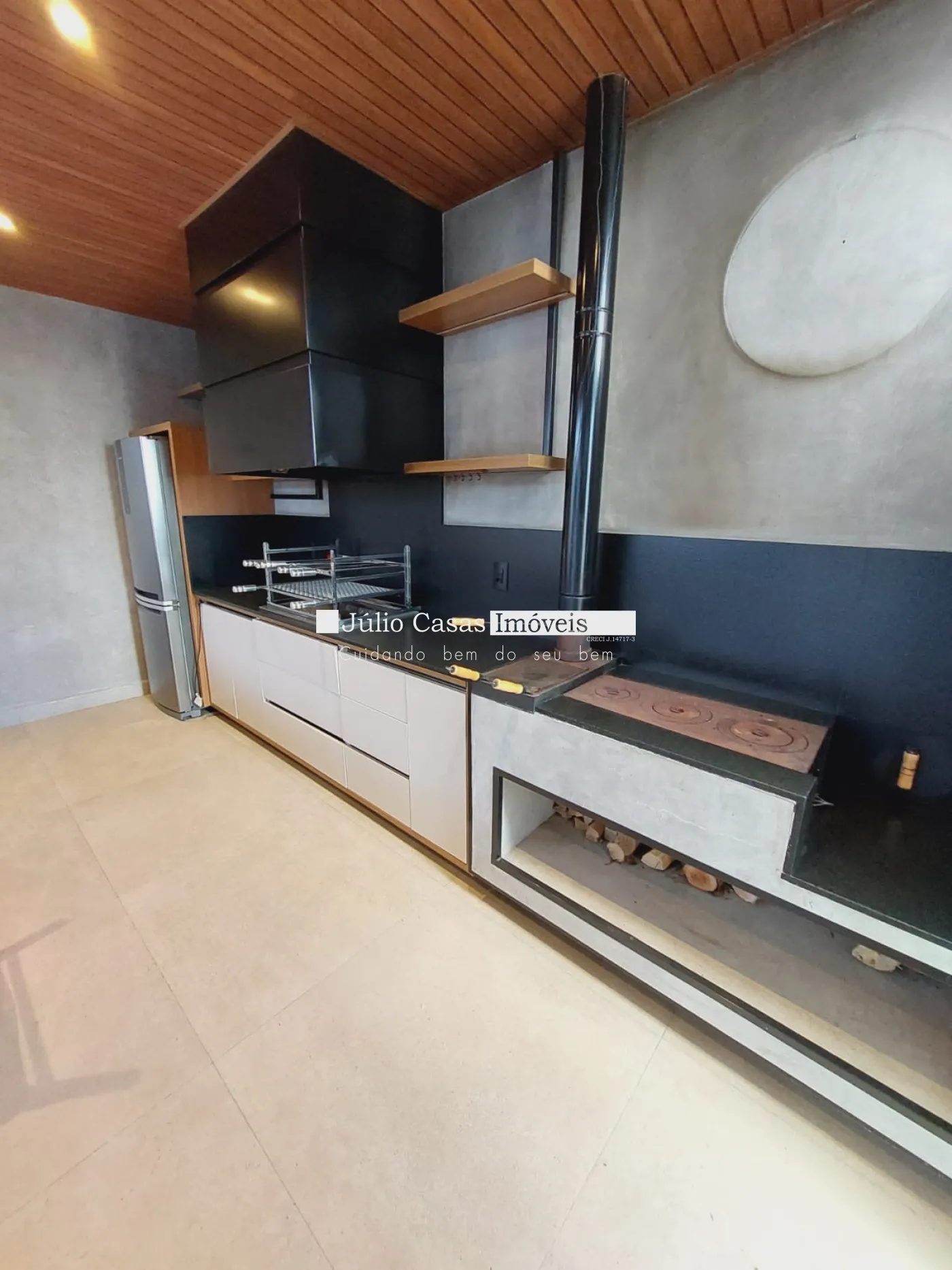 Área gourmet completa, com paisagismo, churrasqueira, fogão a lenha, ilha com pia e modulados. Conta ainda com piscina e banheiro de apoio à área externa.