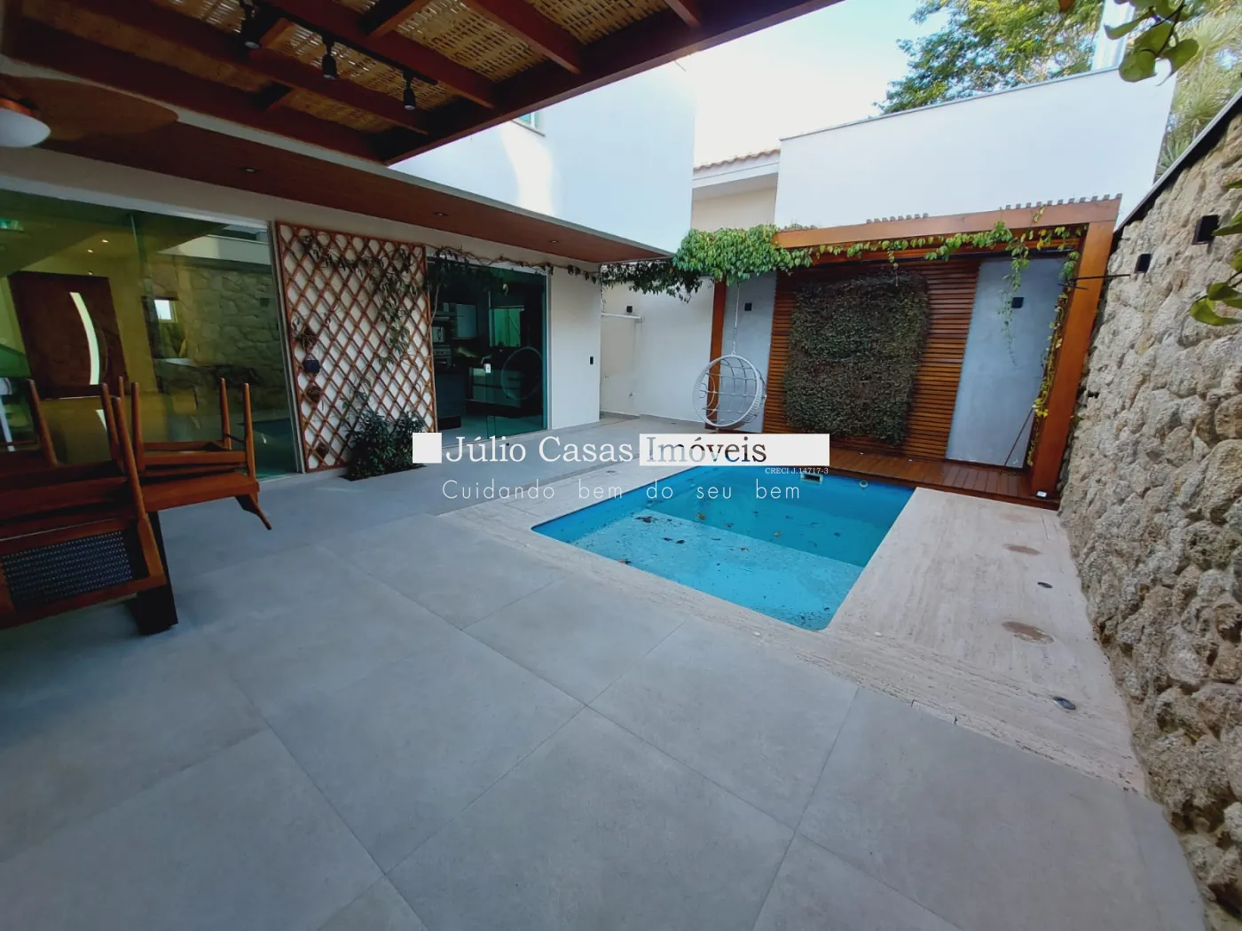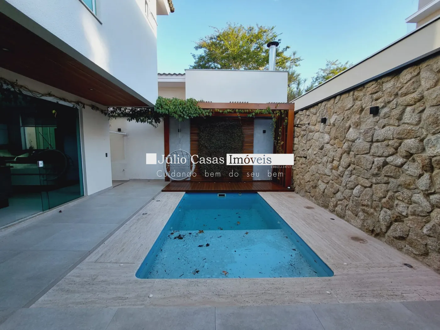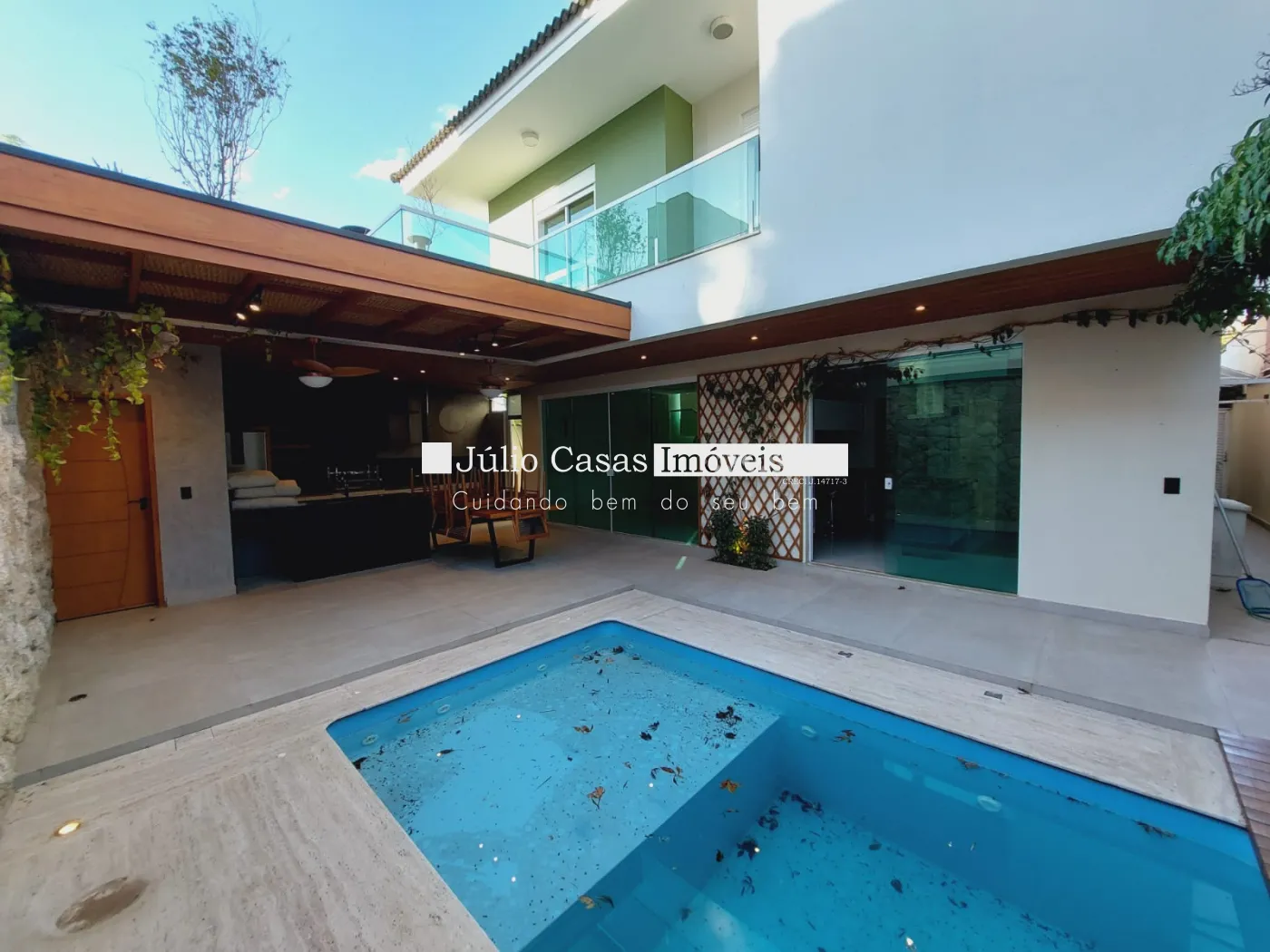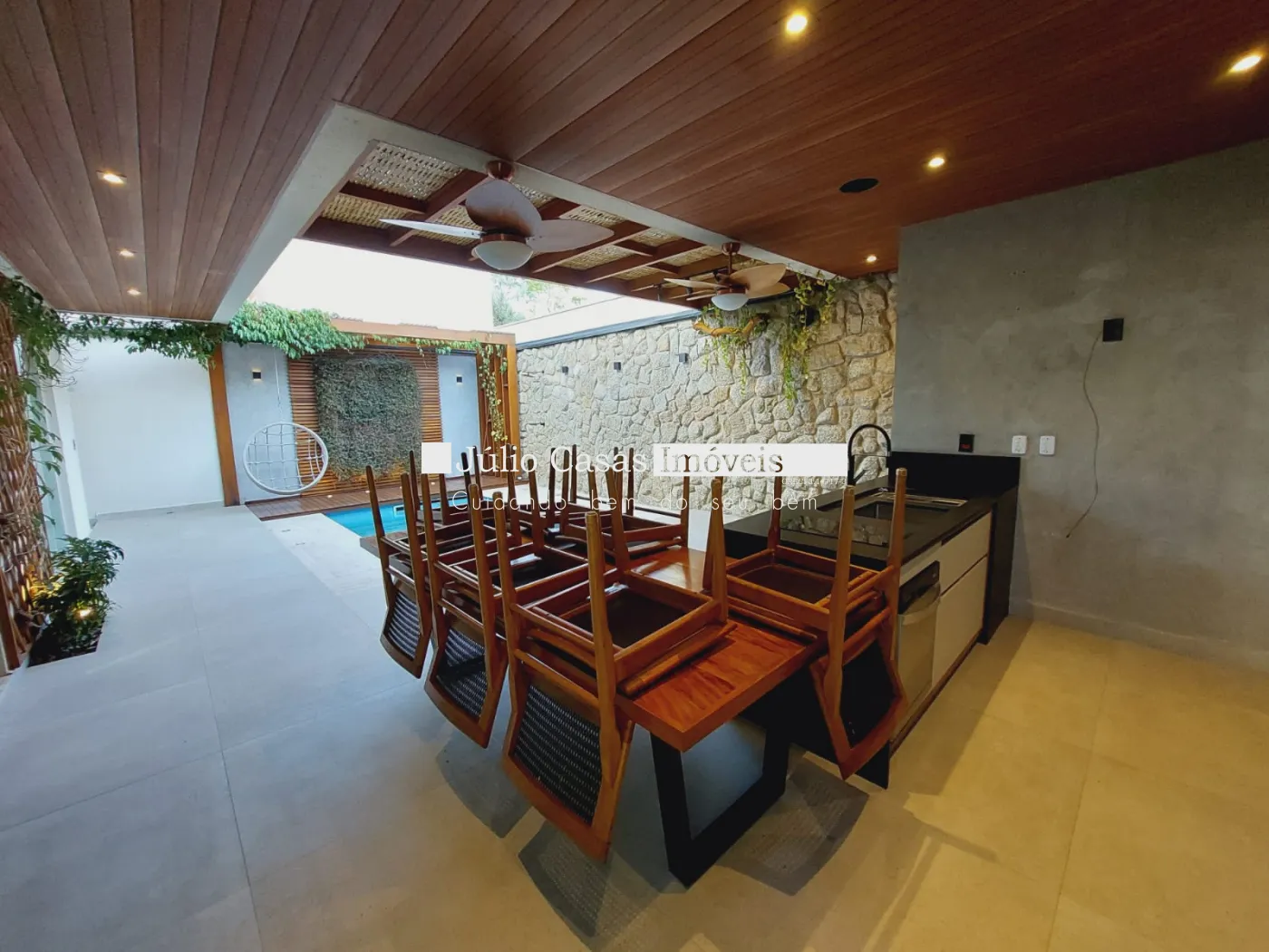 Área gourmet completa, com paisagismo, churrasqueira, fogão a lenha, ilha com pia e modulados. Conta ainda com piscina e banheiro de apoio à área externa.