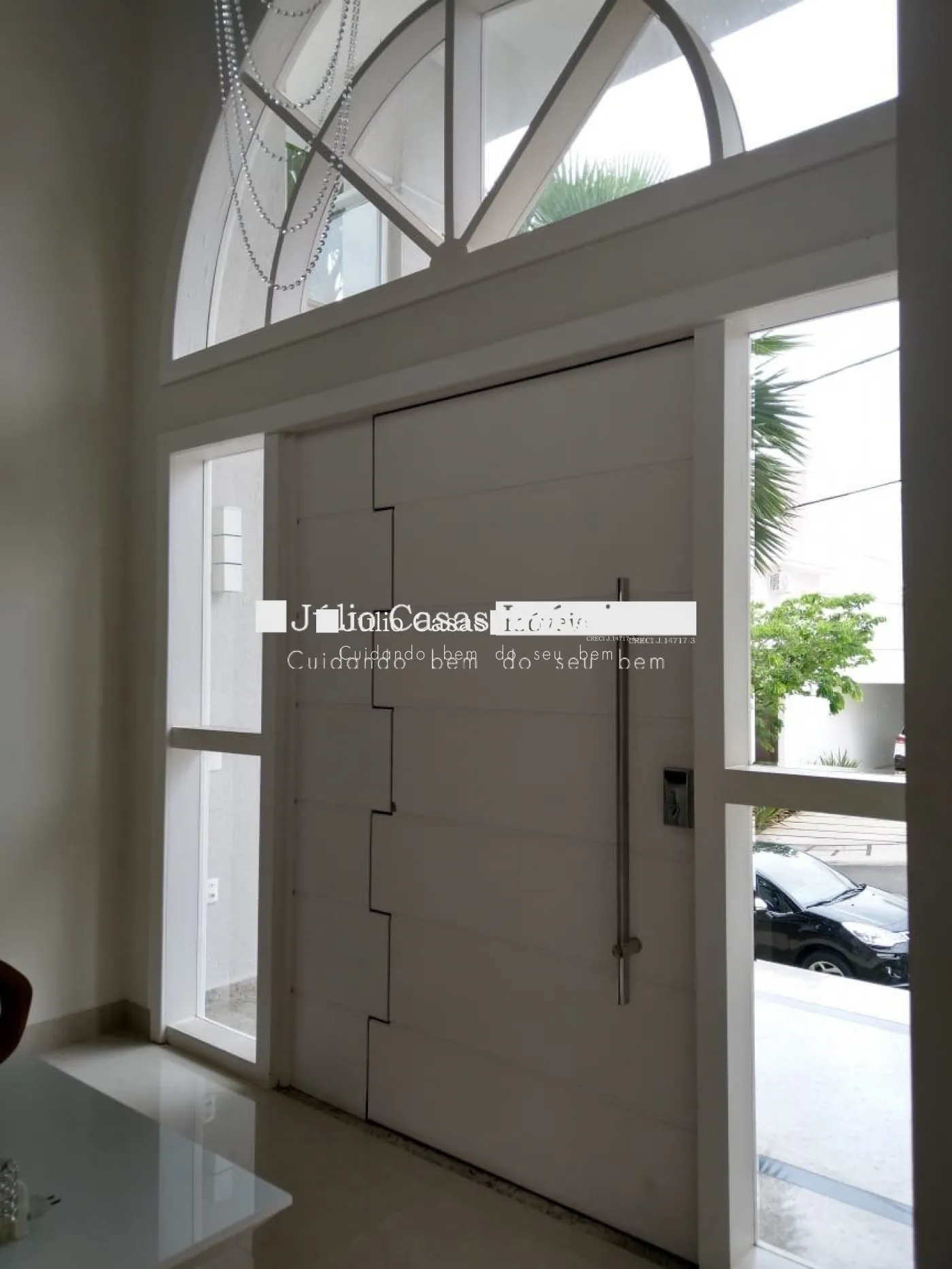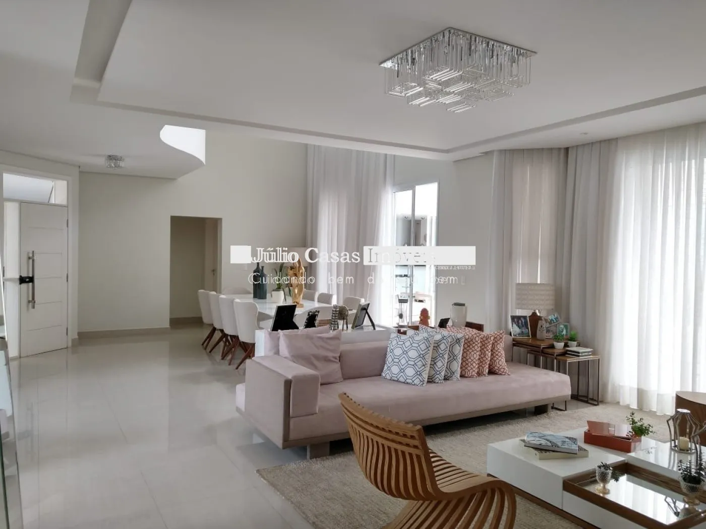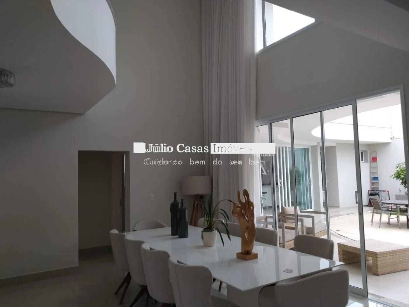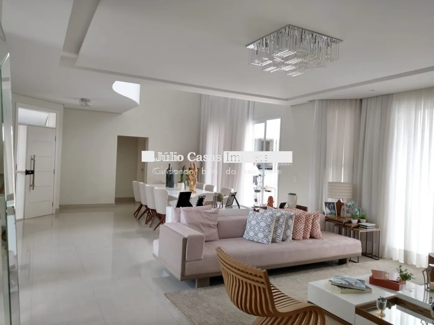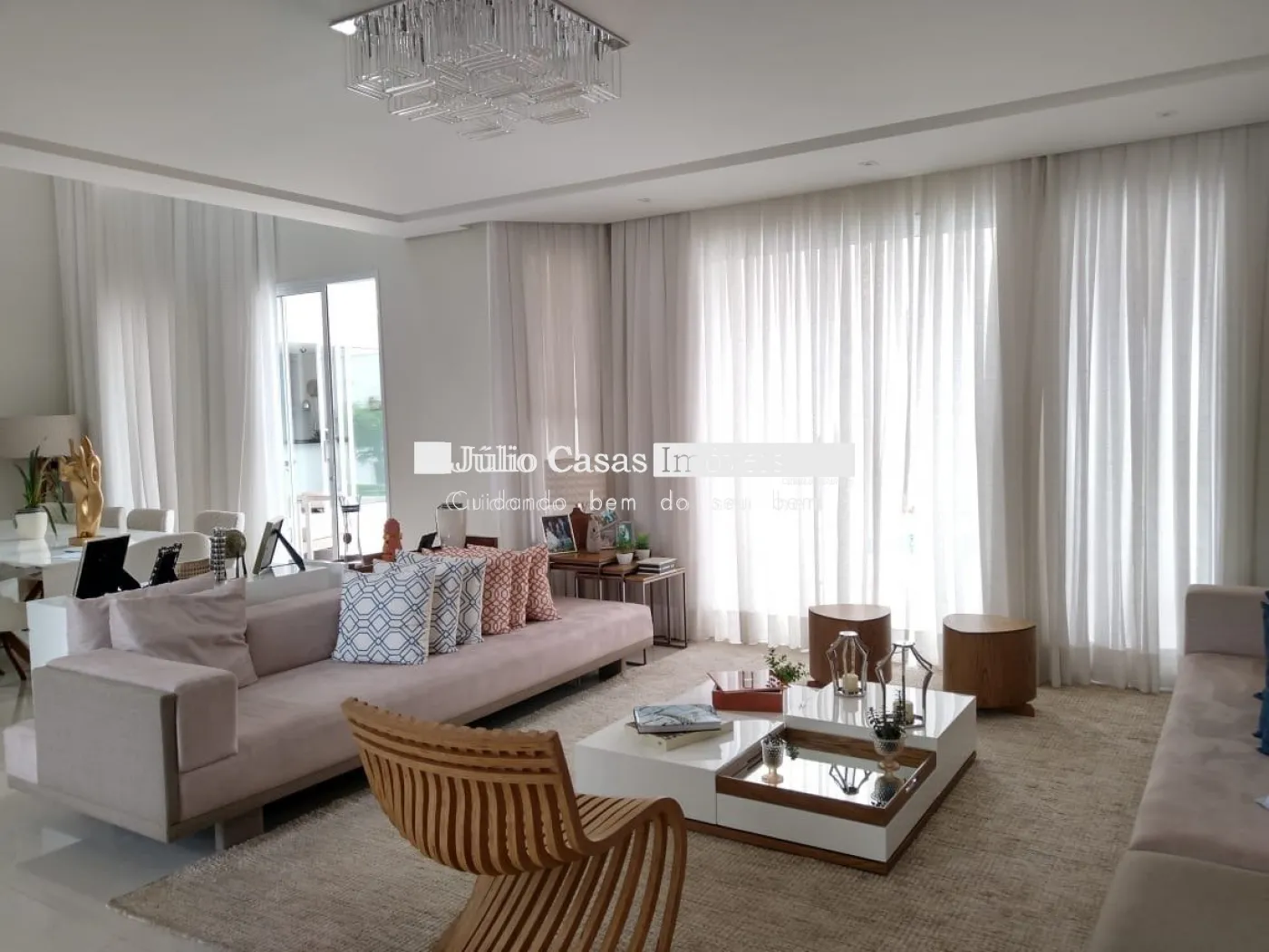 Casa modulada com sala 3 ambientes com pé direito 6 metros, integrada com a área gourmet com portas em alumínio branco e vidro temperado, proporcionando amplitude no ambiente, escritório com lavabo, 4 suítes uma sendo máster com varanda, hidro e duas duchas com duas cubas, toda em acabamento em porcelanato e gesso com closet.