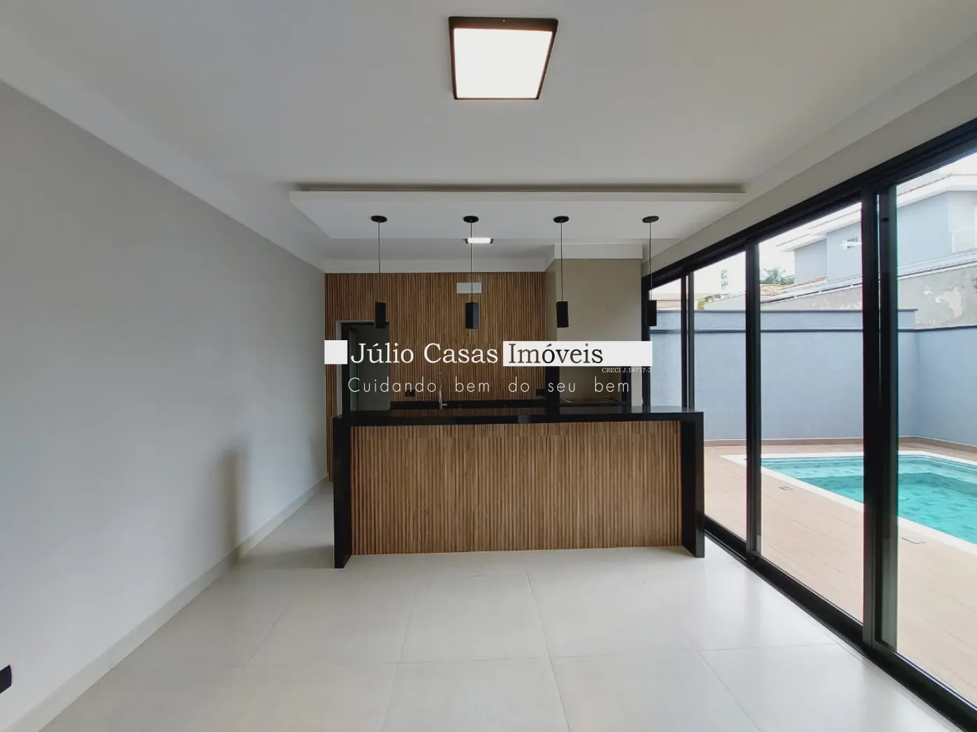 Ambientes integrados com sala de estar e jantar conectadas à cozinha, equipada com coifa, cooktop, despensa e lavanderia. Área gourmet completa com churrasqueira, pia de apoio, bancada em granito, banheiro externo e piscina climatizada.